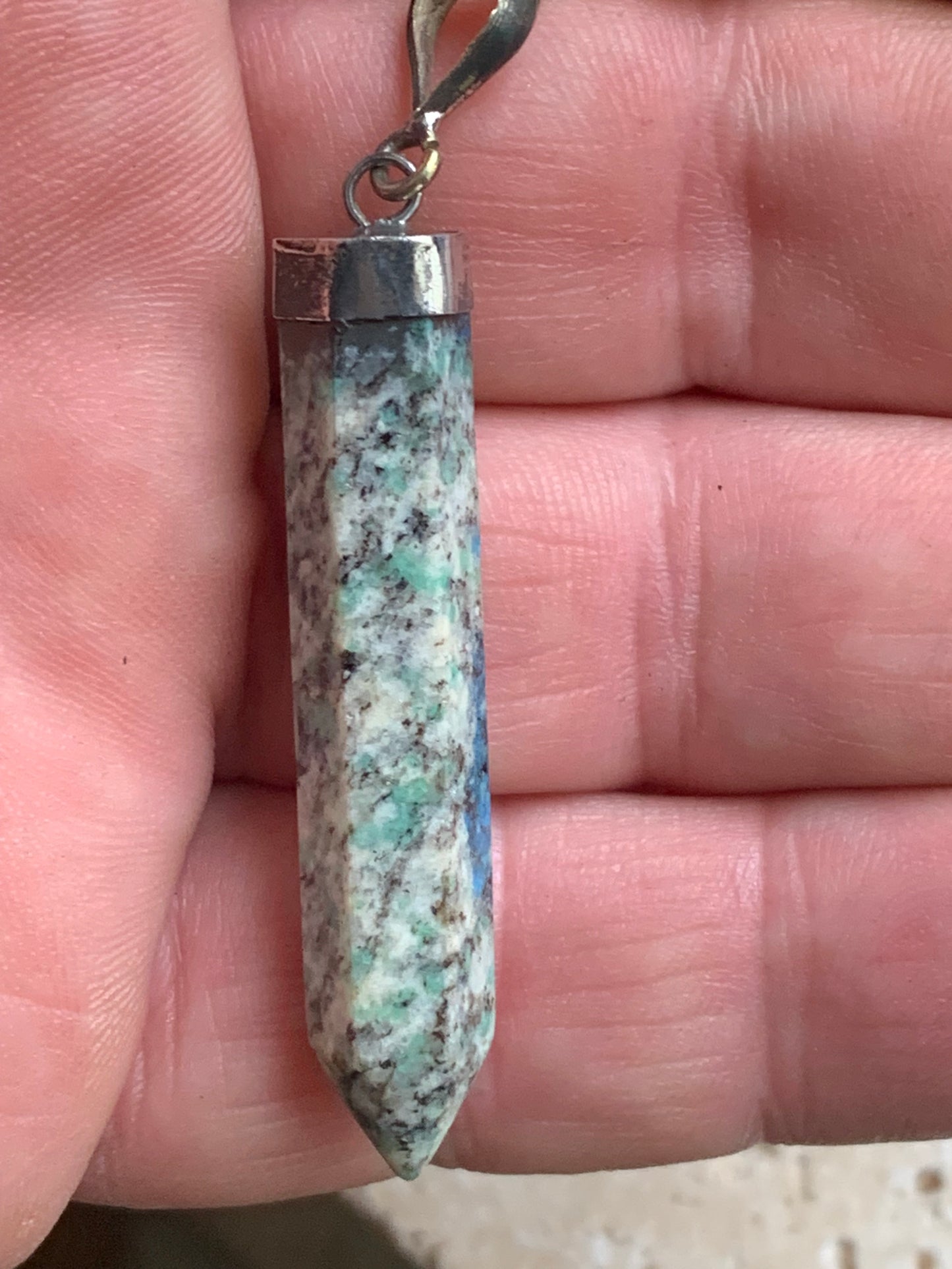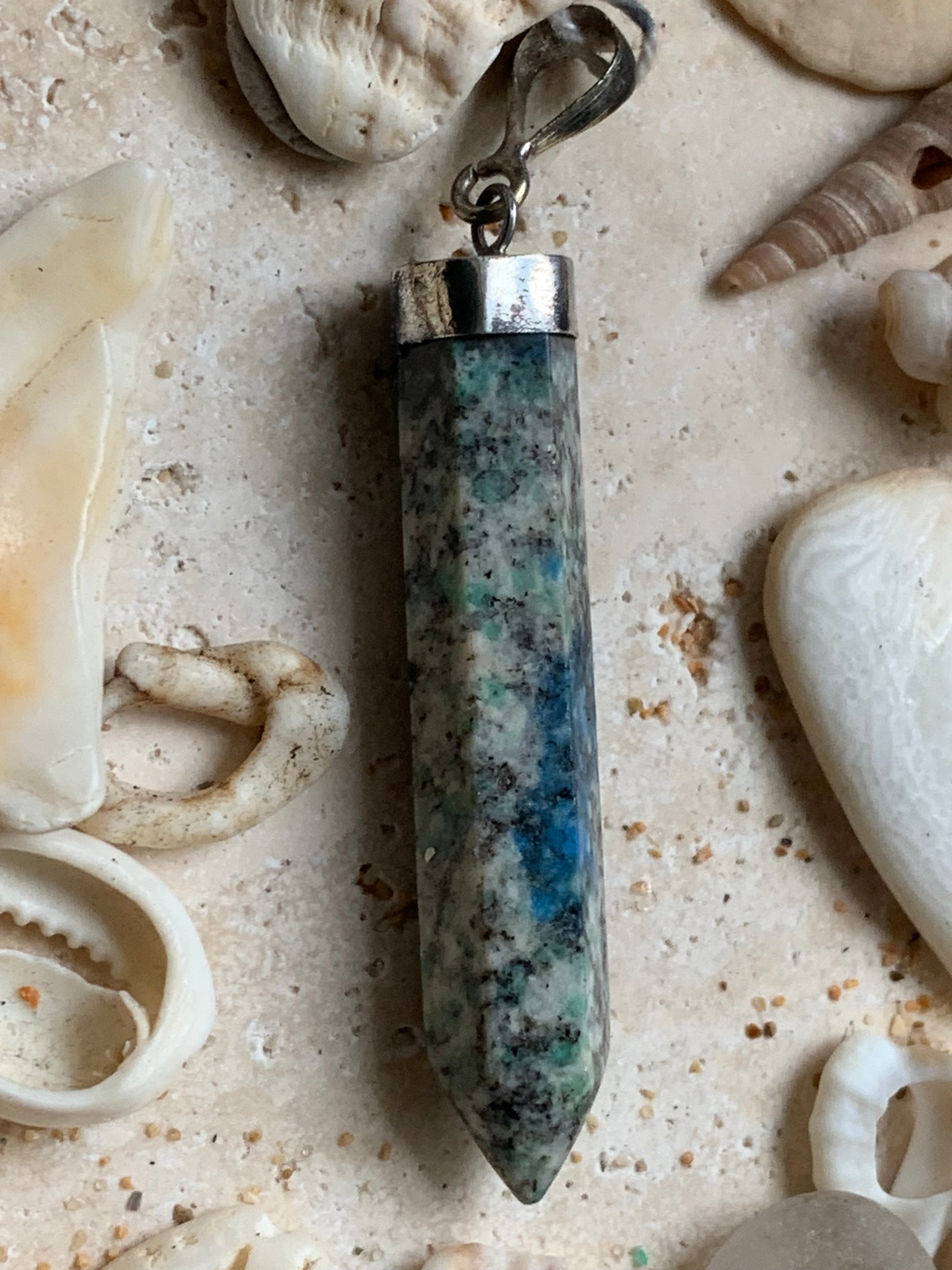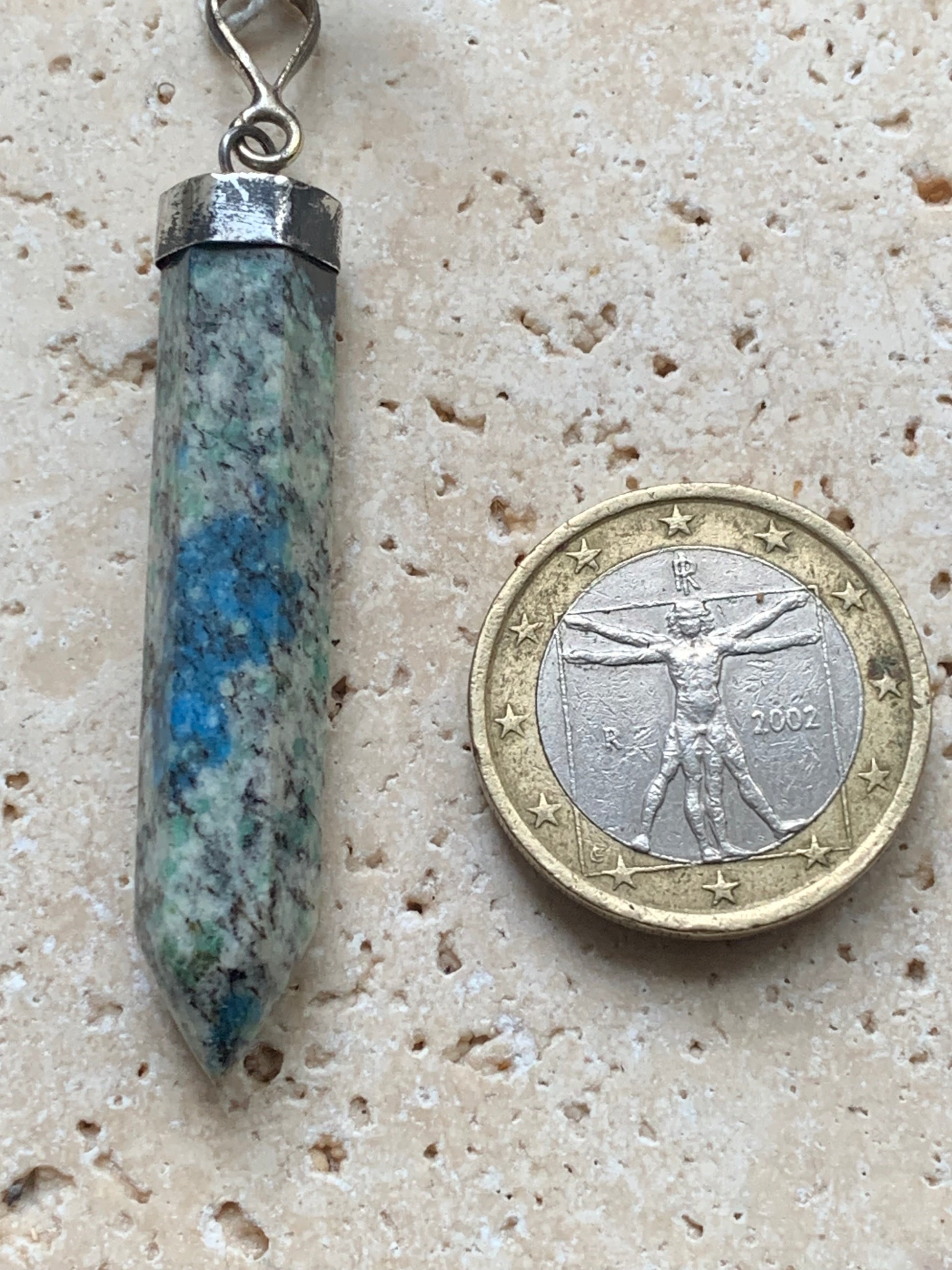 Jaspe K2* (Granit avec Azurite), pièce en Argent 0925 rhodié, de 58 millimètres de hauteur x 8 millimètres de largeur x 8 d'épaisseur. Vendu avec un cordon réglable de couleur noire !