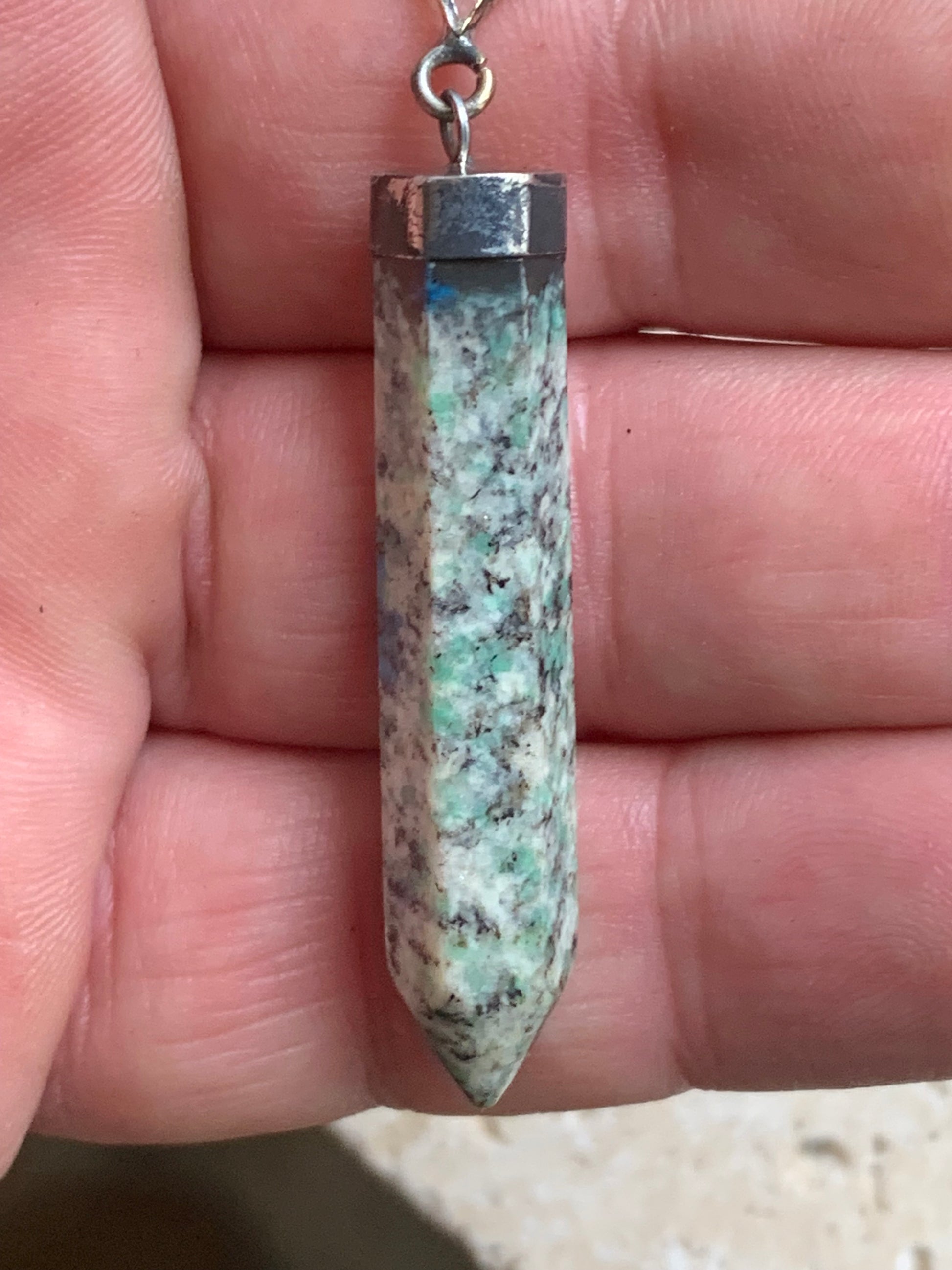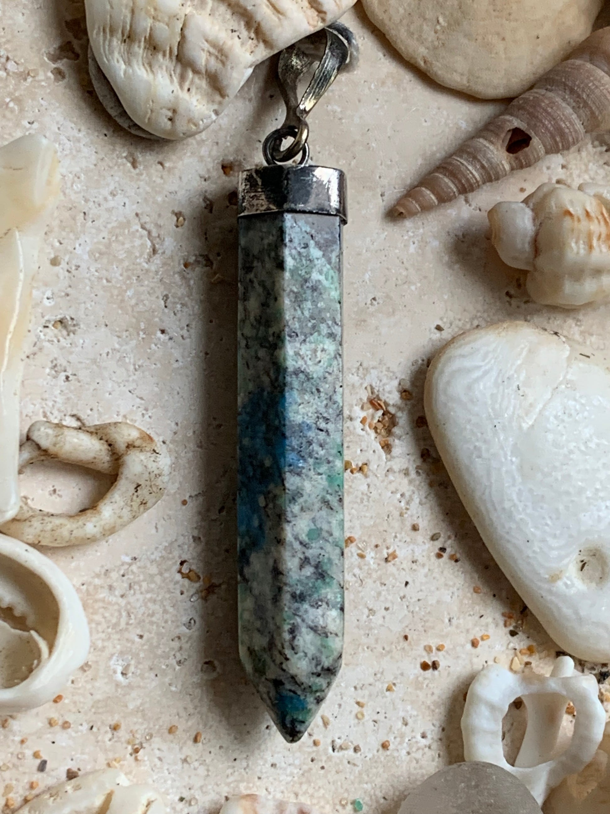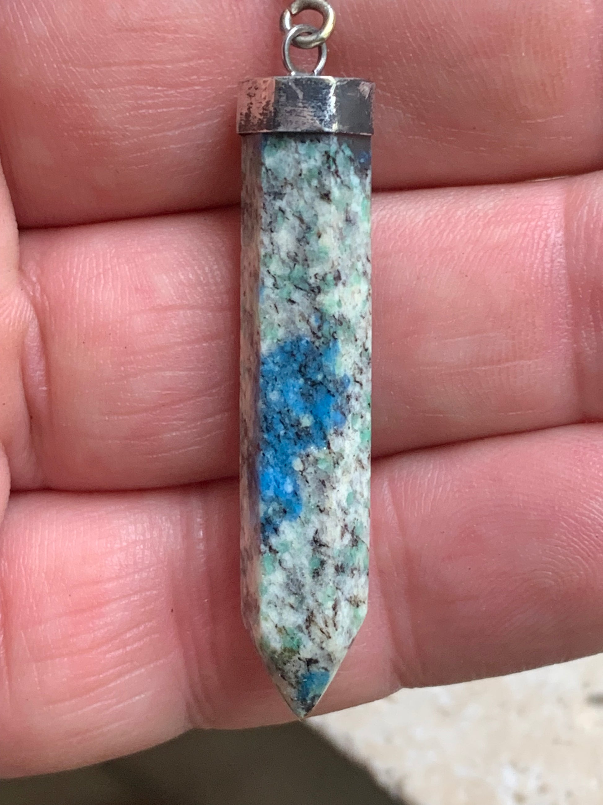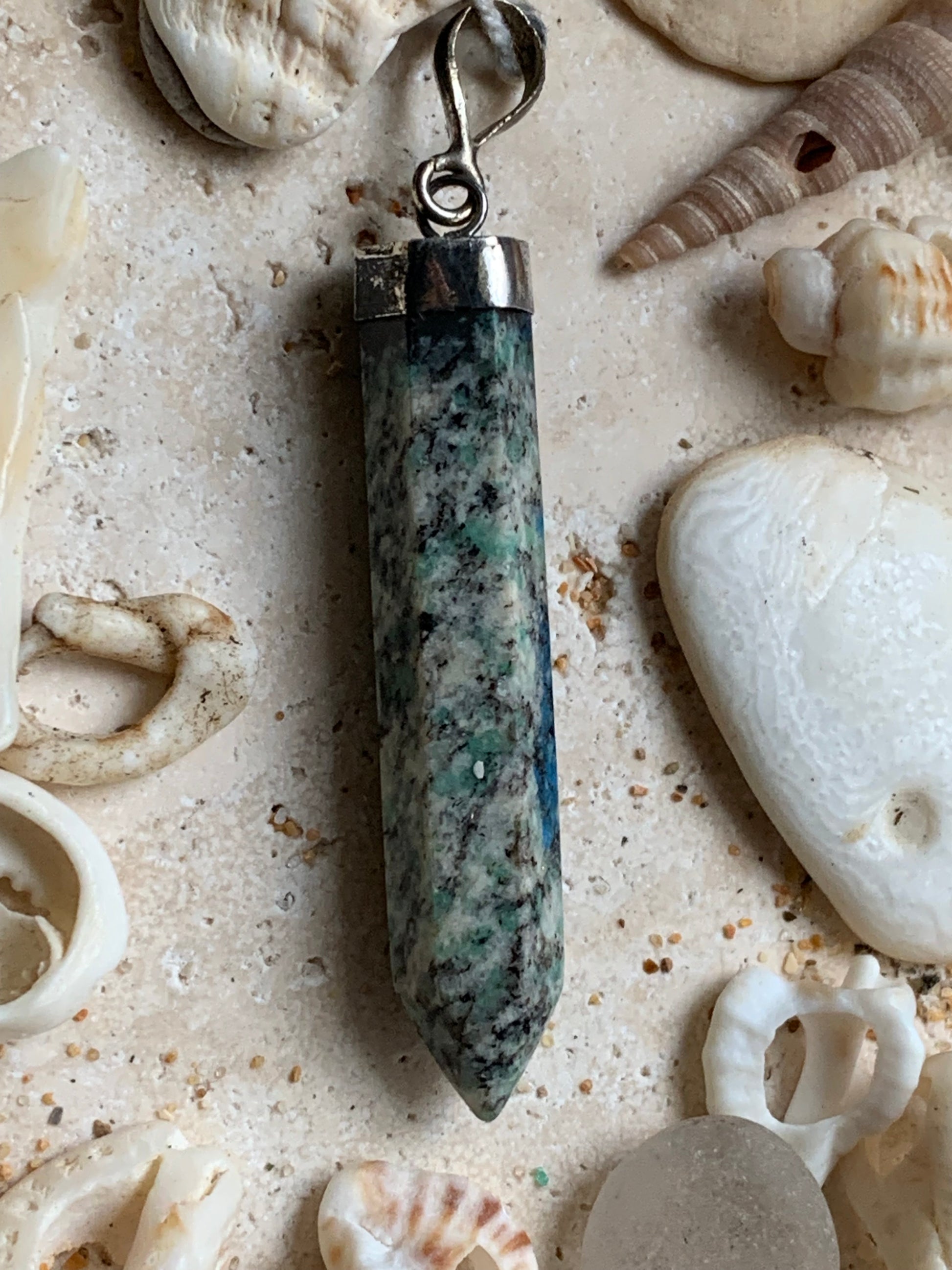 Jaspe K2* (Granit avec Azurite), pièce en Argent 0925 rhodié, de 58 millimètres de hauteur x 8 millimètres de largeur x 8 d'épaisseur. Vendu avec un cordon réglable de couleur noire !