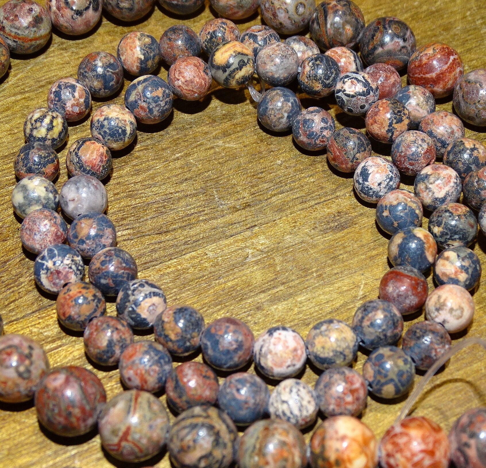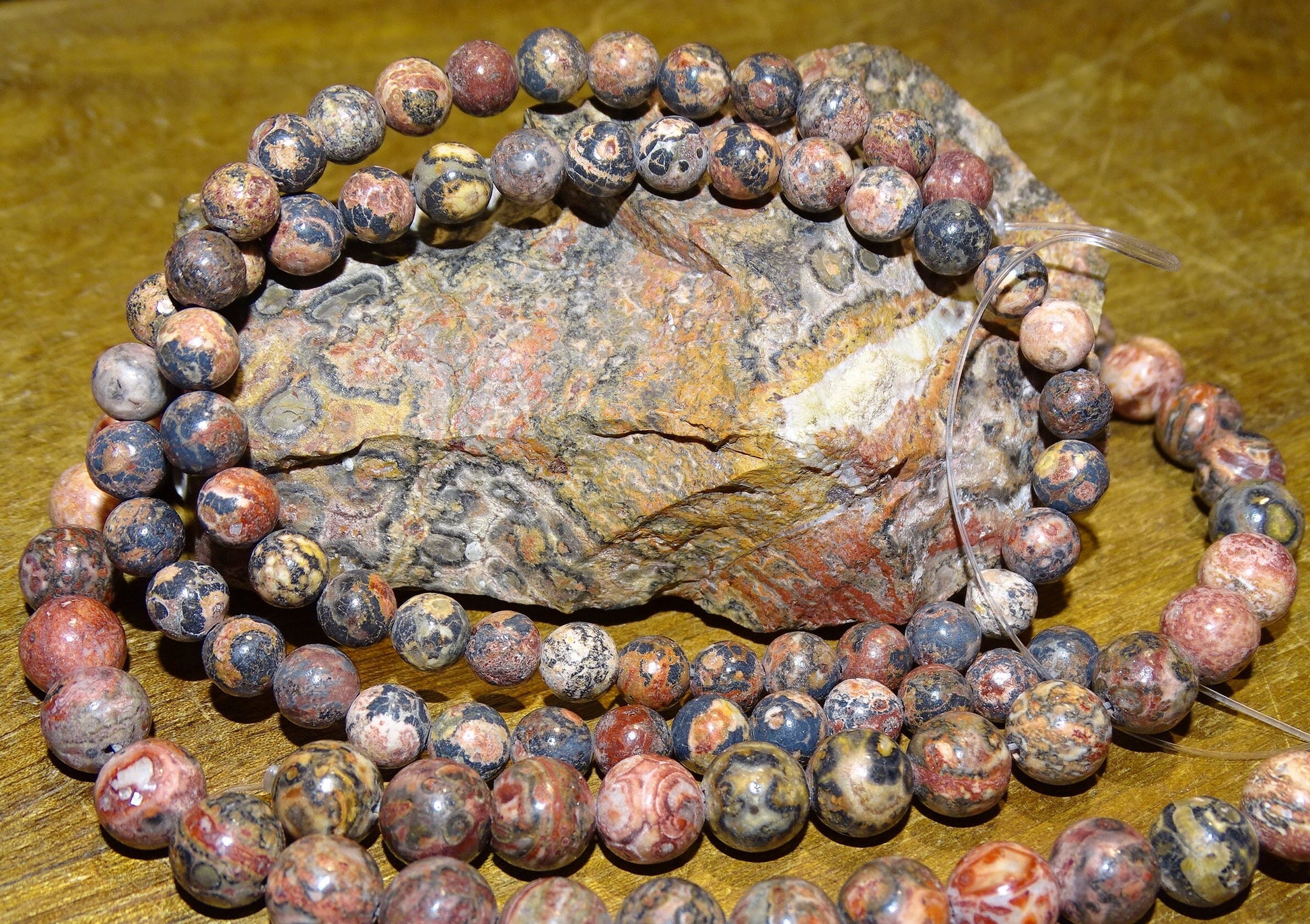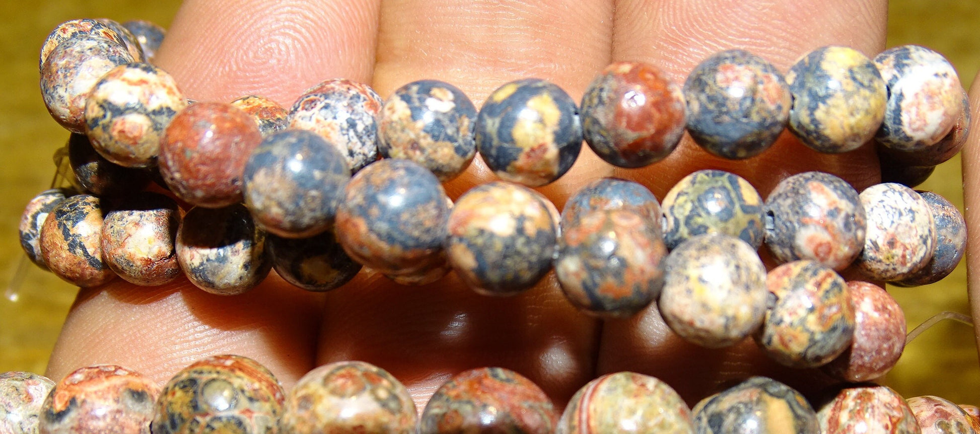 Jaspe léopard, perles rondes de 6 ou 8 mm. Vendu en fil de perle 38/39 cm, en bracelet de 17 à 21cm, en collier de 45 ou sautoir de 60cm. Qualité AA à AAA, superbes perles naturelles !