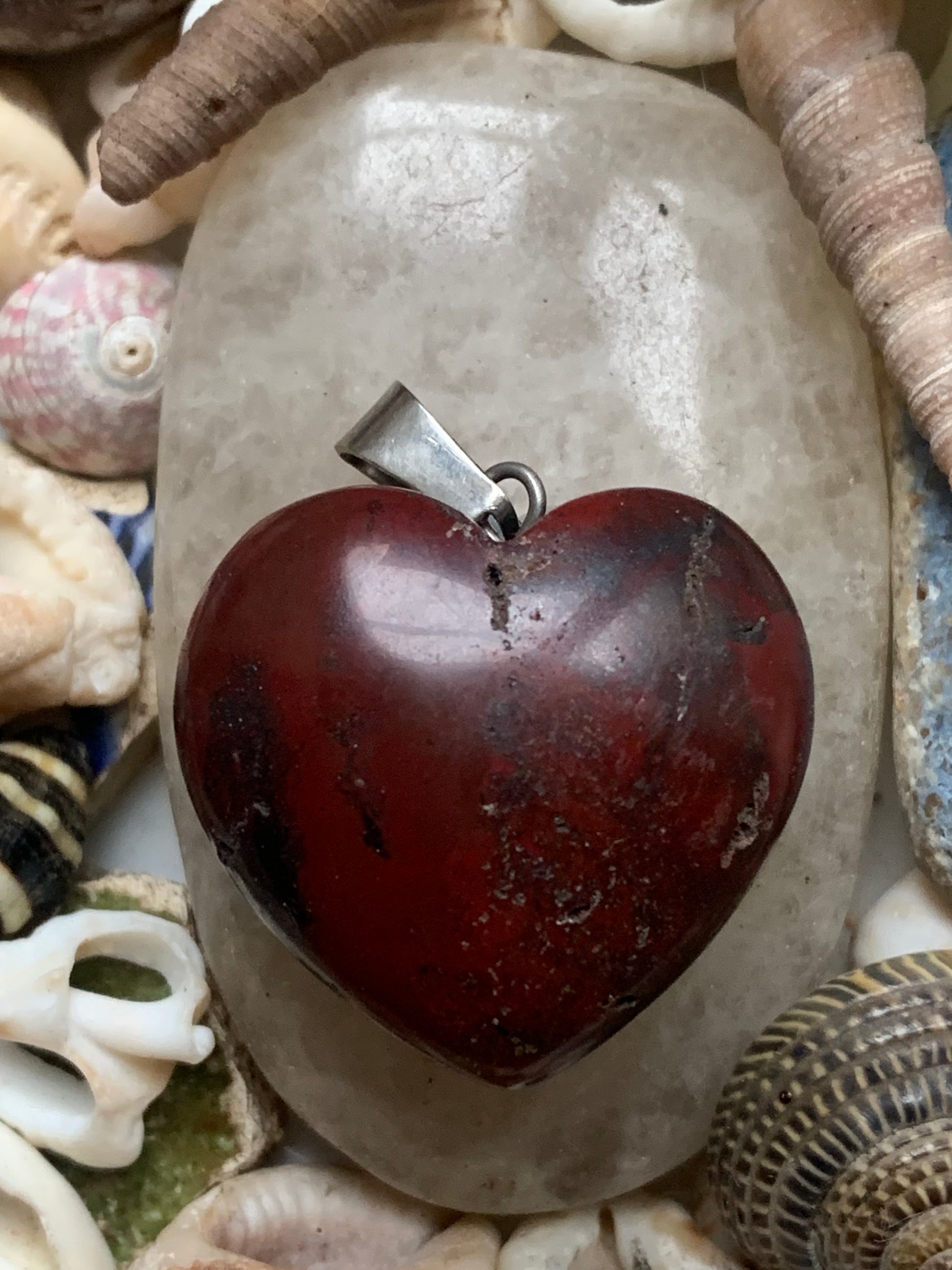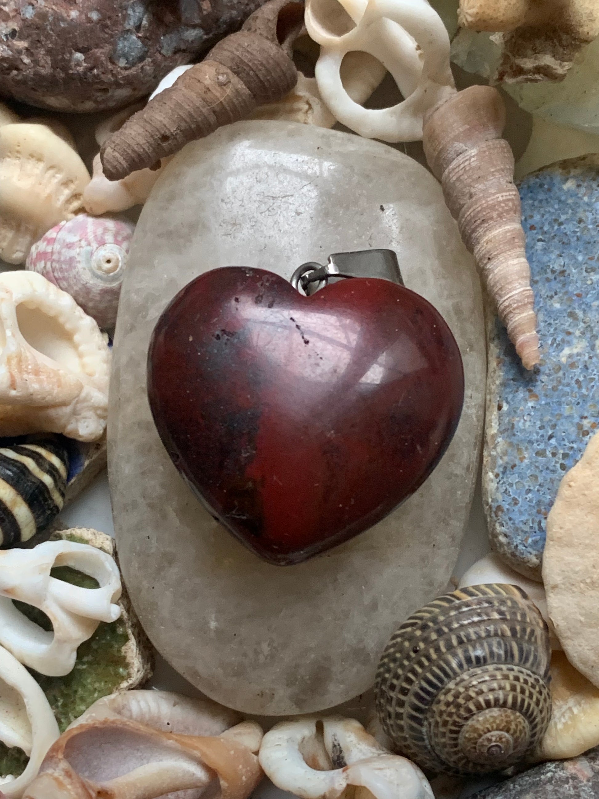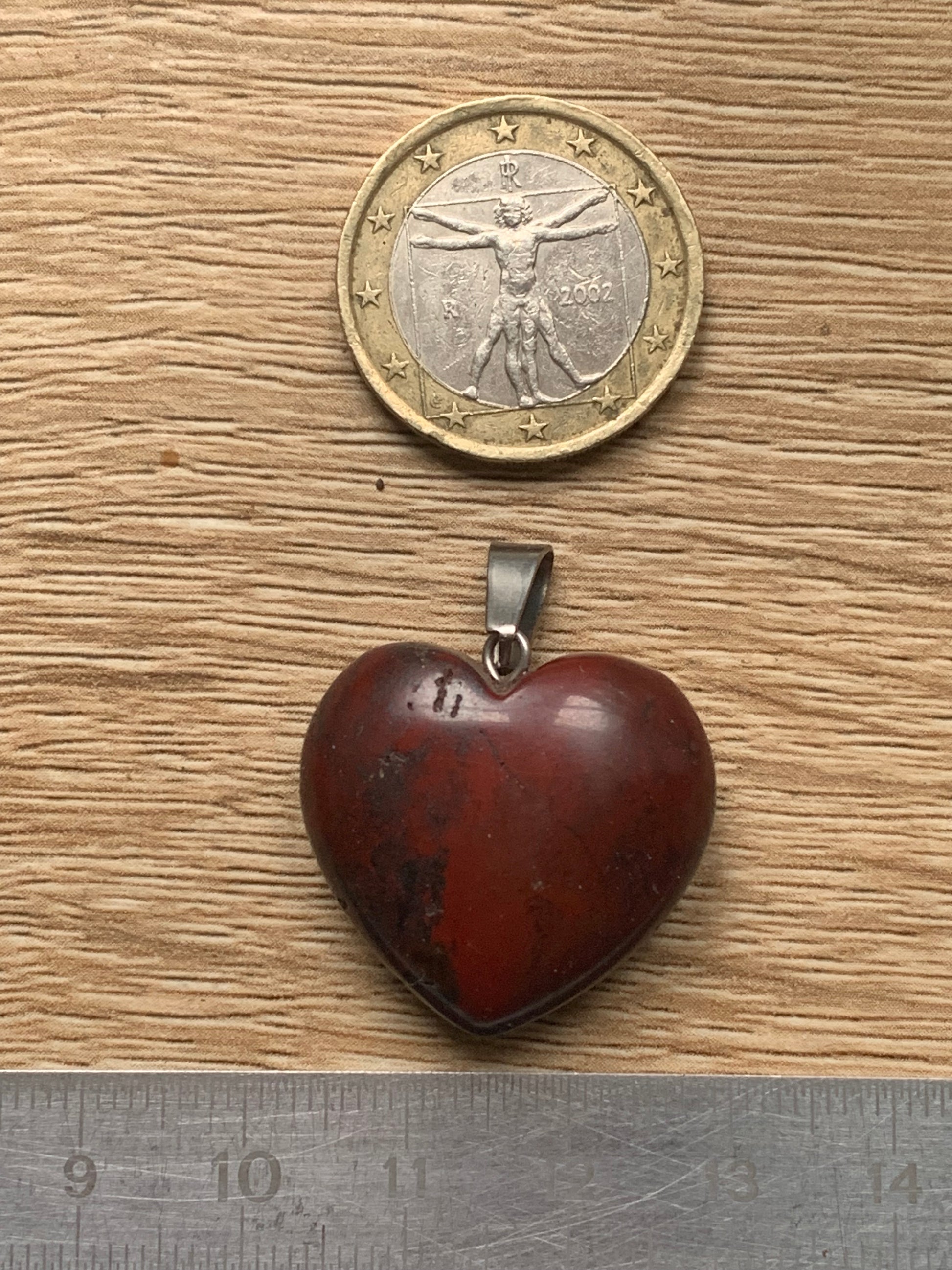 Jaspe rouge, pendentif 'Coeur' en Argent, de 32 millimètres de hauteur x 25 millimètres de largeur x 11 d'épaisseur. Vendu avec un cordon réglable de couleur noire !