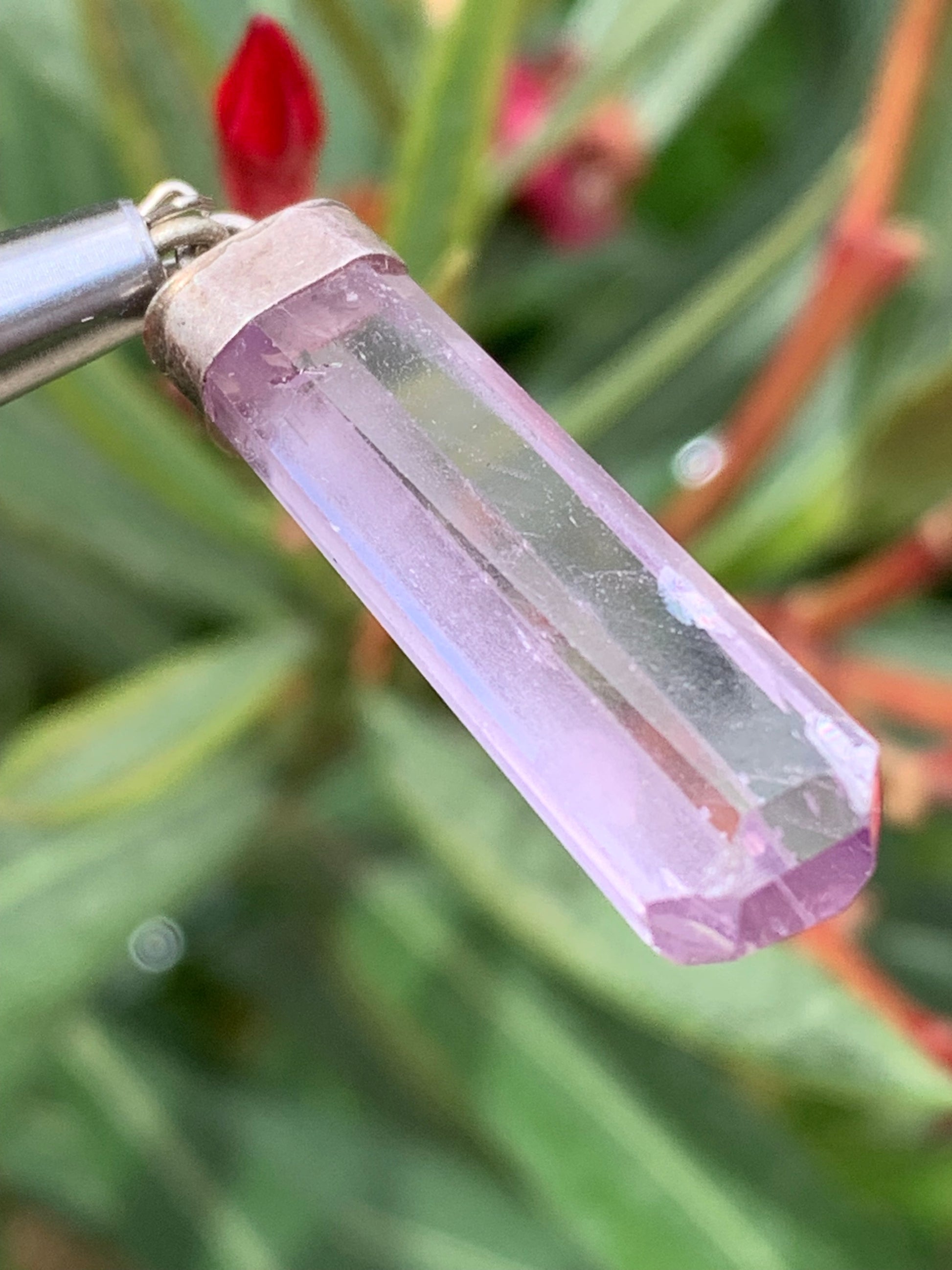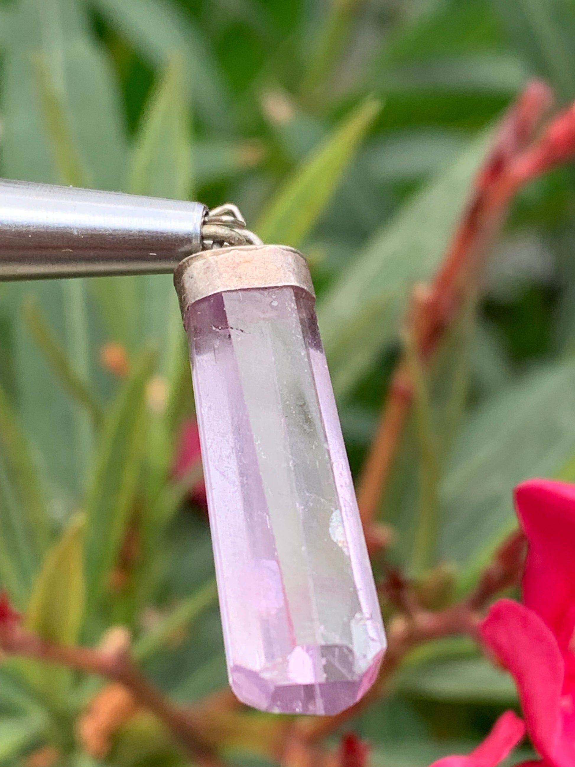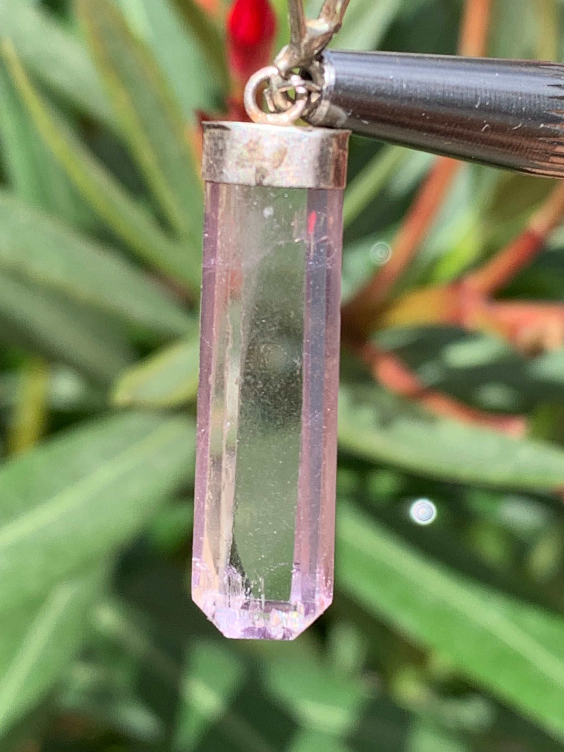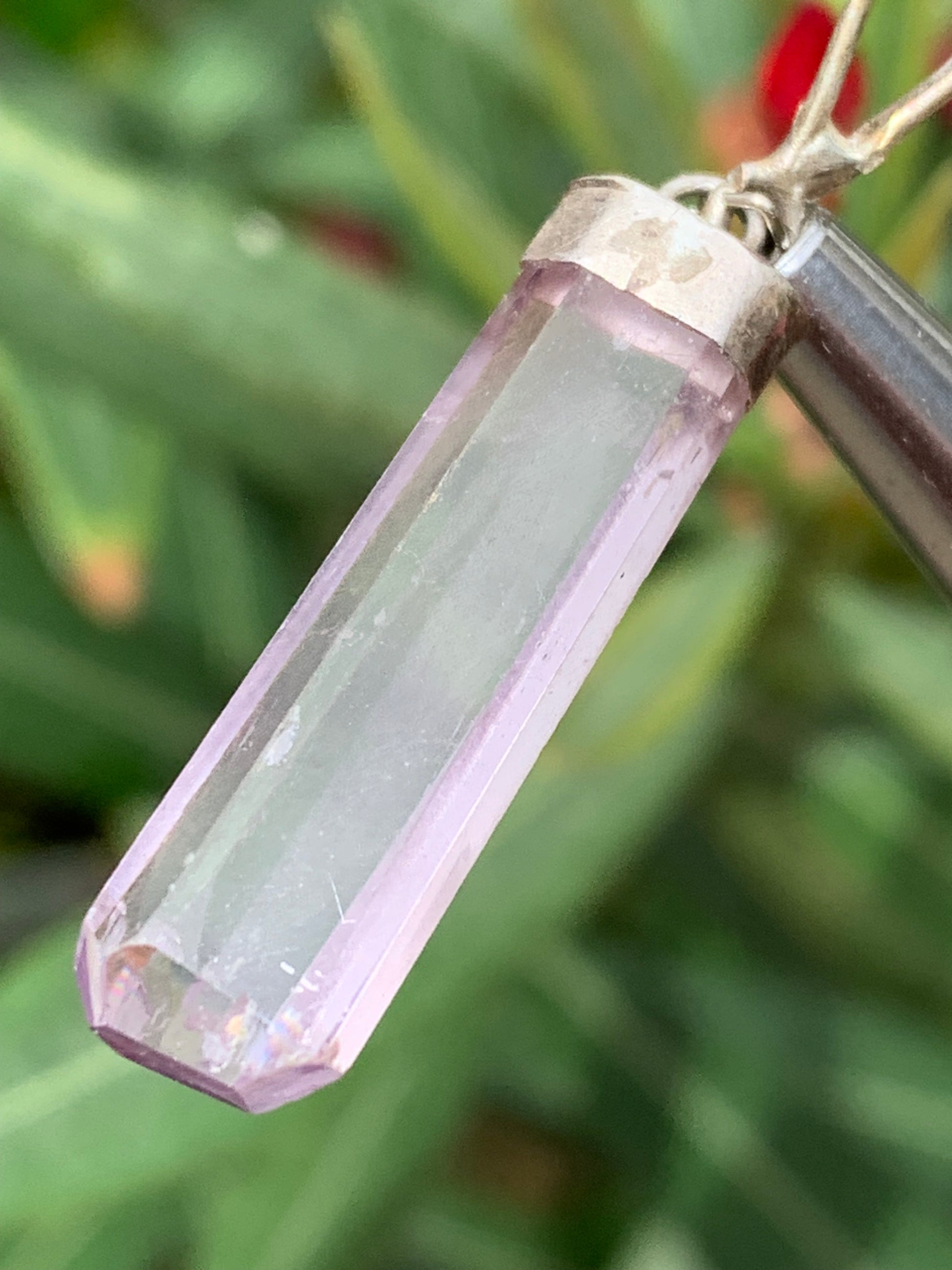 Kunzite naturelle, pendentif sertis sur Argent ! Pièce unique de 43 millimètres x9 x6. Vendu avec cordon réglable de couleur noire !