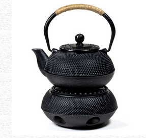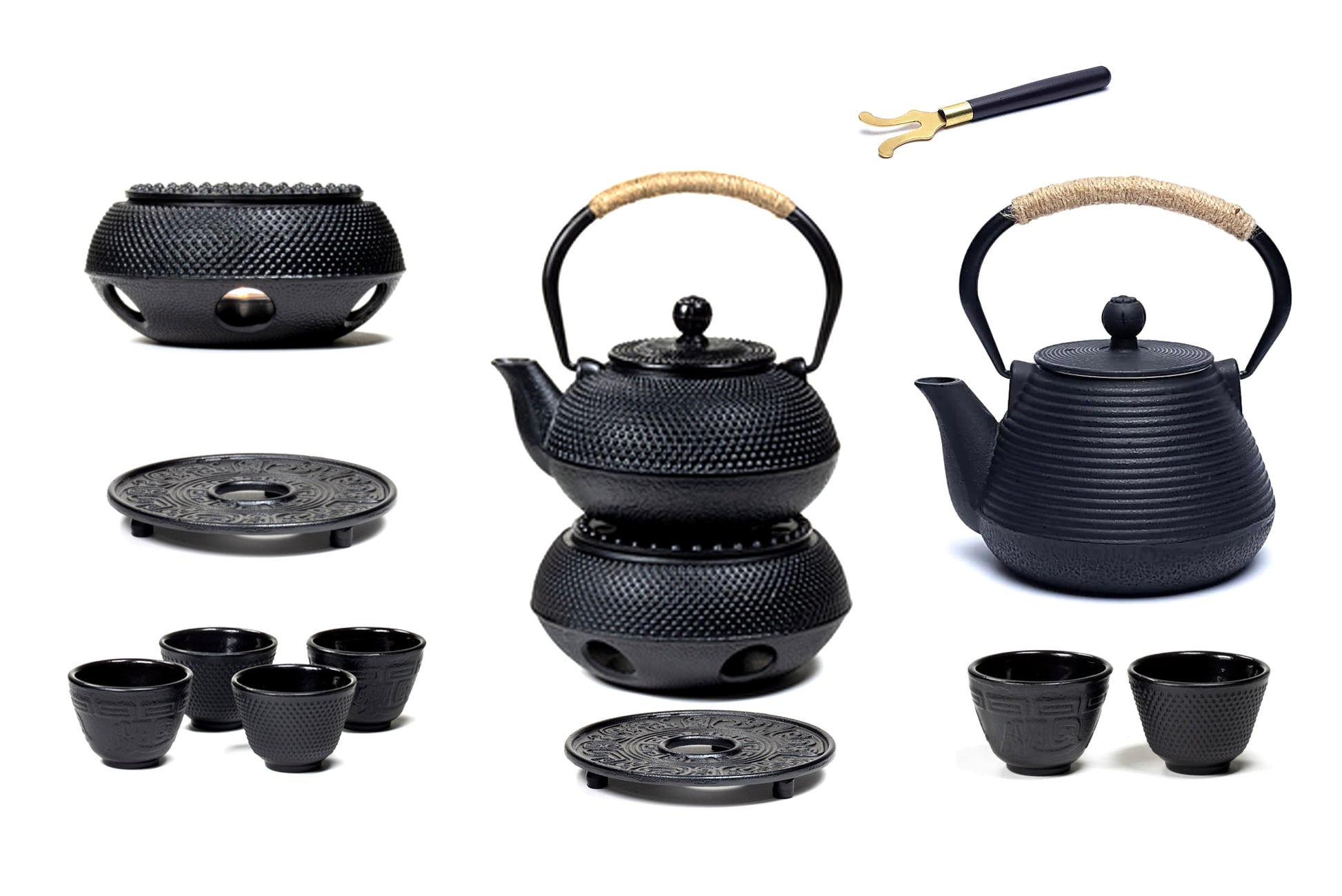 Les célèbres Théières émaillés en fonte, 'Tetsubin' et 'Tetsukyusu' de style traditionnel avec accessoires - 0,6, 1 ou 1,2 Litres. Options : tasse 65 ou 120 ml, chauffe-théière, assiette, porte couvercle... Parfait !
