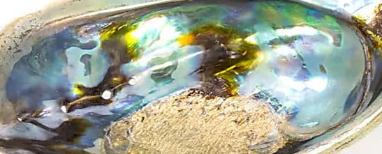 đȘ Type/ Nom : L'Abalone (coquille d'ormeau) arc-en-ciel, ou Haliotis Iris, a de belles couleurs, principalement bleues et vertes et cette variante de la nacre est appelĂ©e paua par les Maoris, la population d'origine de la Nouvelle-ZĂ©lande.