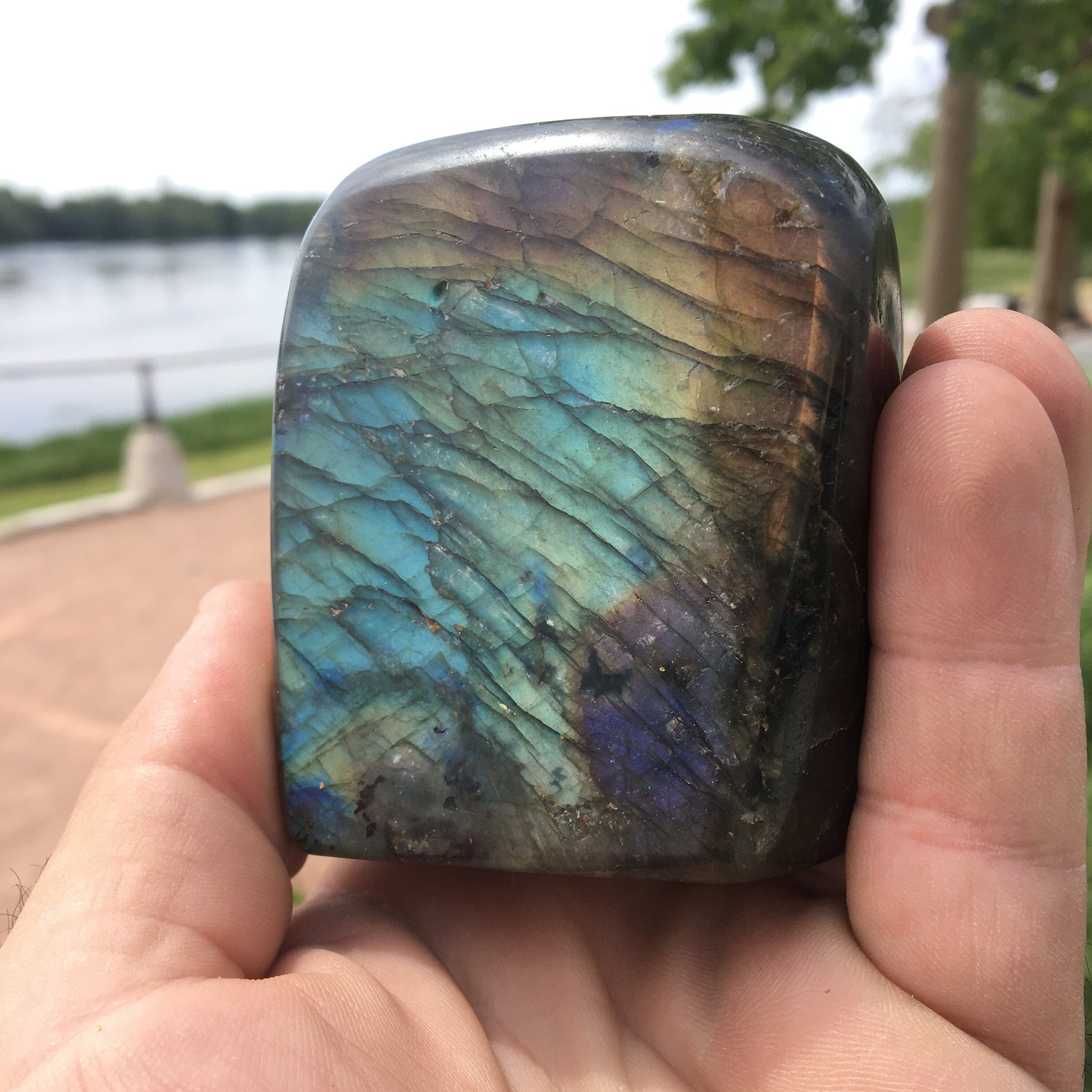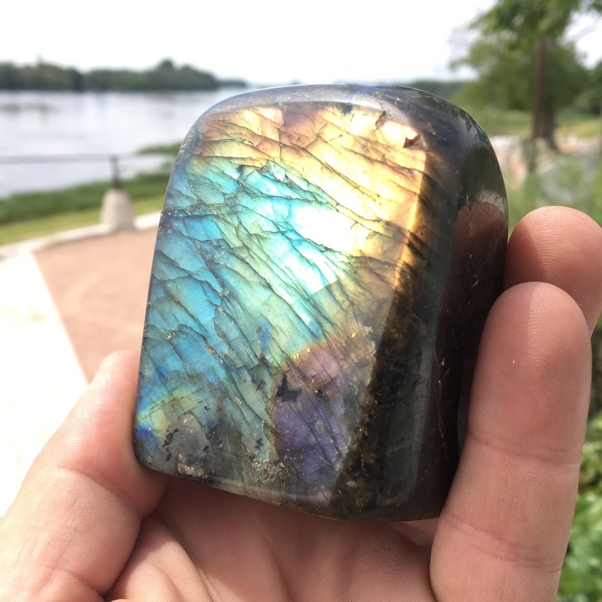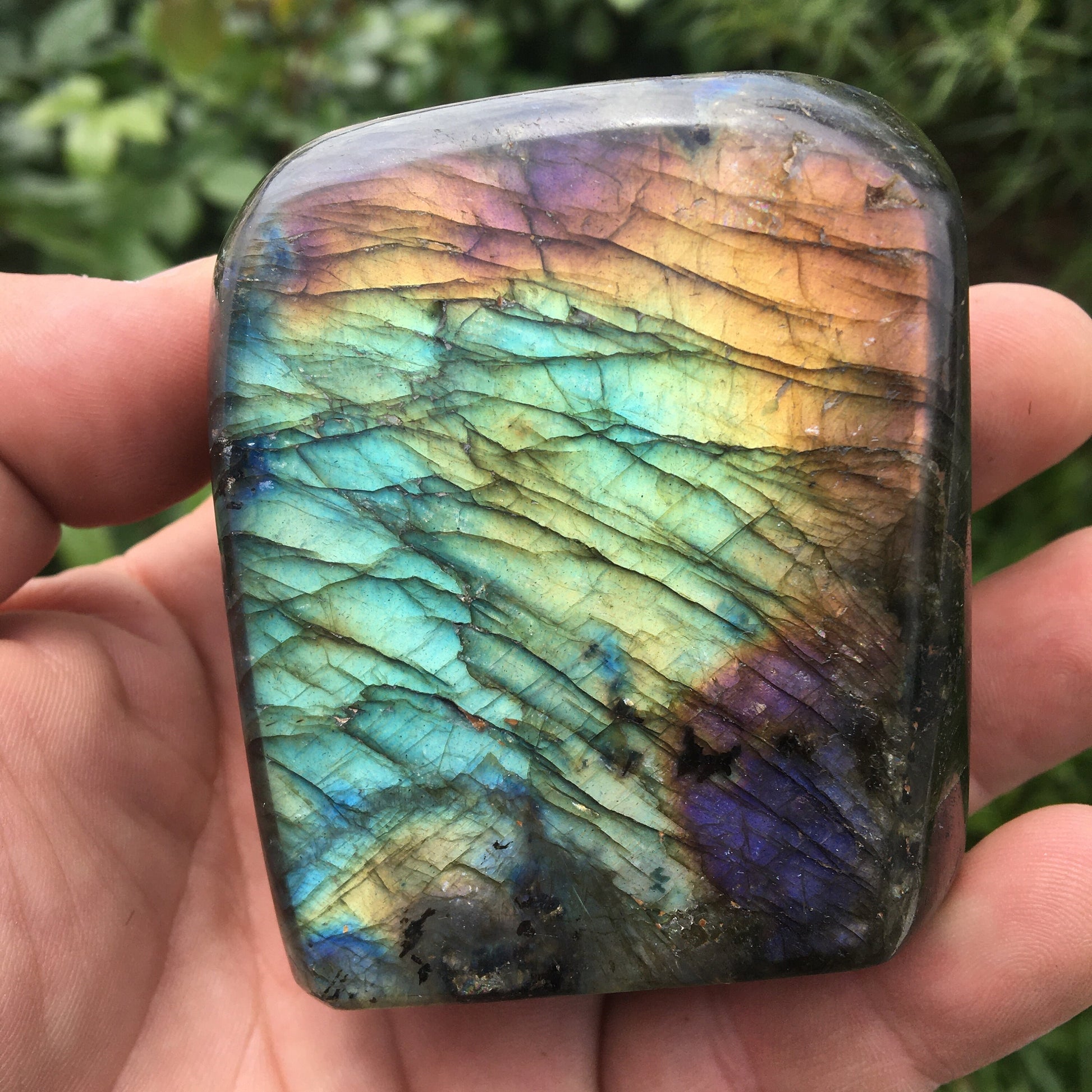 Labradorite, forme libre de qualité AAA, environ 71 x 60 x 40 mm - 396 grammes environ. Très belle qualité, des reflets hologramme incroyable !