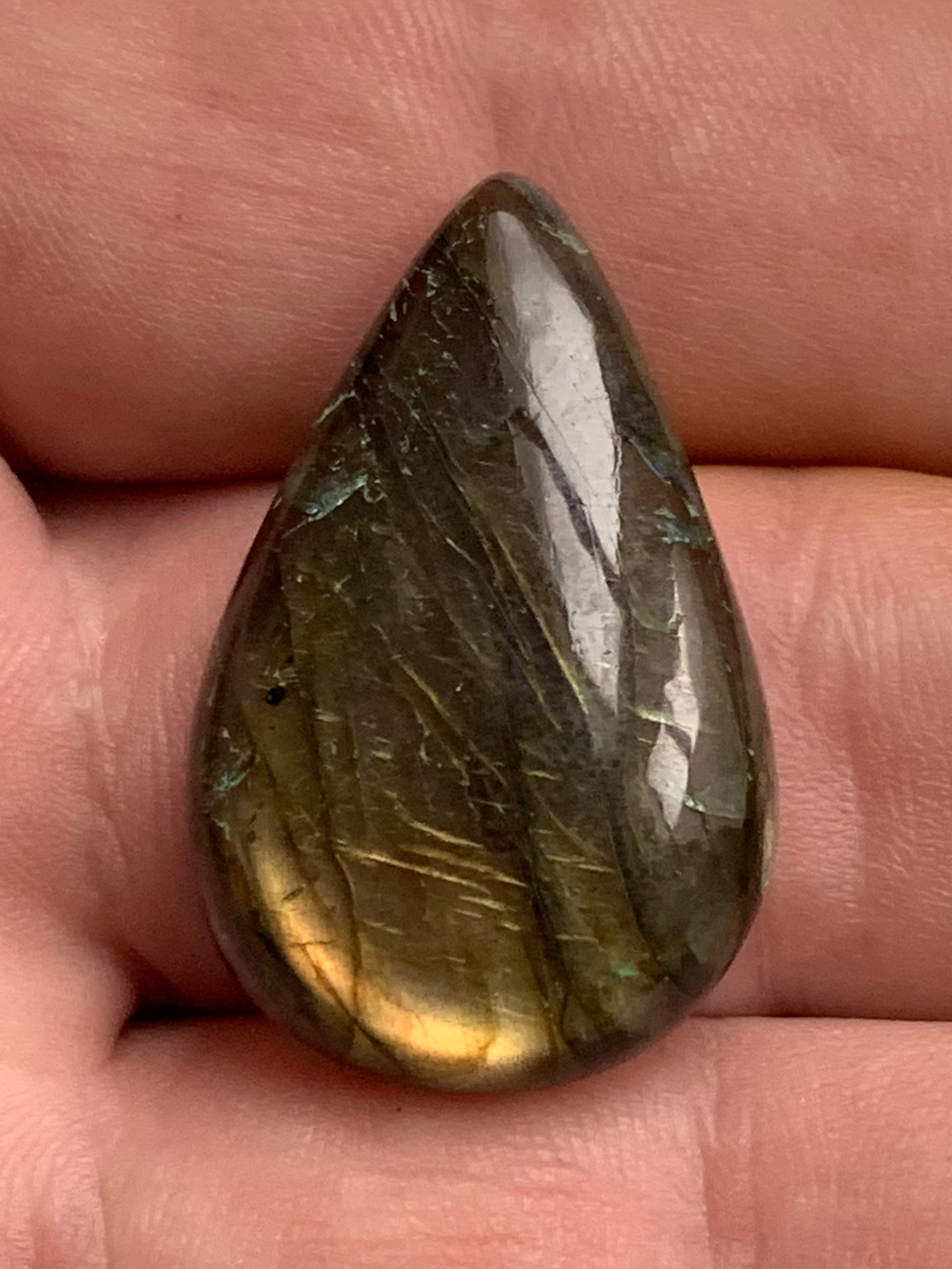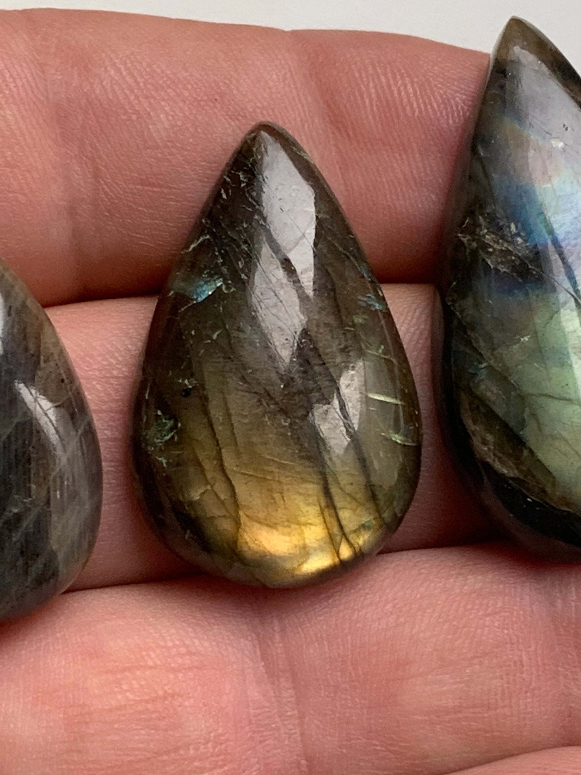 Labradorite, cabochon en forme de 'goutte' vendu à l'unité - ± 26, 34 et 40 mm - 4.8, 6.8 et 8.3 gr. - Qualité AA à AAA, parfait pour être monter en bijoux ou collection !
