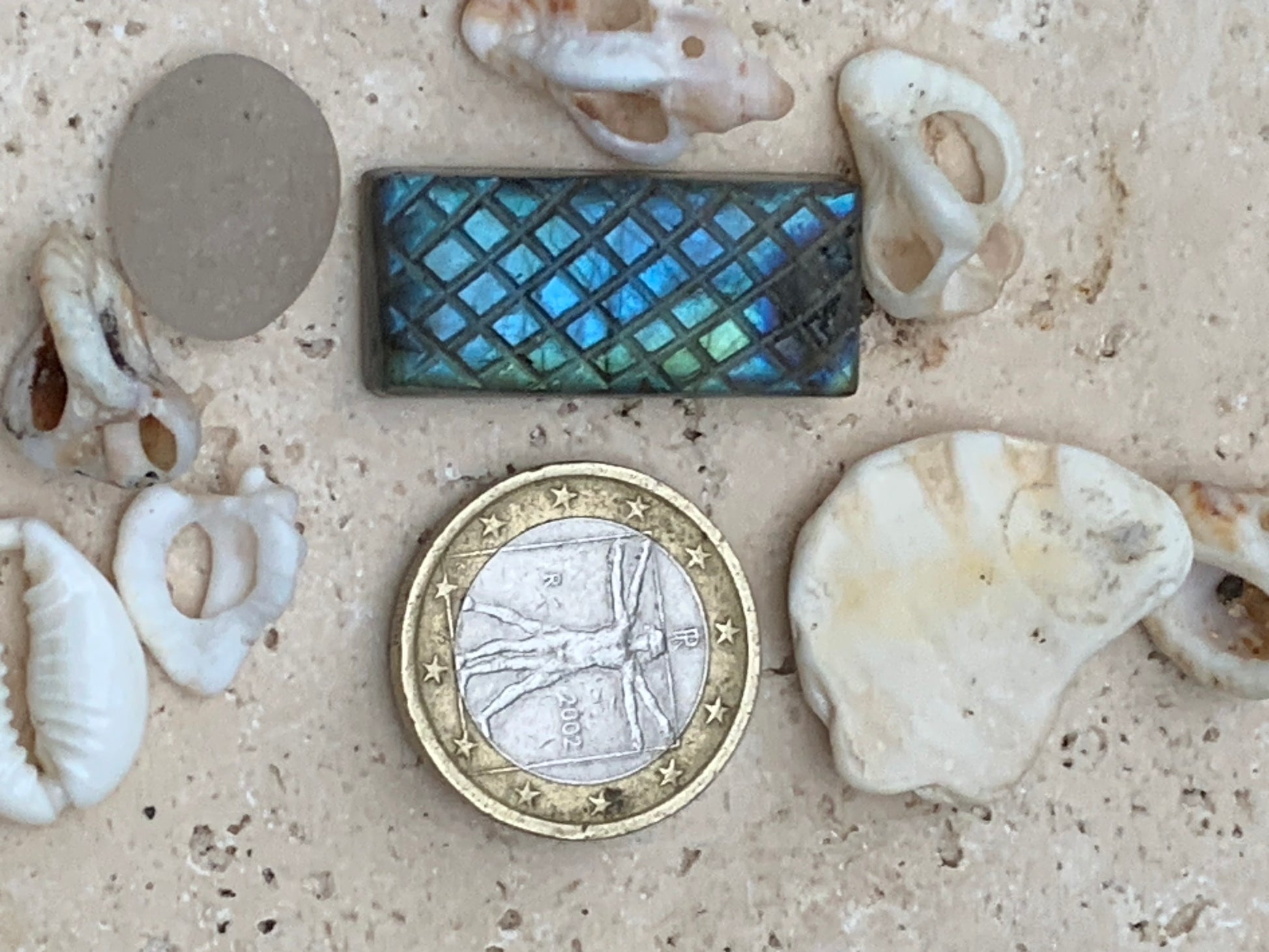 Labradorite, cabochon gravé de 31mm x 14 x 7. Qualité AA à AAA, parfait pour être monter en bijoux ou collection !