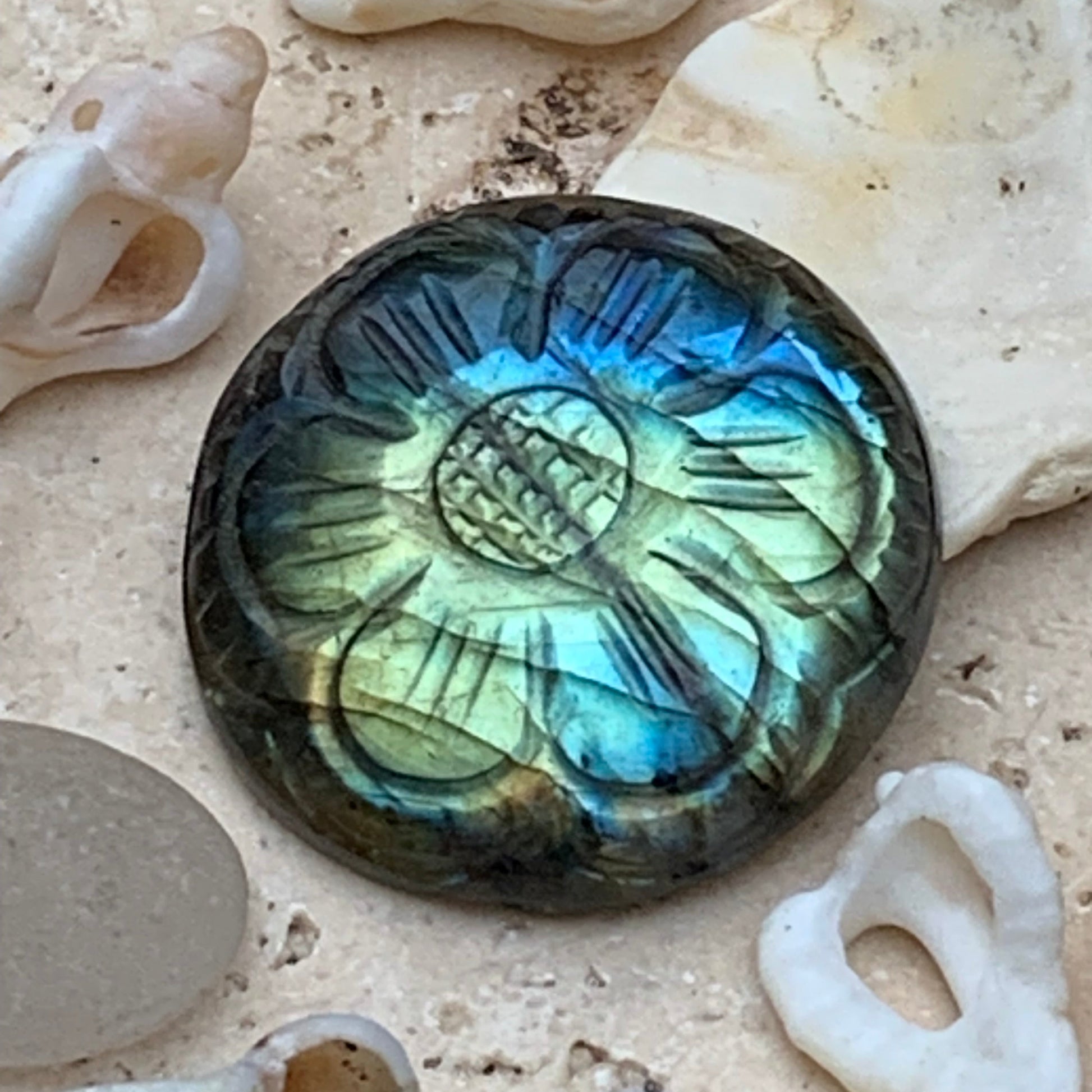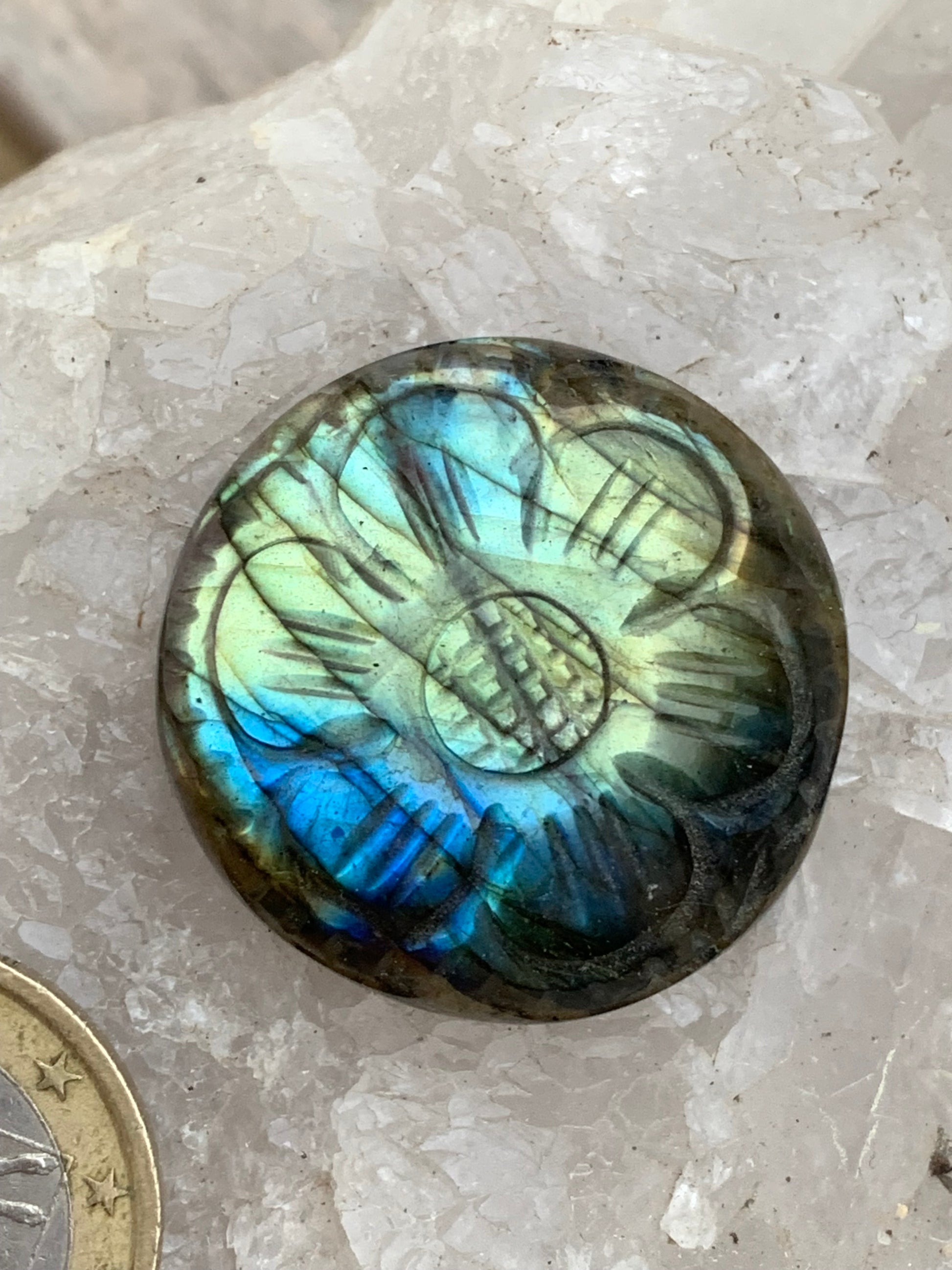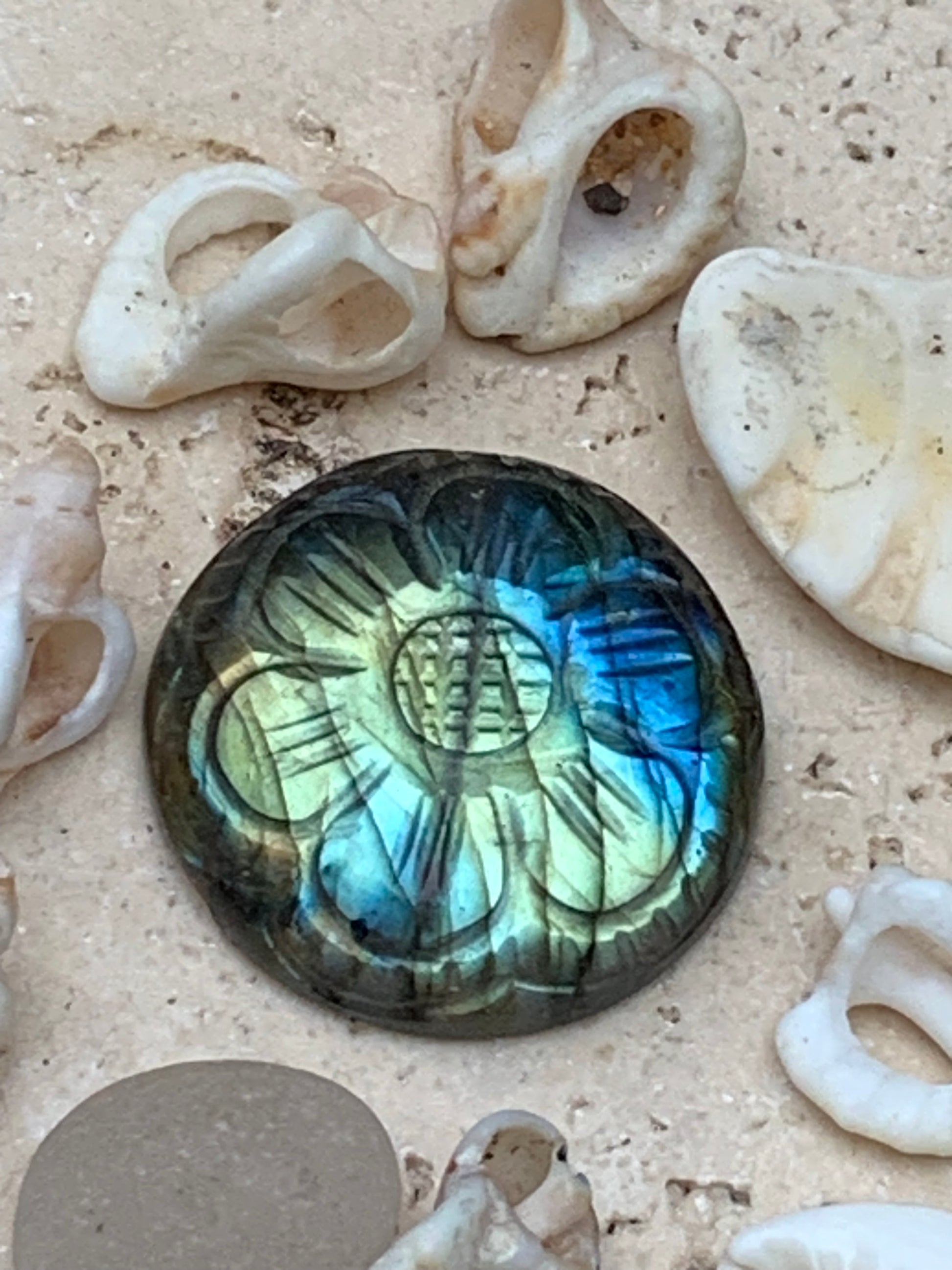 Labradorite, cabochon gravé de 27mm de diamètre x 8. Qualité AA à AAA, parfait pour être monter en bijoux ou collection !
