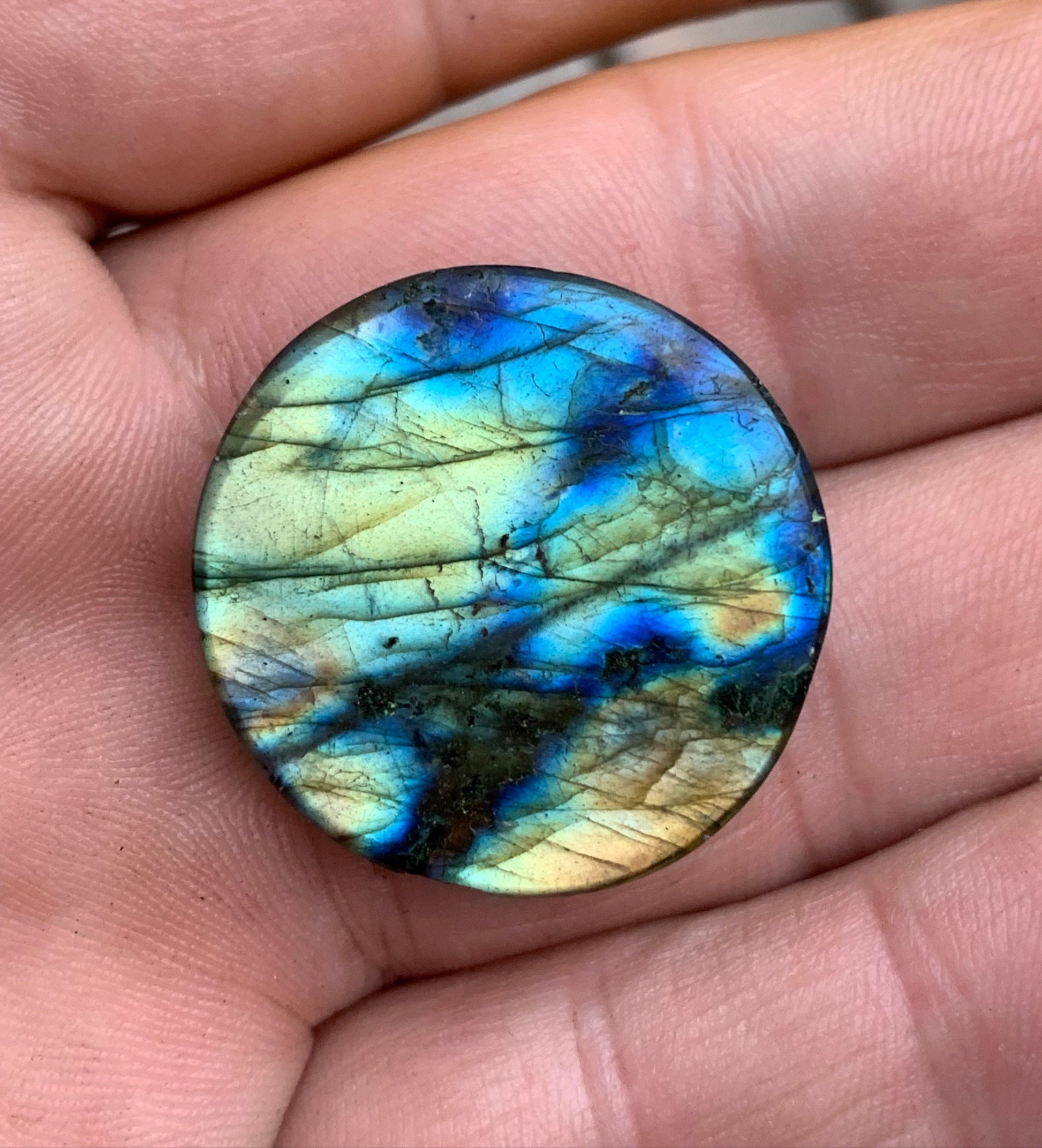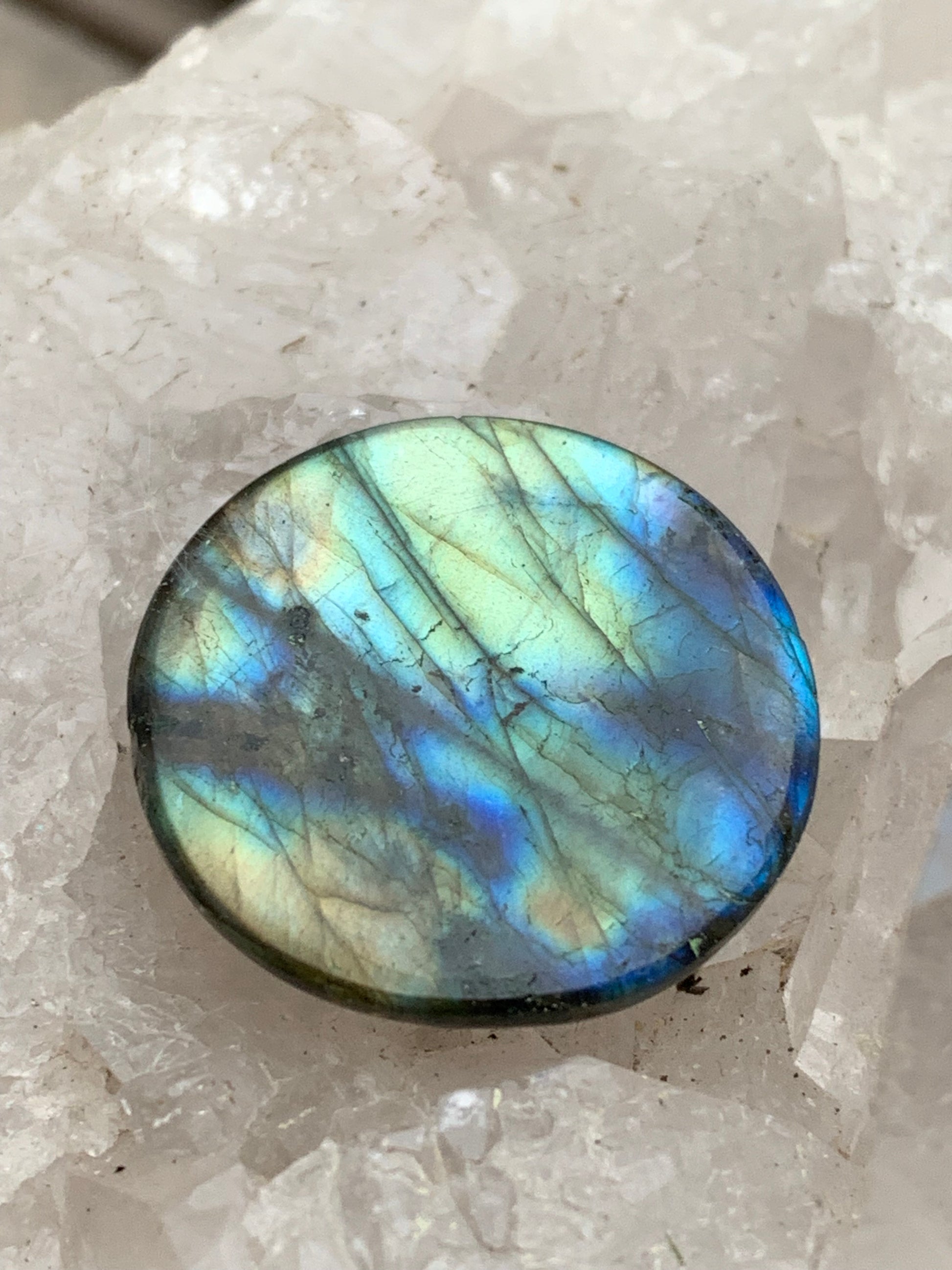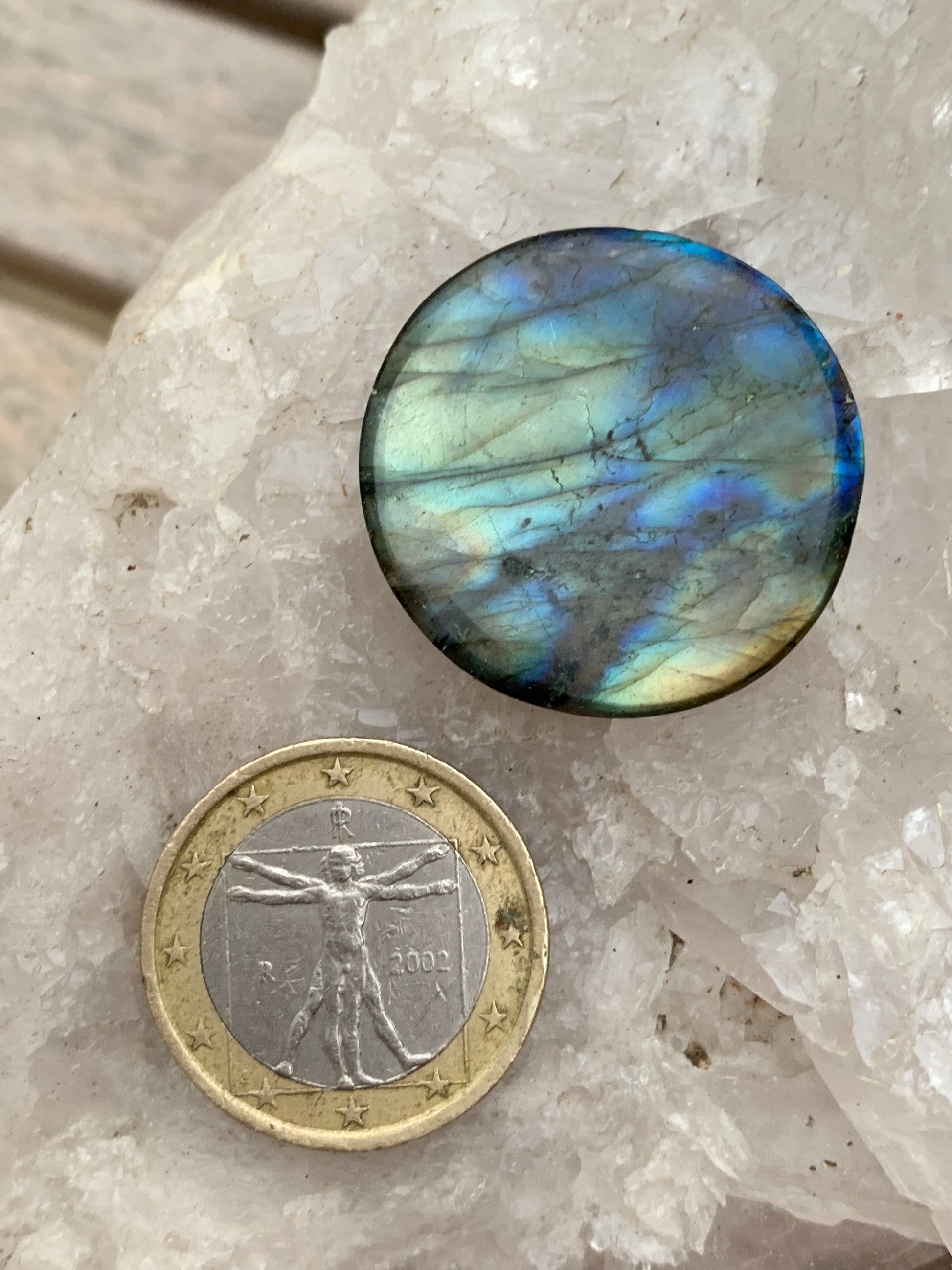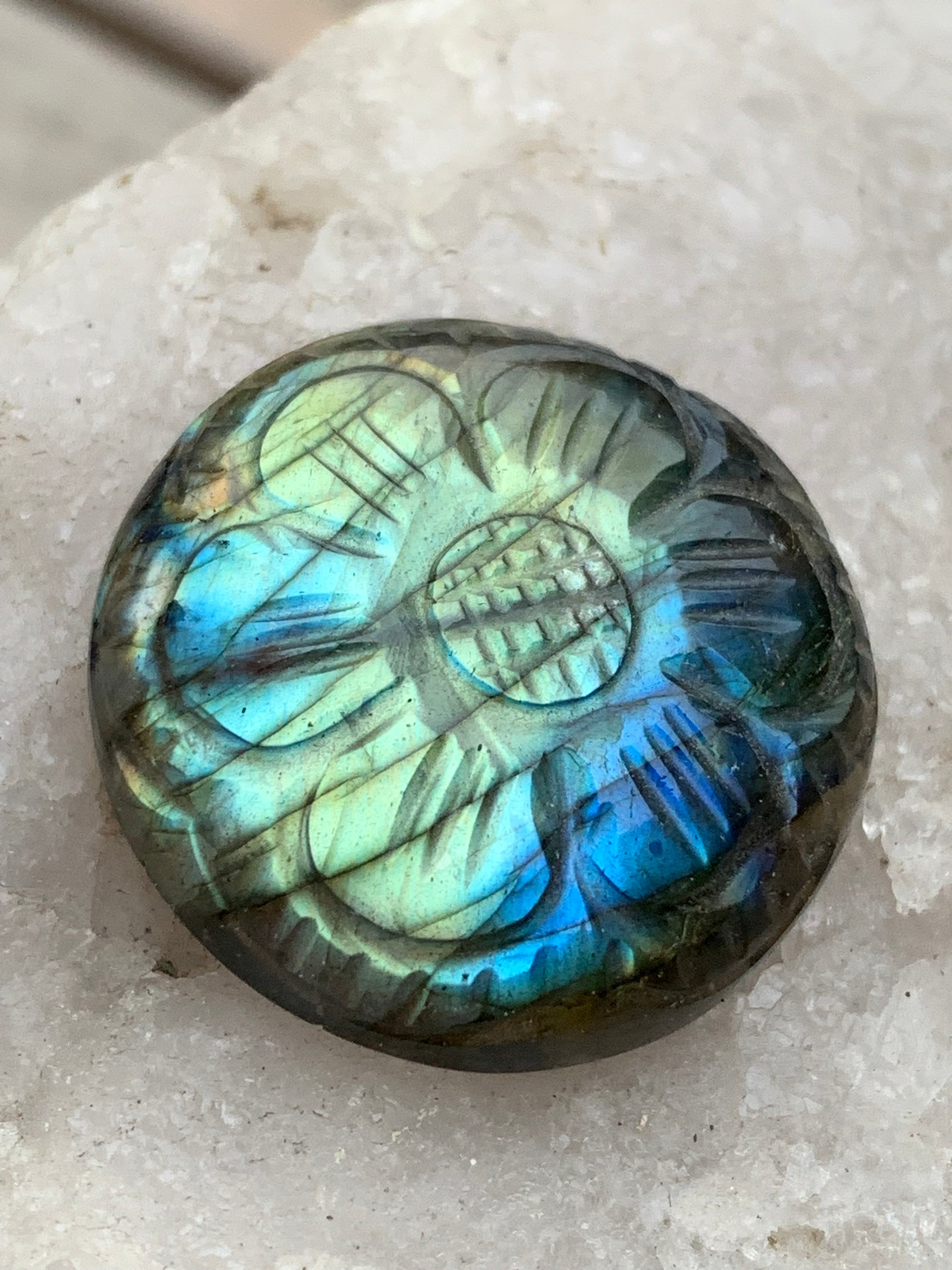 Labradorite, cabochon gravé de 27mm de diamètre x 8. Qualité AA à AAA, parfait pour être monter en bijoux ou collection !