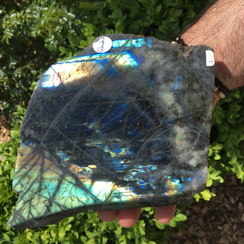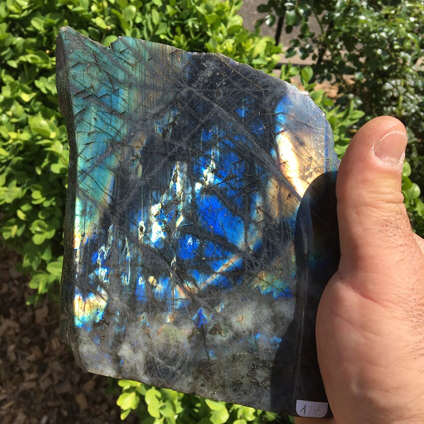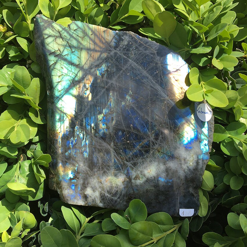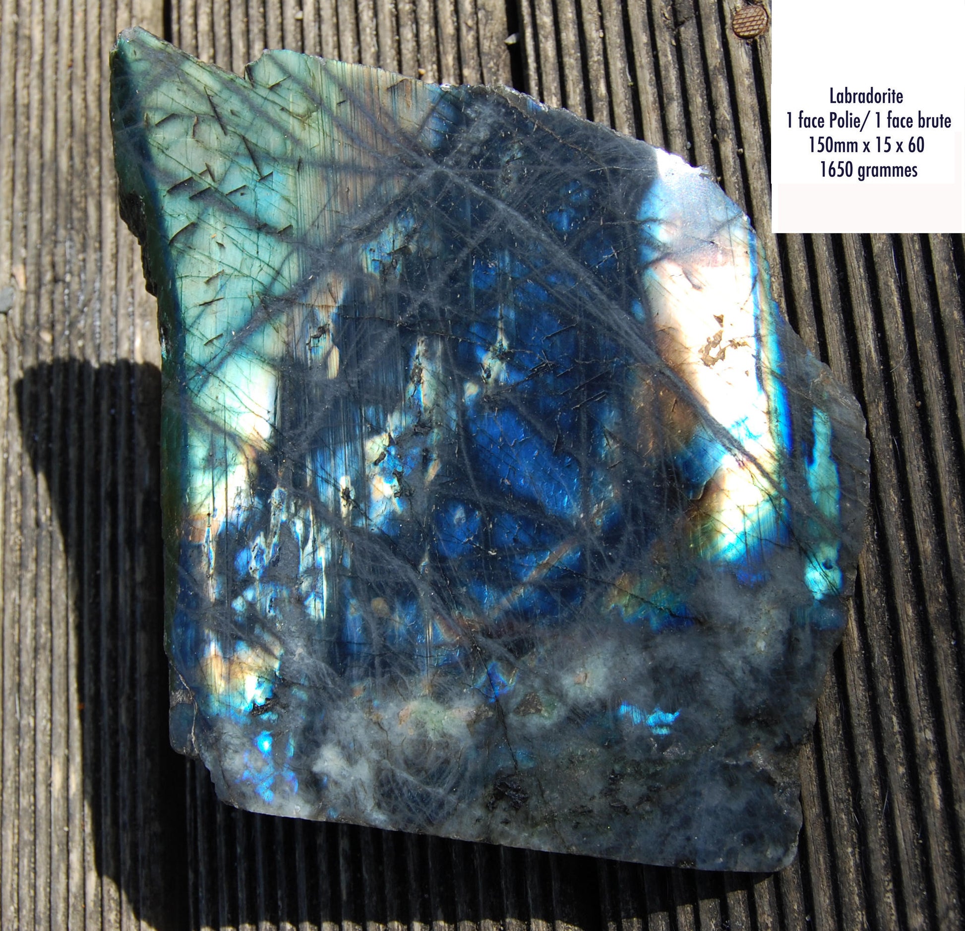 Labradorite, forme libre de qualité AA, 1 face polie 1 face brute, 150 x 150 x 60 mm - 1650 grammes environ. Très belle qualité, des reflets hologramme incroyable !