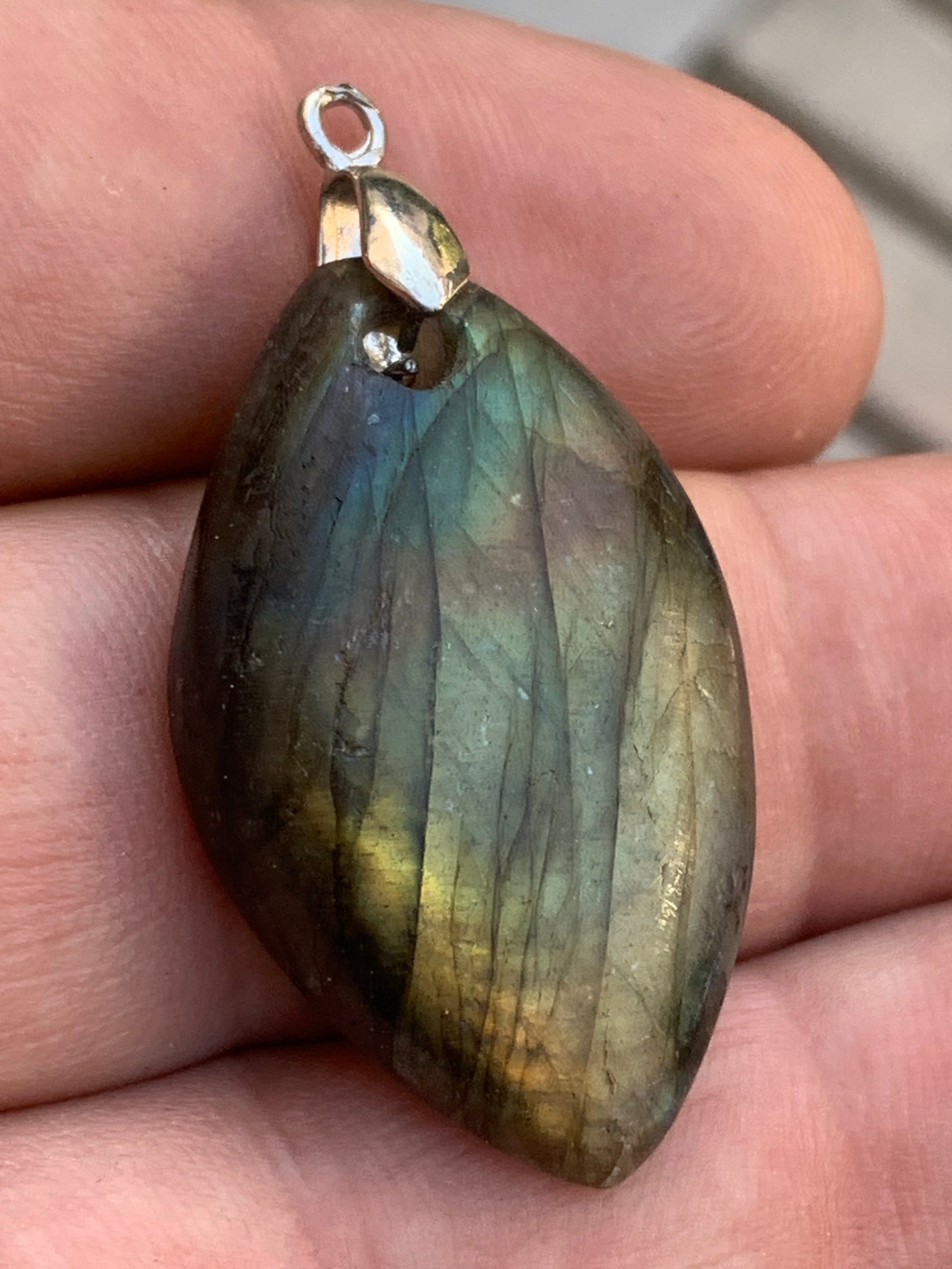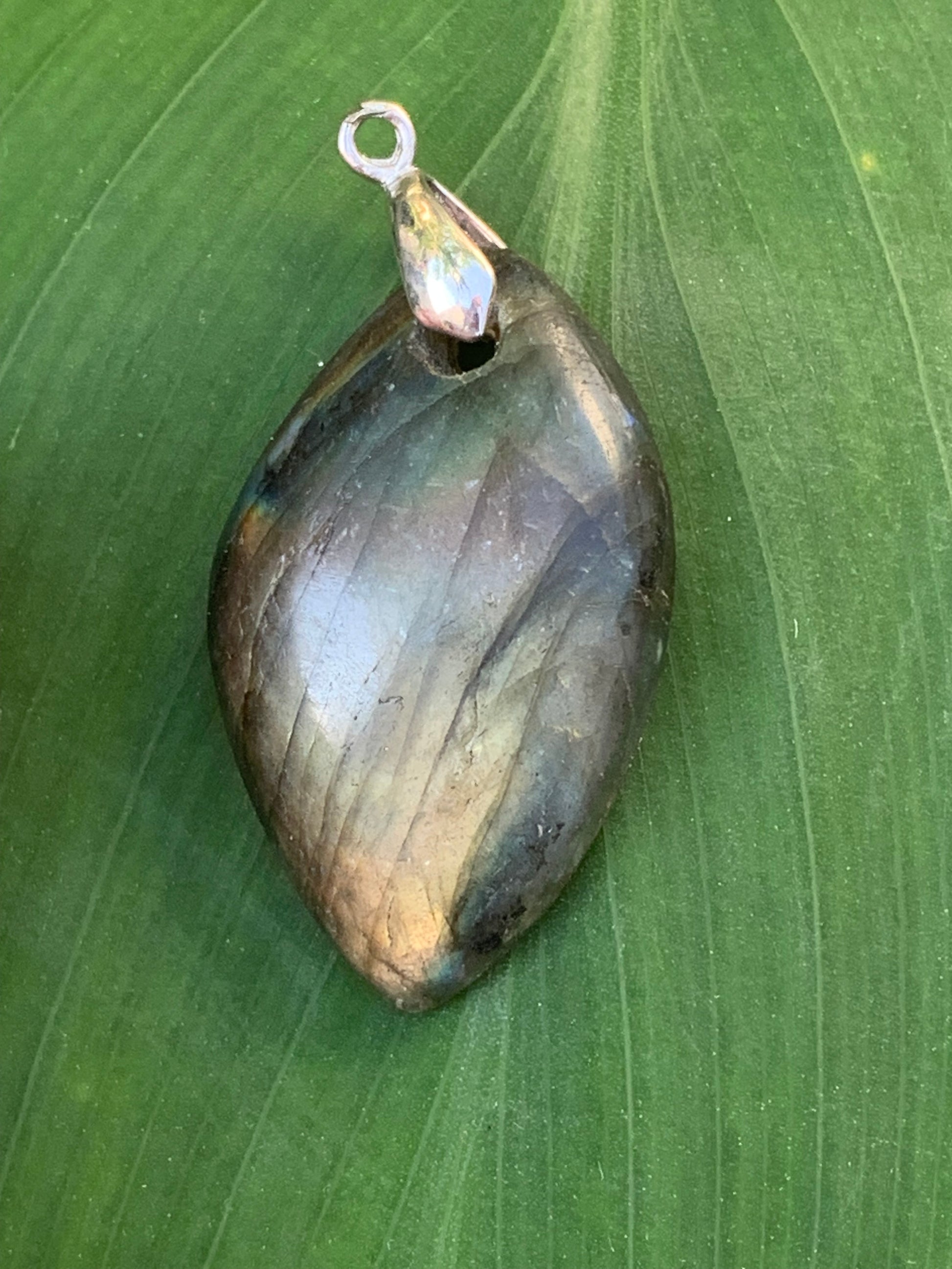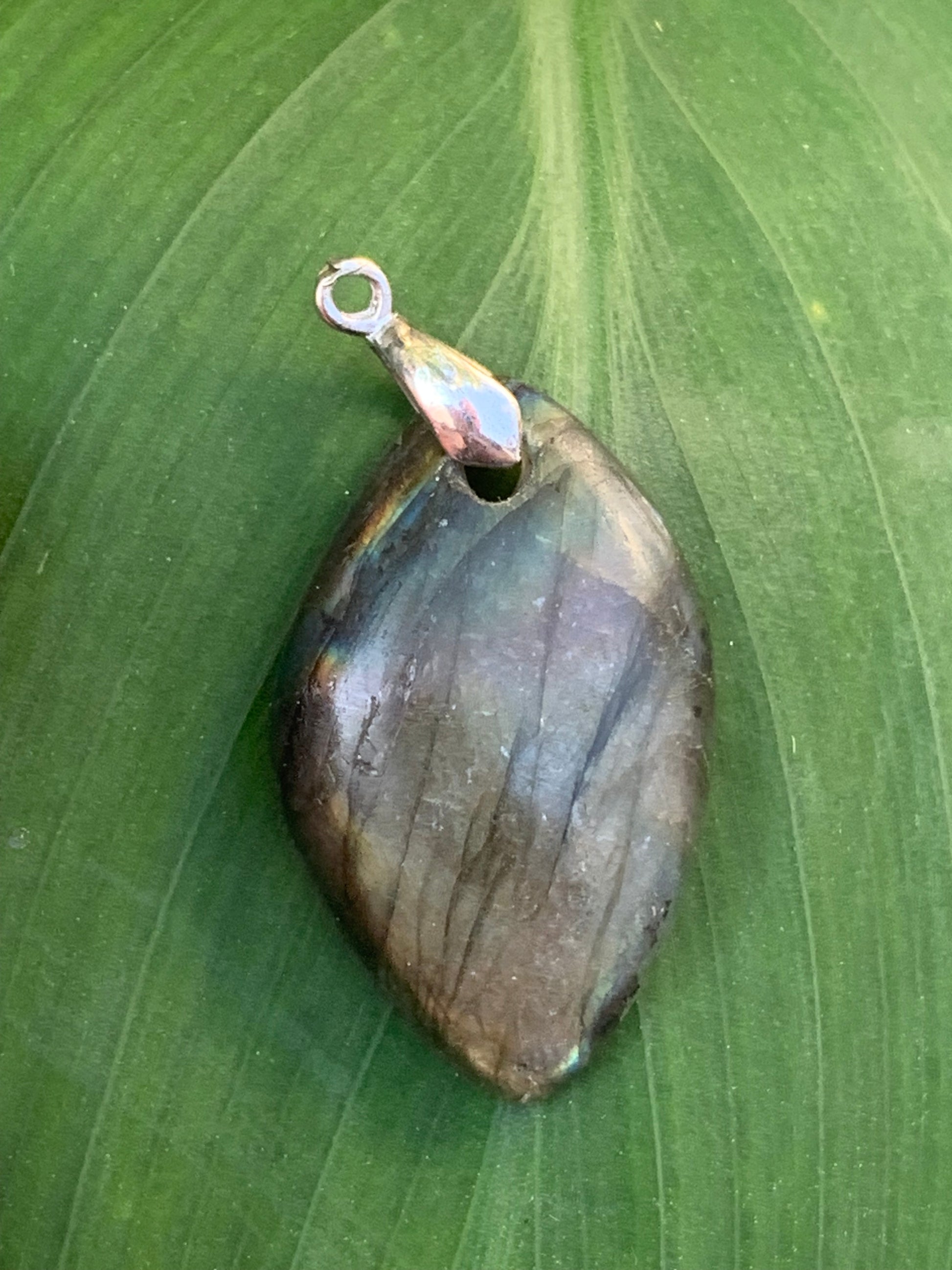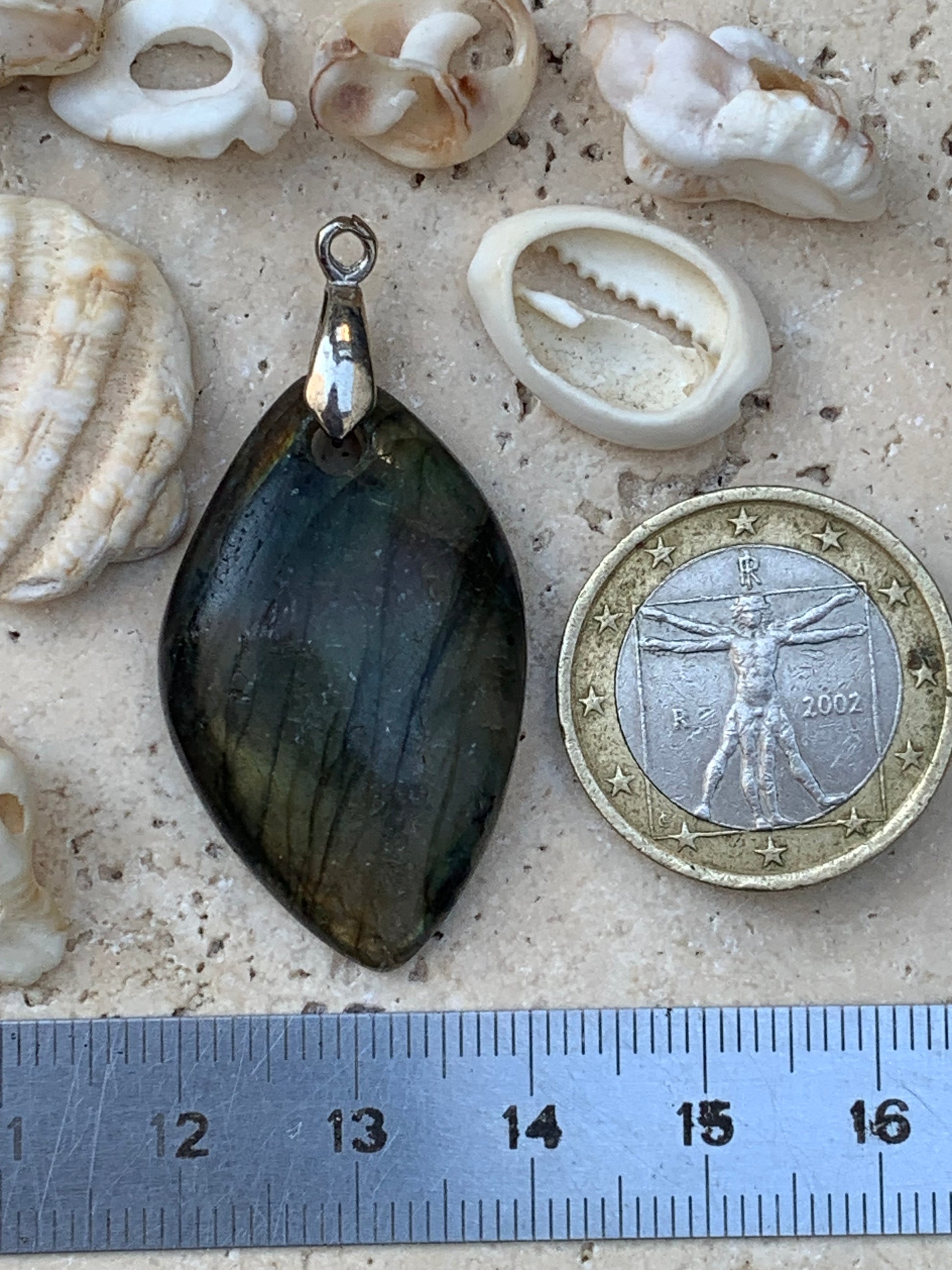 Labradorite, pendentif 'cabochon percé' de 40mm x 21 x 6. Qualité A à AA, vendu avec cordon réglable de couleur noire !