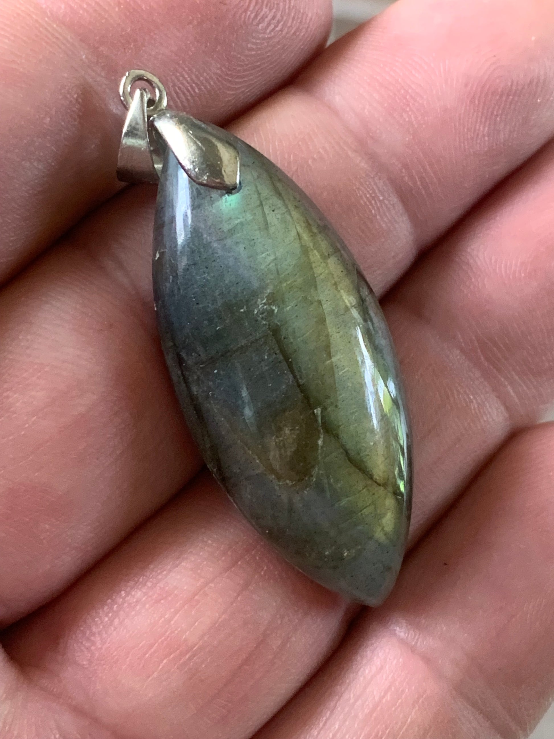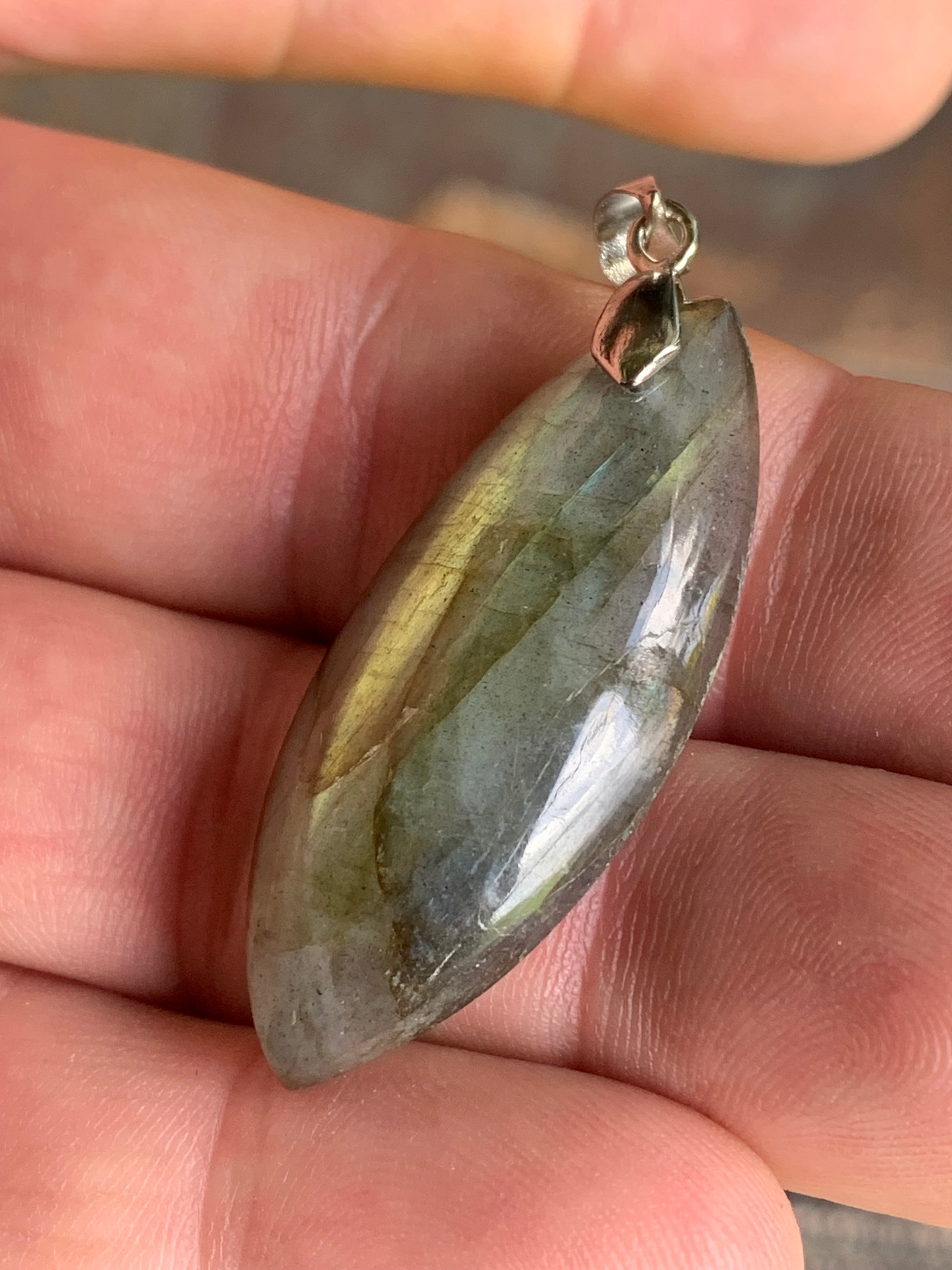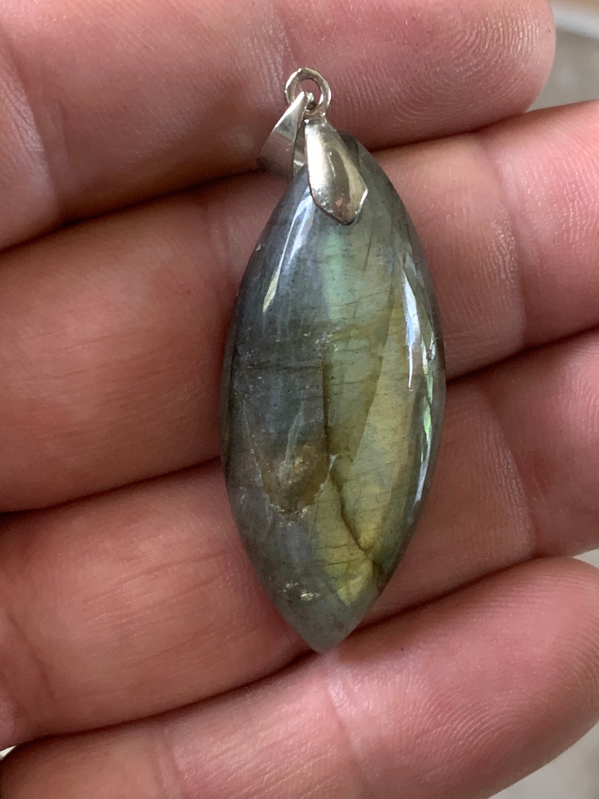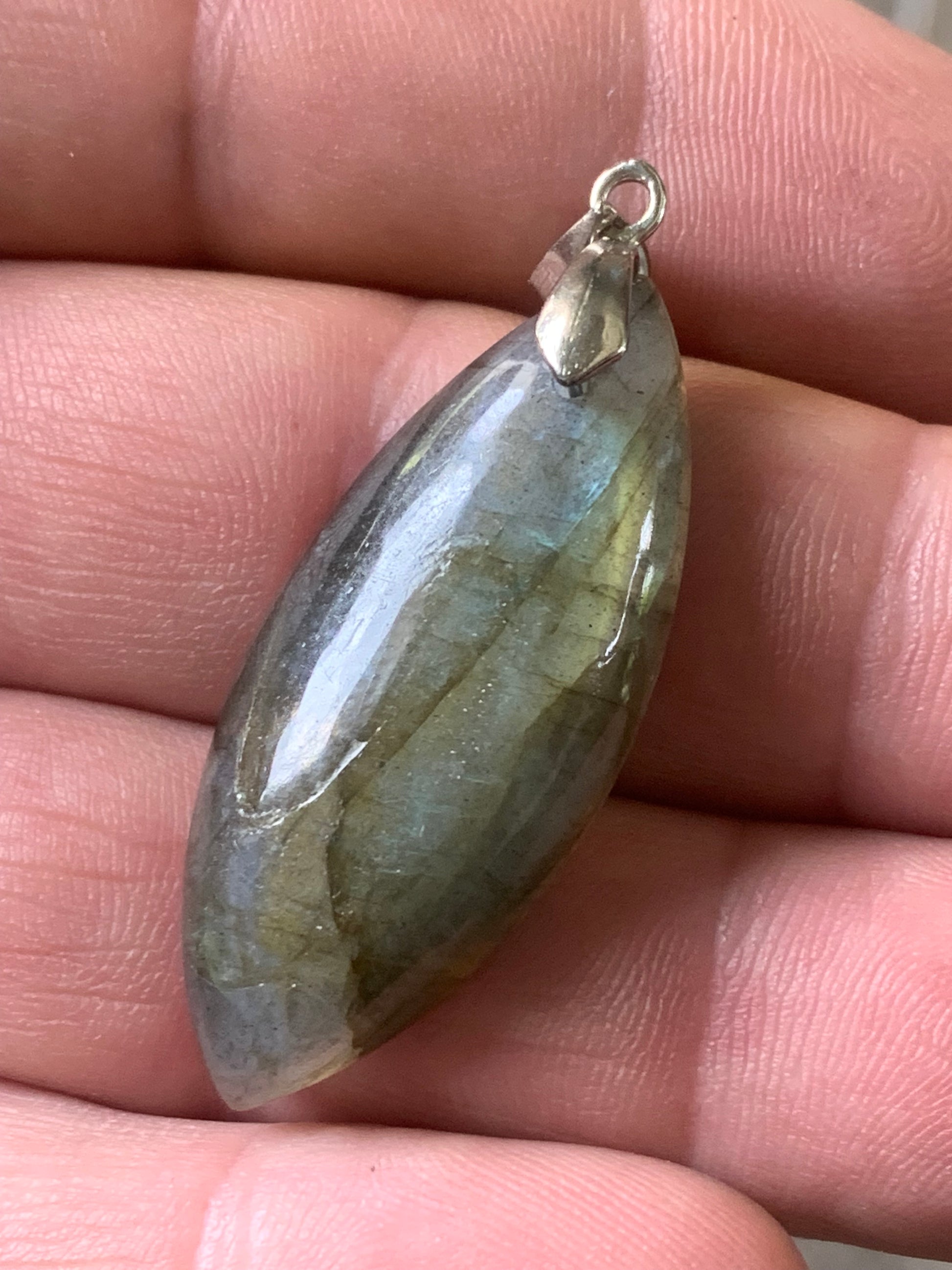 Labradorite, pendentif 'cabochon percé' de 50mm x 20 x 10. Qualité A à AA, vendu avec cordon réglable de couleur noire !