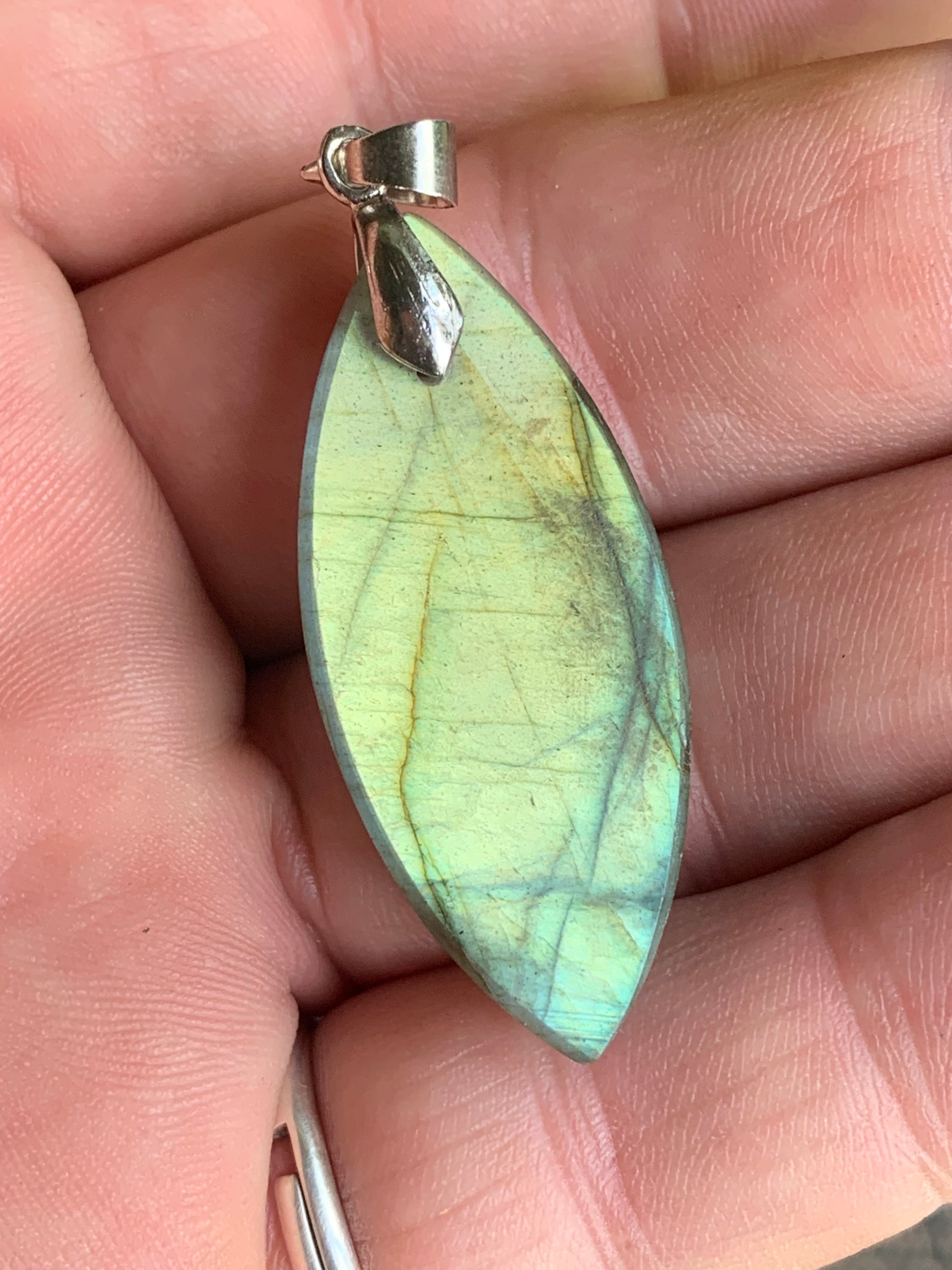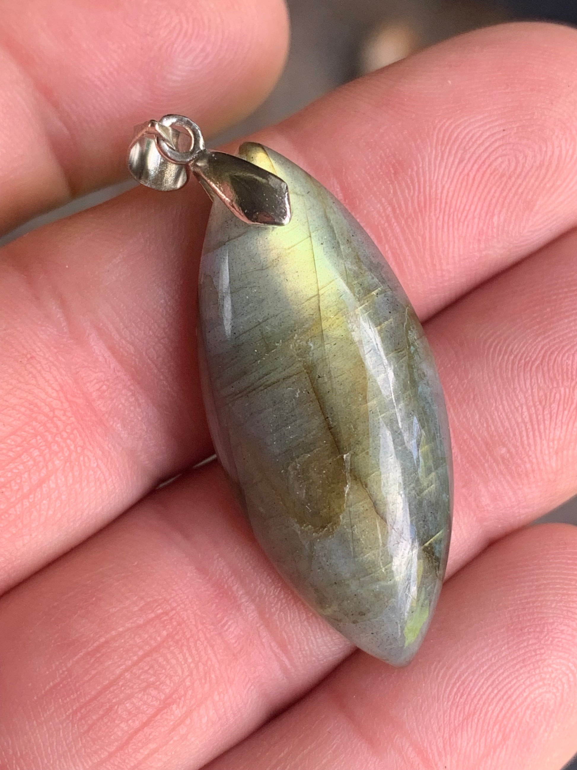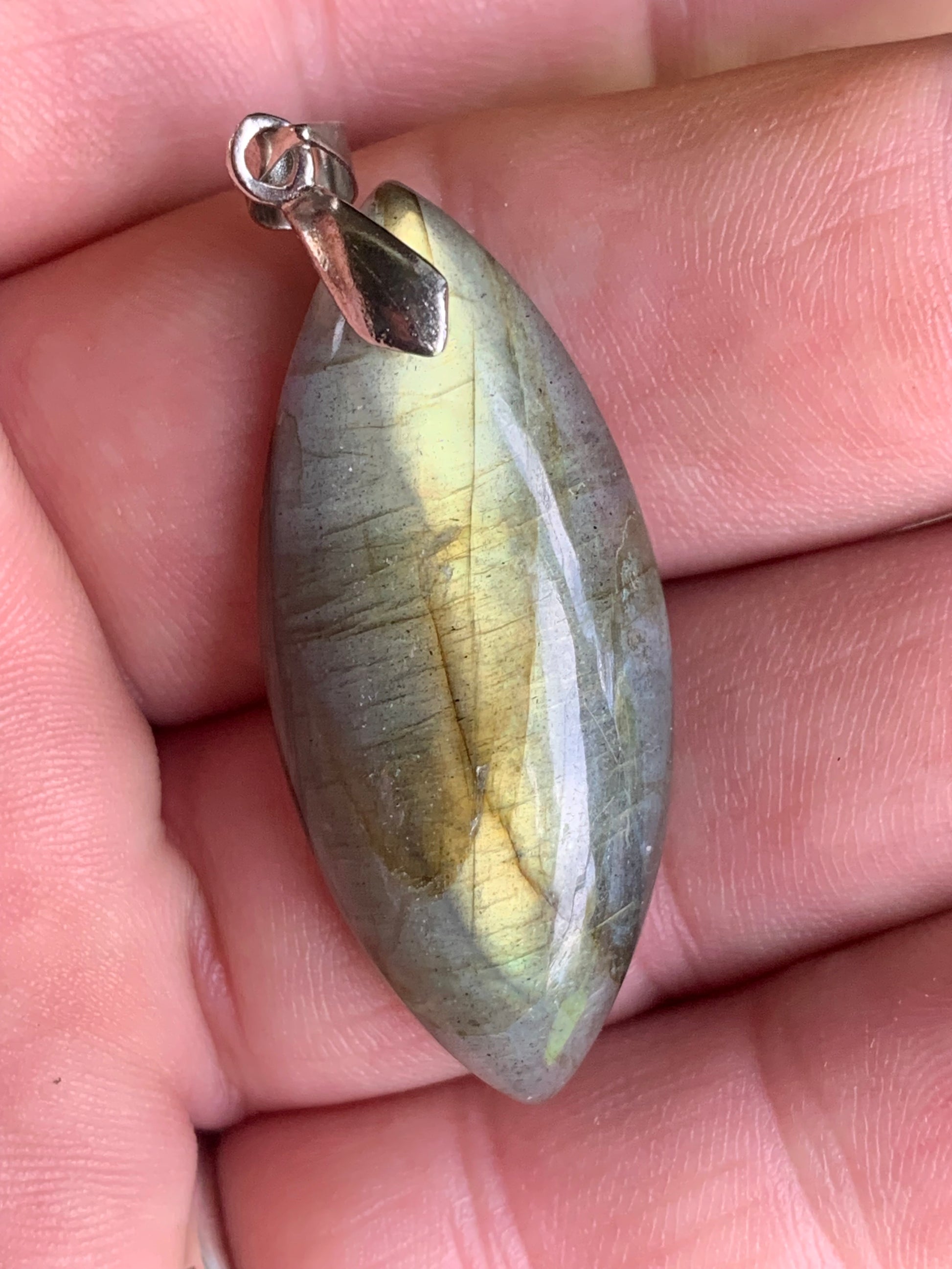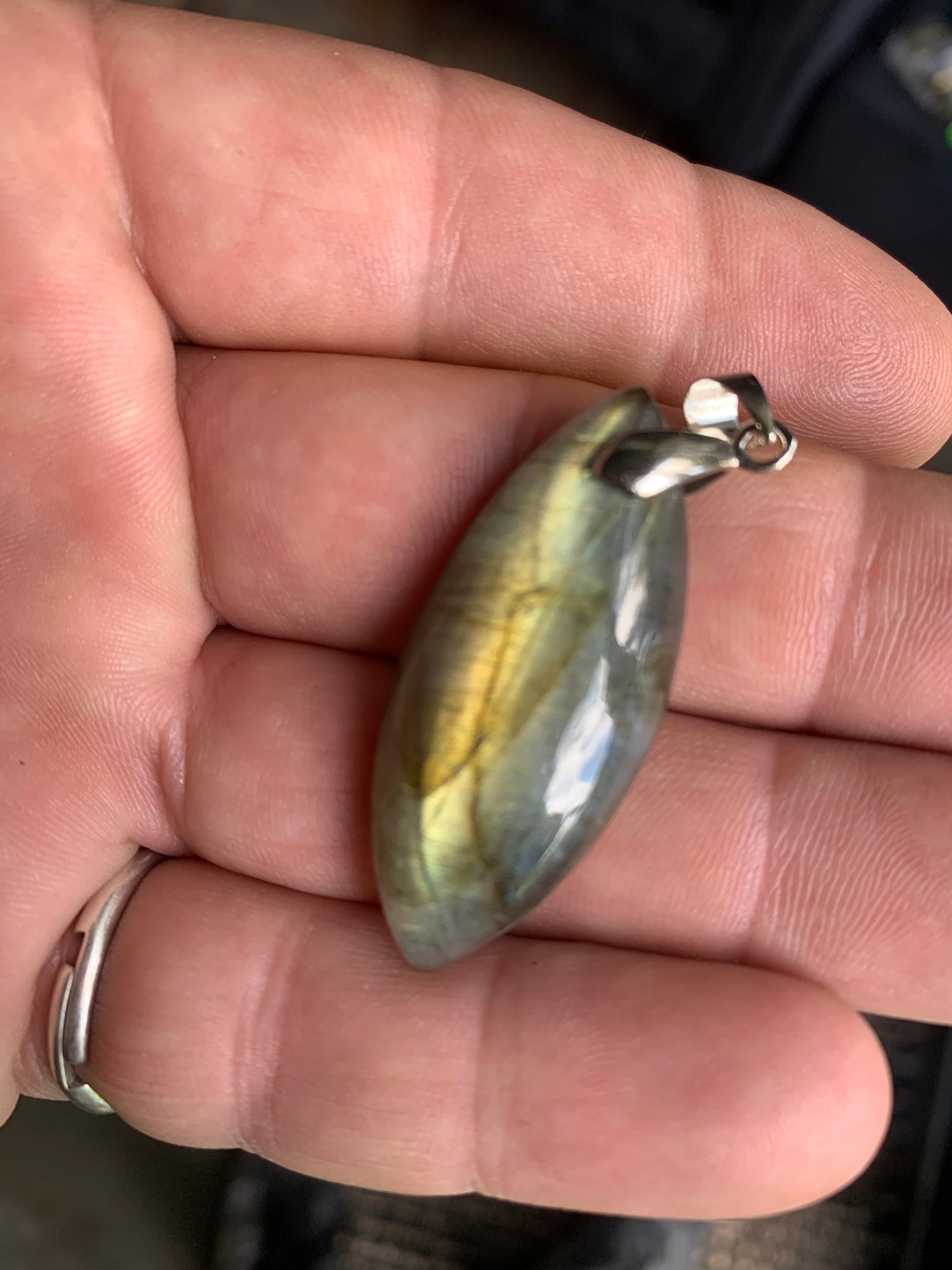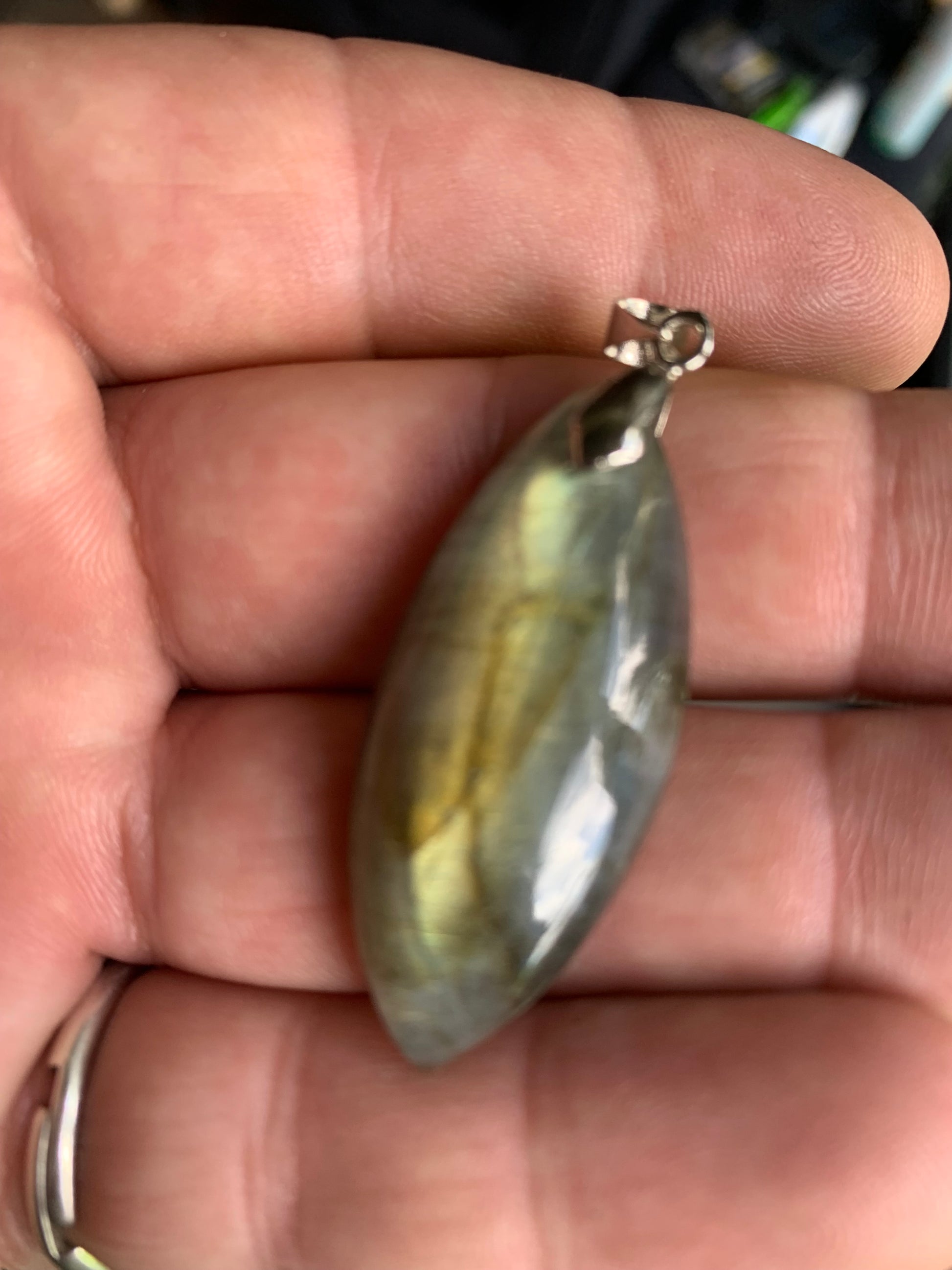 Labradorite, pendentif 'cabochon percé' de 50mm x 20 x 10. Qualité A à AA, vendu avec cordon réglable de couleur noire !