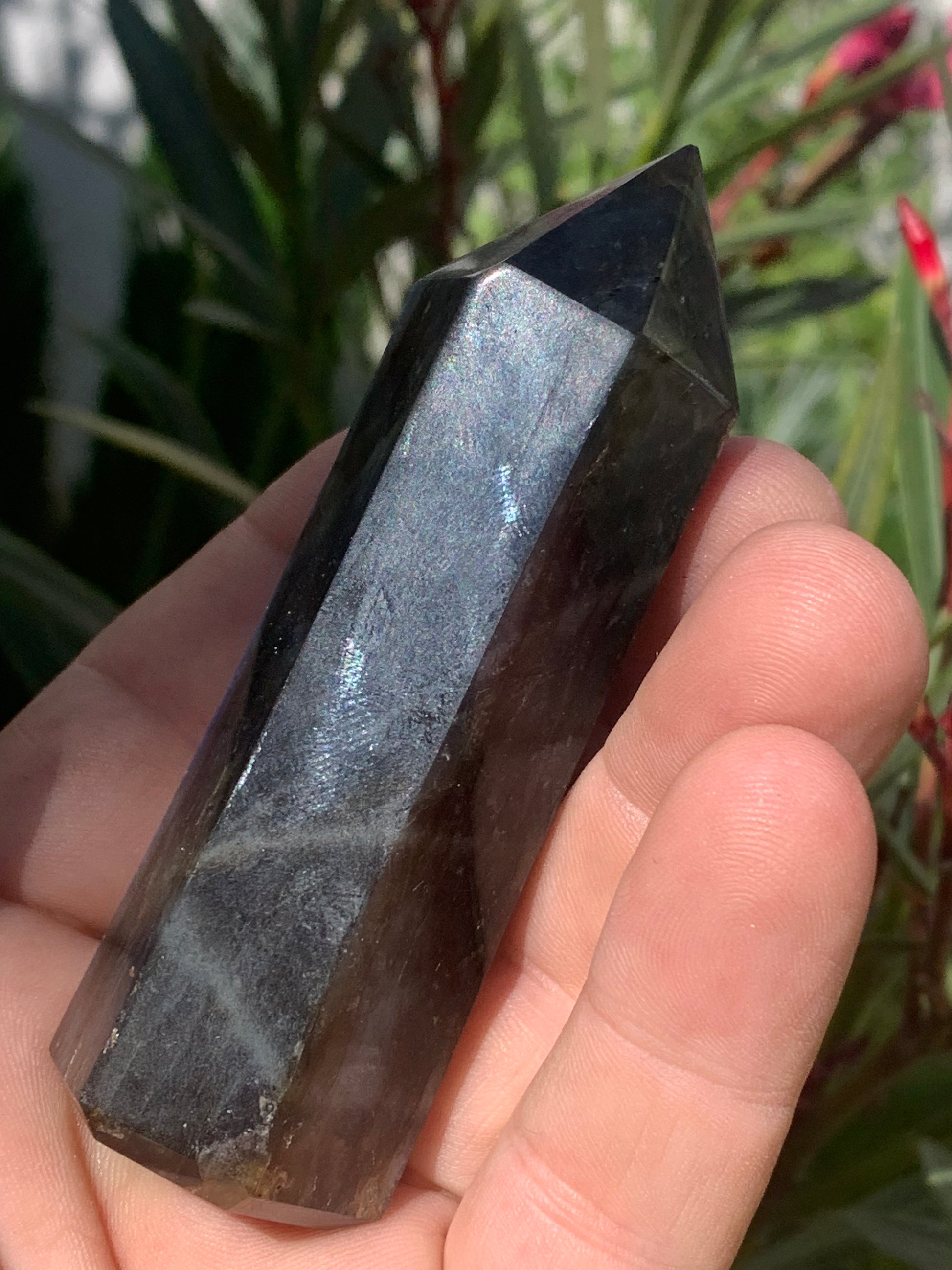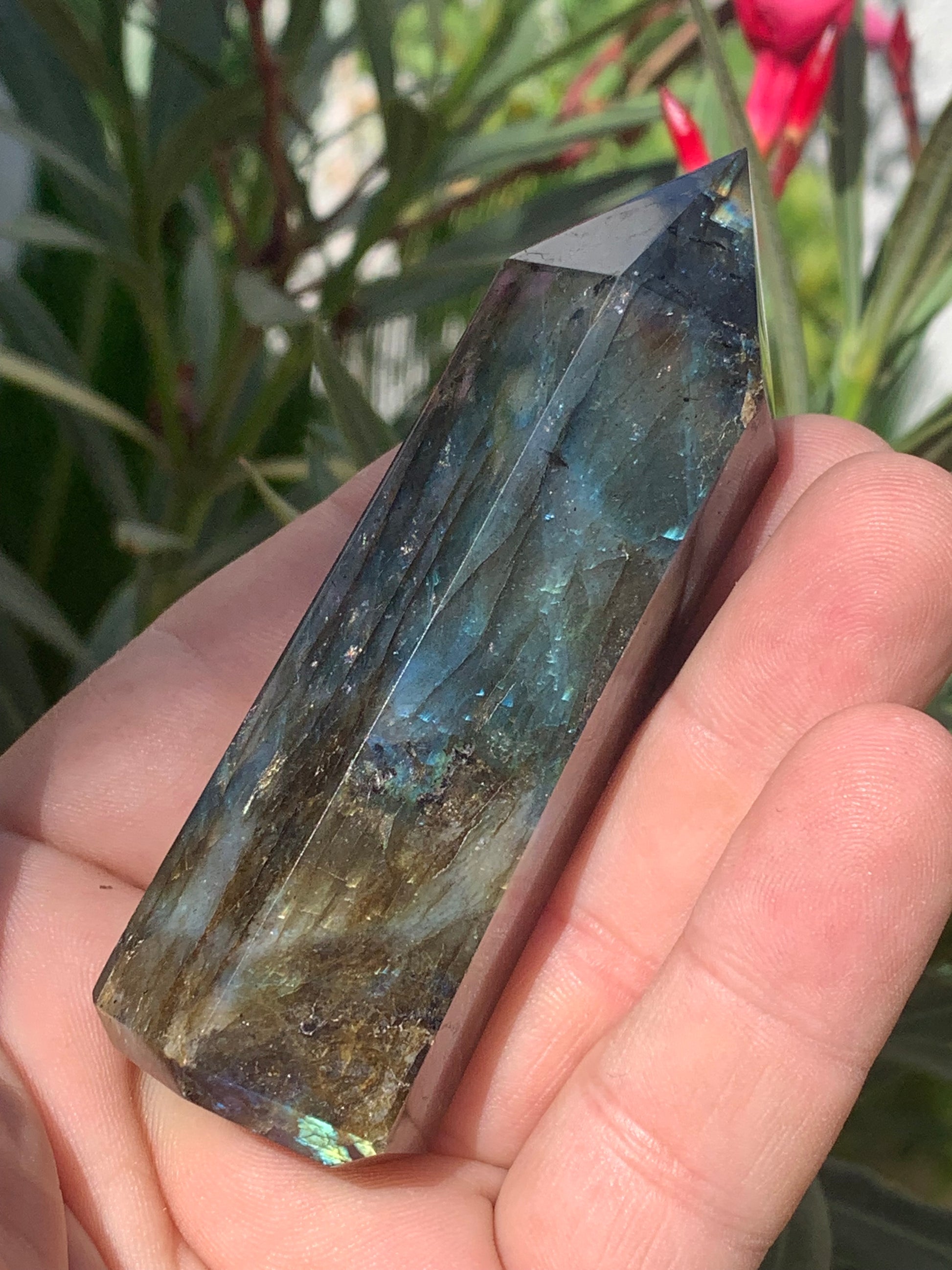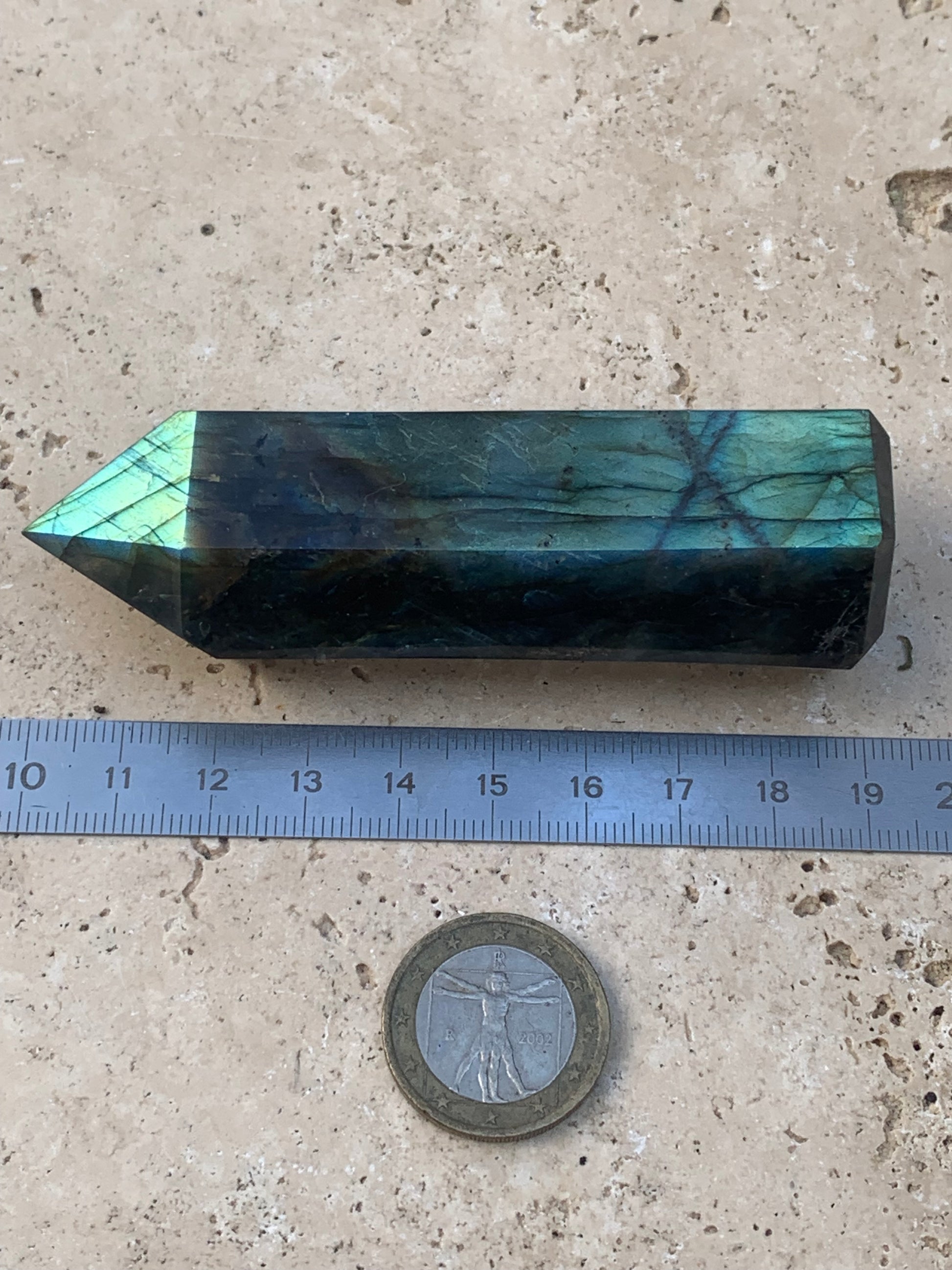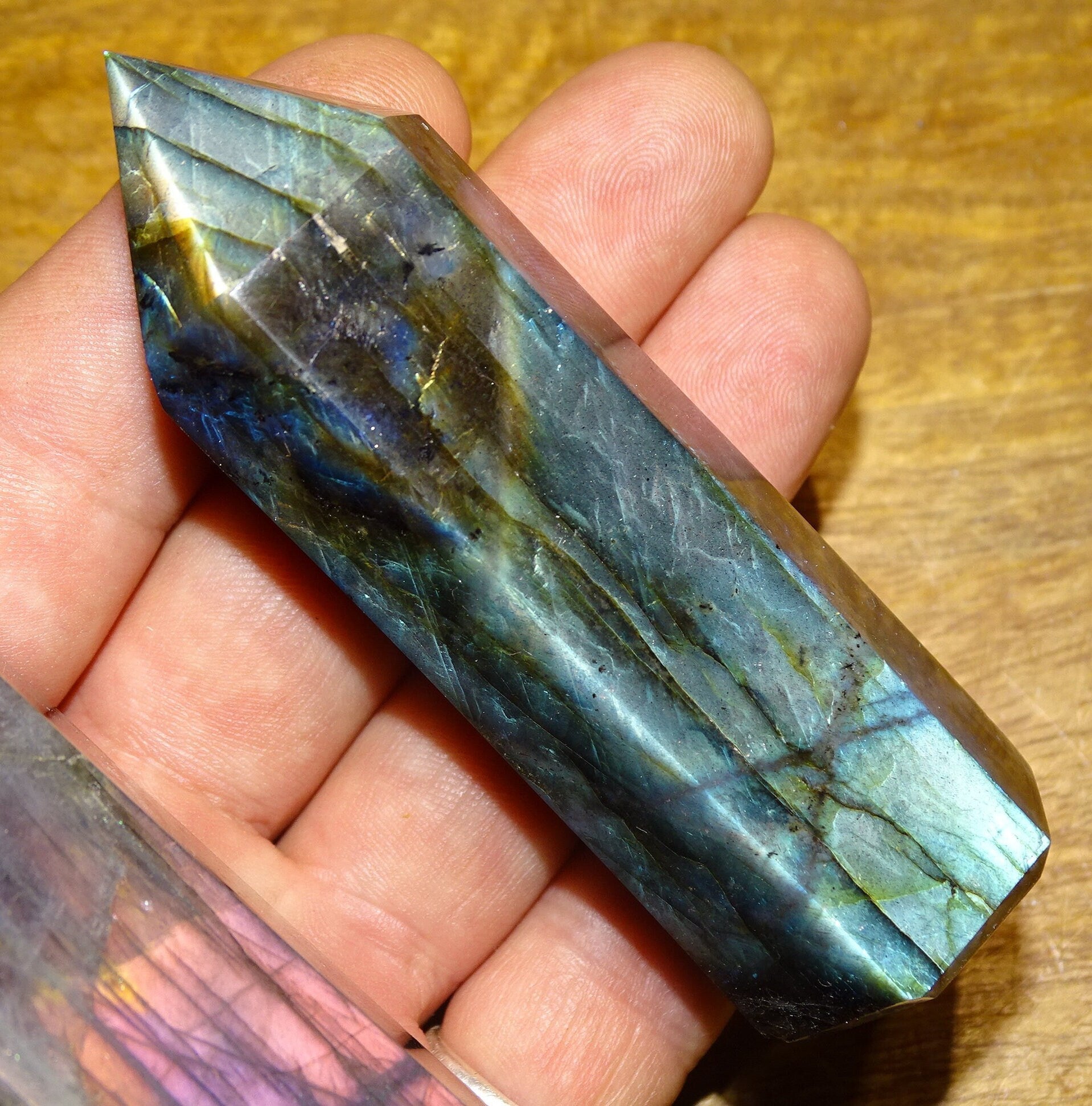 Labradorite, pointe de qualité AAA, 90 millimètres de hauteur x 31 mm de diamètre - 124,3 grammes environ. Très belle qualité, des reflets hologramme incroyable !
