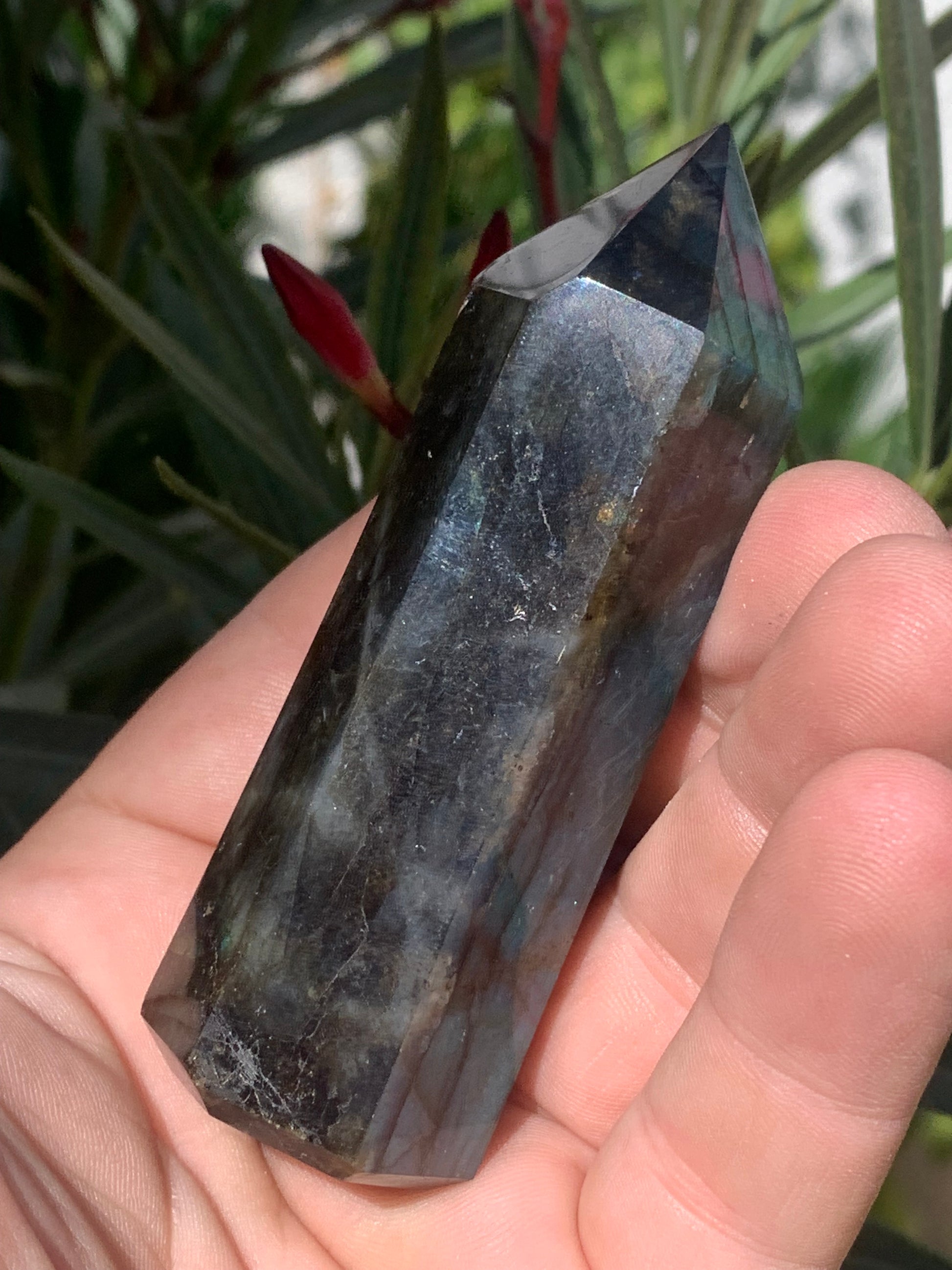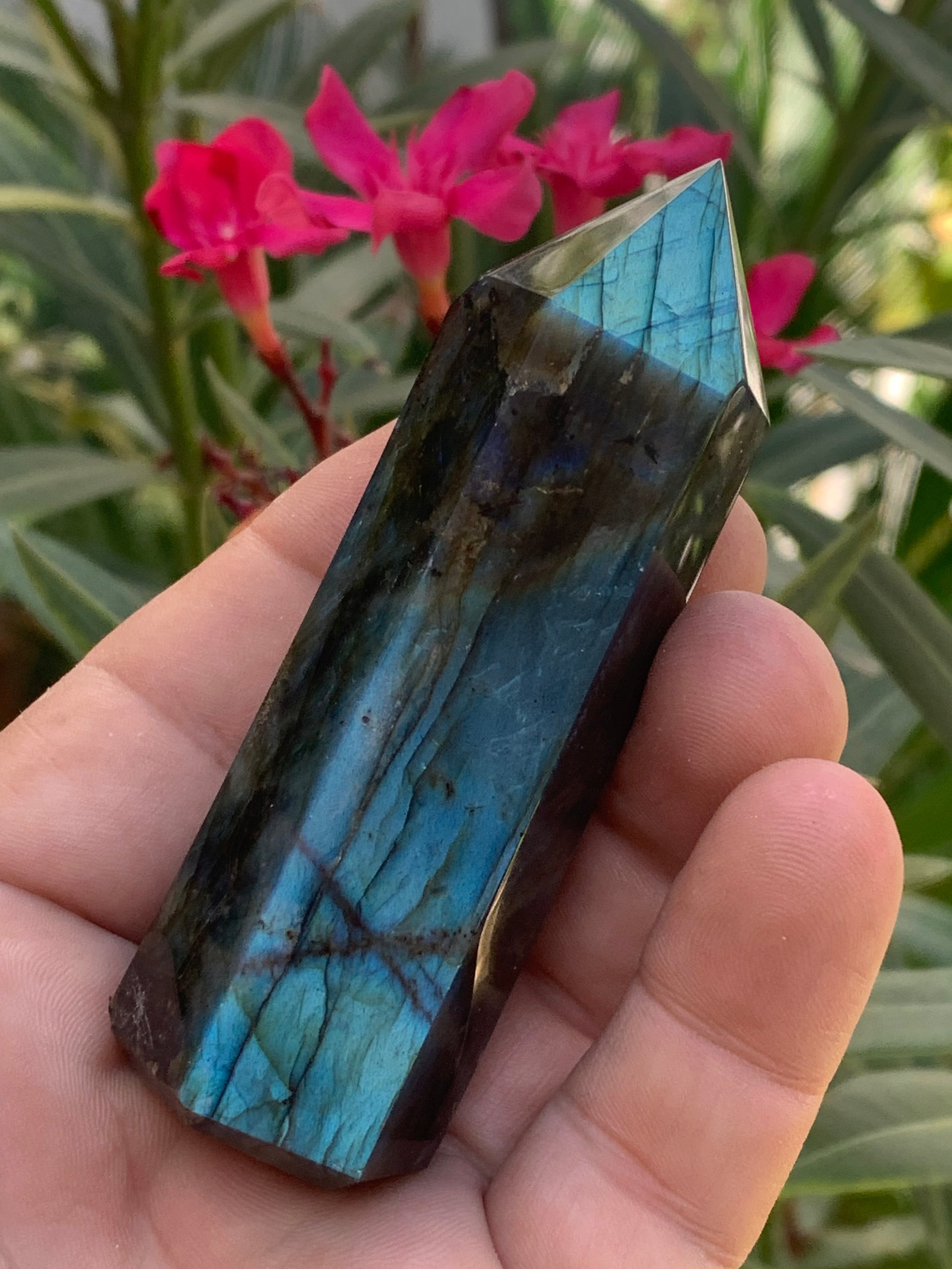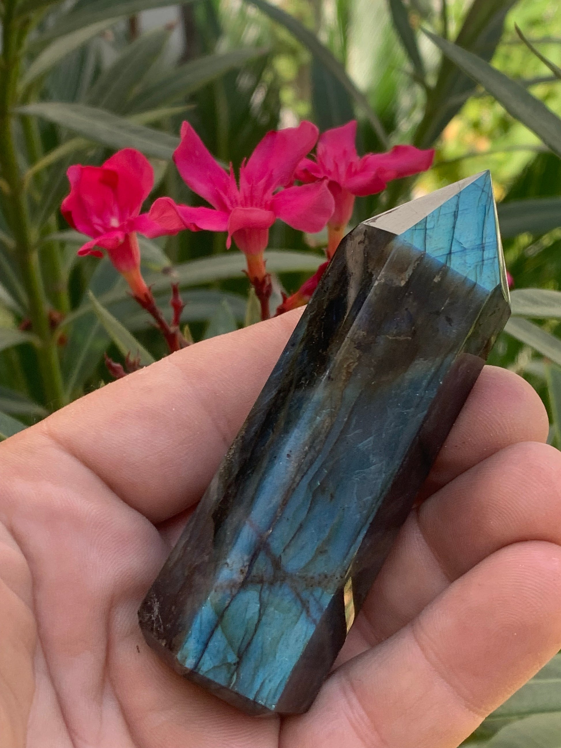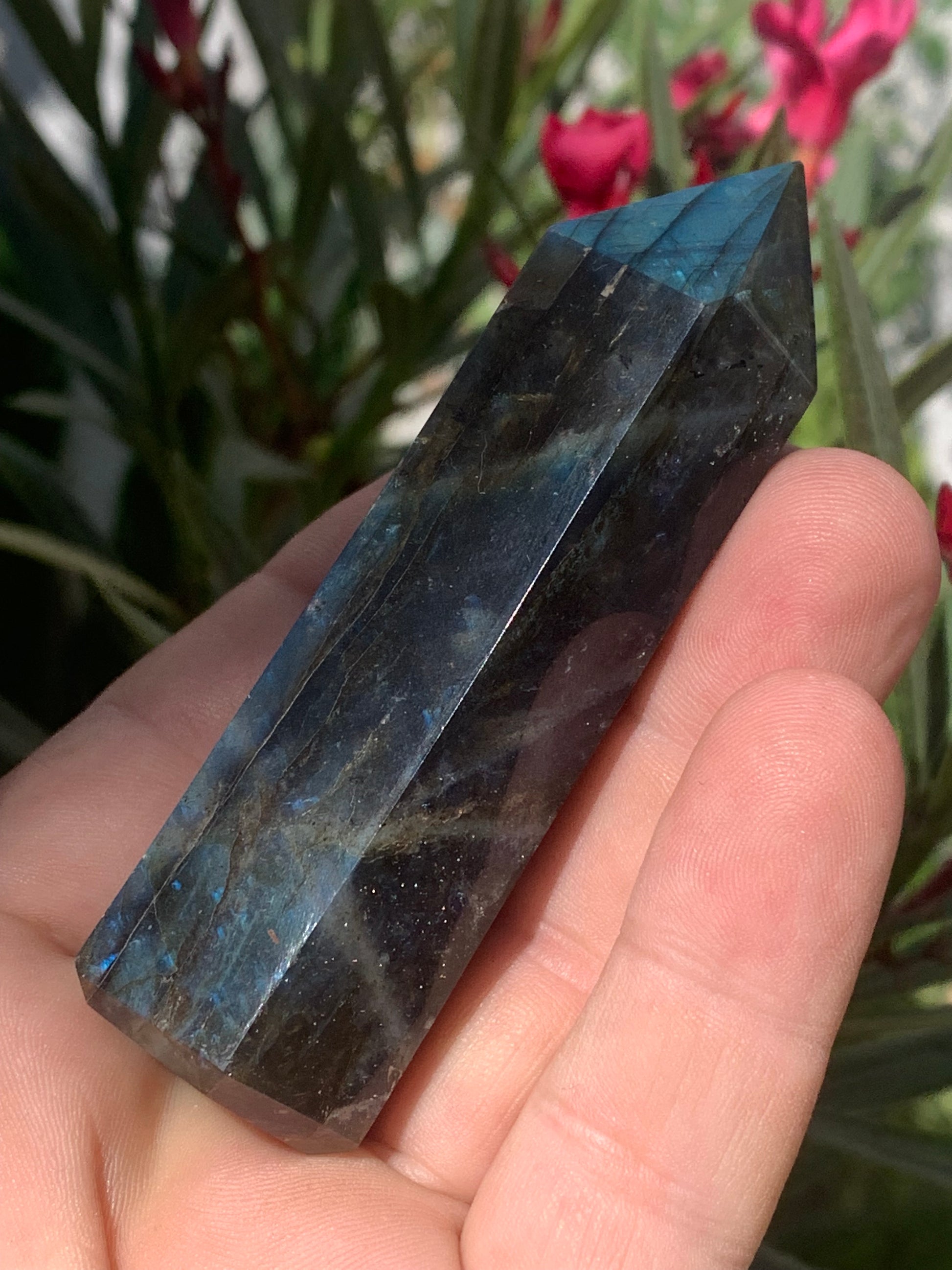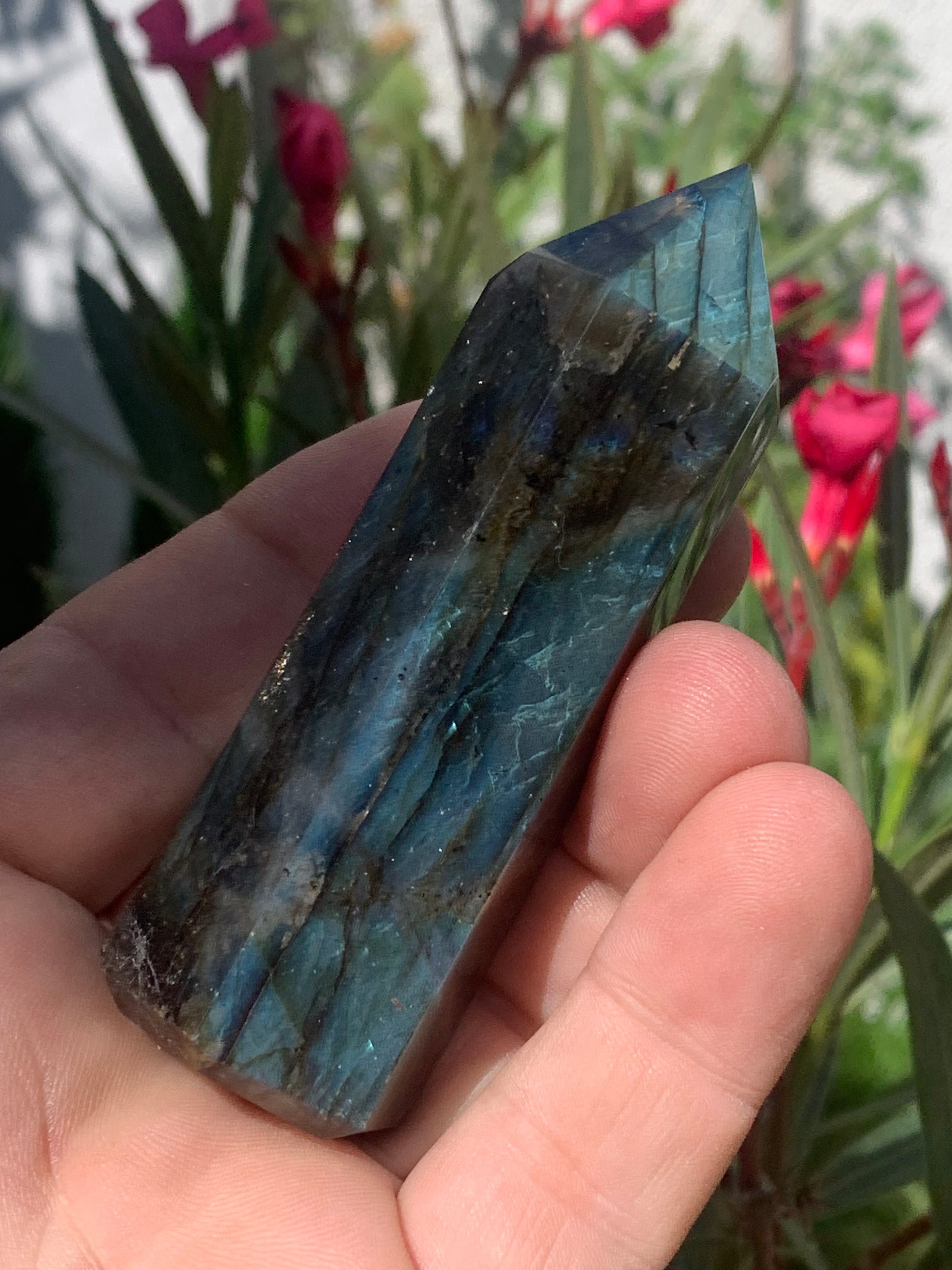 Labradorite, pointe de qualité AAA, 90 millimètres de hauteur x 31 mm de diamètre - 124,3 grammes environ. Très belle qualité, des reflets hologramme incroyable !