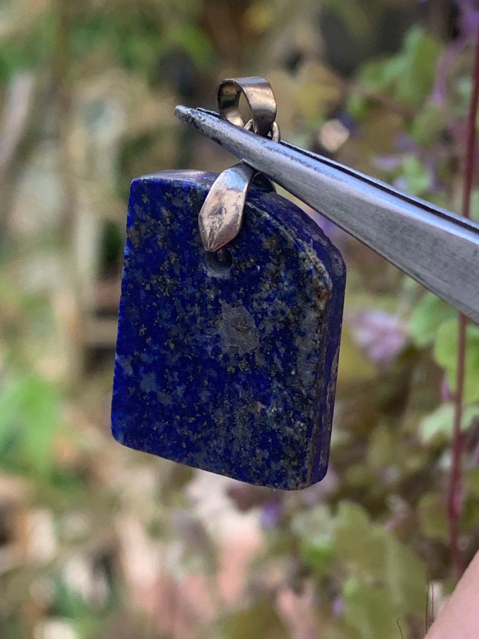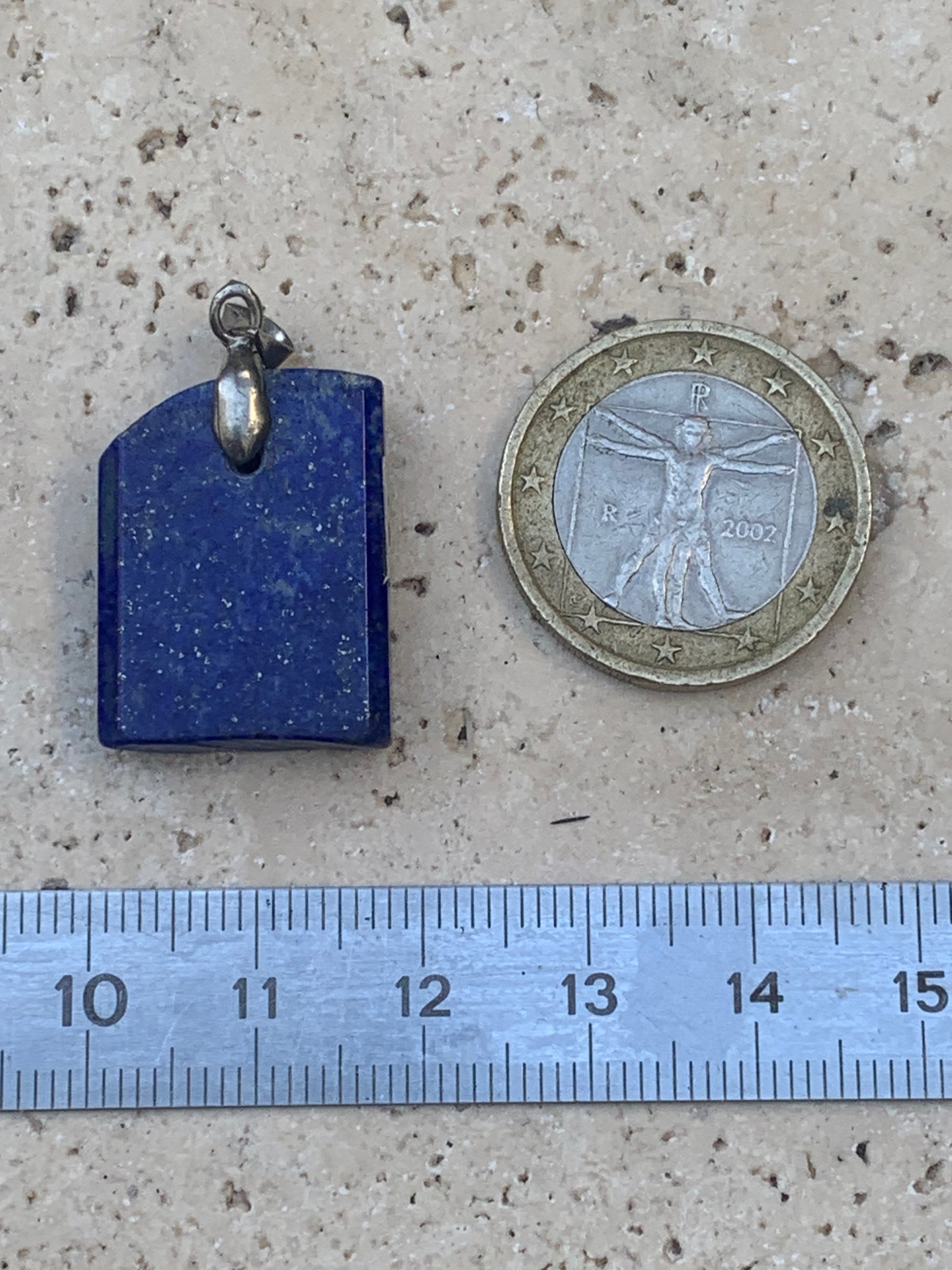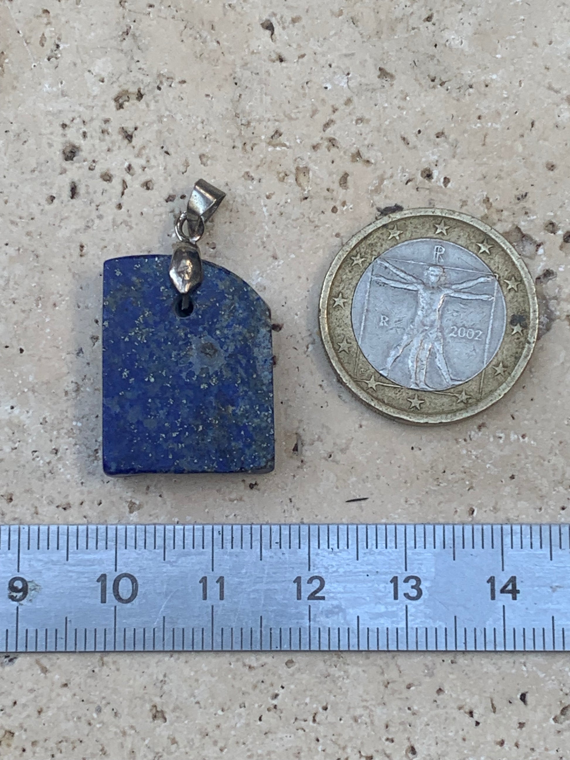 Lapis lazuli, pendentif de 32 millimètres de hauteur x 18 millimètres de largeur x 6 d'épaisseur. Vendu avec un cordon réglable de couleur noire !