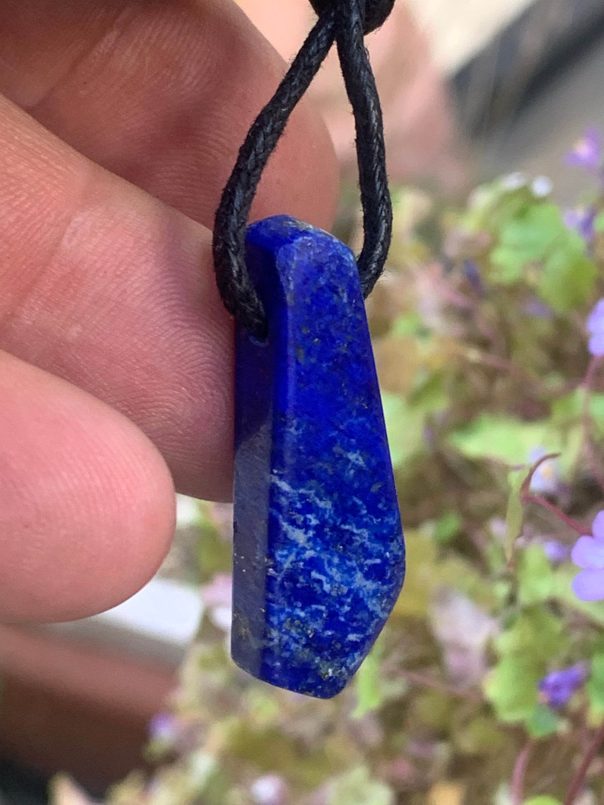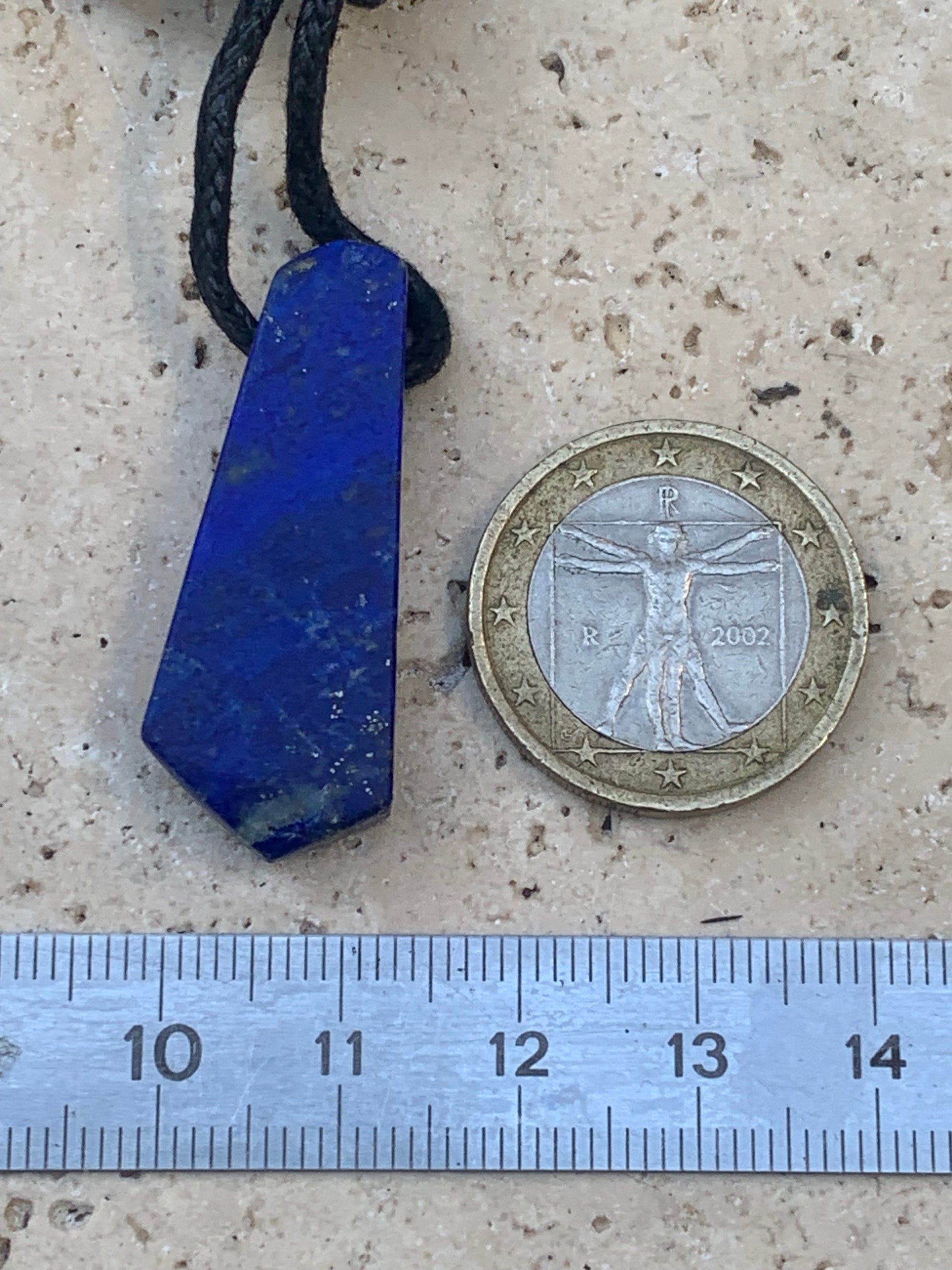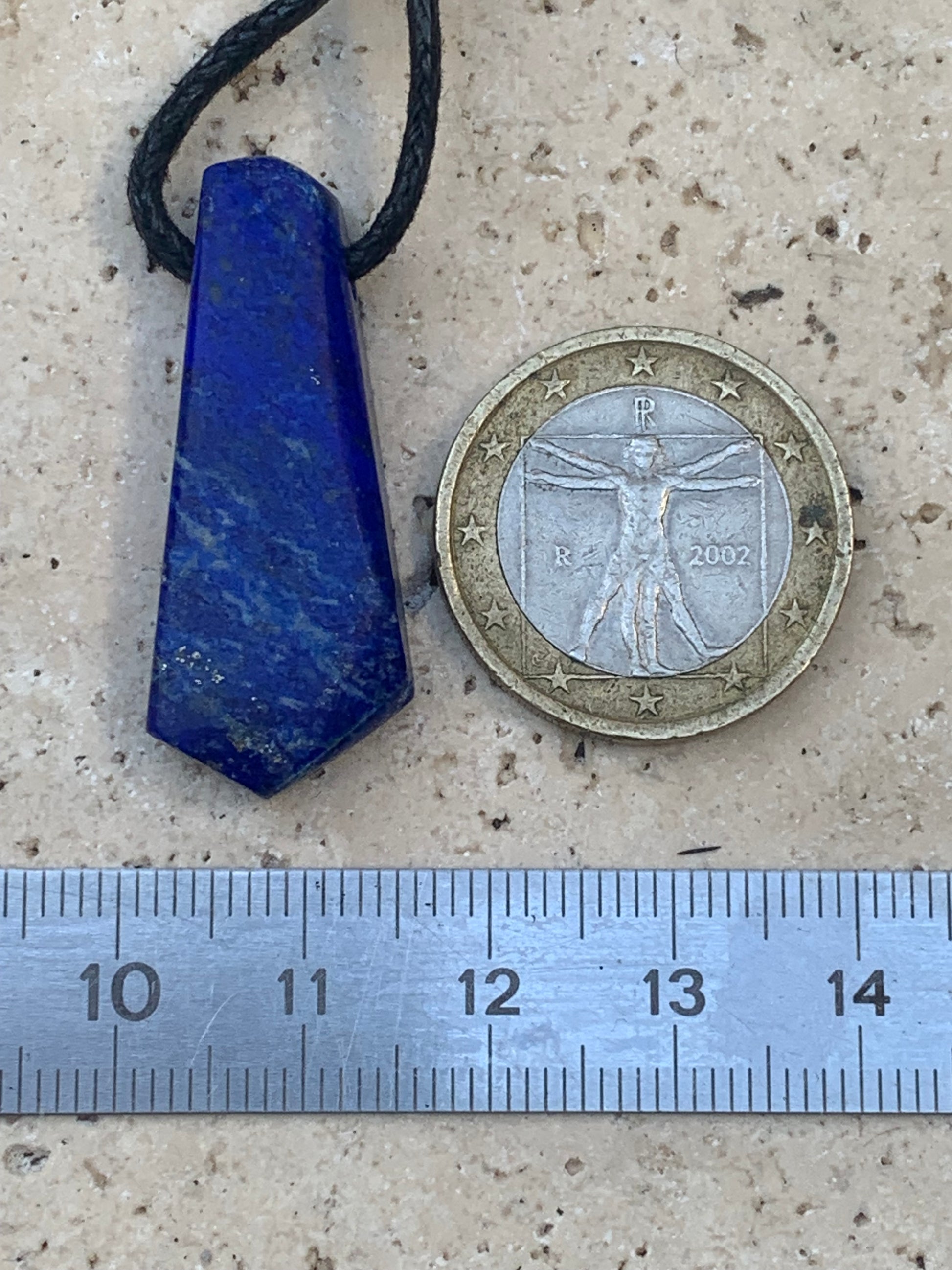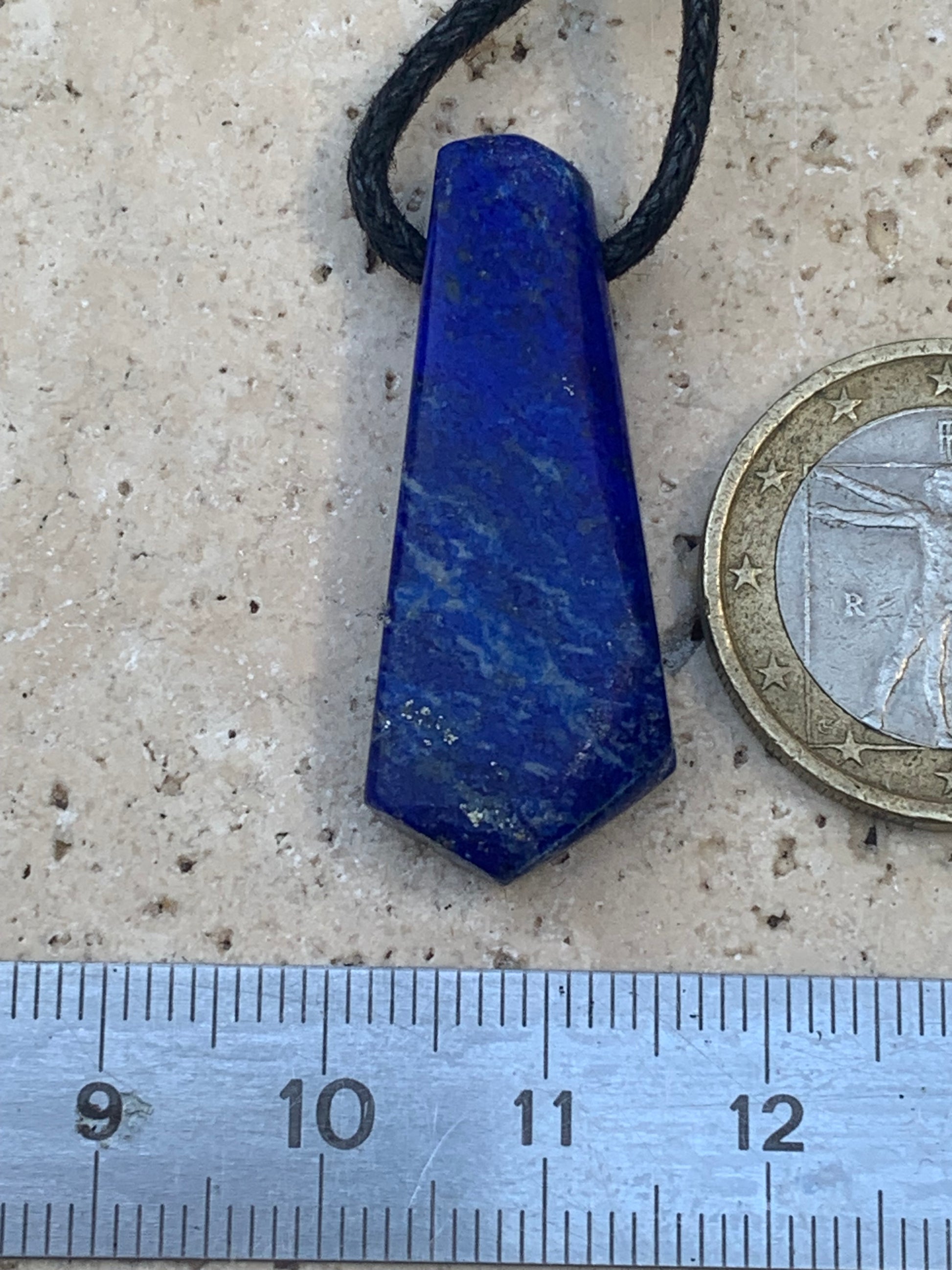 Lapis lazuli, pendentif de 35 millimètres de hauteur x 14 millimètres de largeur x 7 d'épaisseur. Vendu avec un cordon réglable de couleur noire !
