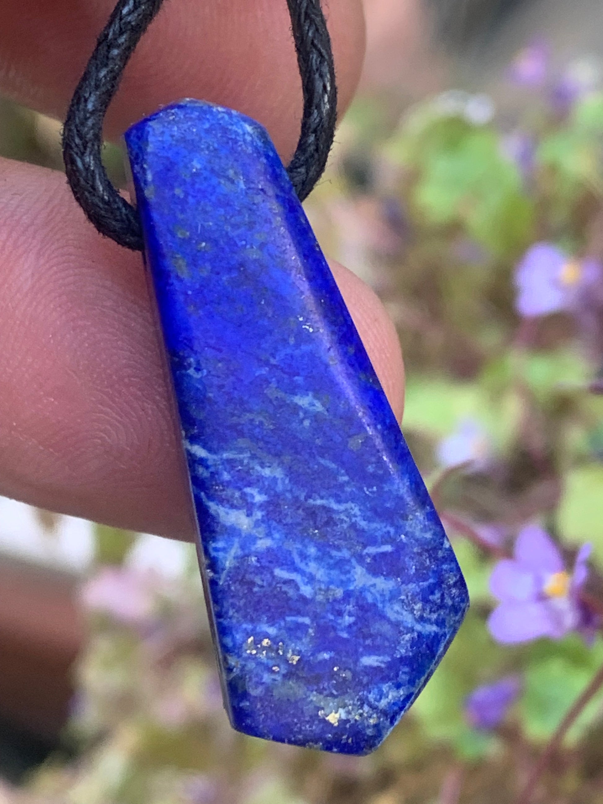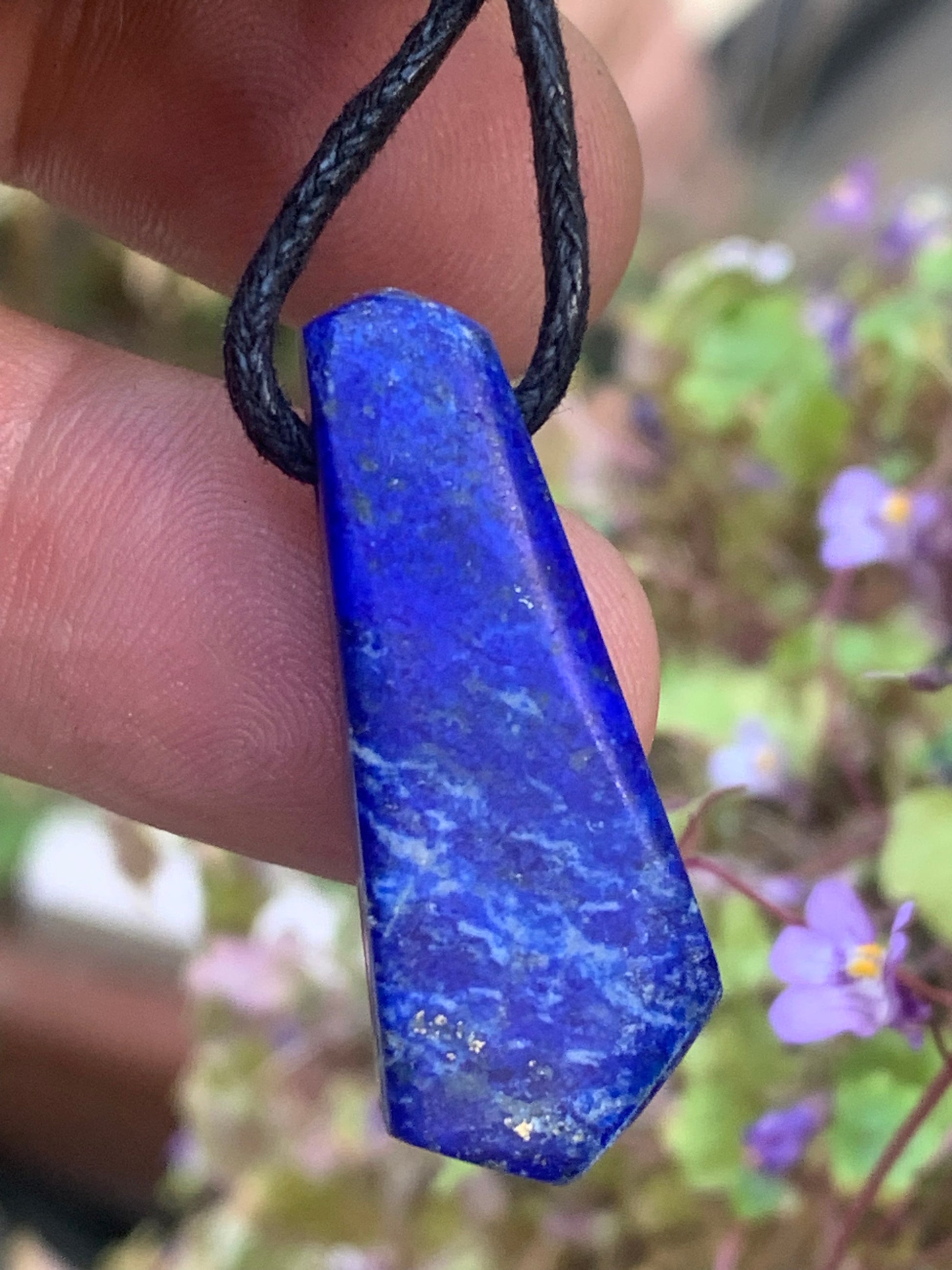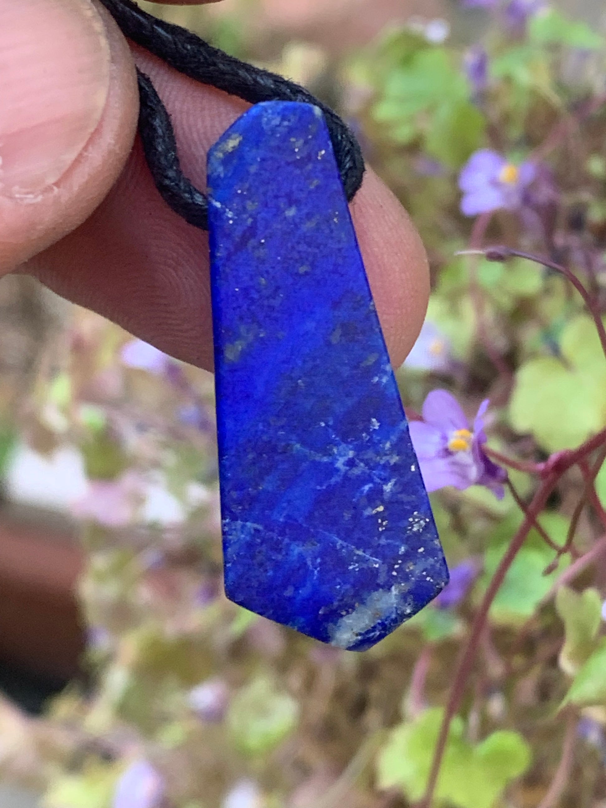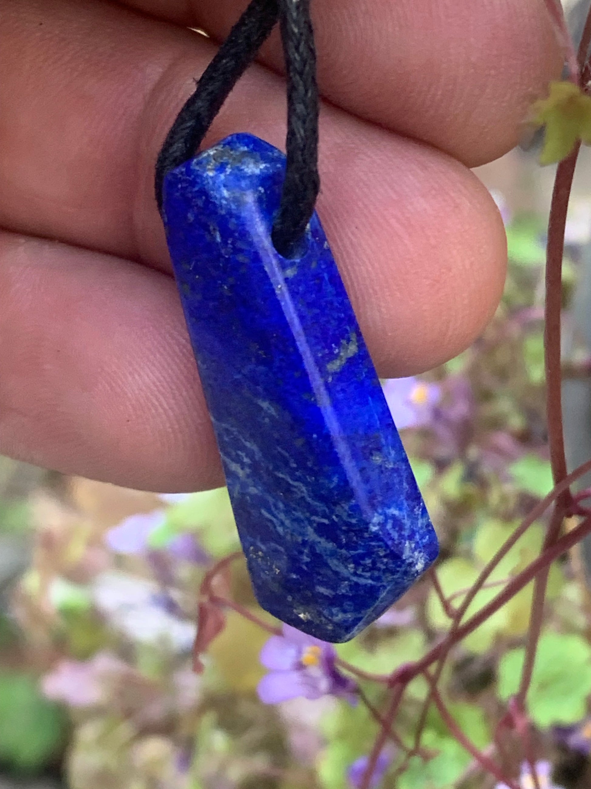 Lapis lazuli, pendentif de 35 millimètres de hauteur x 14 millimètres de largeur x 7 d'épaisseur. Vendu avec un cordon réglable de couleur noire !