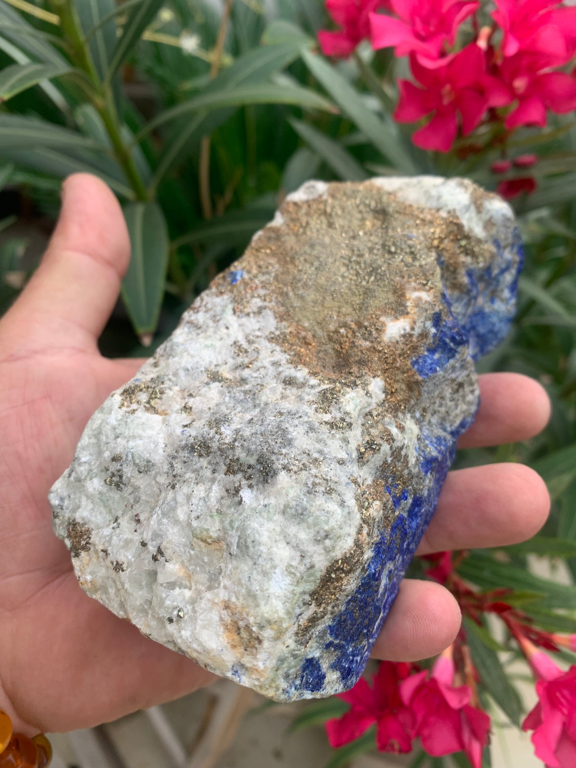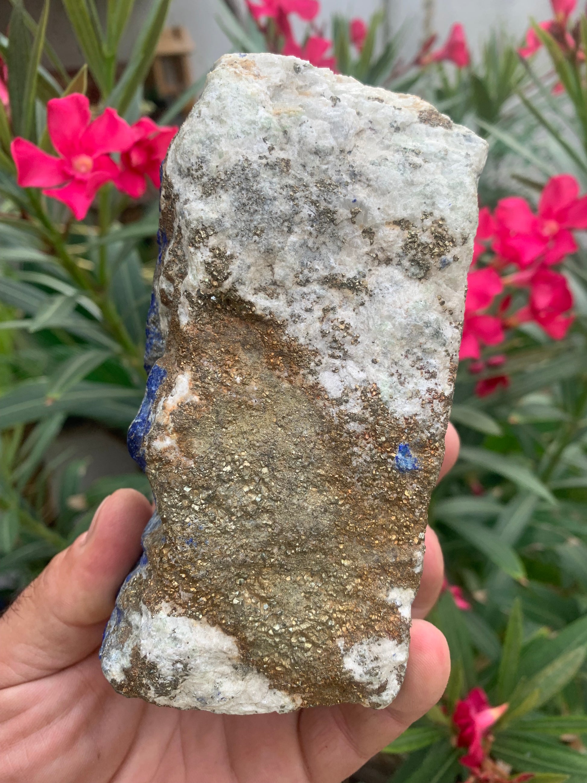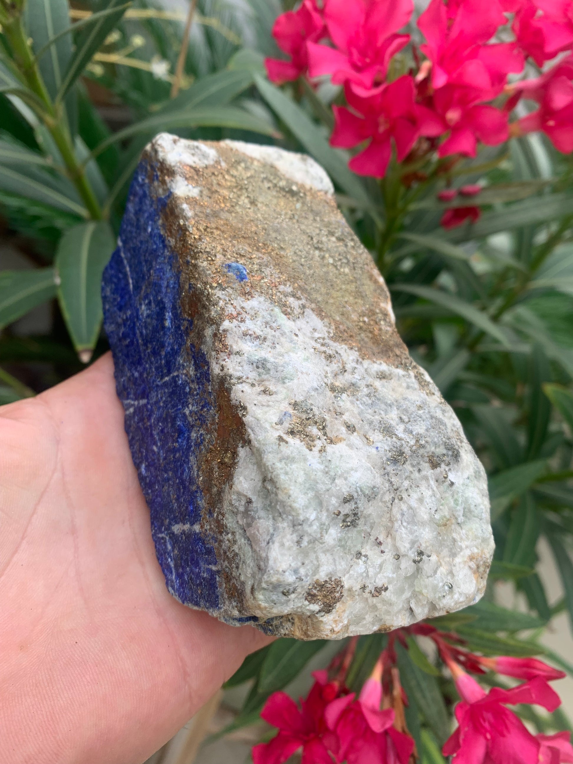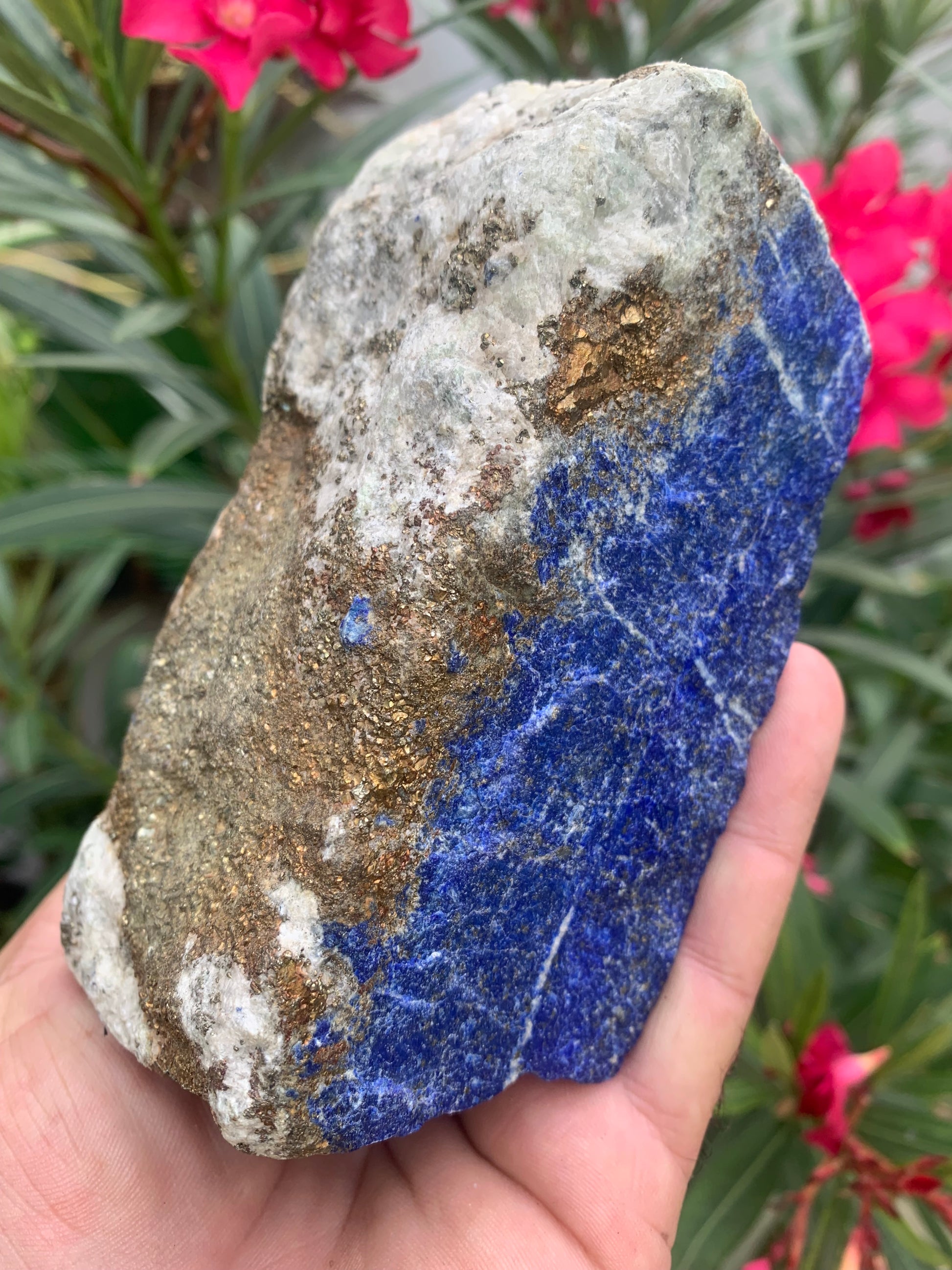 Particularité | Bleu intense caractéristique, inclusions dorées de pyrite très prisées |