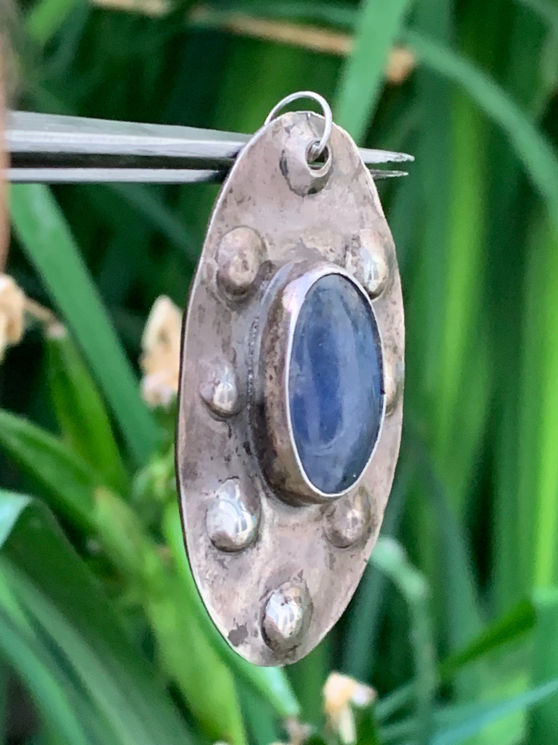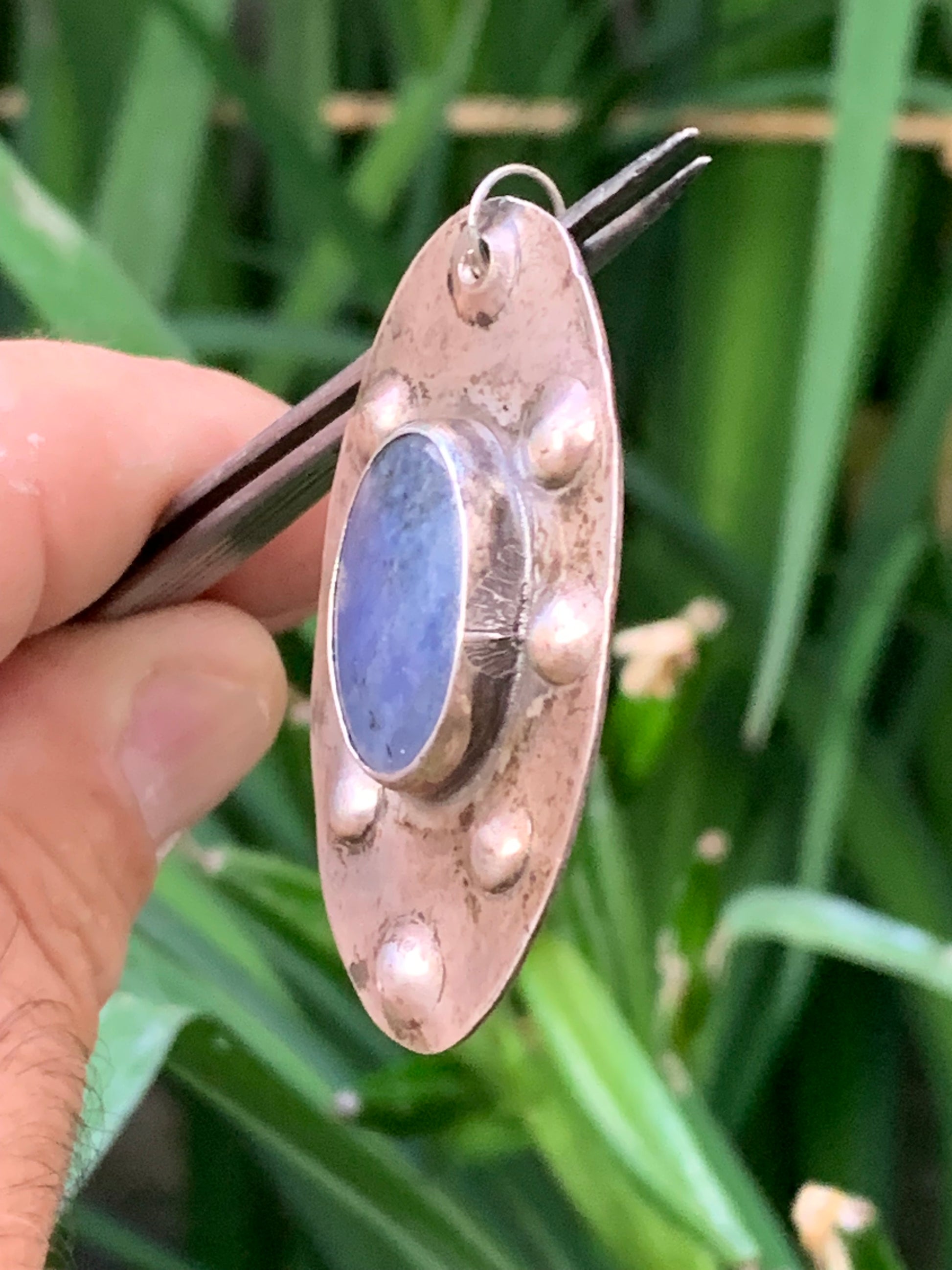 Lapis lazuli, superbe pendentif en laiton argenté, de 52 millimètres de hauteur x 30 millimètres de largeur x 6 d'épaisseur. Vendu avec un cordon réglable de couleur noire !