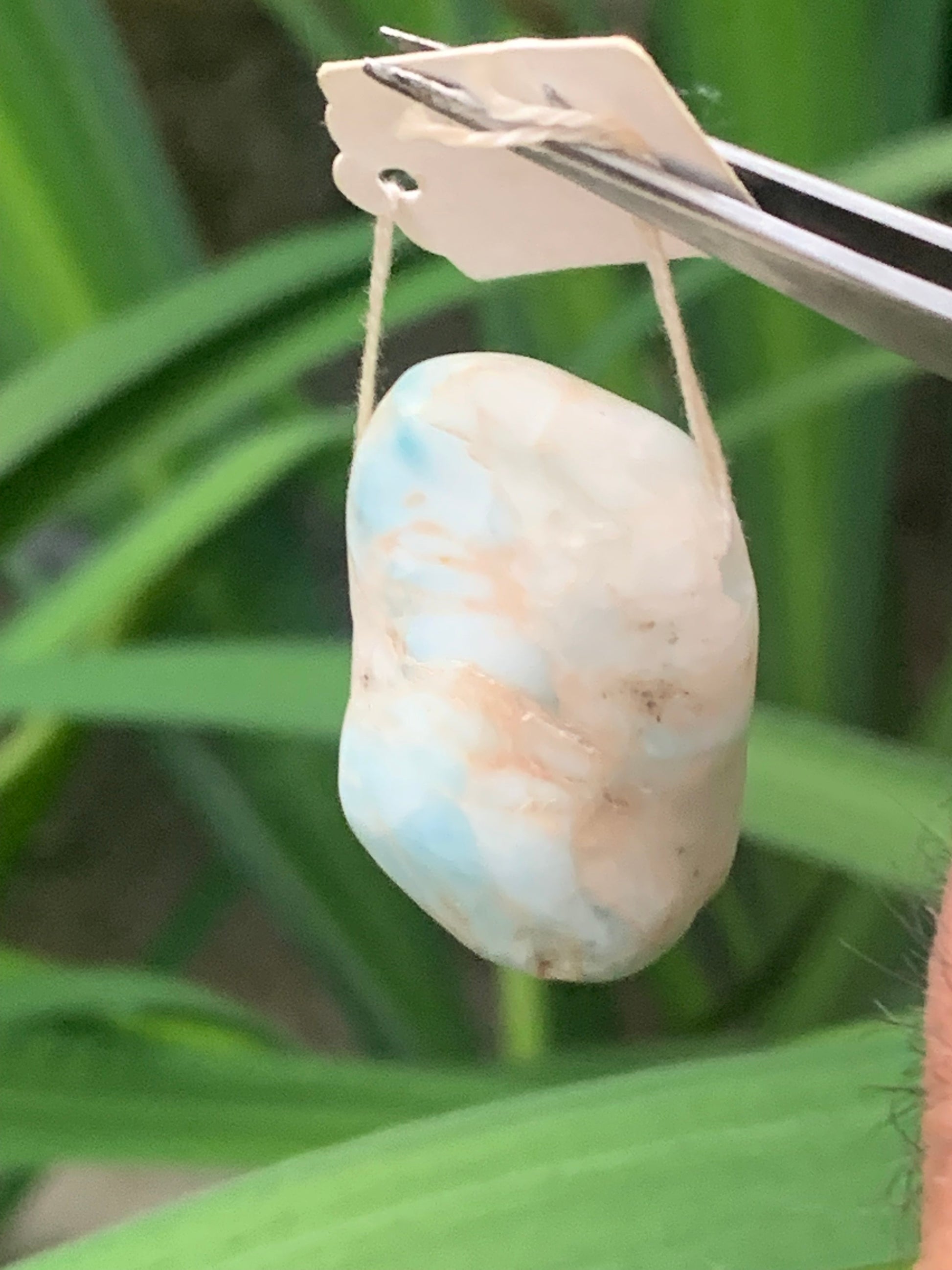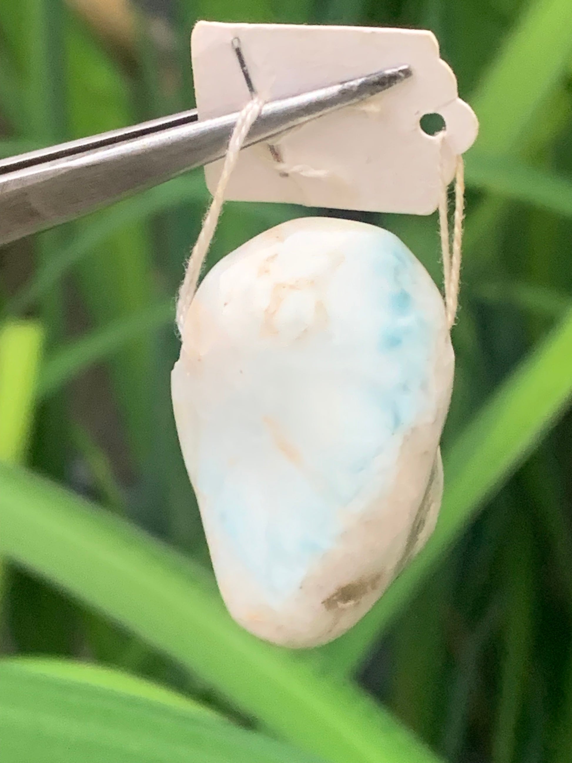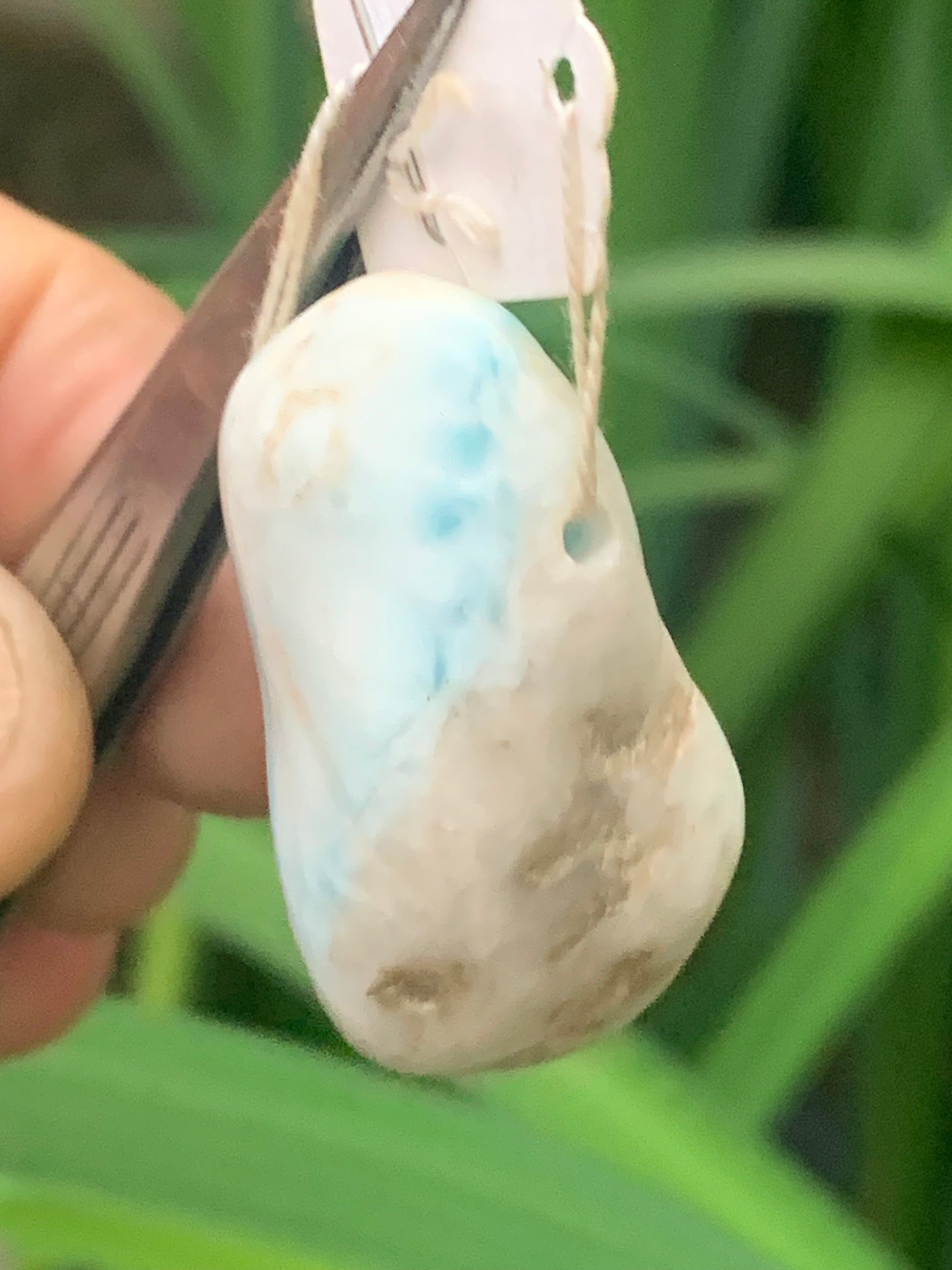 Larimar, pendentif en pierre naturelle à percement latéral. De 36 mm de hauteur x 22 de largeur x 17 d'épaisseur. Vendu avec cordon noir réglable !