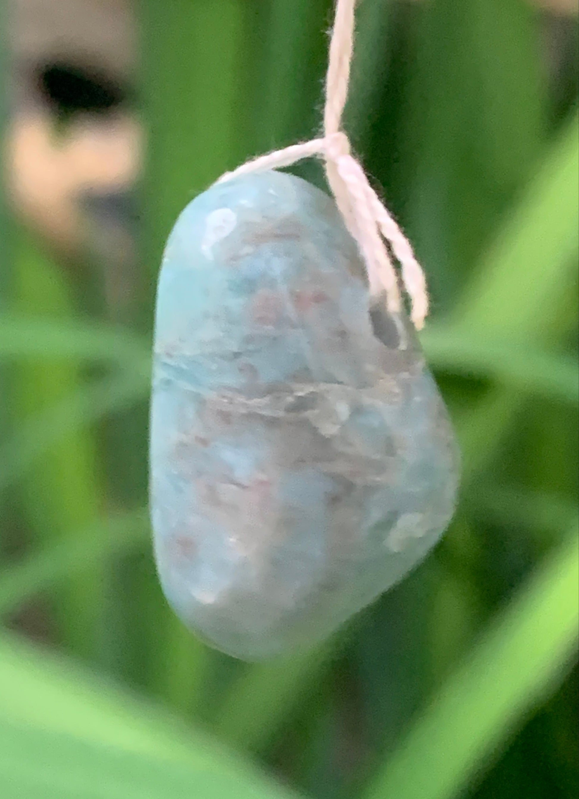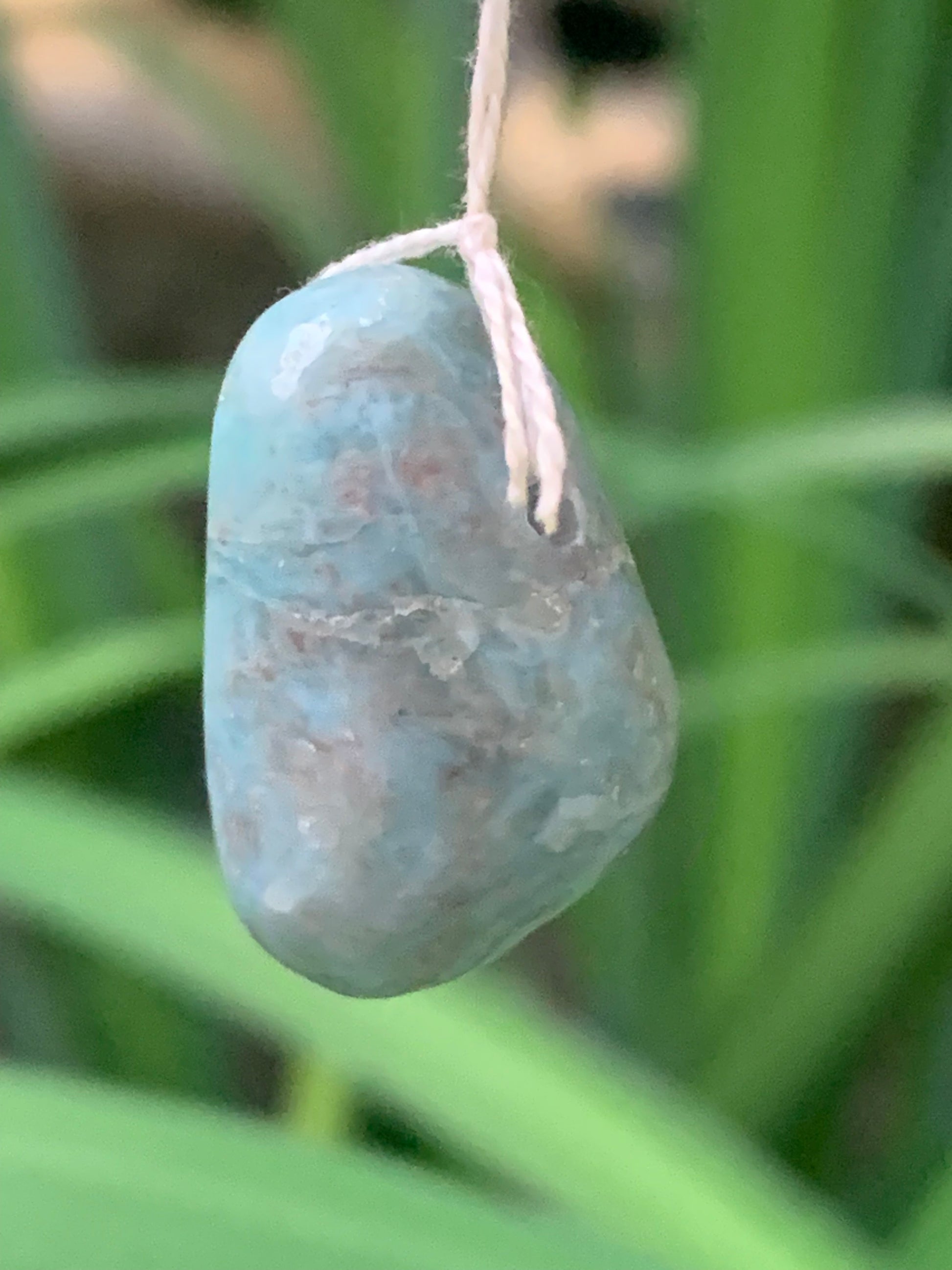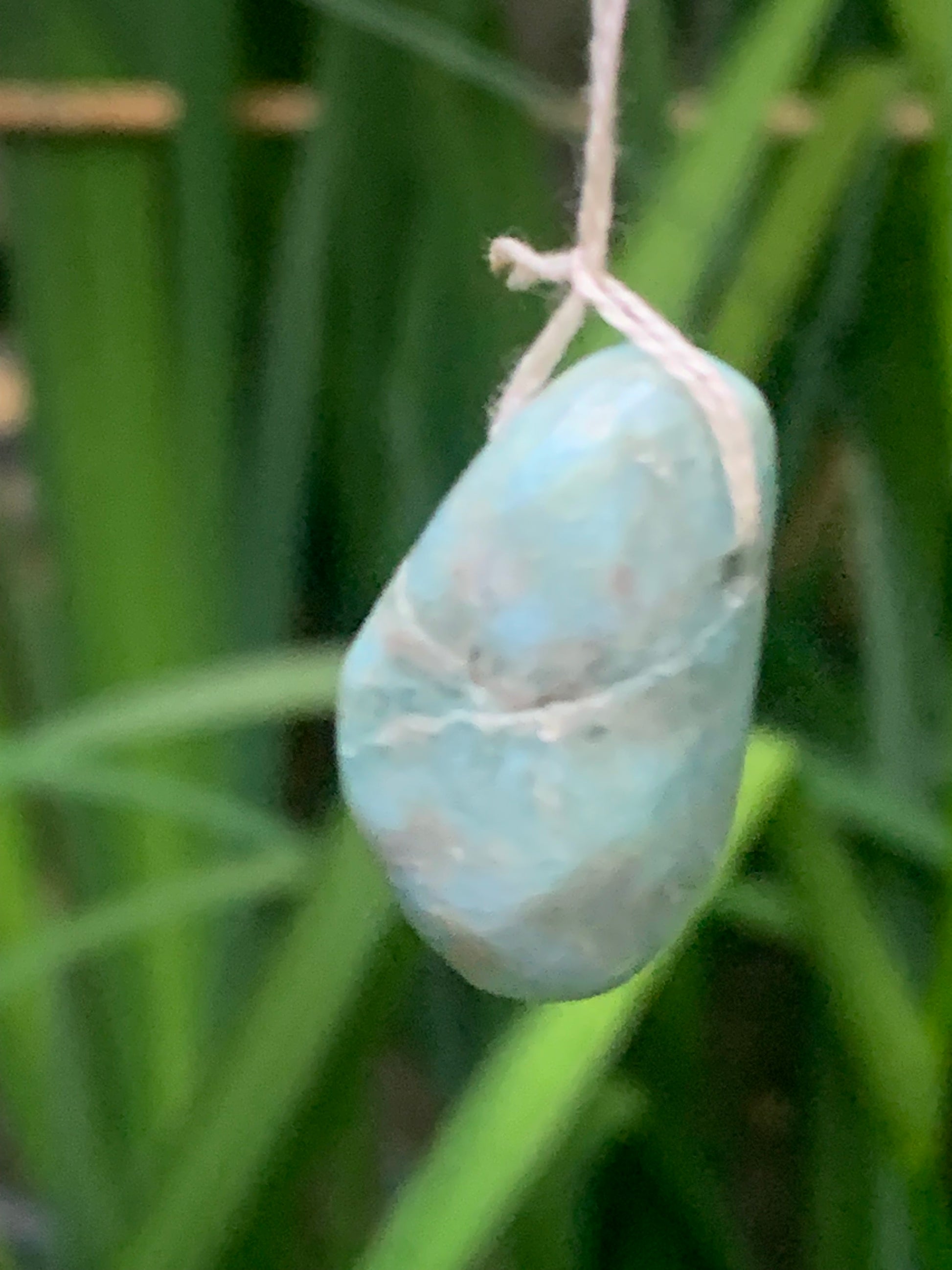 Larimar, pendentif en pierre naturelle à percement latéral. De 26 mm de hauteur x 16 de largeur x 14 d'épaisseur. Vendu avec cordon noir réglable !