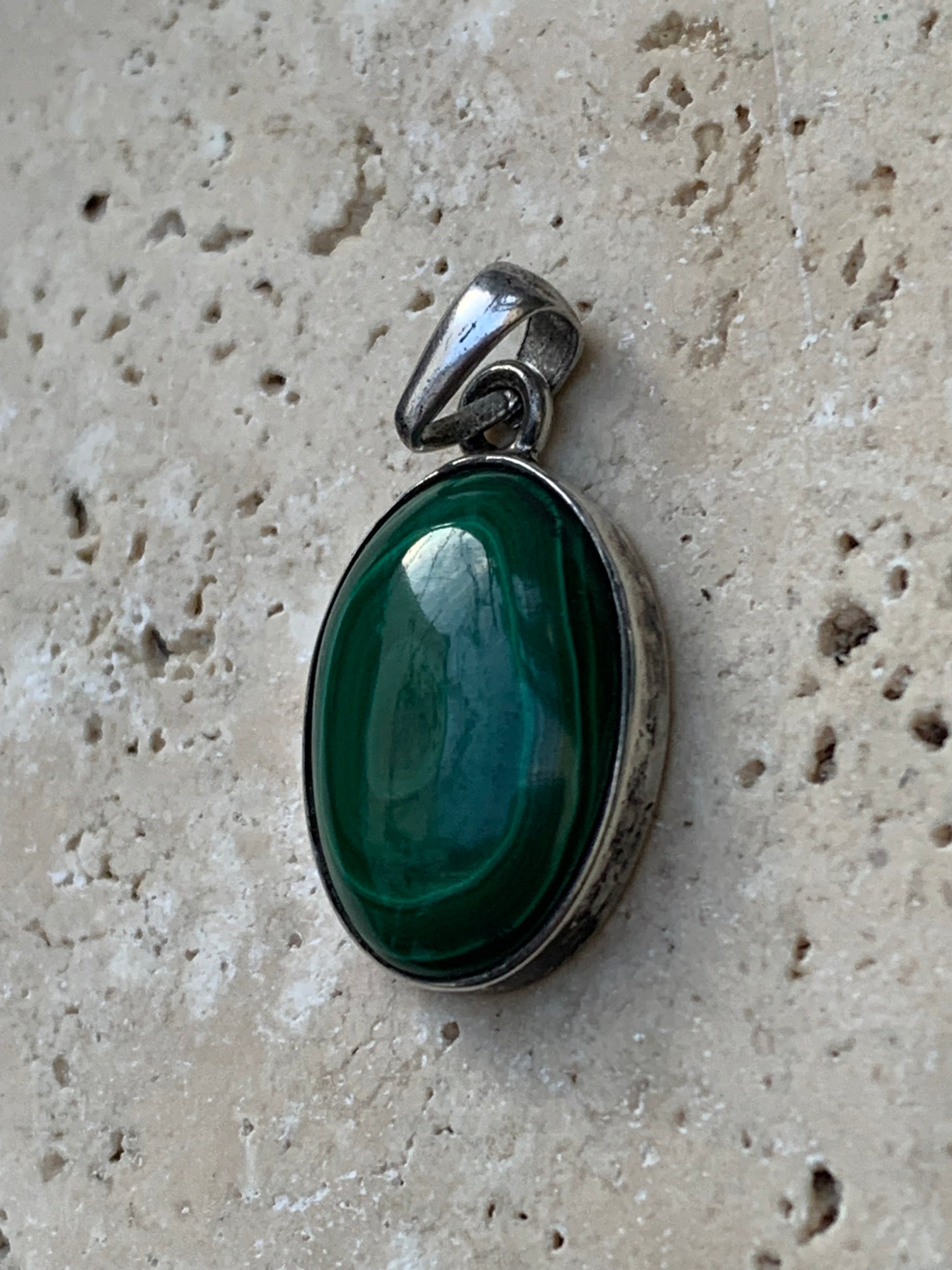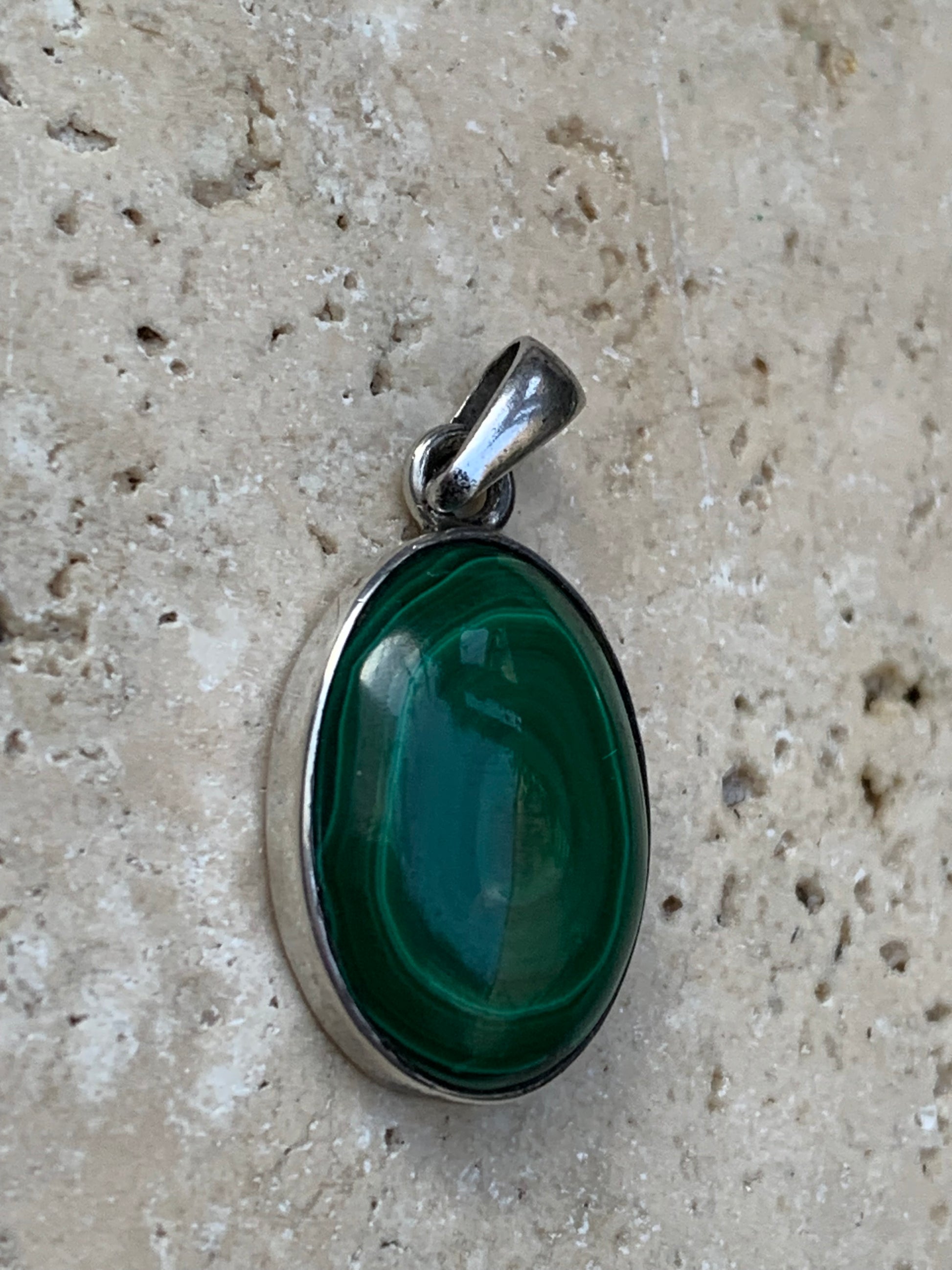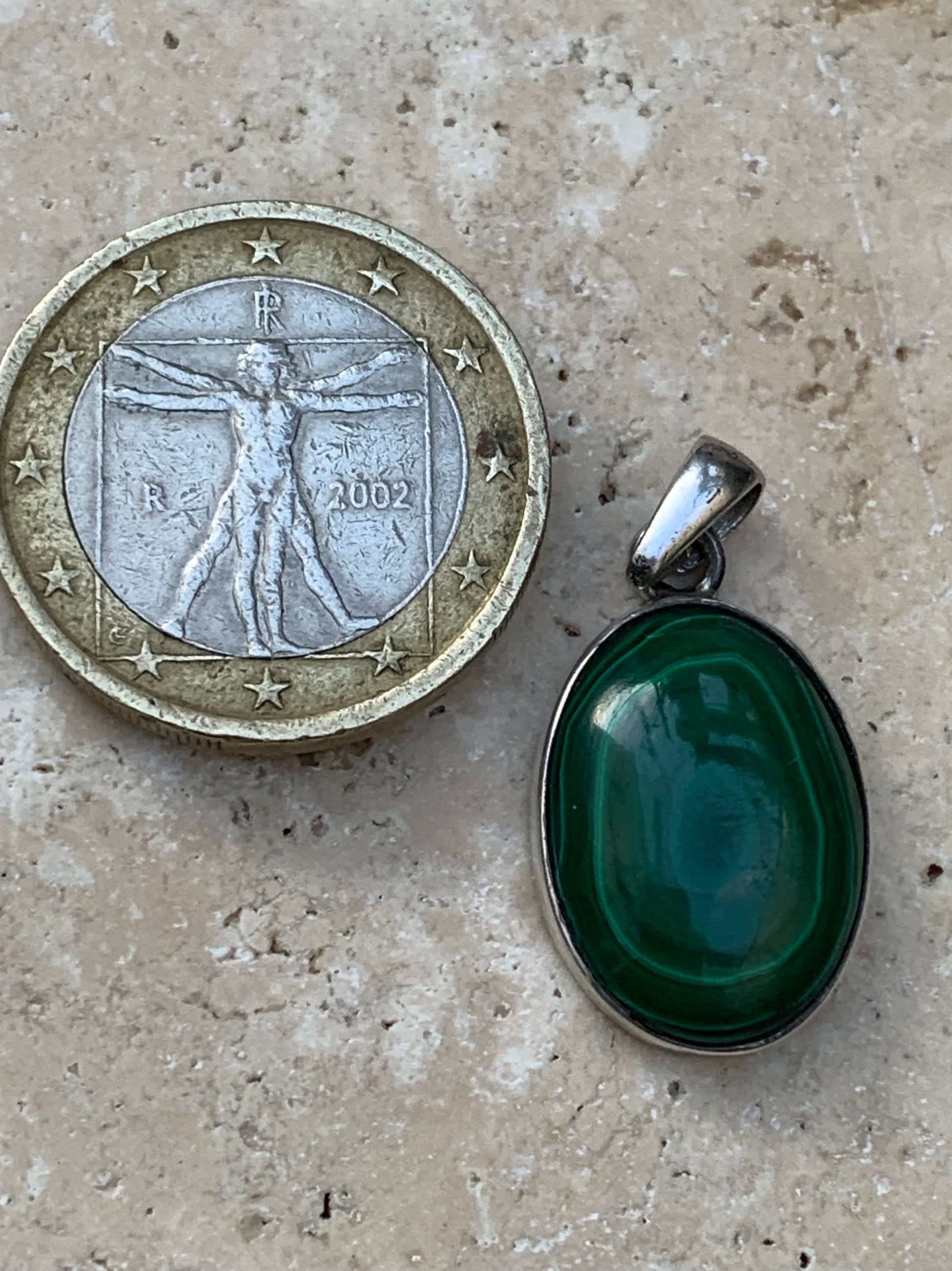 Malachite, superbe pendentif sertis Argent de 27mm de hauteur x 15 de largeur x 6 d'épaisseur. Vendu avec cordon réglable de couleur noire.
