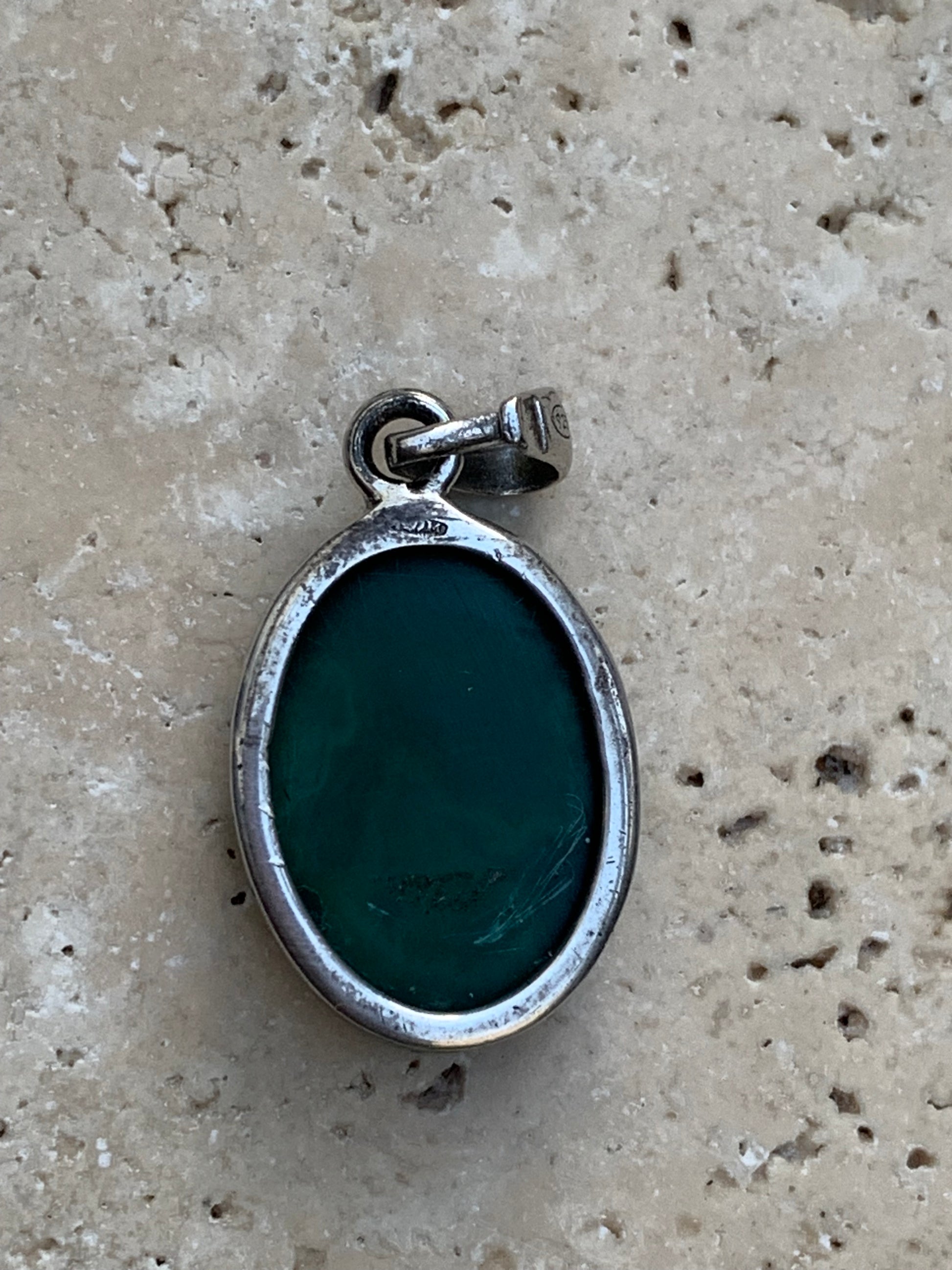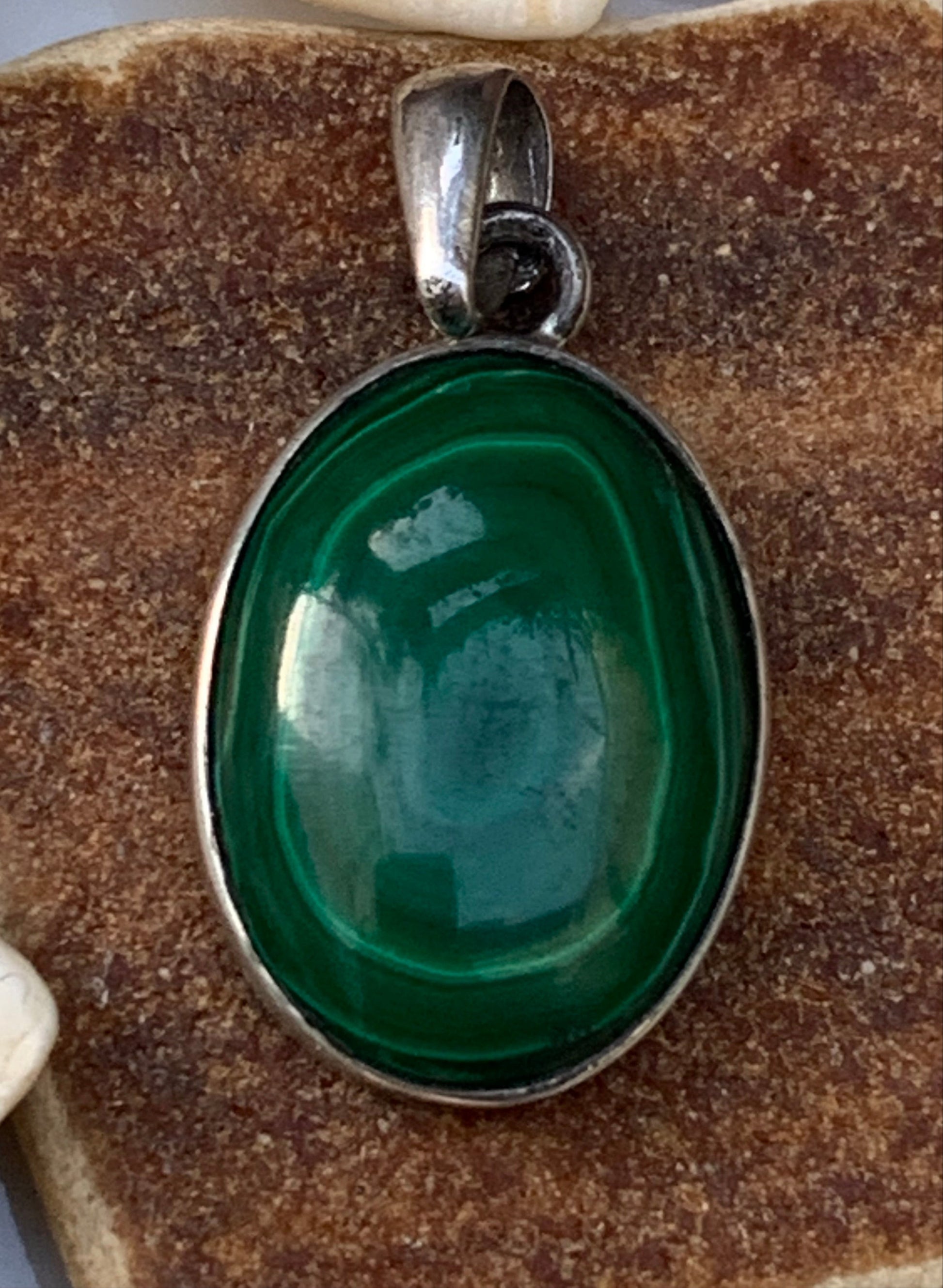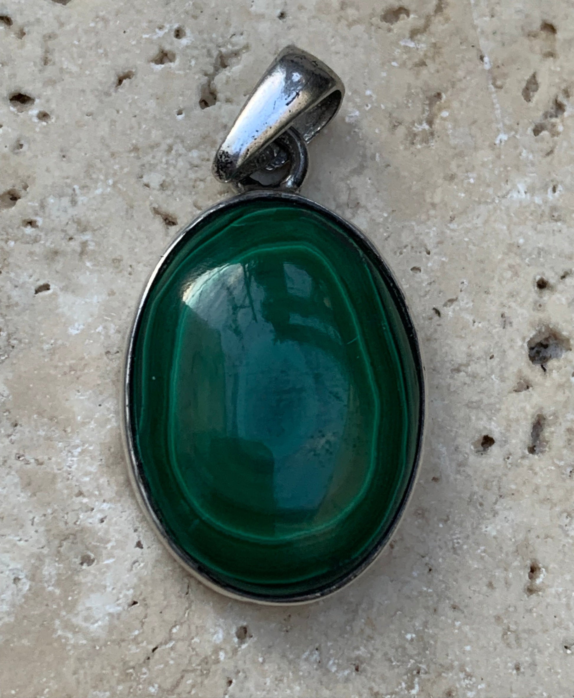 Malachite, superbe pendentif sertis Argent de 27mm de hauteur x 15 de largeur x 6 d'épaisseur. Vendu avec cordon réglable de couleur noire.