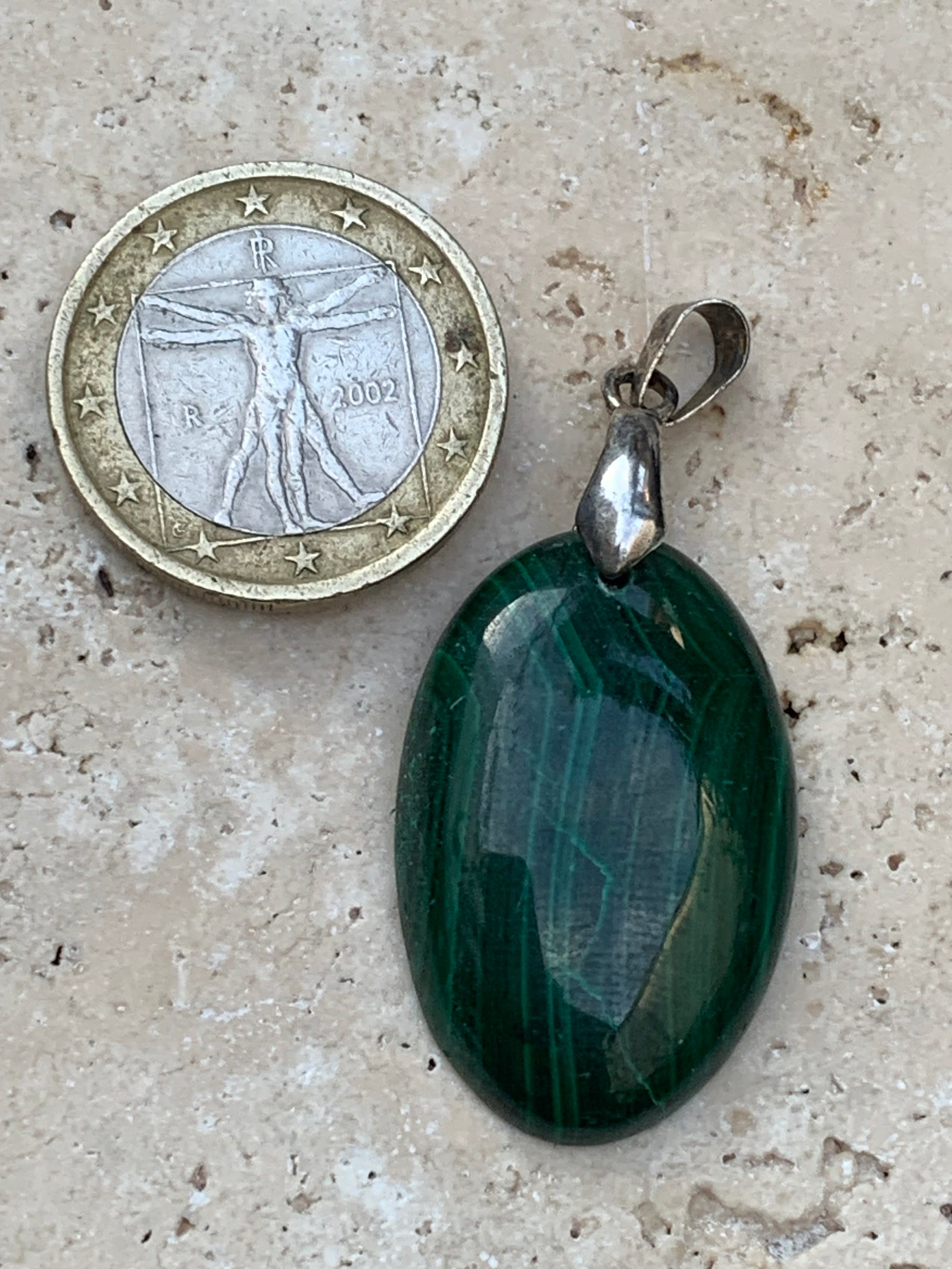 Malachite, superbe pendentif de 44mm de hauteur x 20 de largeur x 6 d'épaisseur. Vendu avec cordon réglable de couleur noire.