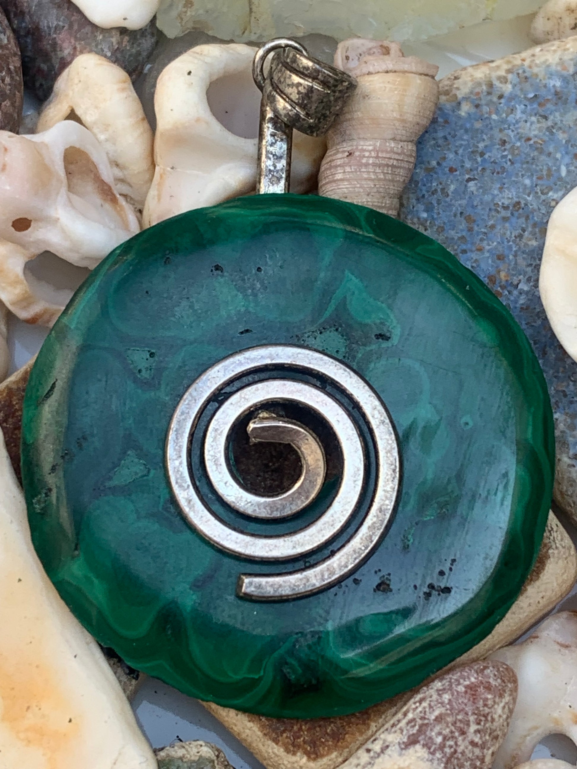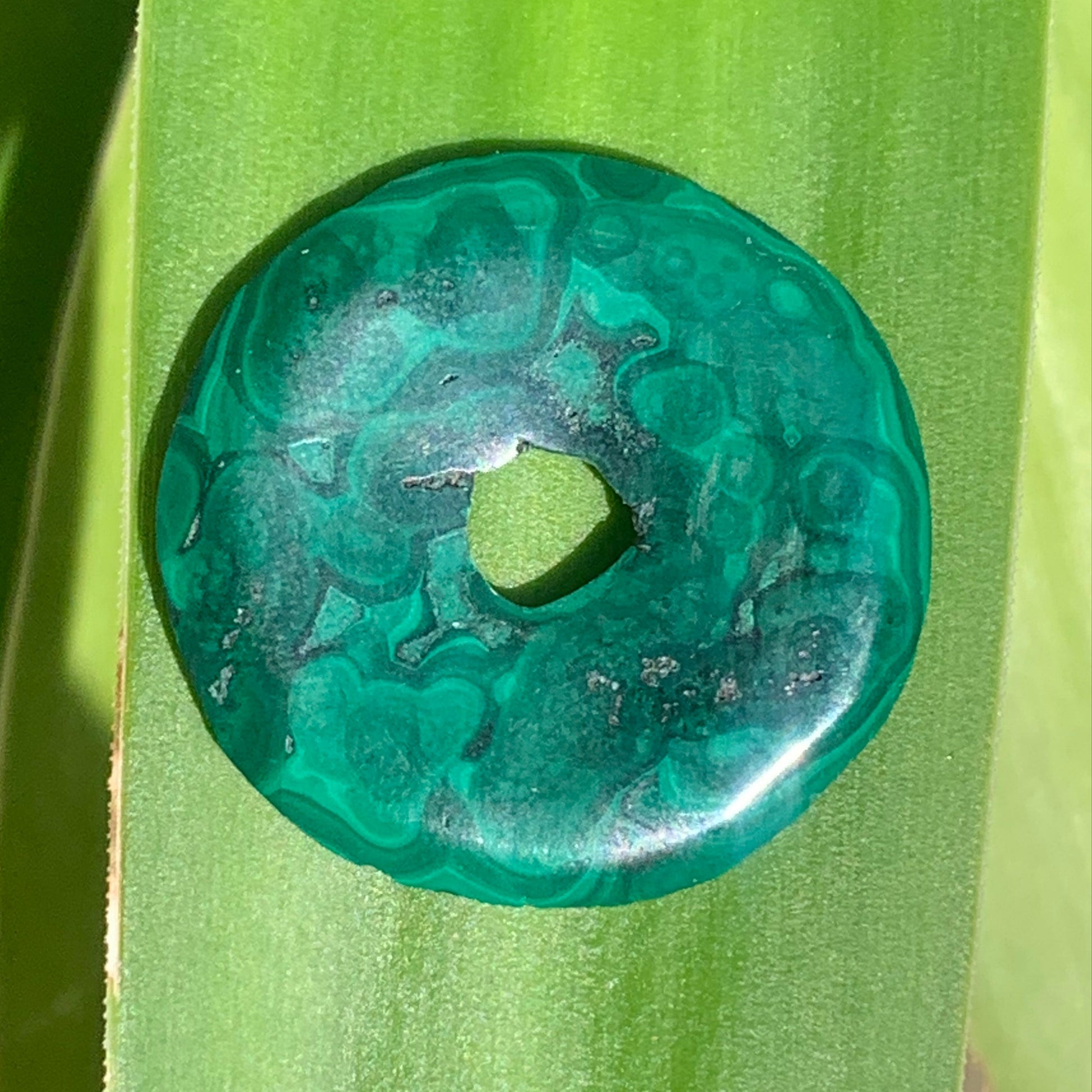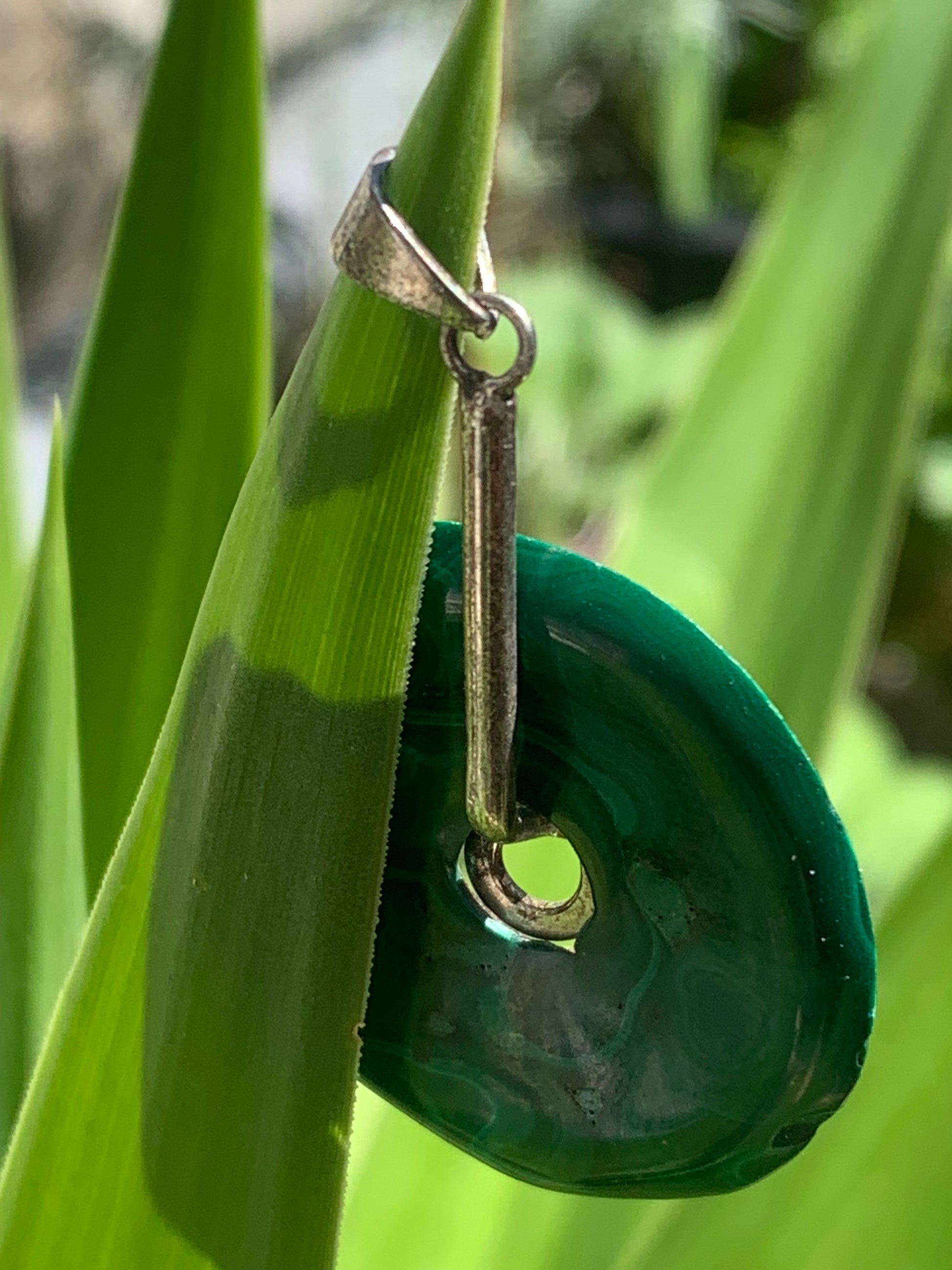 Malachite, superbe pendentif 'Donuts', de 50mm de hauteur x 35 de largeur x 5 d'épaisseur. Vendu avec ou sans support en métal, et avec cordon réglable de couleur noire offert.