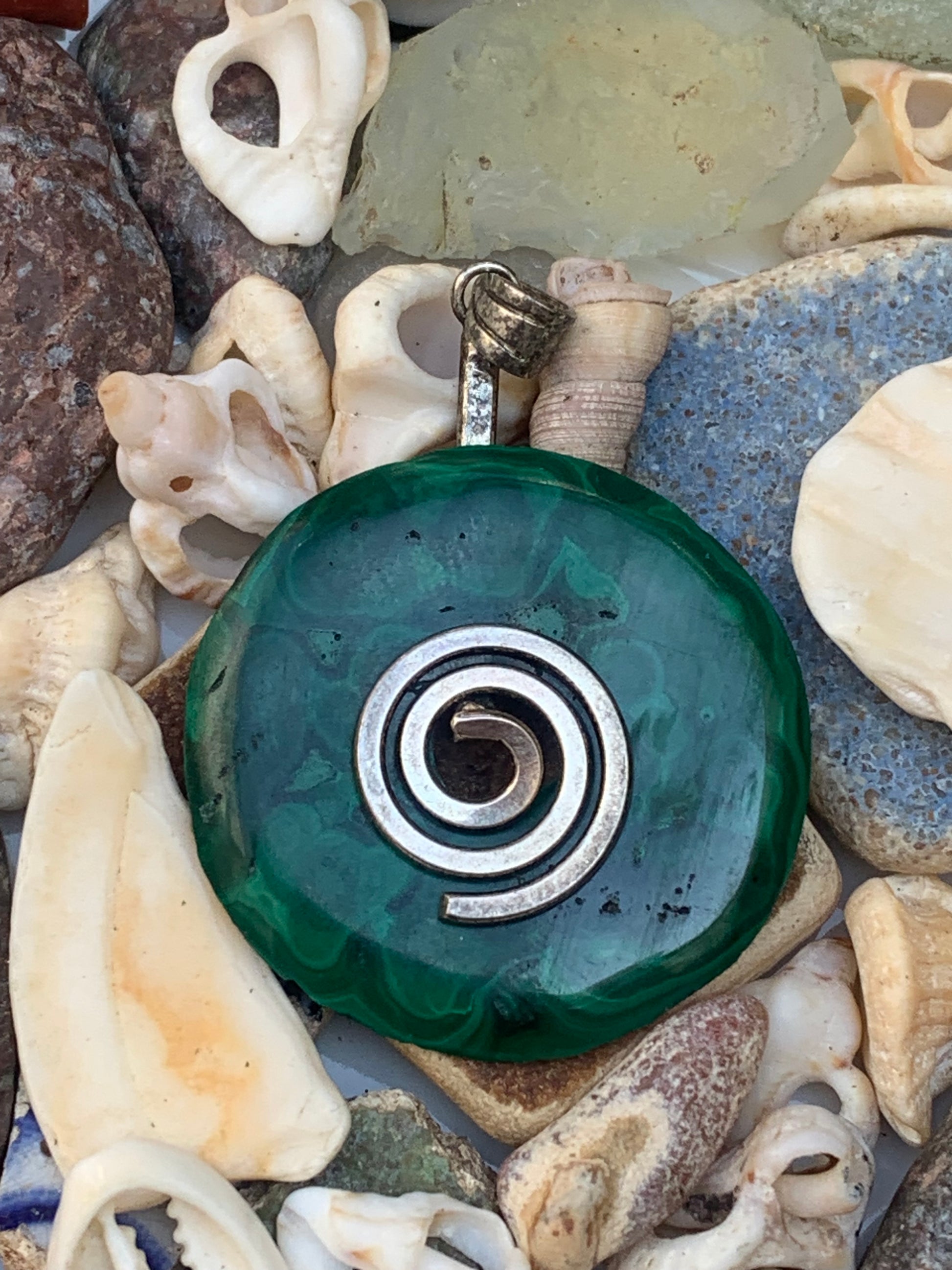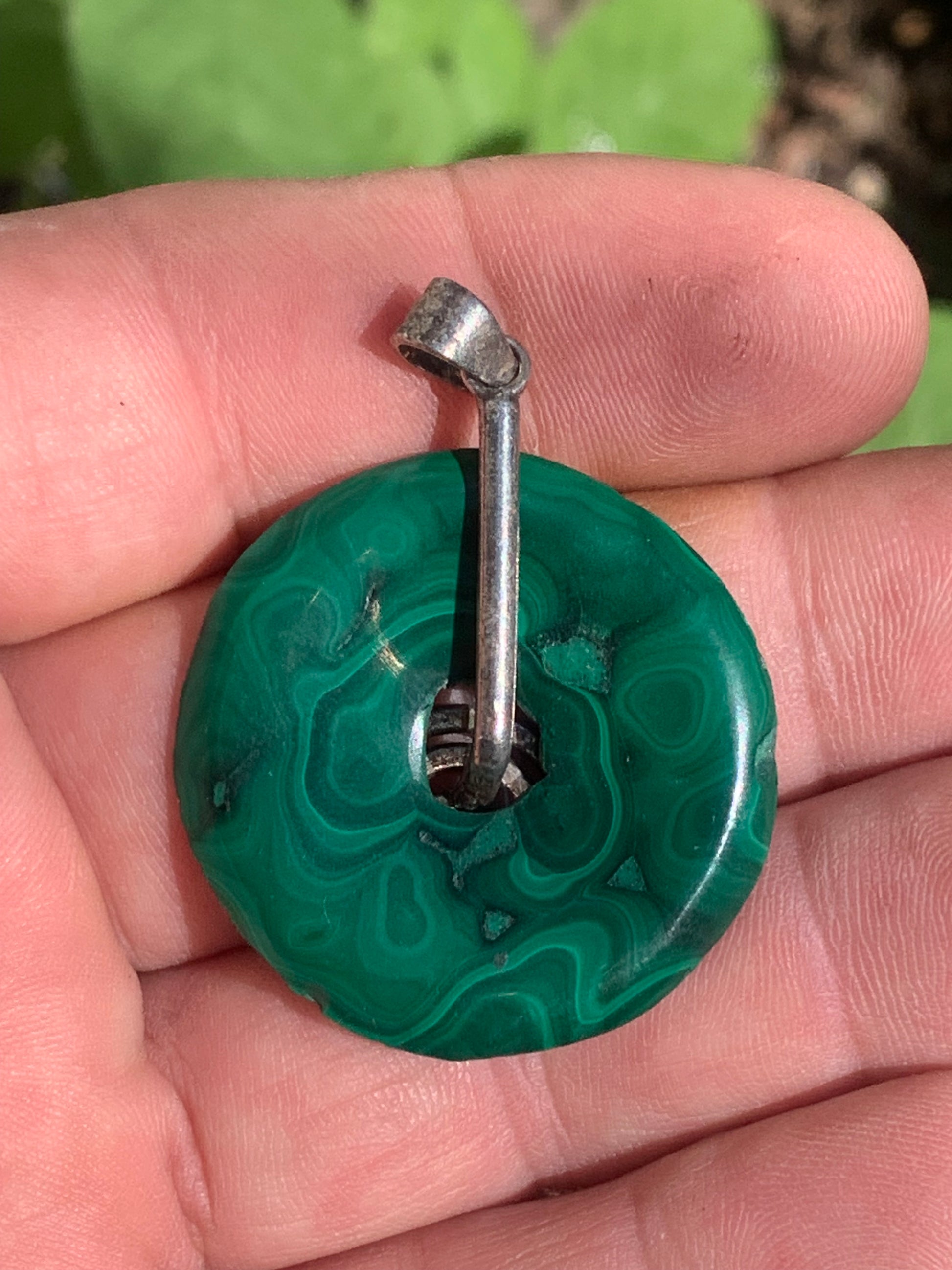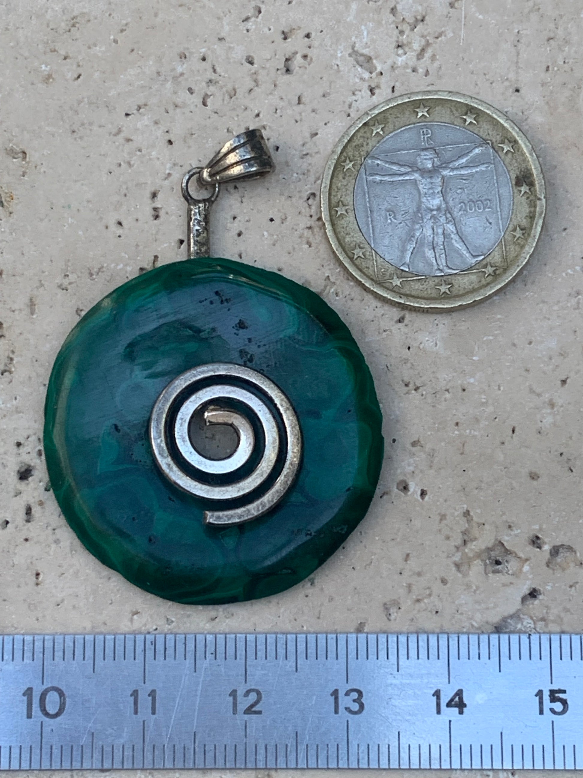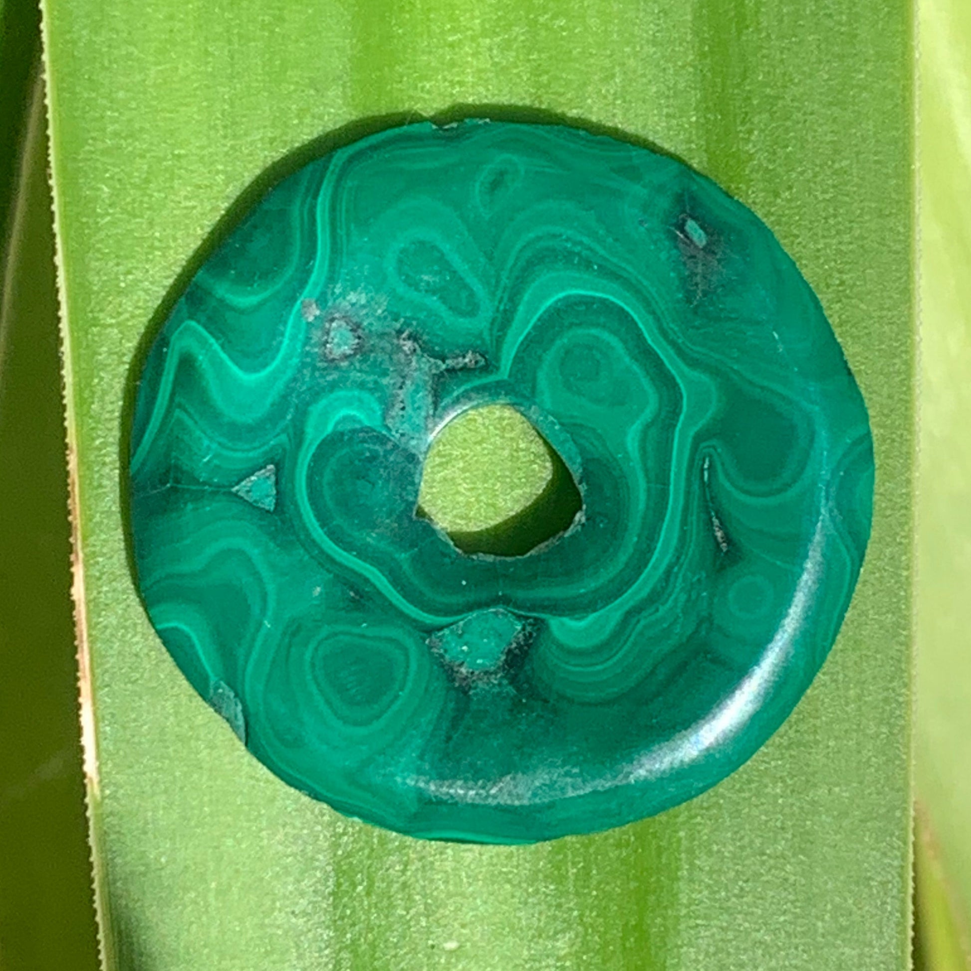 Malachite, superbe pendentif 'Donuts', de 50mm de hauteur x 35 de largeur x 5 d'épaisseur. Vendu avec ou sans support en métal, et avec cordon réglable de couleur noire offert.