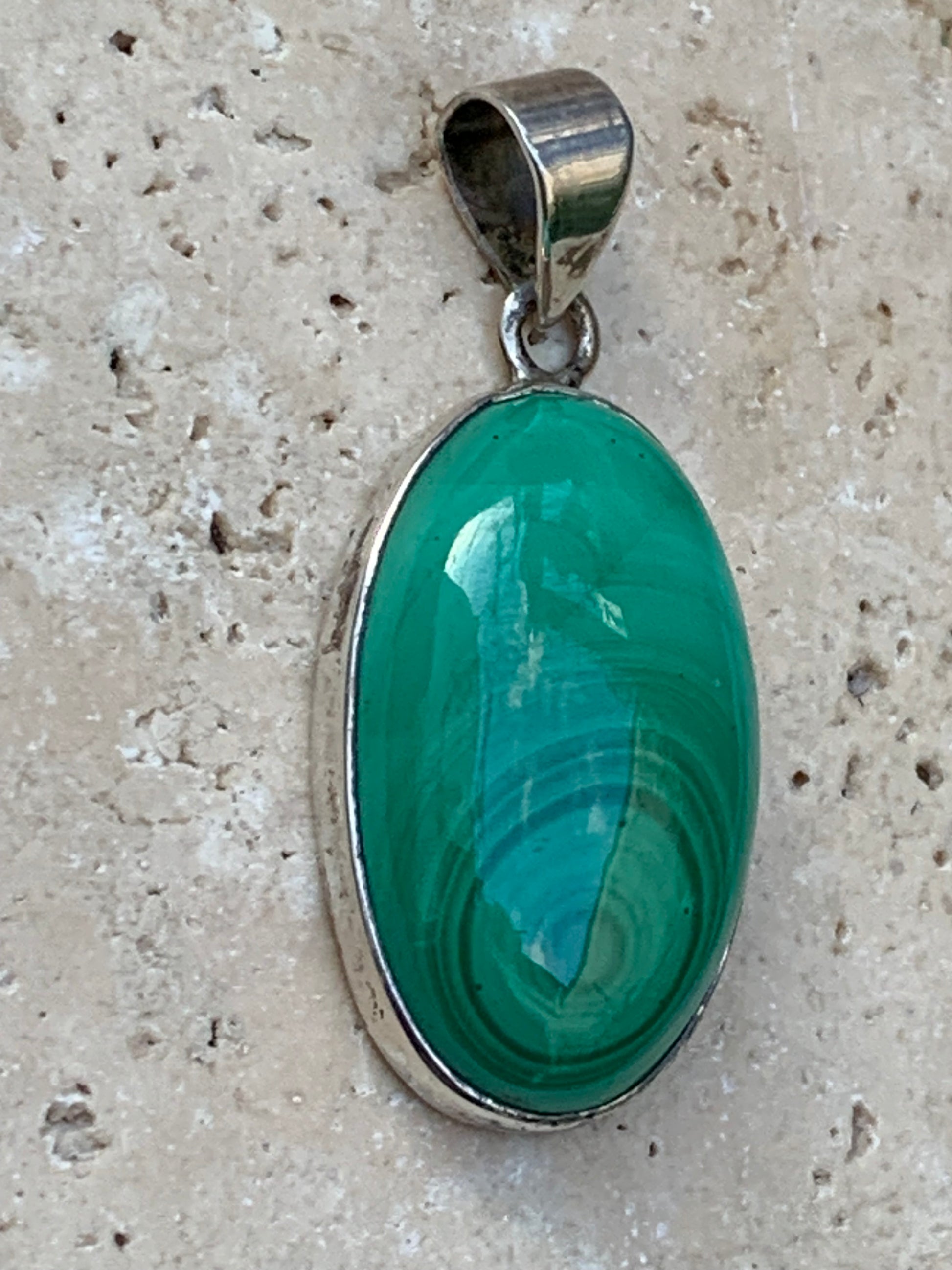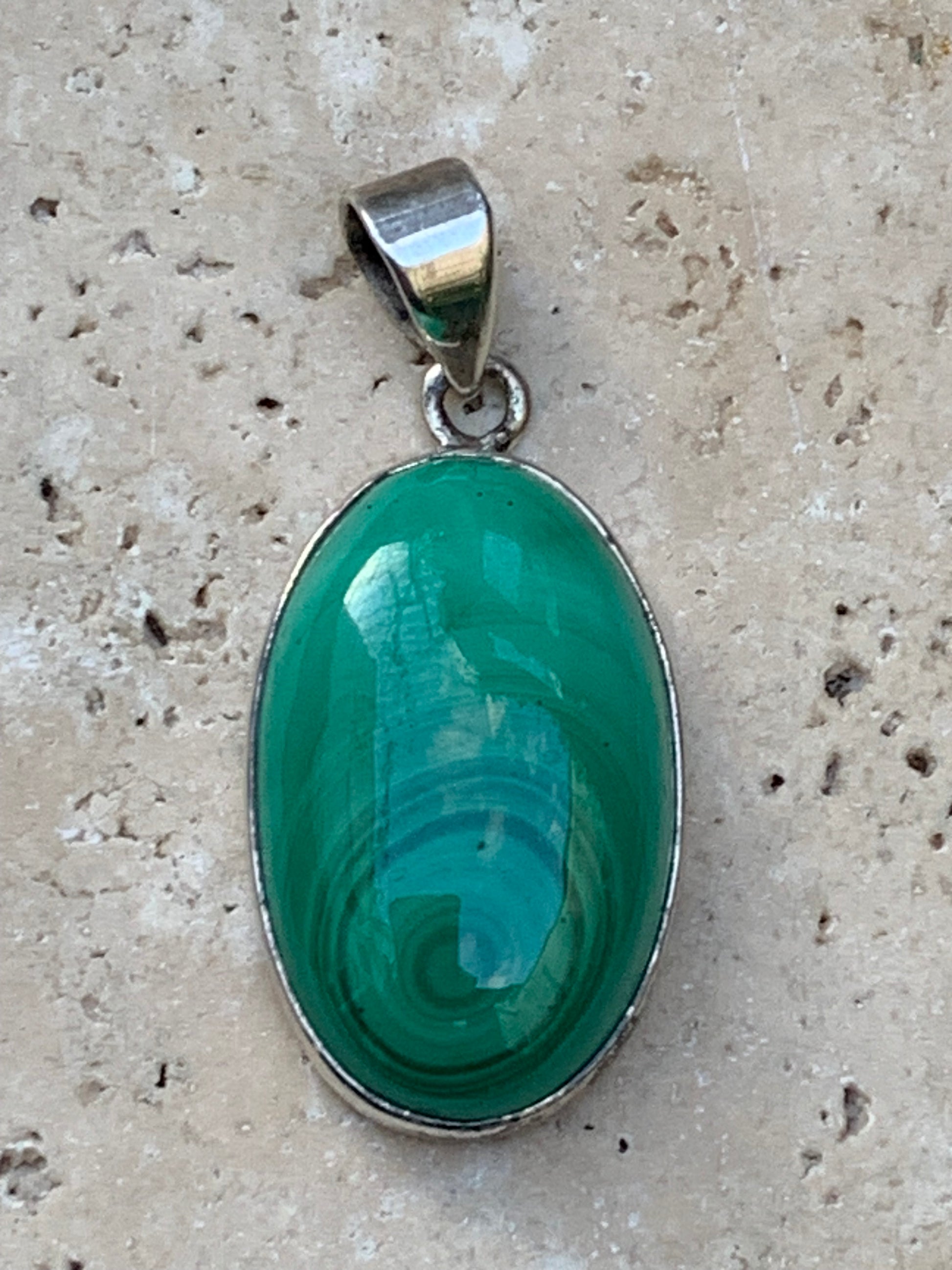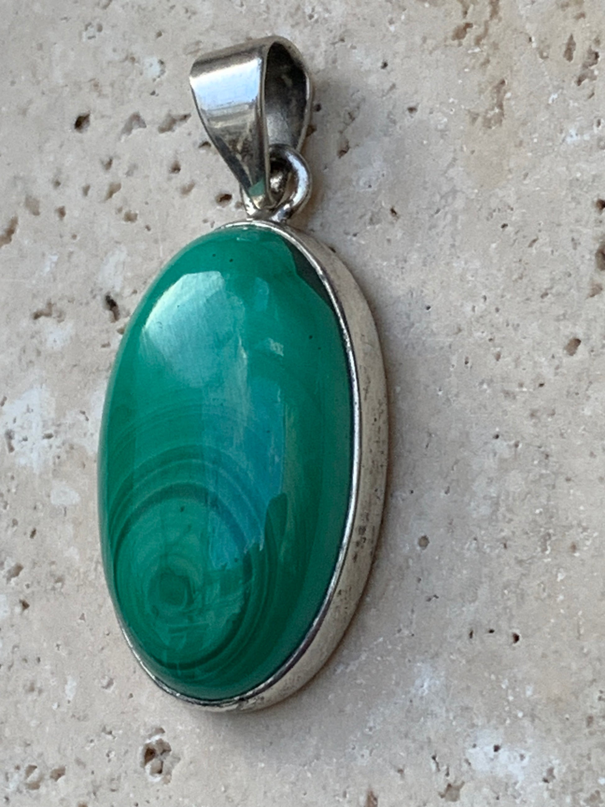 Malachite, superbe pendentif sertis Argent de 42mm de hauteur x 19 de largeur x 8 d'épaisseur. Vendu avec cordon réglable de couleur noire. (Copie)