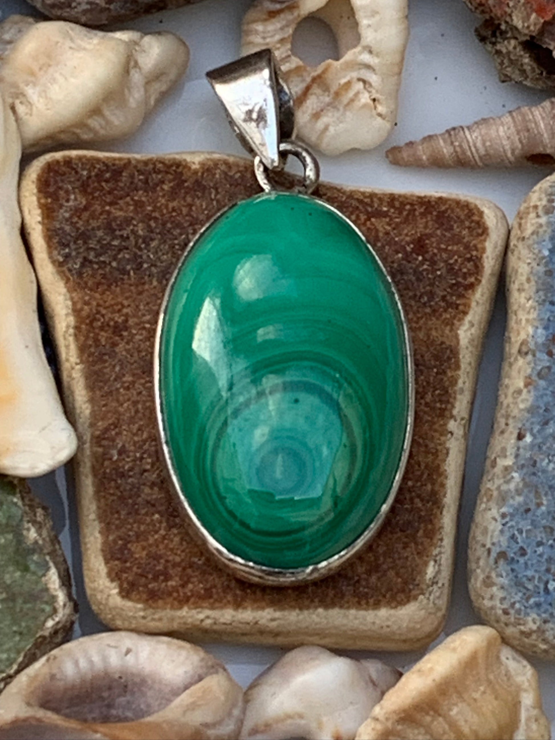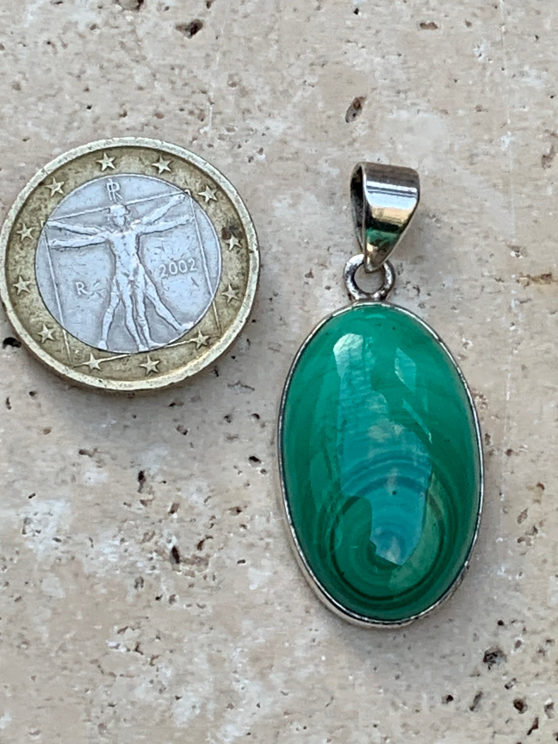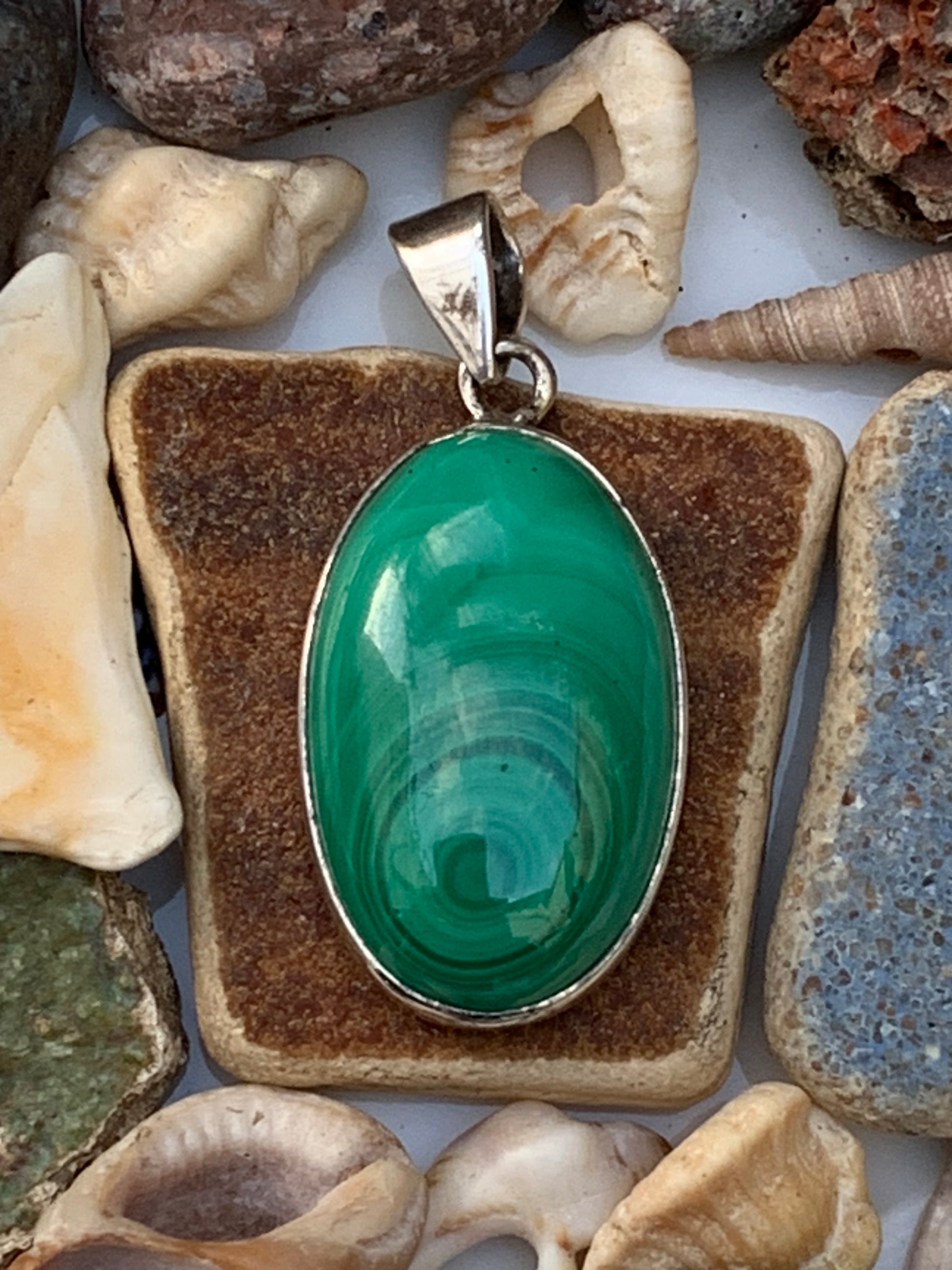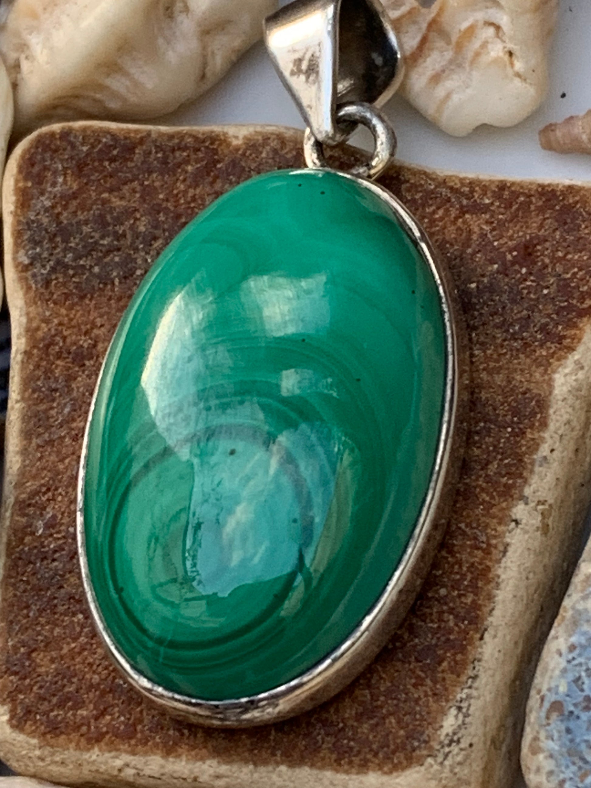 Malachite, superbe pendentif sertis Argent de 42mm de hauteur x 19 de largeur x 8 d'épaisseur. Vendu avec cordon réglable de couleur noire. (Copie)