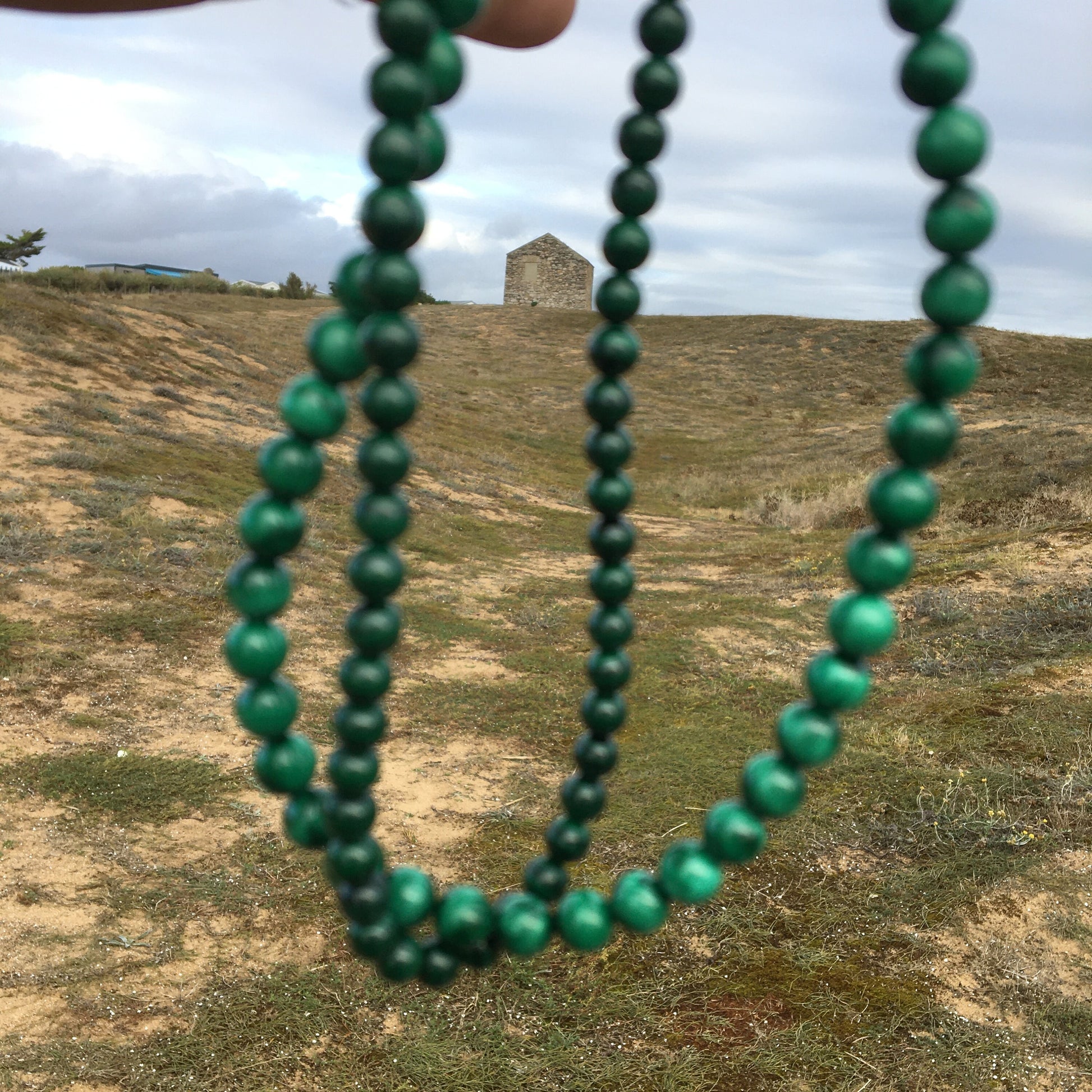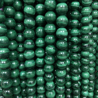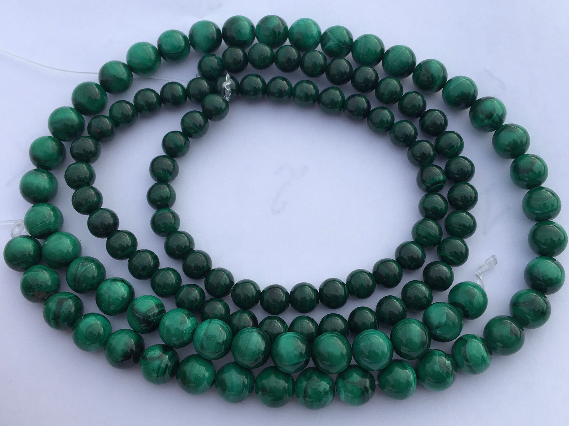 Malachite véritable, qualité Extra ! Perles rondes de 6 et 8 mm, vendu en fil de perle 38/39 cm, en bracelet de 17 à 21cm, en collier de 45 ou sautoir de 60cm. Qualité AA à AAA, superbes perles aux effets calmants !