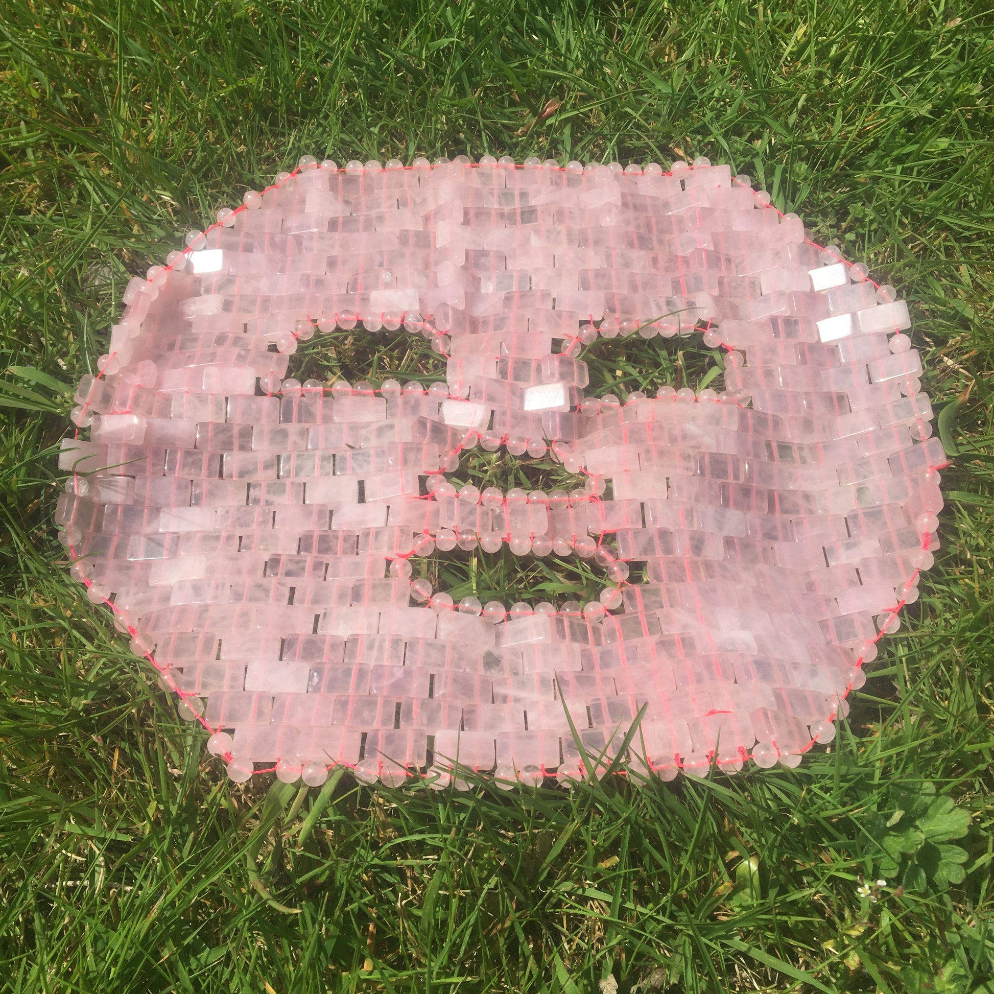 Masque en pierres naturelles de quartz rose de 28 x 22 cm.
