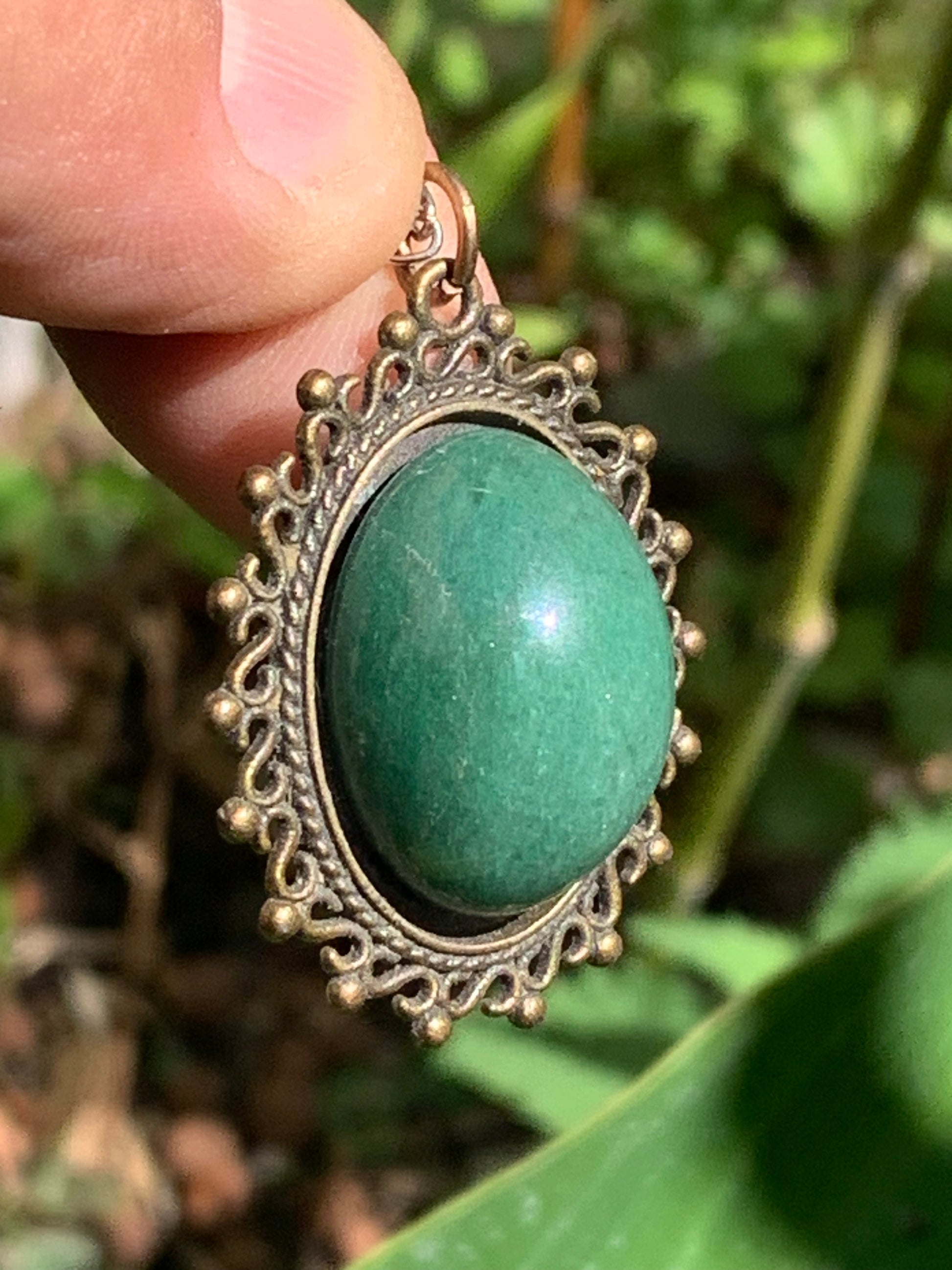 Médaillon couleur Bronze avec Aventurine/ quartz vert, de 36 mm de ht x30 x3. Vendu avec un cordon noir réglable !