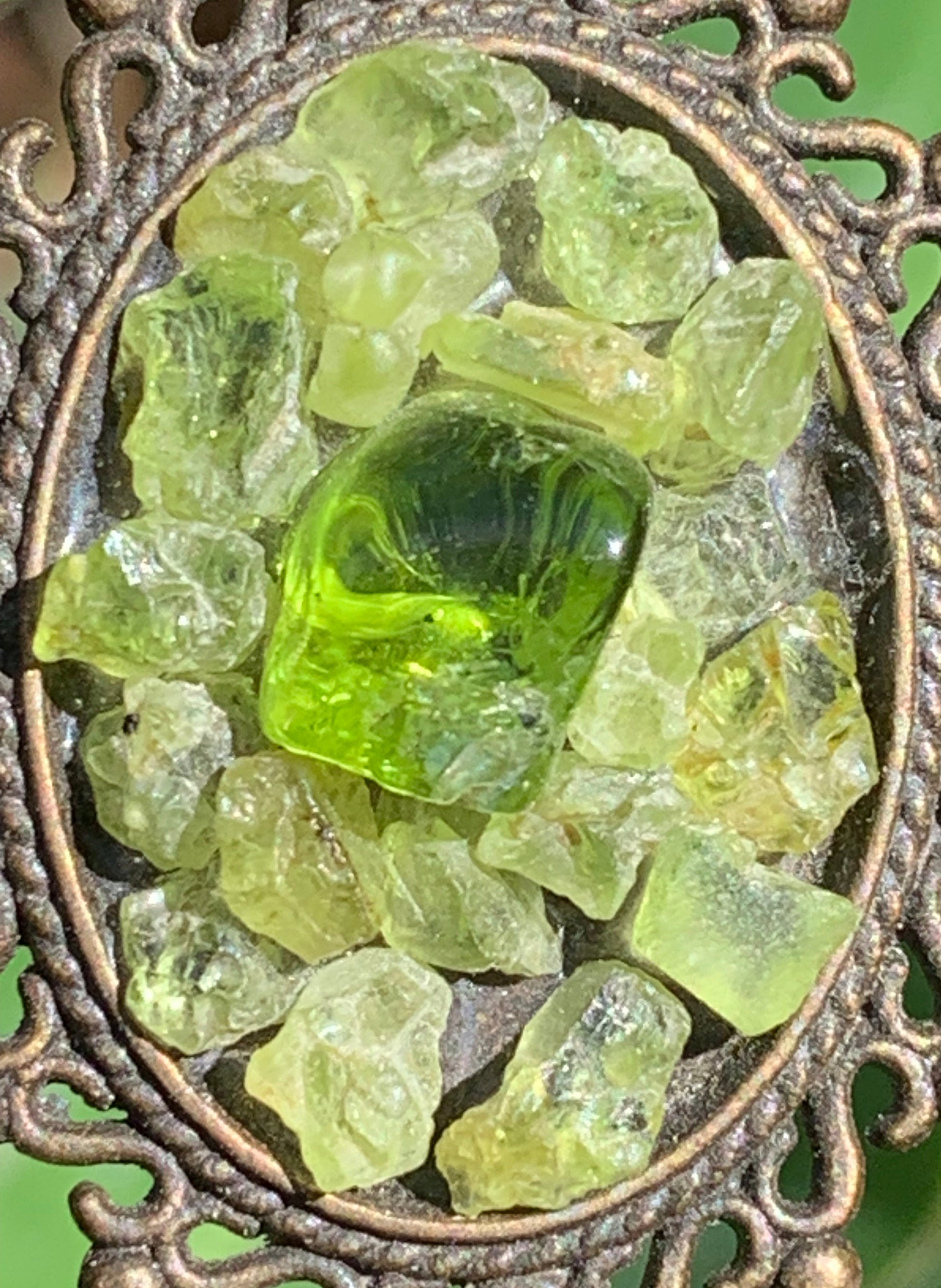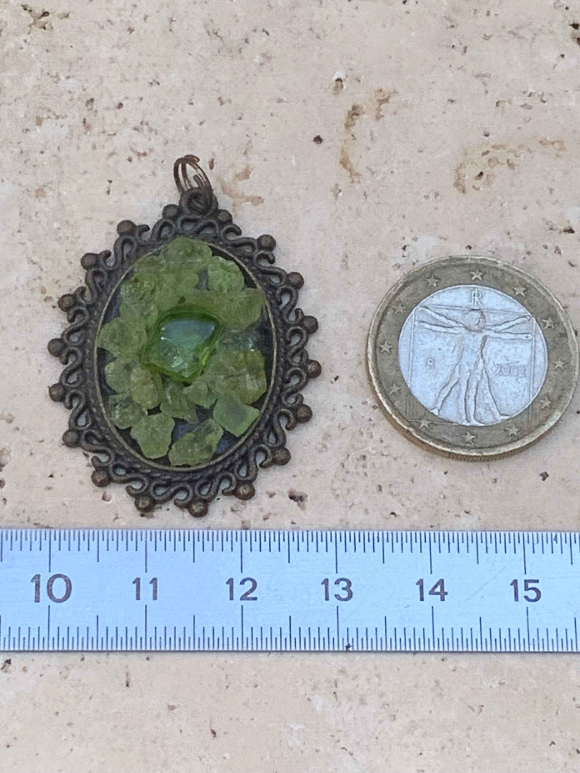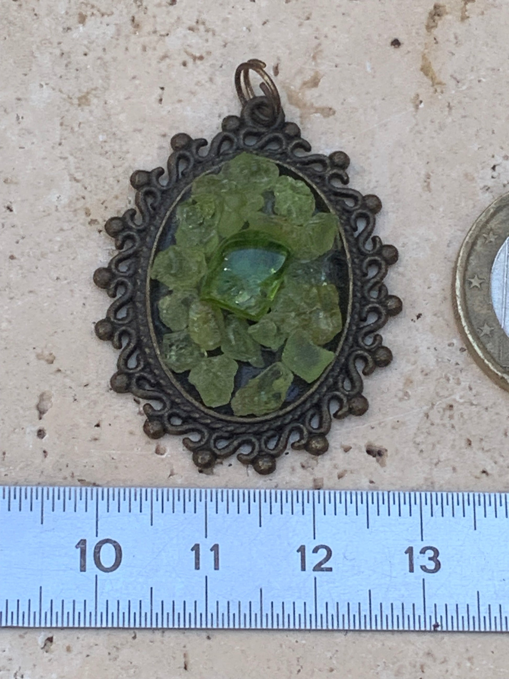 Médaillon couleur Bronze avec Péridot, de 36 mm de ht x30 x 11. Vendu avec un cordon noir réglable !