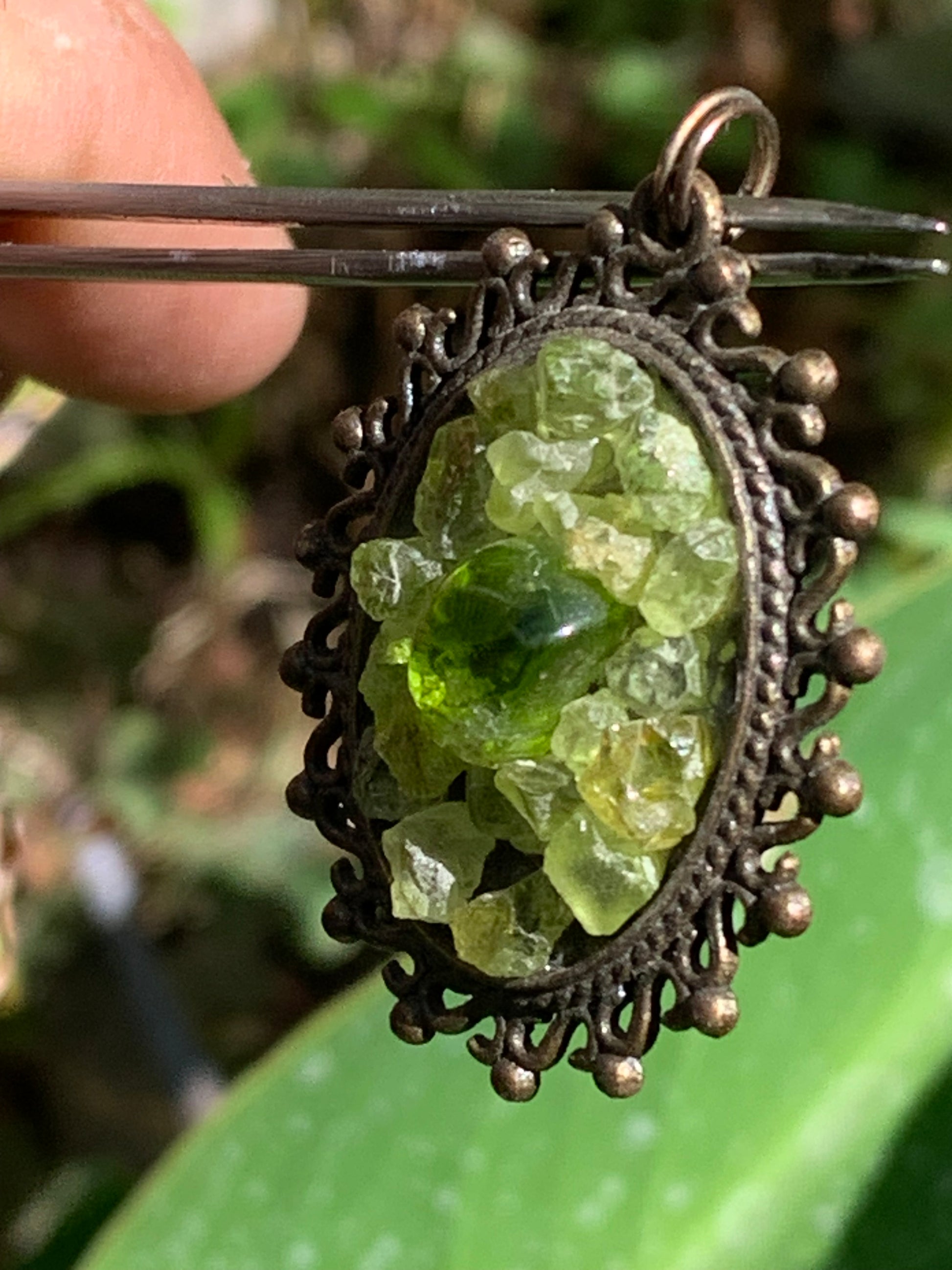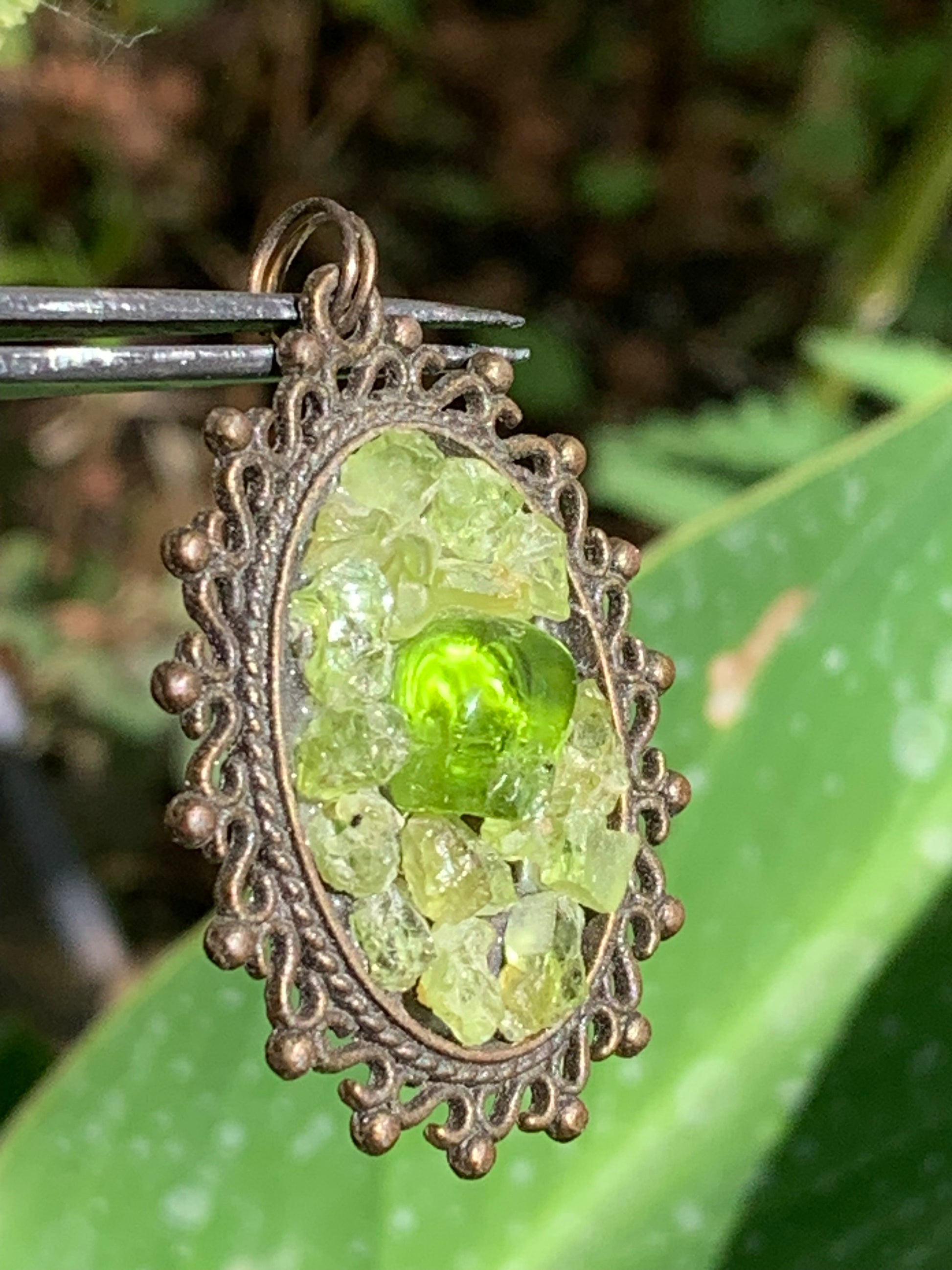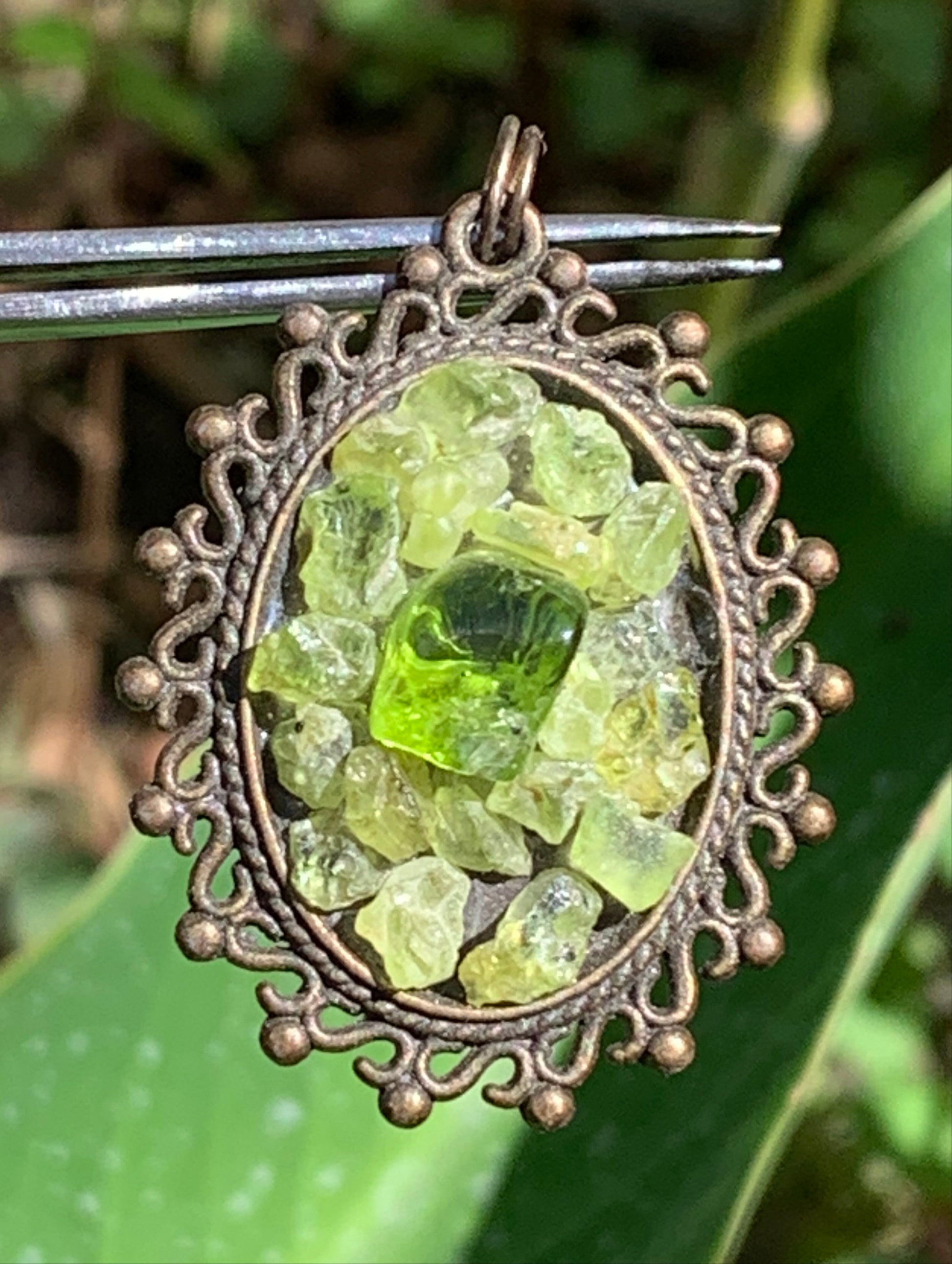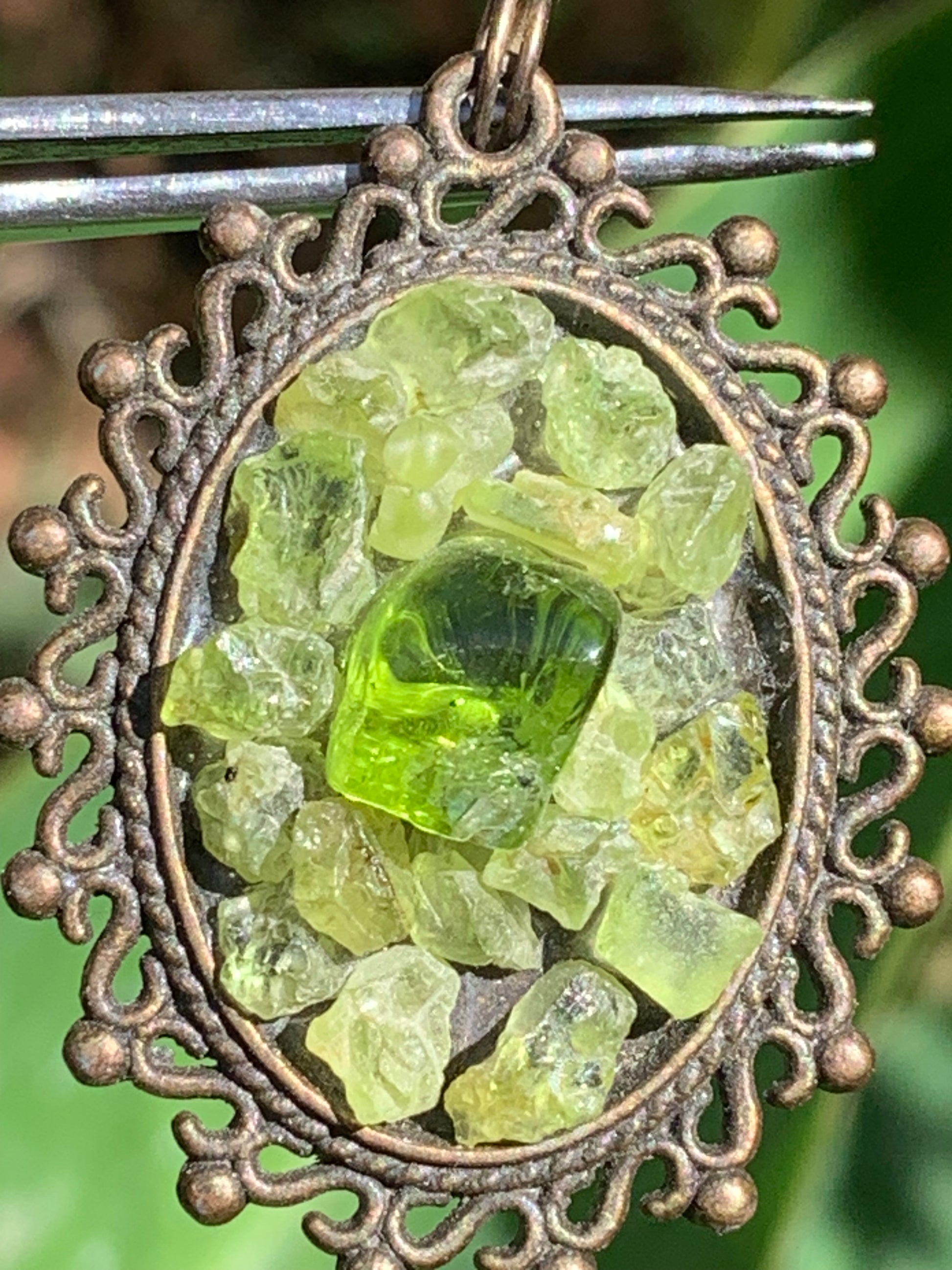 Médaillon couleur Bronze avec Péridot, de 36 mm de ht x30 x 11. Vendu avec un cordon noir réglable !