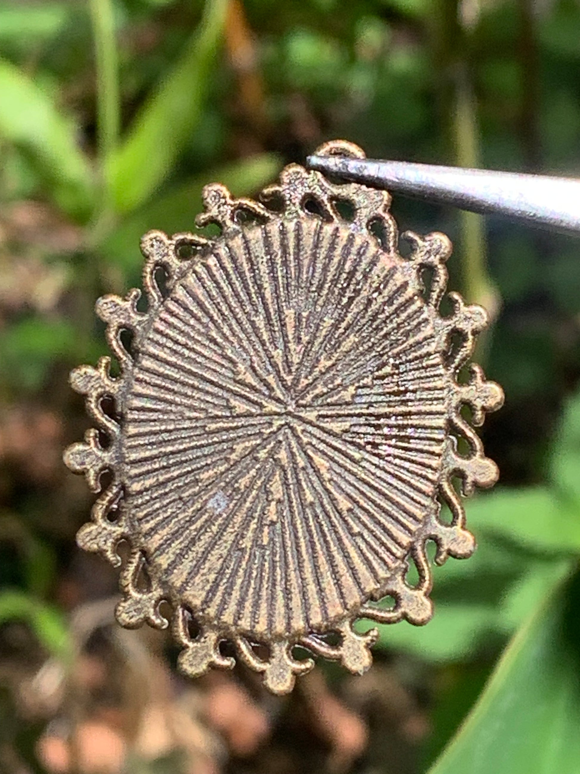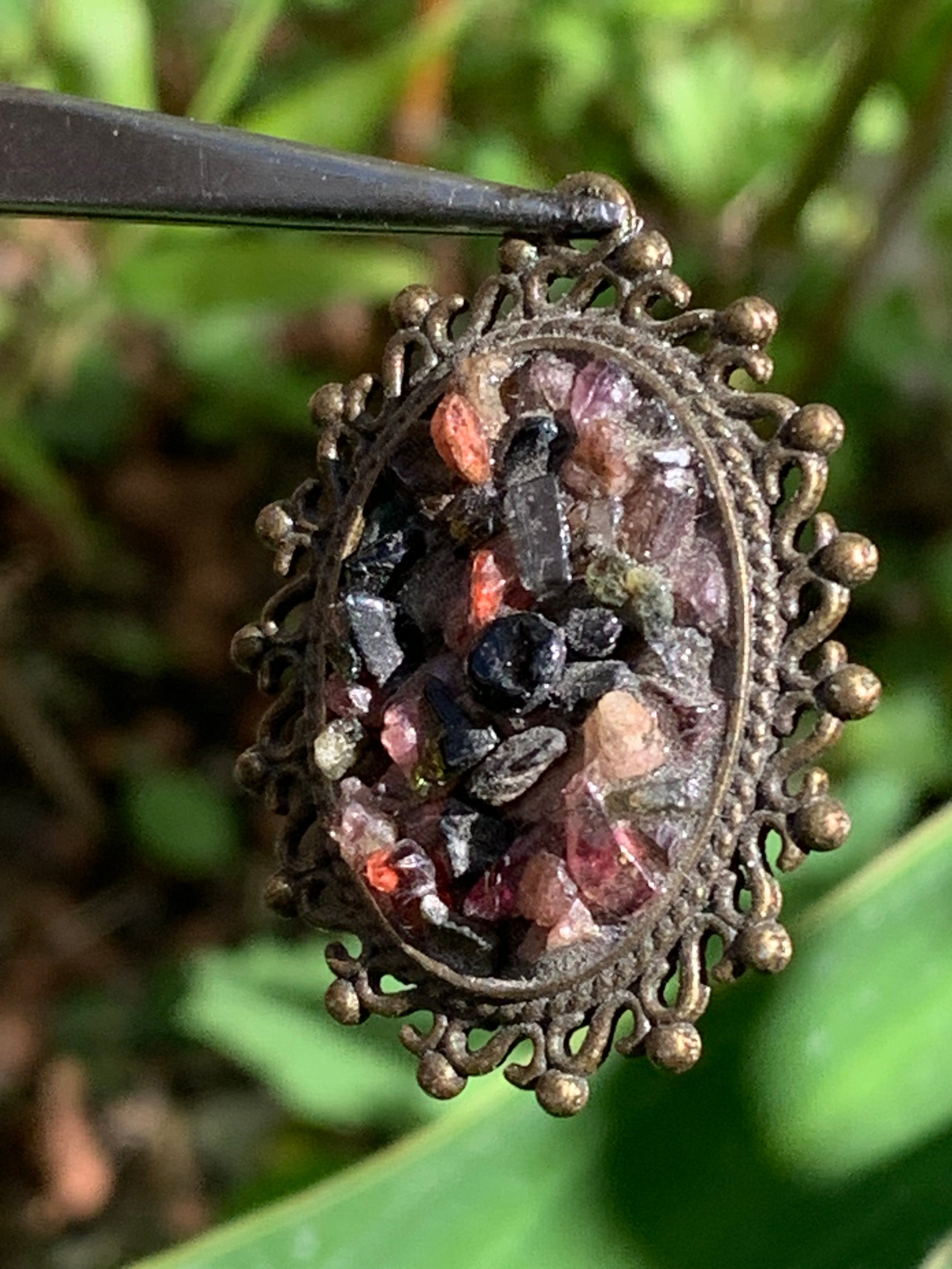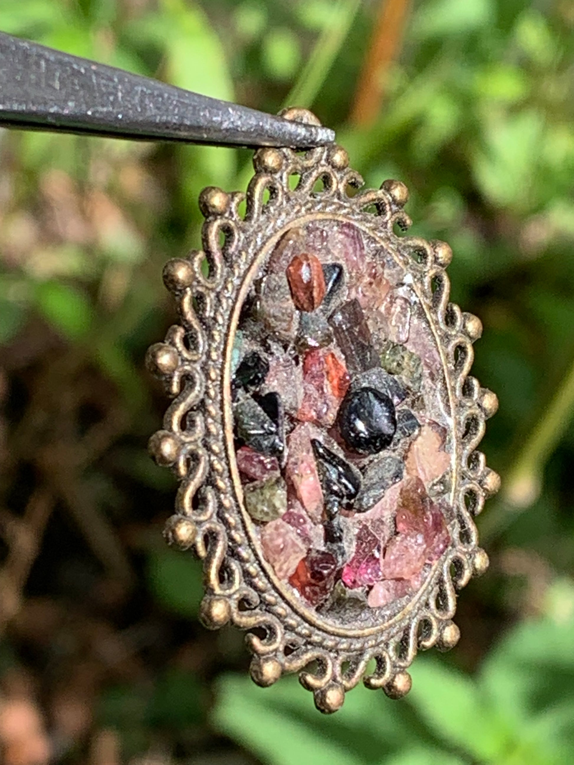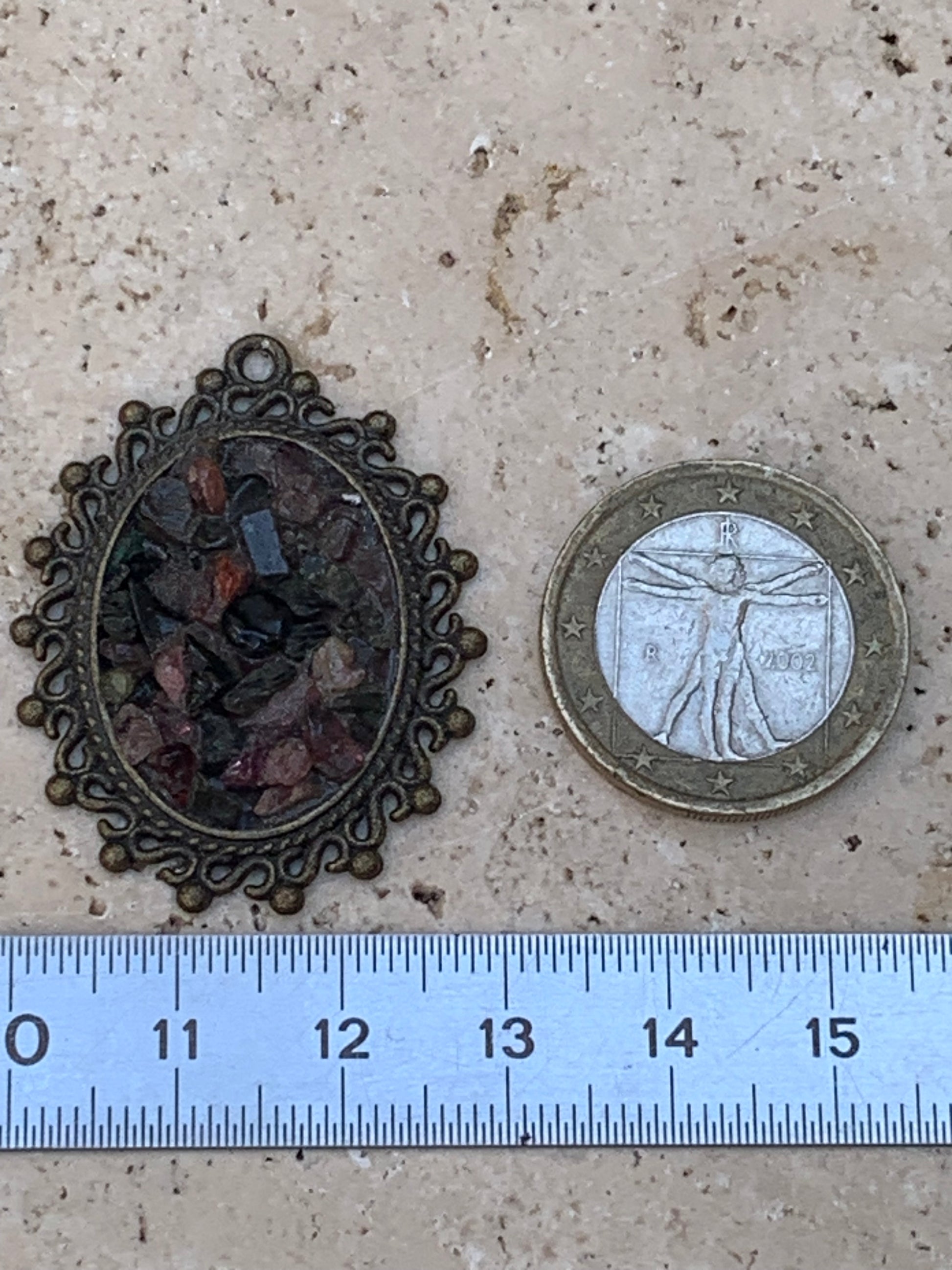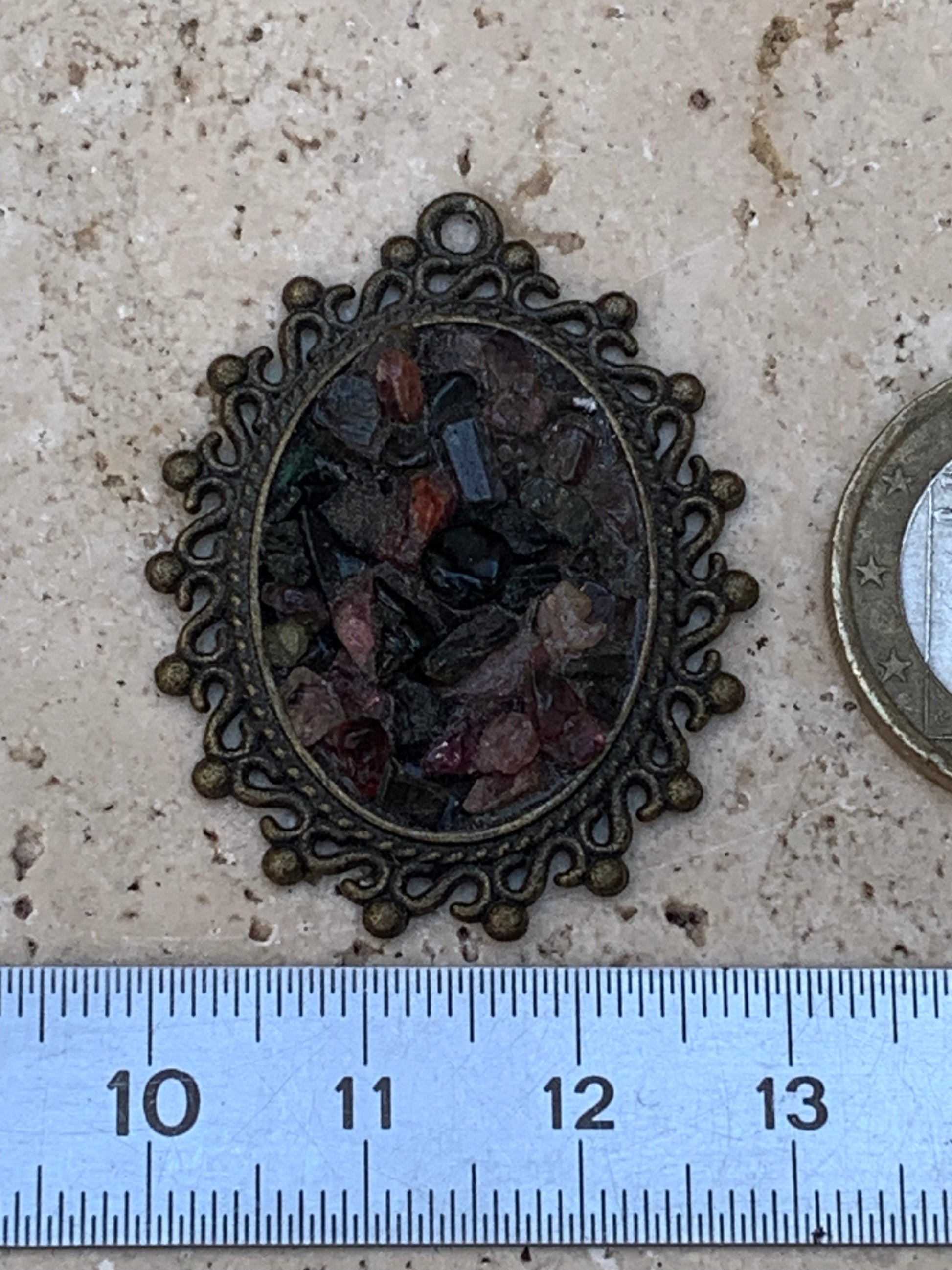 Médaillon couleur Bronze avec Tourmaline multicolore, de 36 mm de ht x30 x 8. Vendu avec un cordon noir réglable !