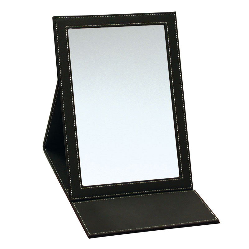 Luxueux Miroir de comptoir pliable, gainé noir. Se replie très facilement, très pratique pour le transport mais aussi en boutique. Dimensions : 18 x 24 cm