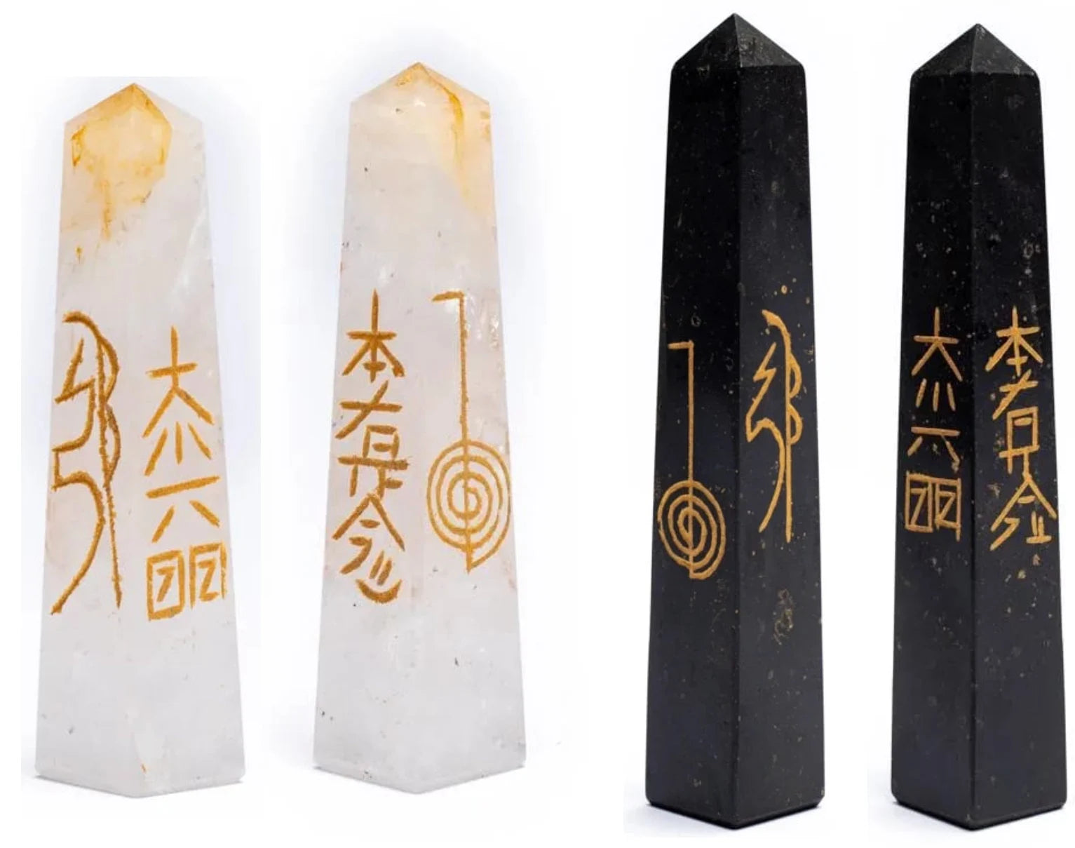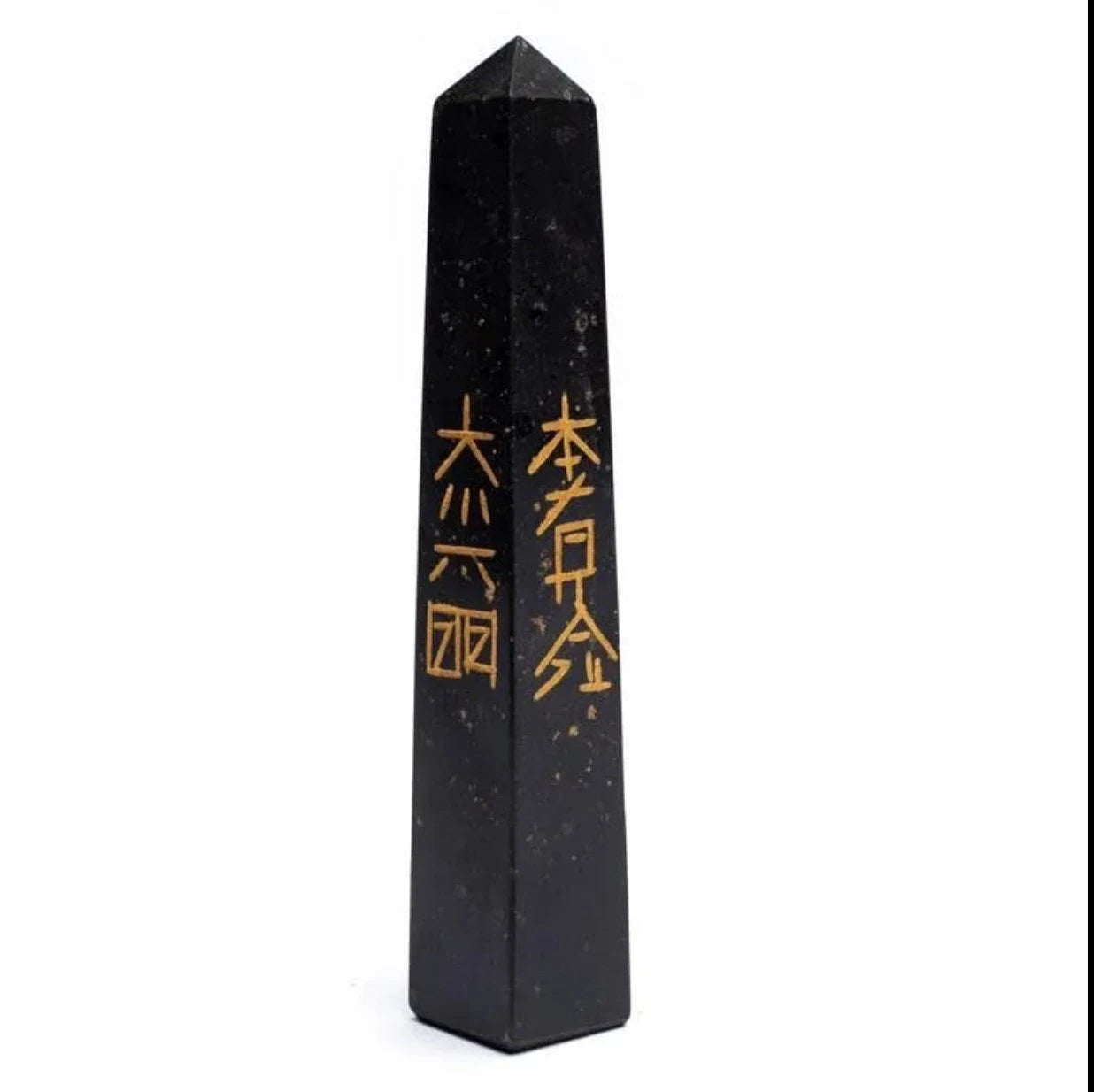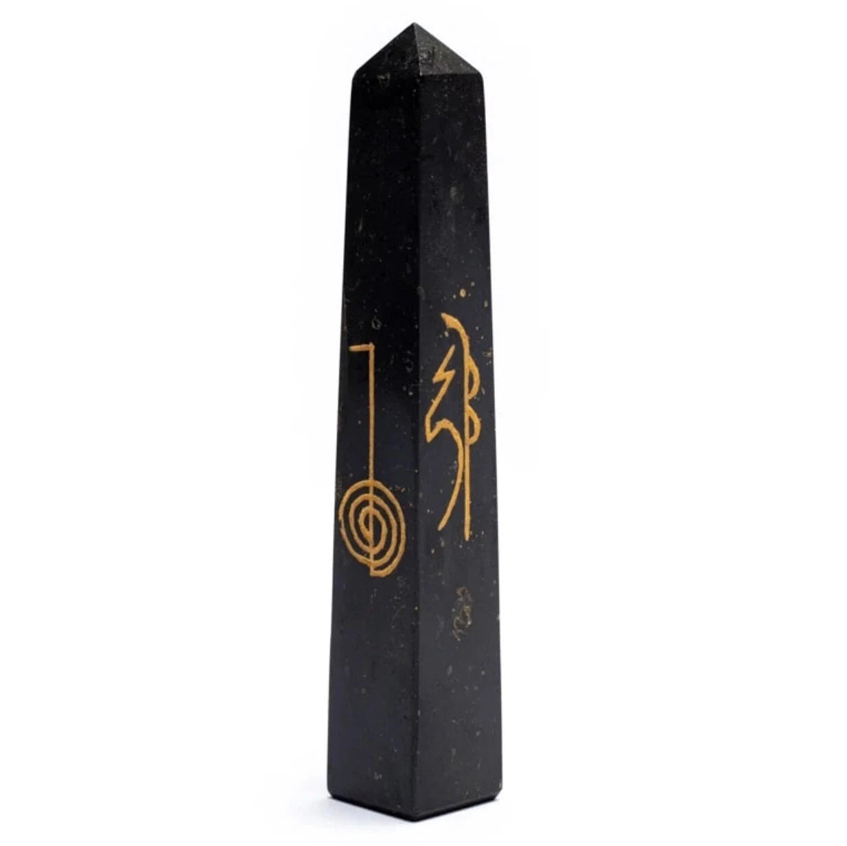 Obélisque en cristal de roche ou tourmaline noire avec symboles 'Reiki' gravés. 8 à 10 cms de haut/ 90 grs. Fortement recommandé par les guérisseurs de cristal, les praticiens de reiki et les spécialistes du feng shui.