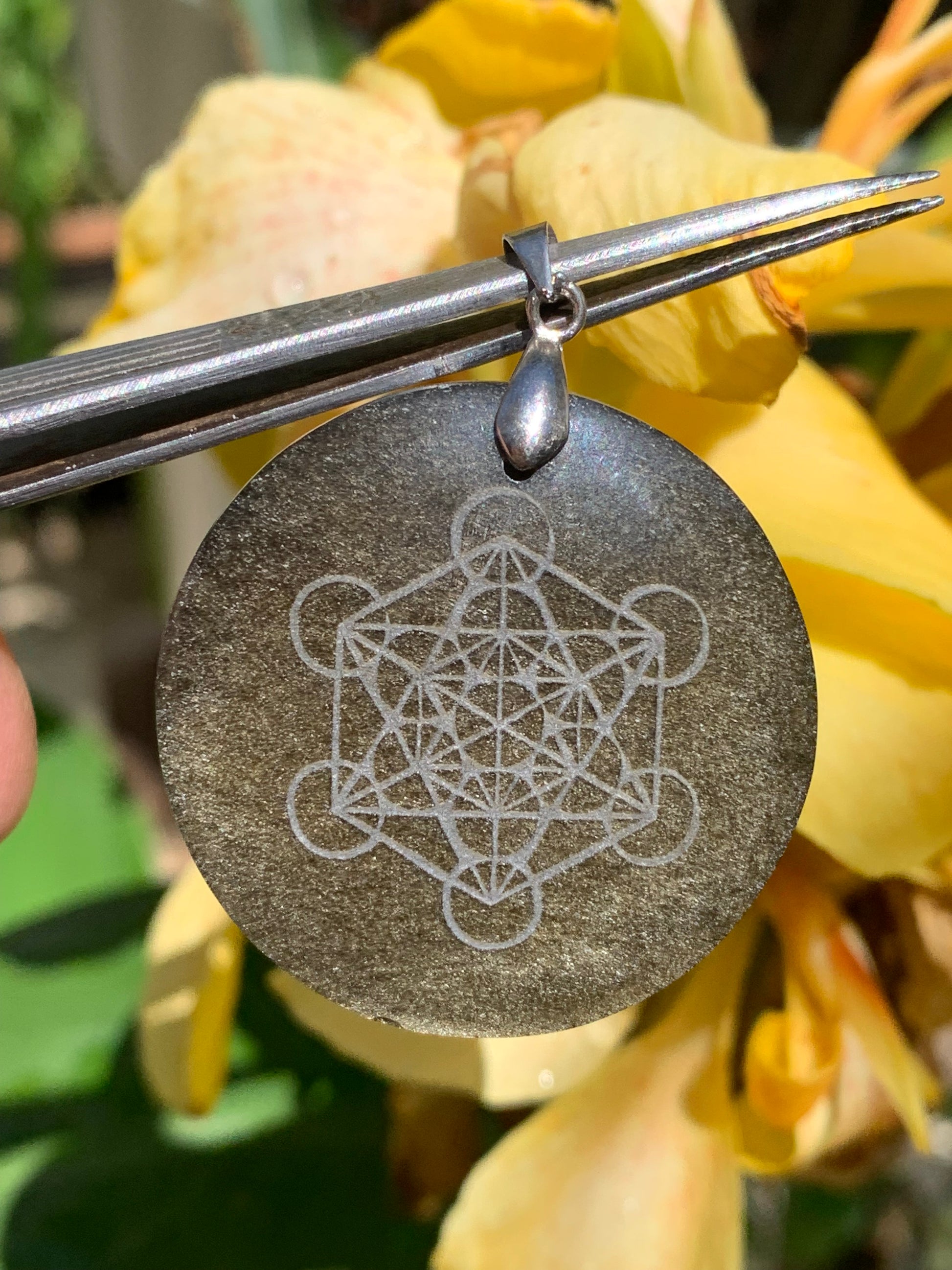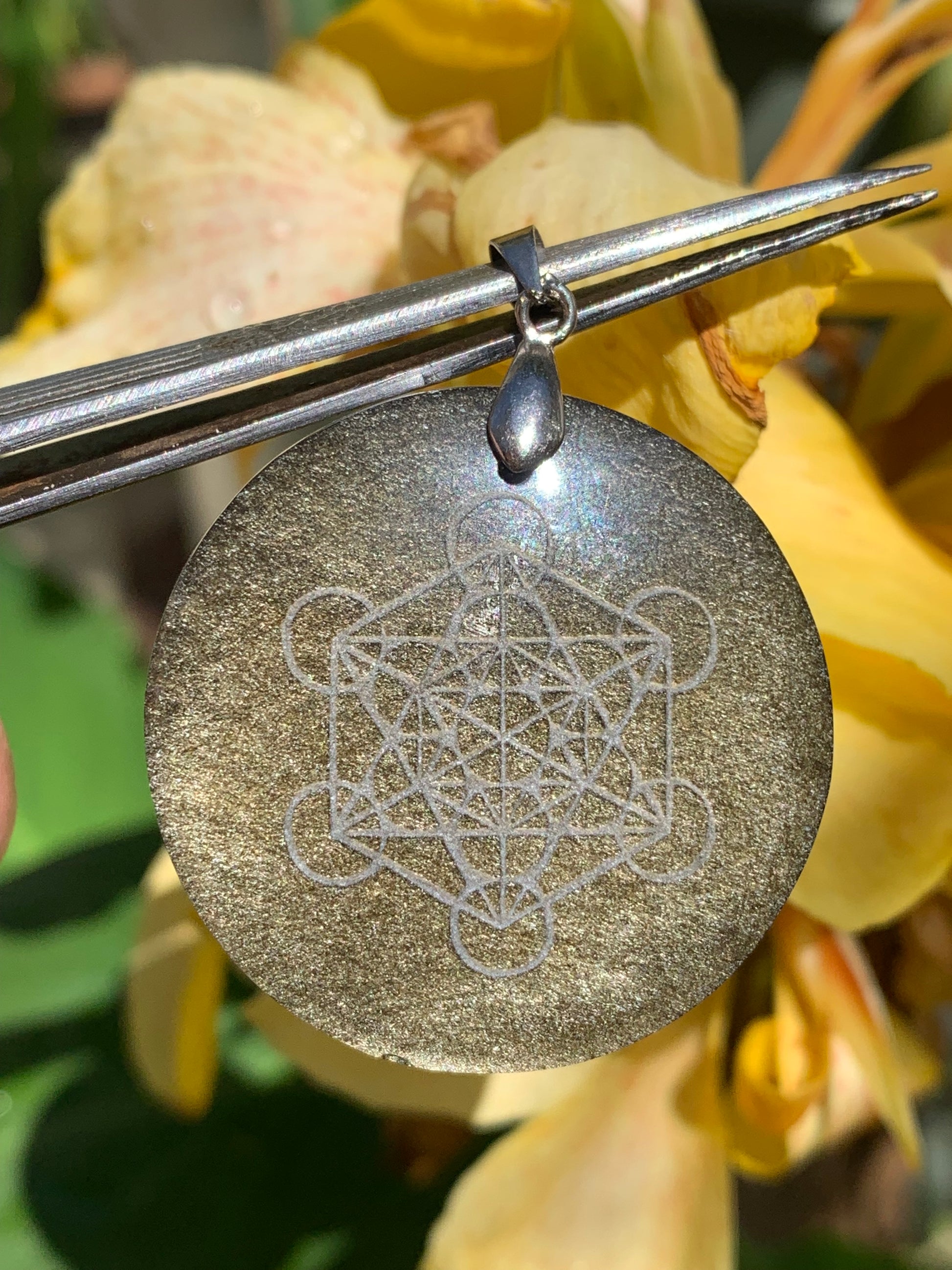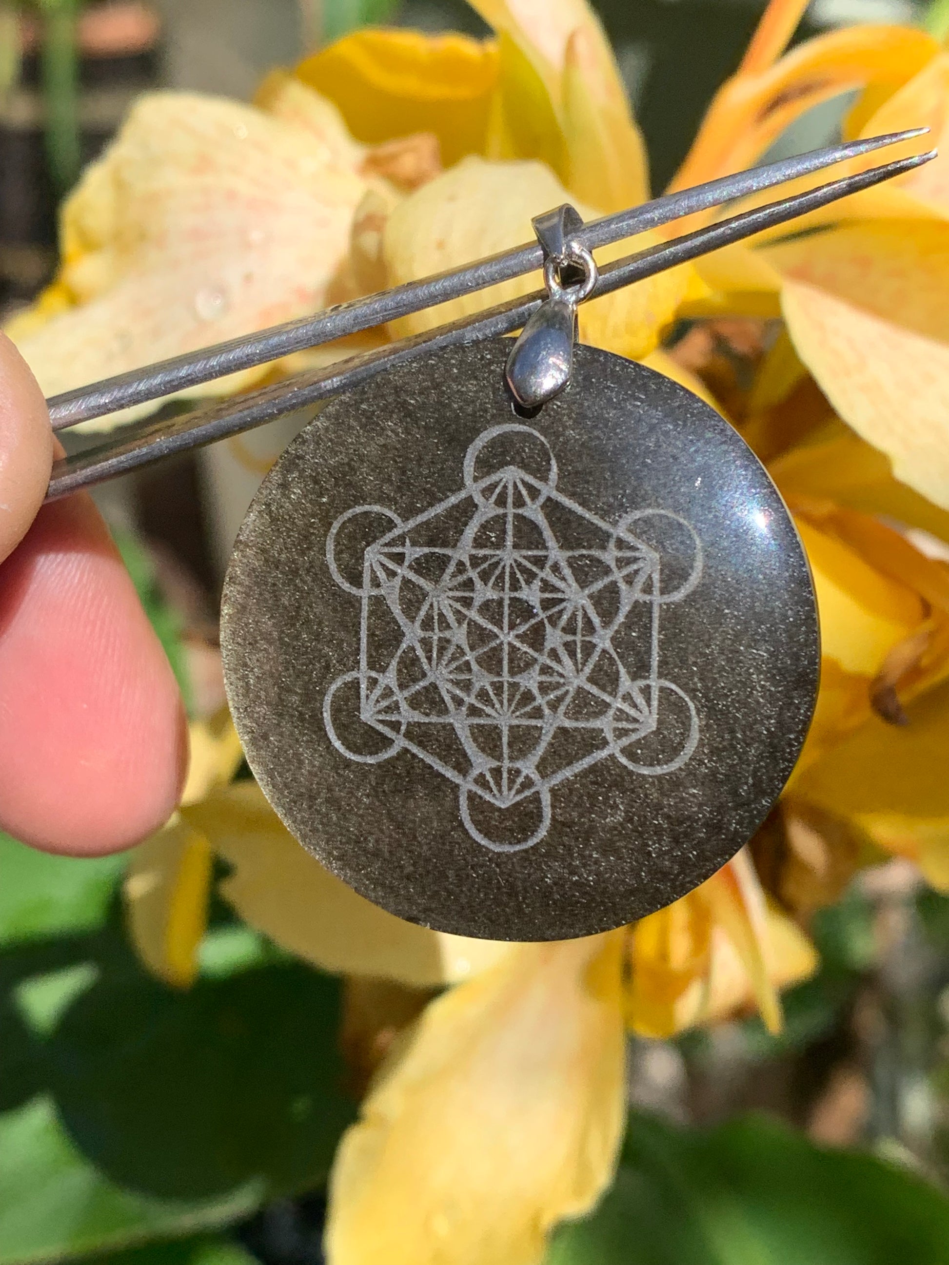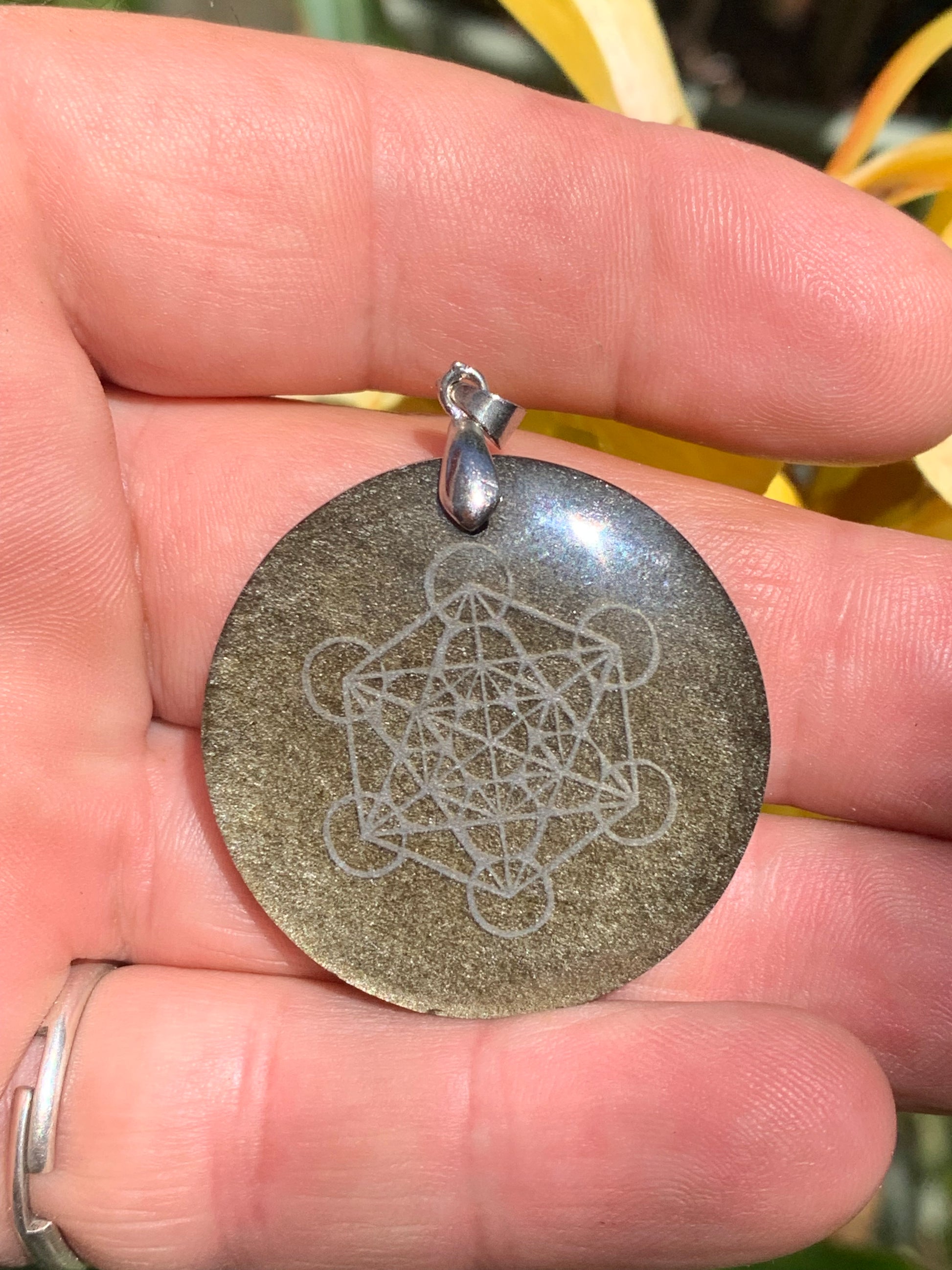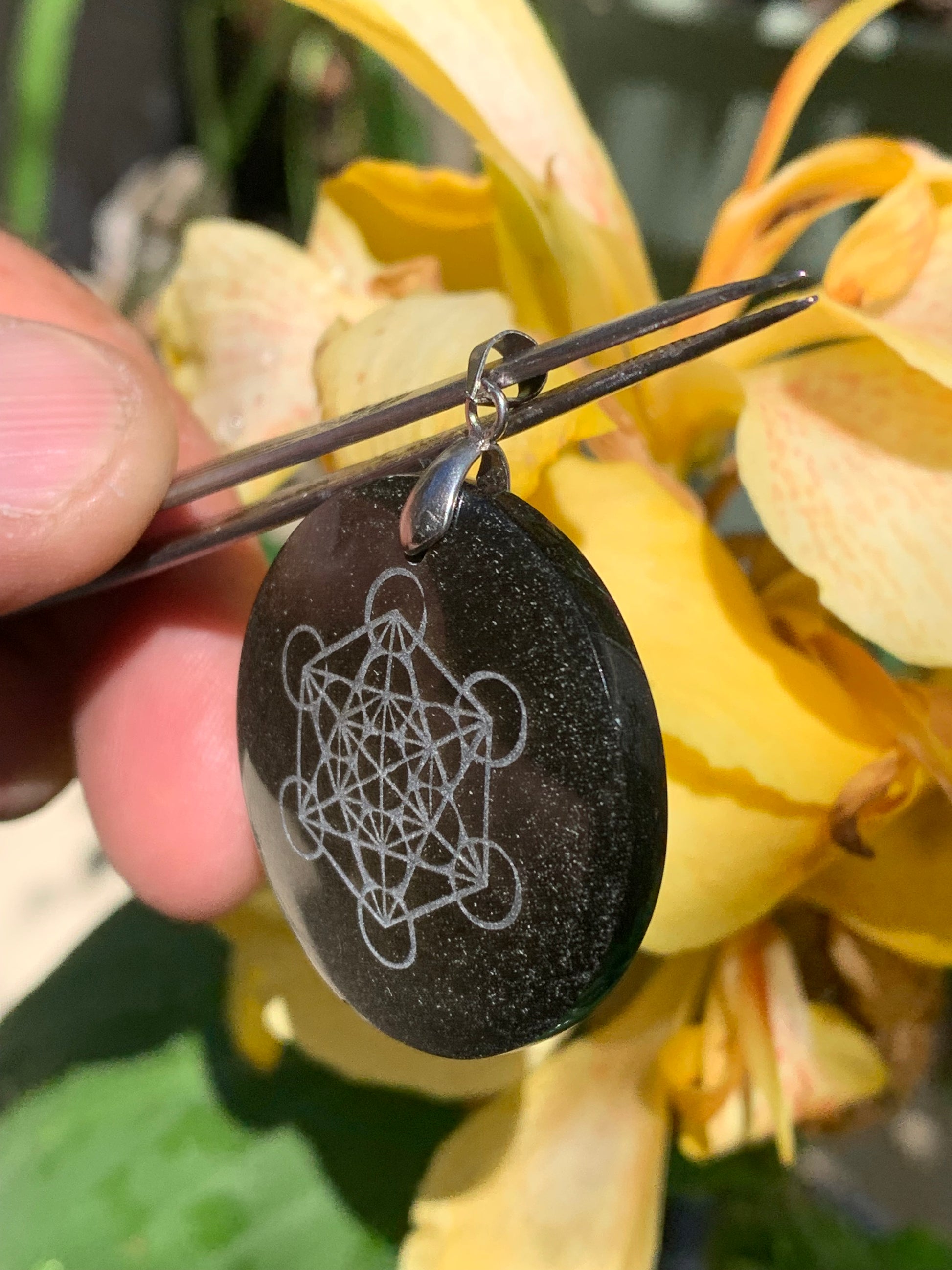 Obsidienne dorée, pendentif de 'Metatron', de 45mm de hauteur x 36 de largeur x 7 d'épaisseur, fait en France. Vendu avec cordon réglable de couleur noire offert !