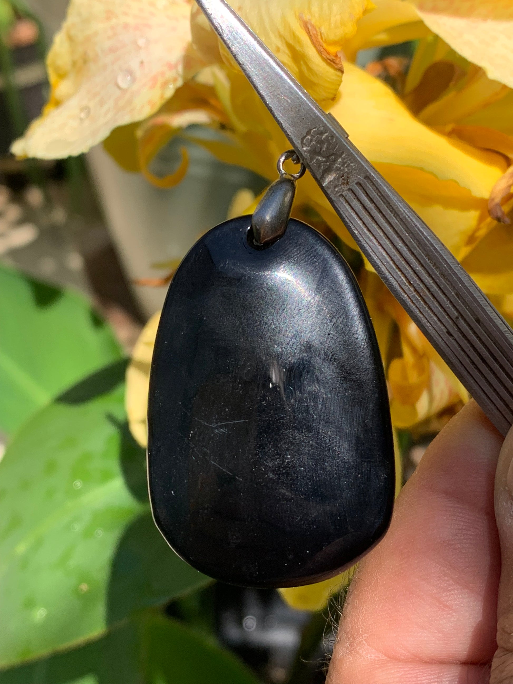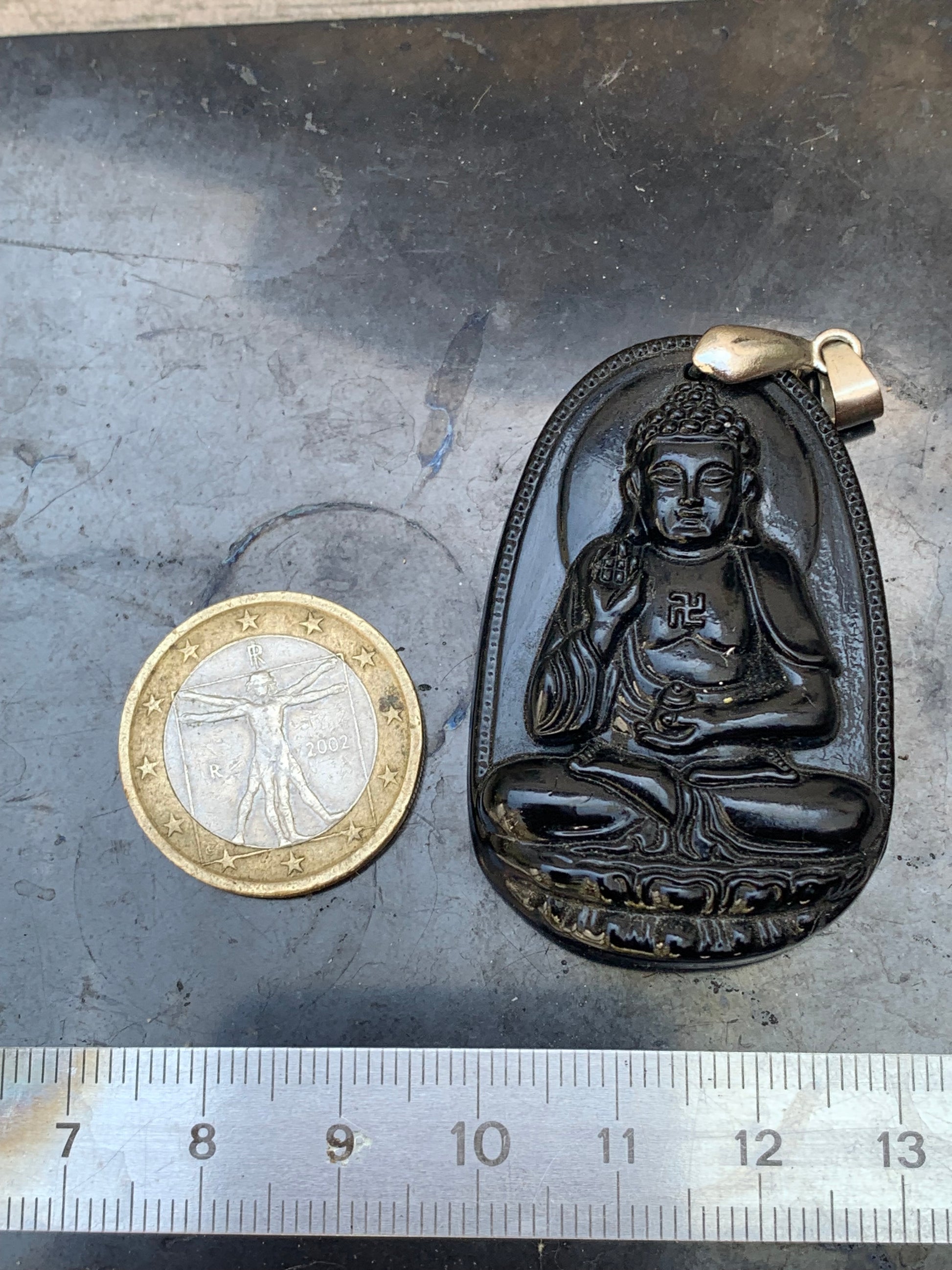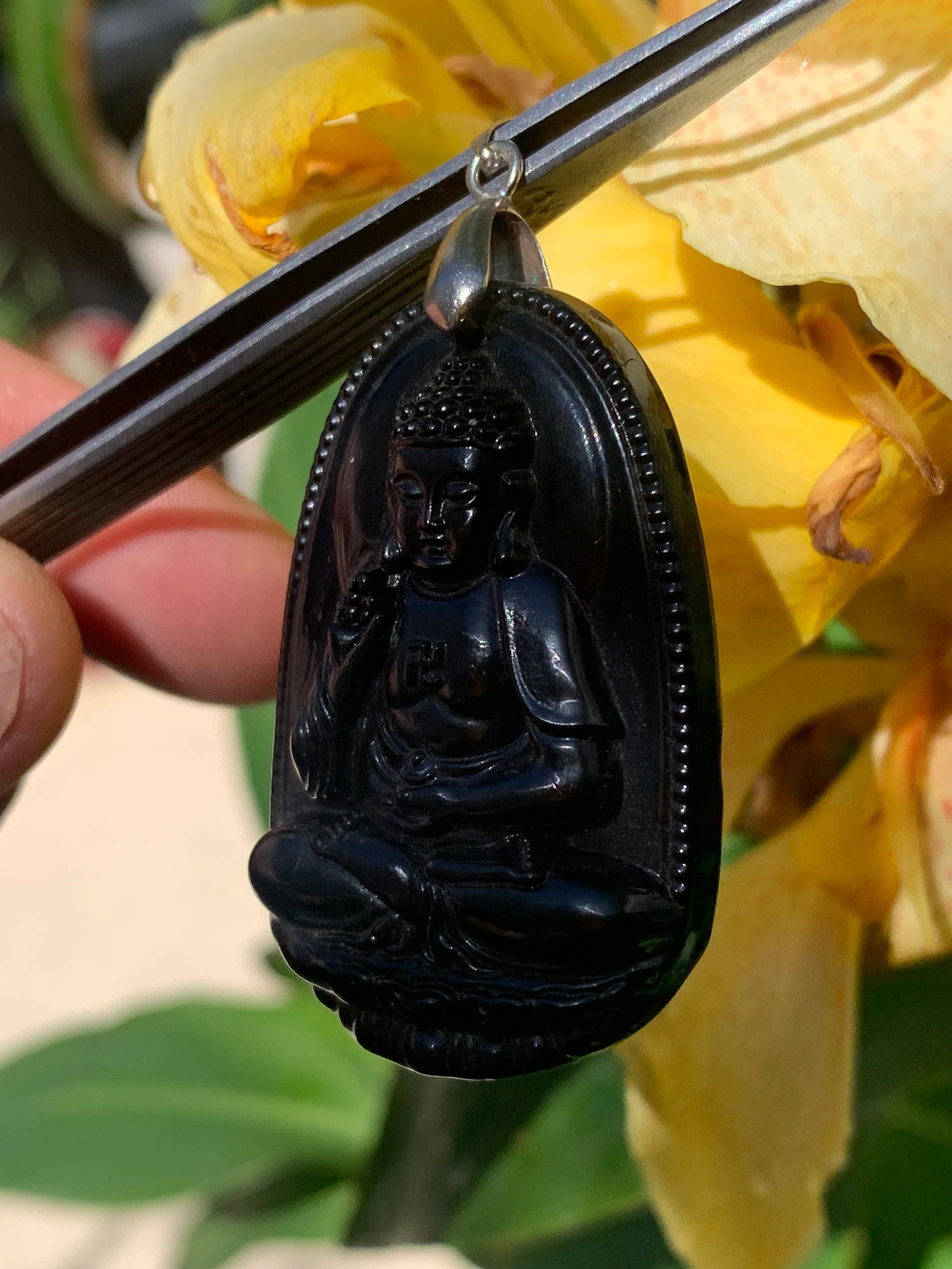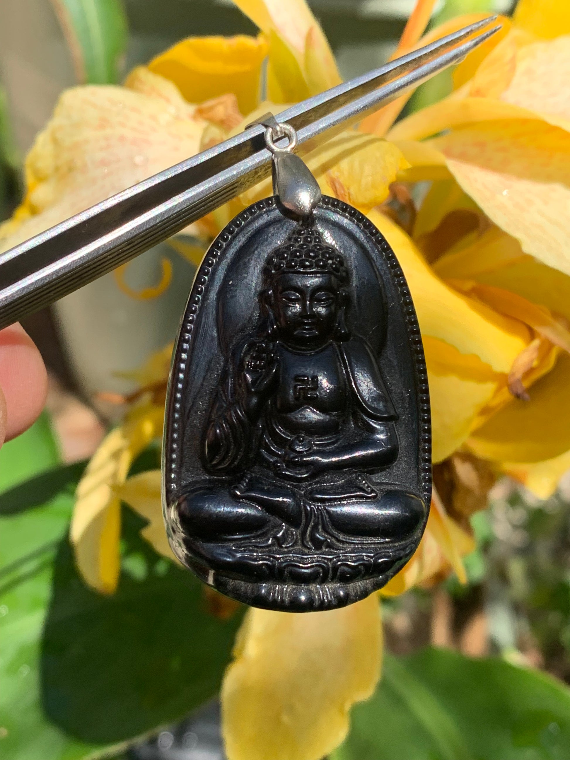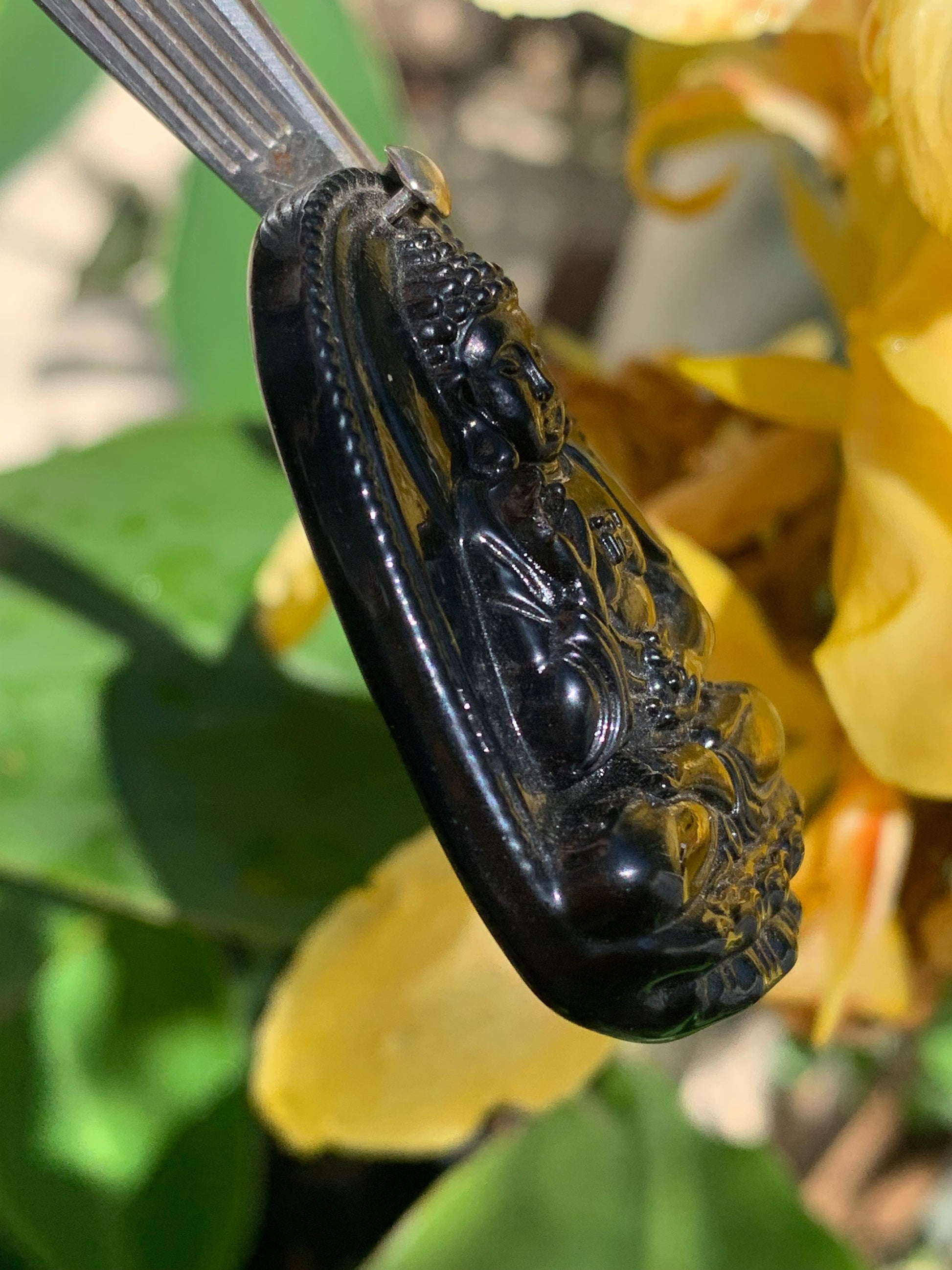 Obsidienne noire, pendentif du Bouddha de 62 millimètres de hauteur x 32 mm de largeur x 12 millimètres. Vendu avec cordon noir réglable offert !