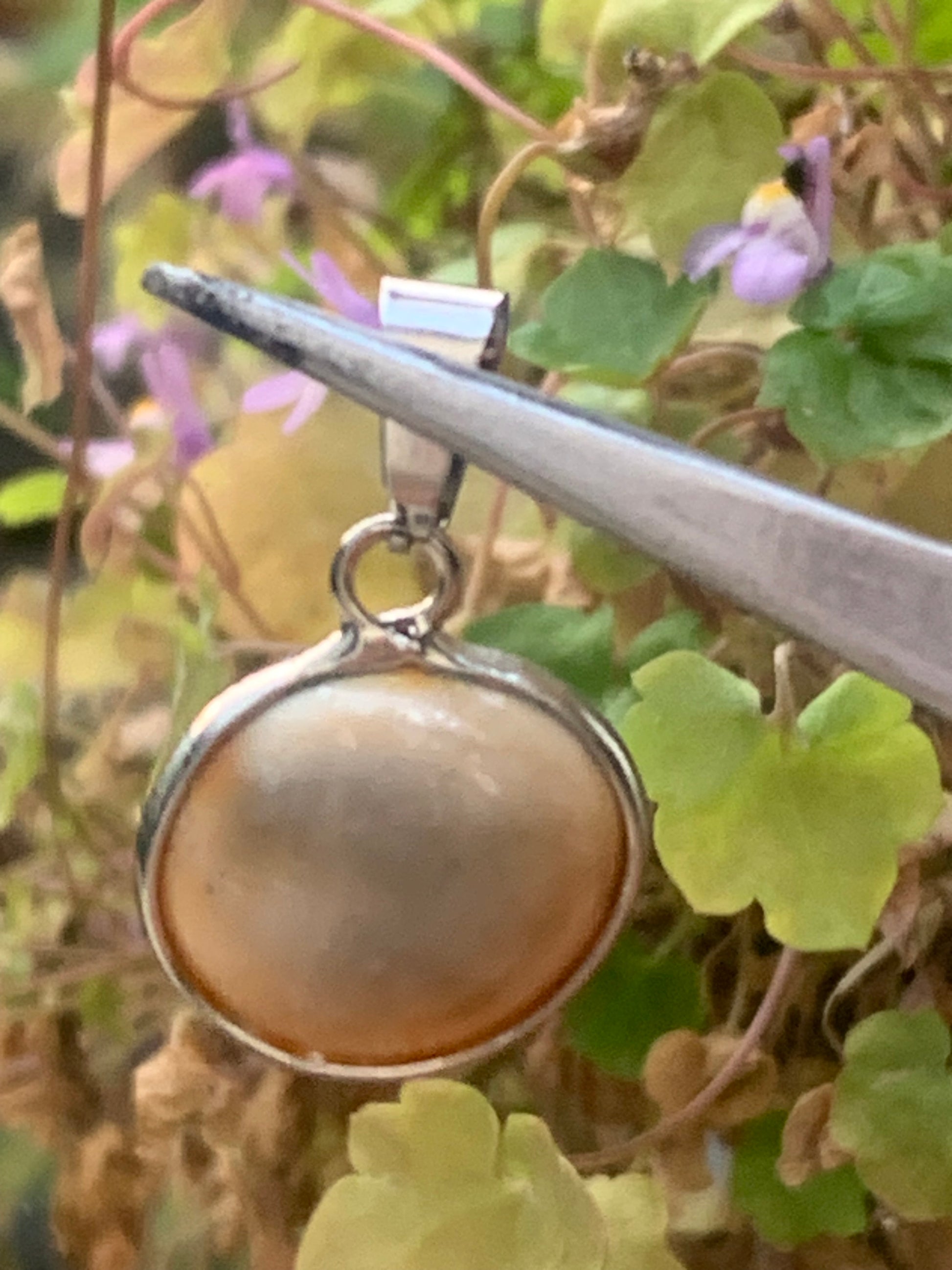 Oeil de Sainte-Lucie, sertis en laiton argenté de 25 mm de hauteur x 16 de largeur x 6 d'ép. Vendu avec cordon noir réglable offert !
