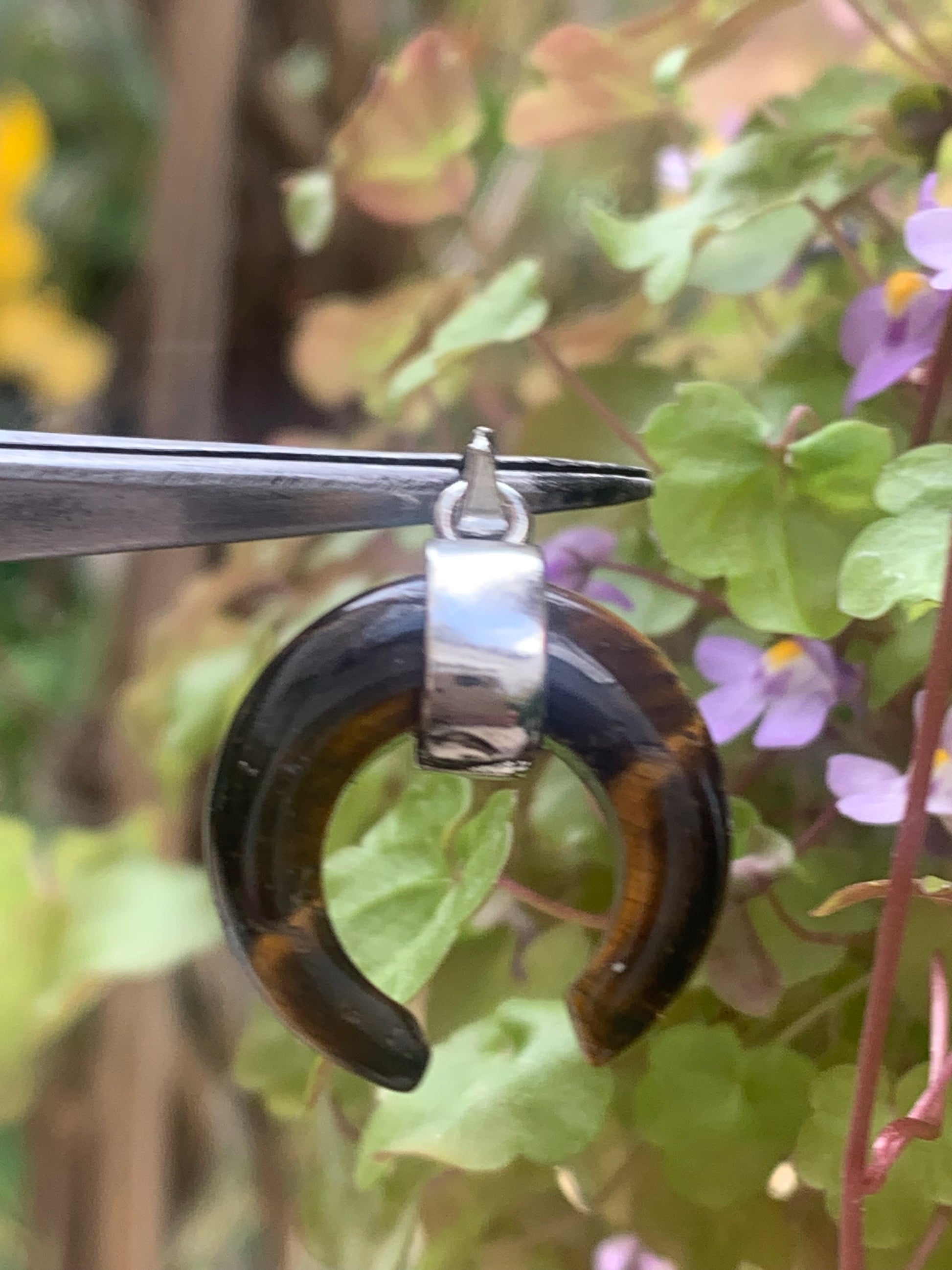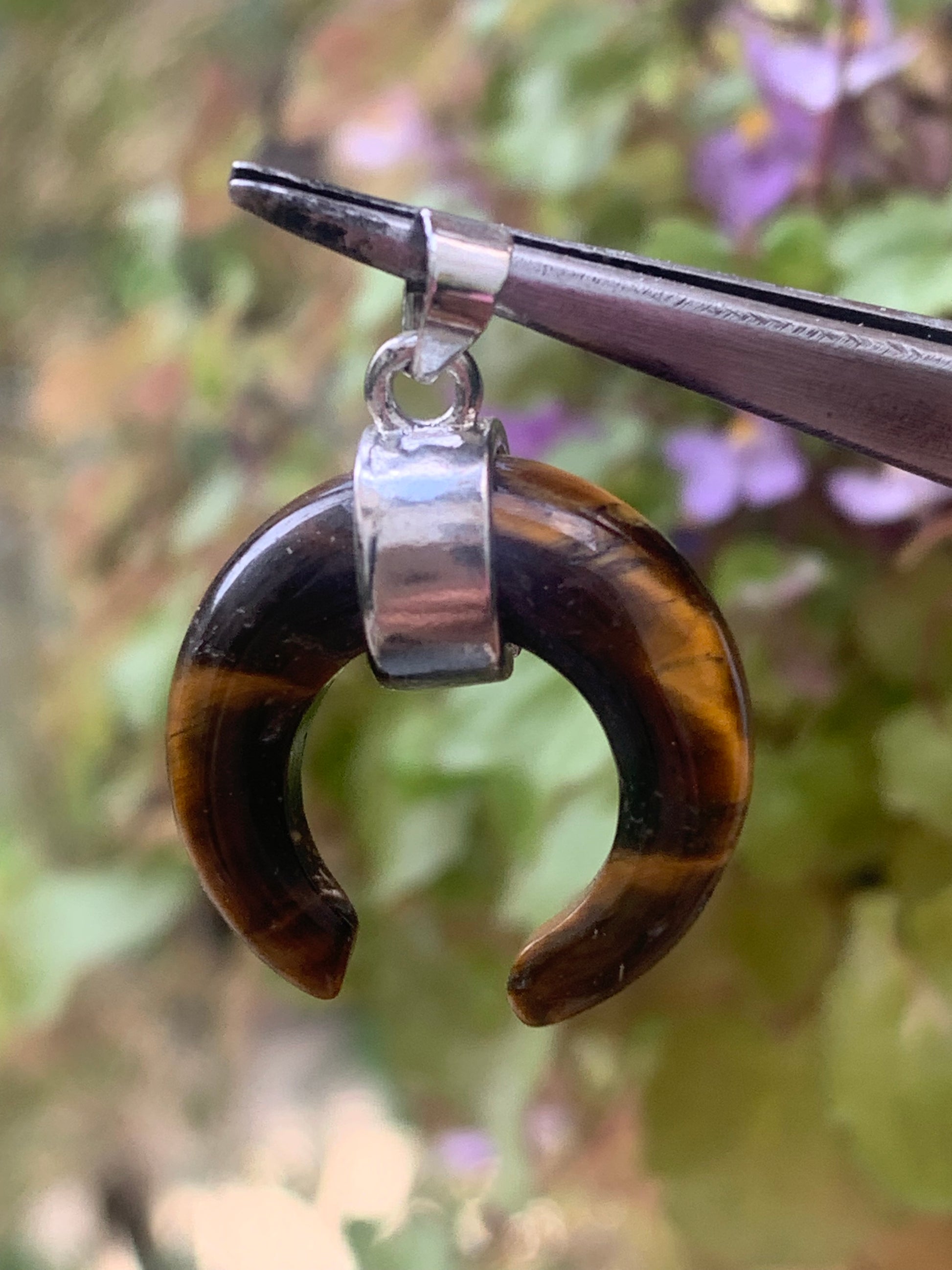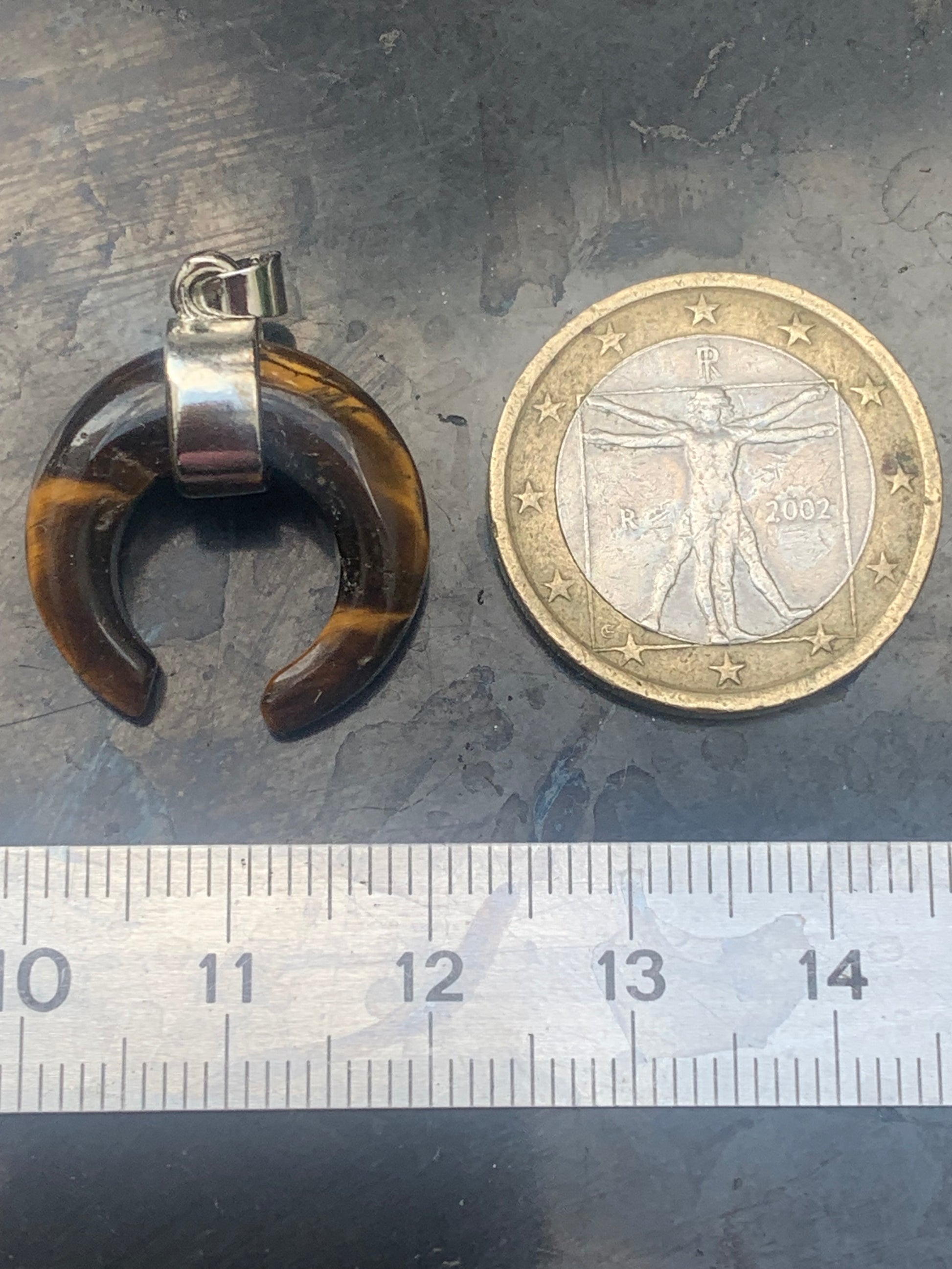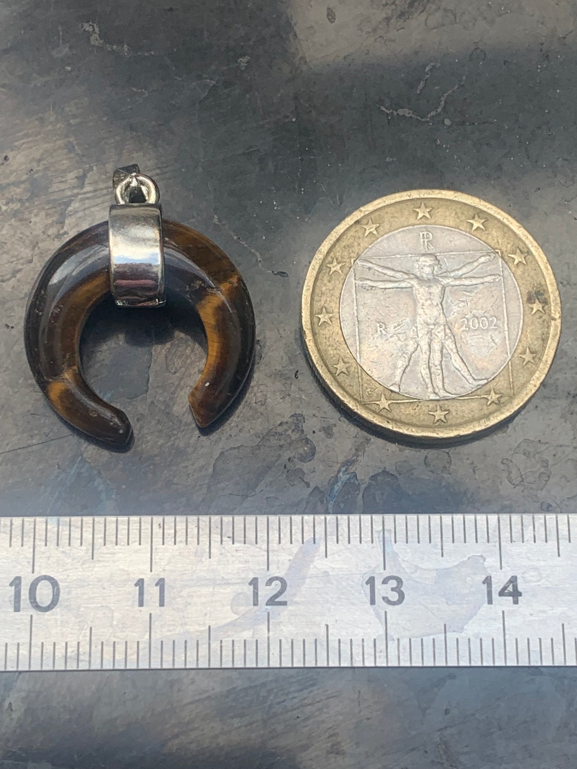 Oeil de tigre, pendentif en forme de croissant de lune, de 30 millimètres de hauteur x 20 mm de largeur x 7 millimètres. Vendu avec cordon noir réglable offert !