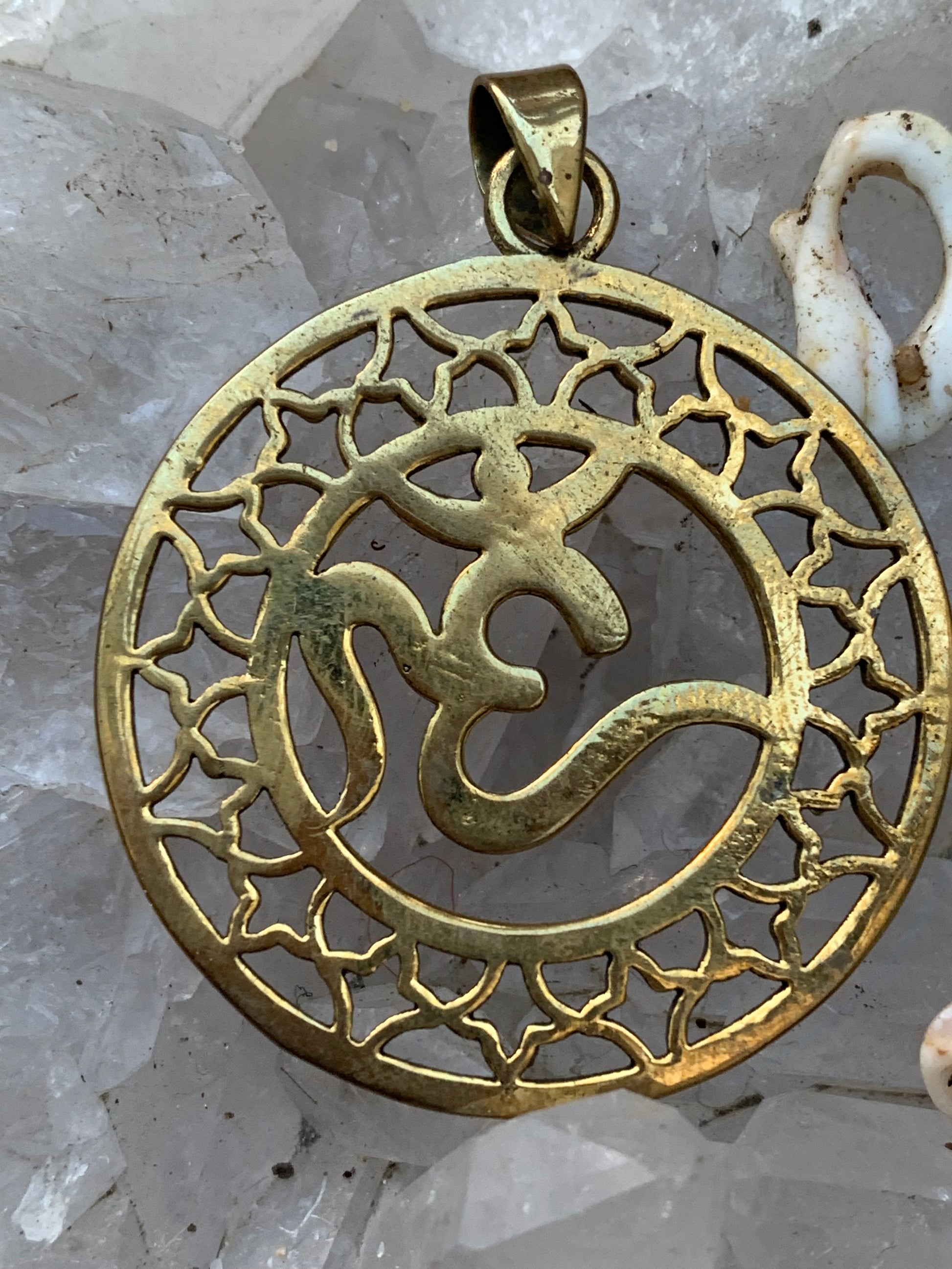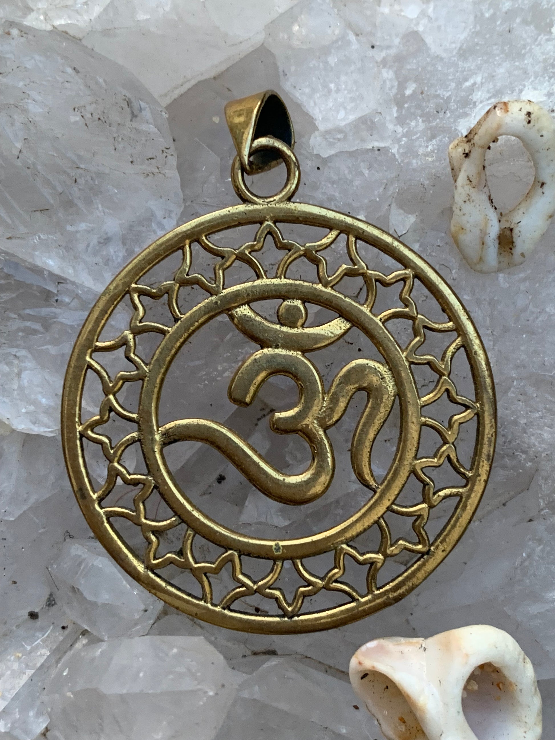 💚 Une pièce rare, authentique et superbe pour enrichir votre collection. Tel un souffle ancien suspendu au creux du cœur, ce pendentif en laiton doré célèbre le symbole sacré Om, vibration originelle de l’univers.