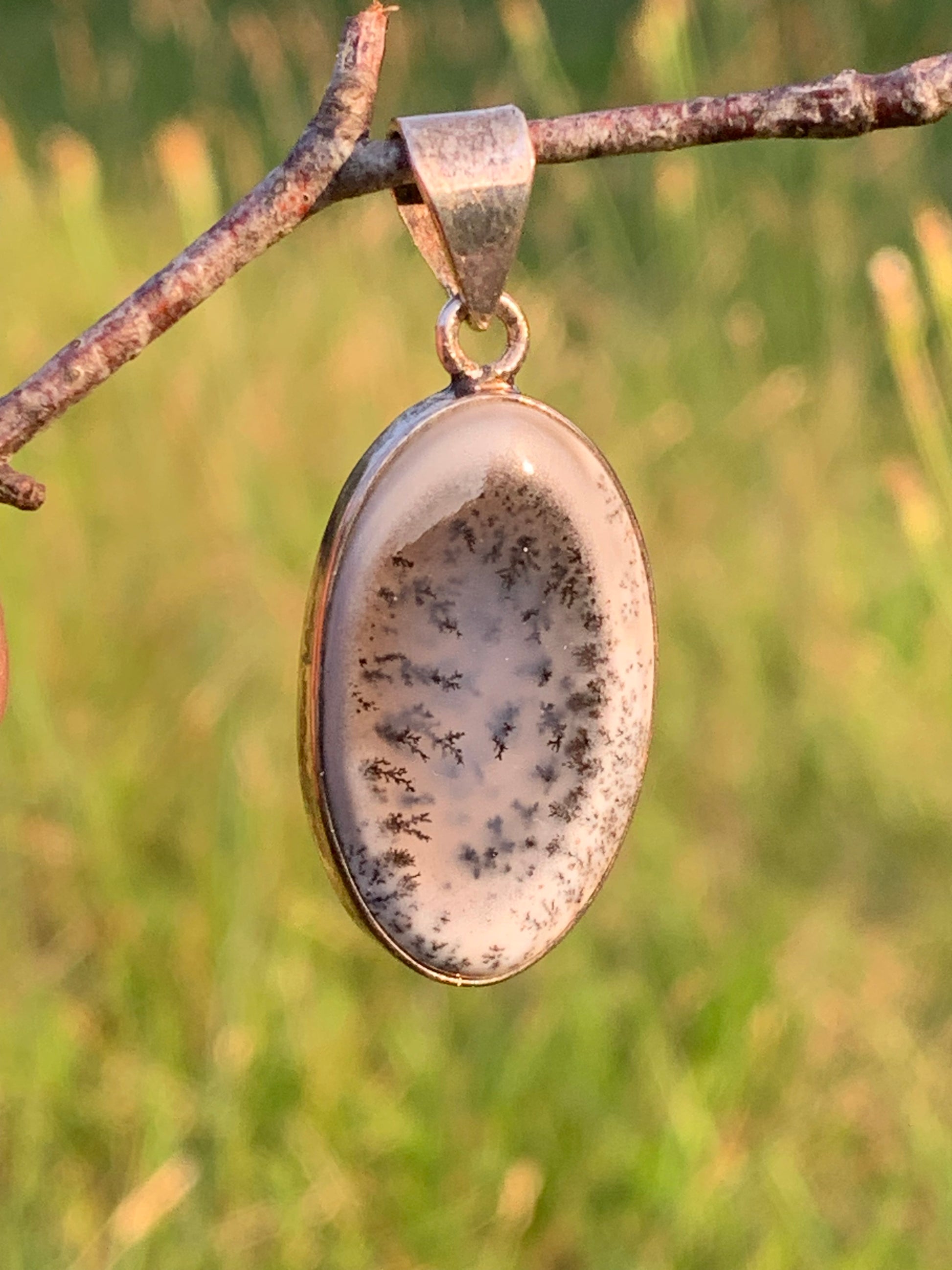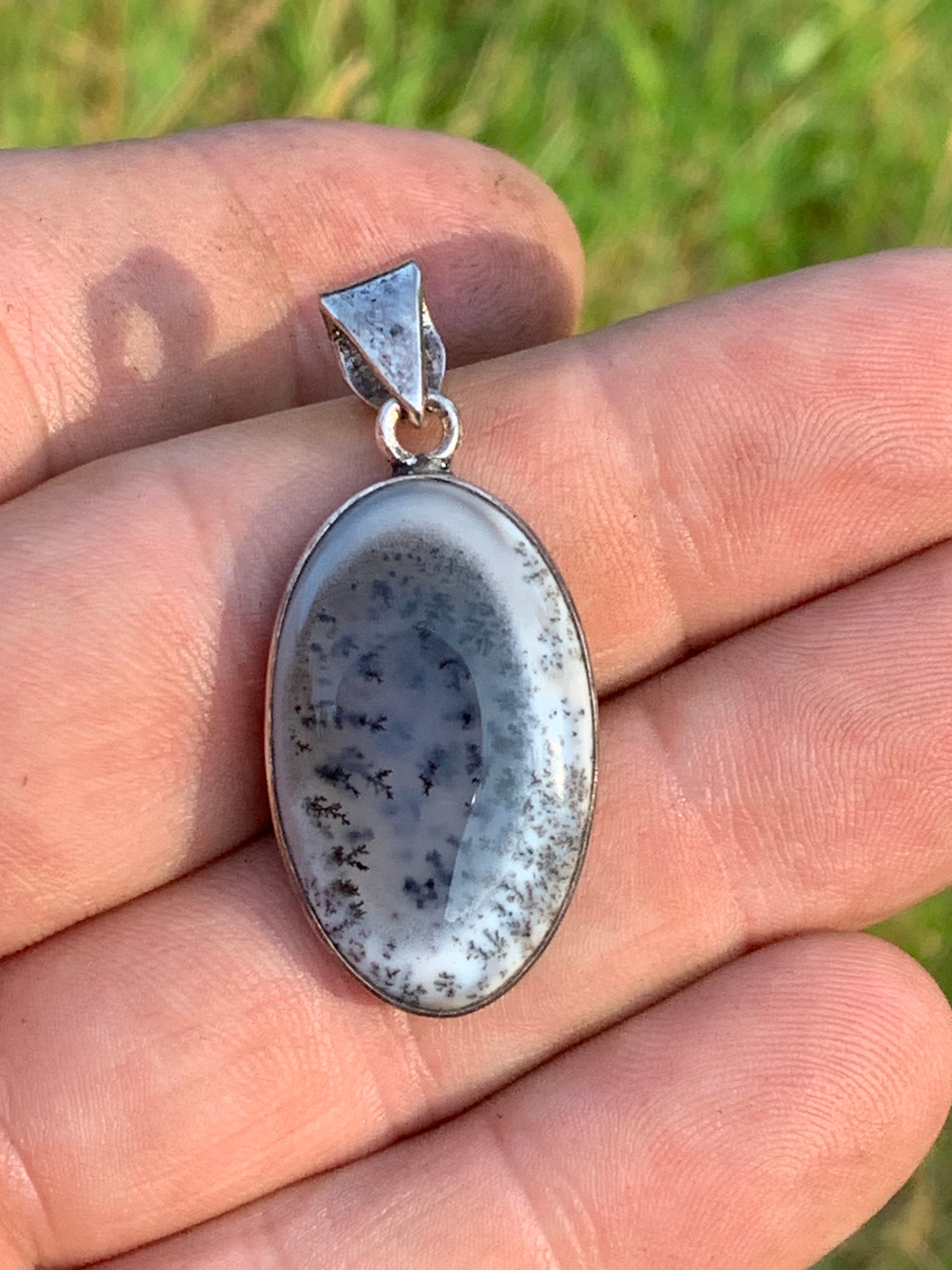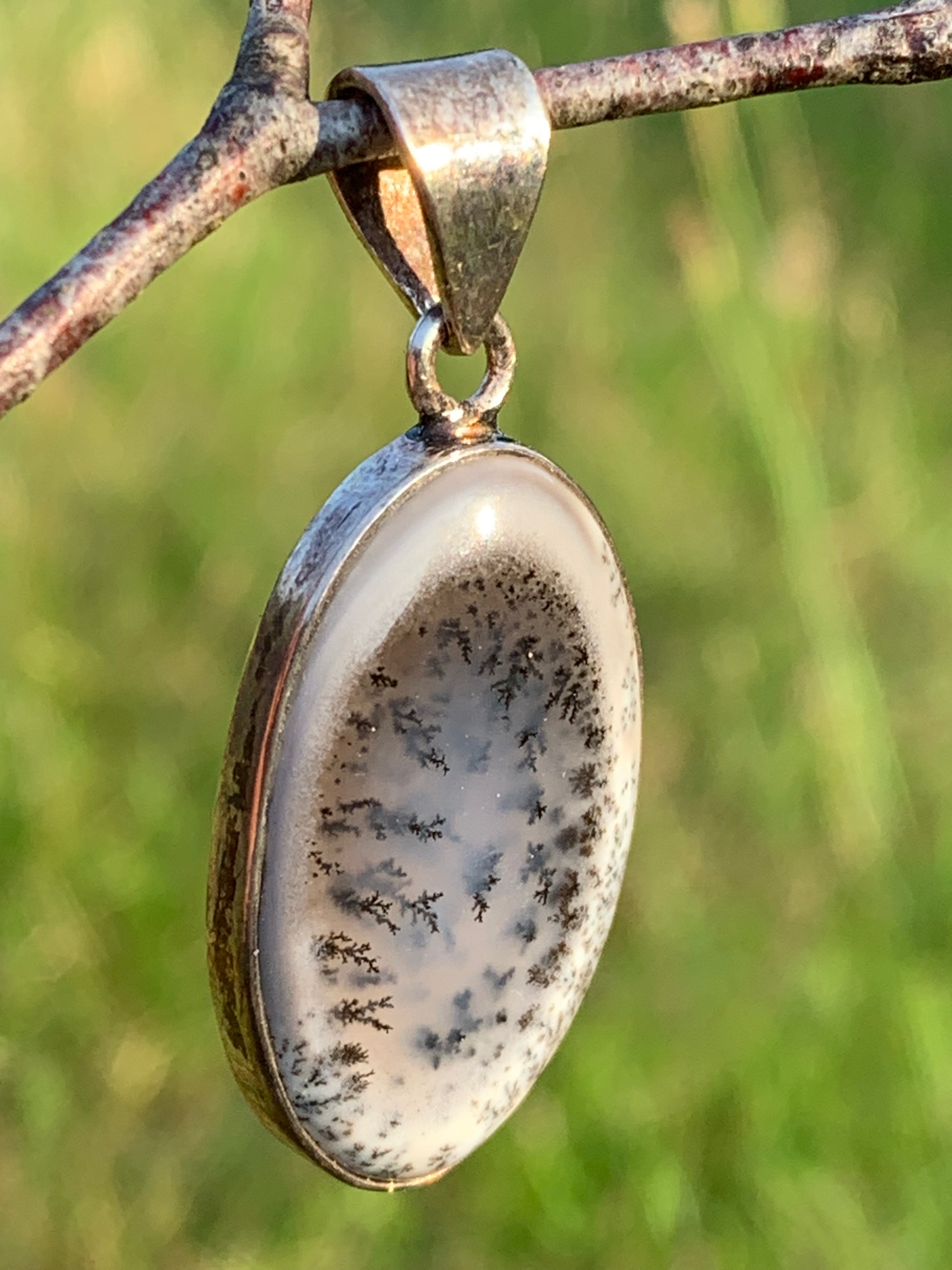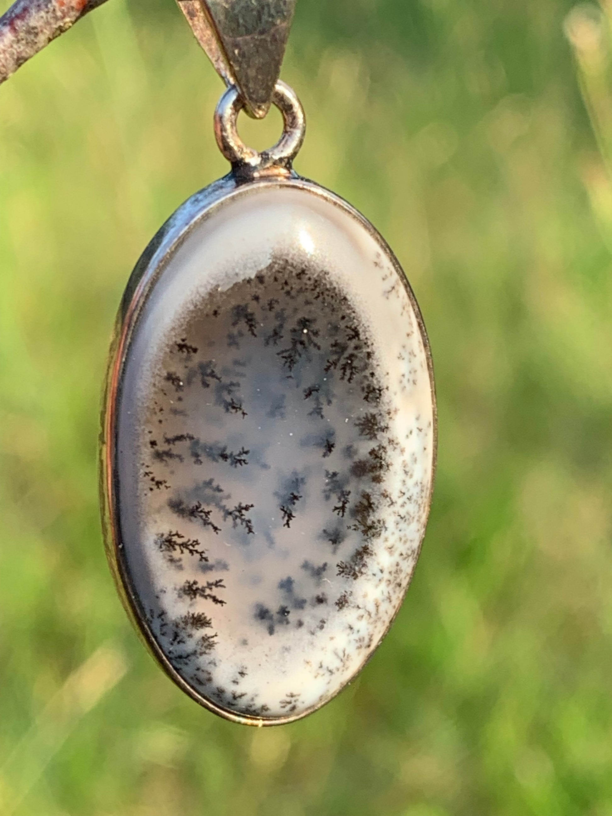 Opale dentritique ou dentrique, pendentif serti Argent de 40mm x 18 x 6. Vendu avec cordon noir réglable, prêt à porter !