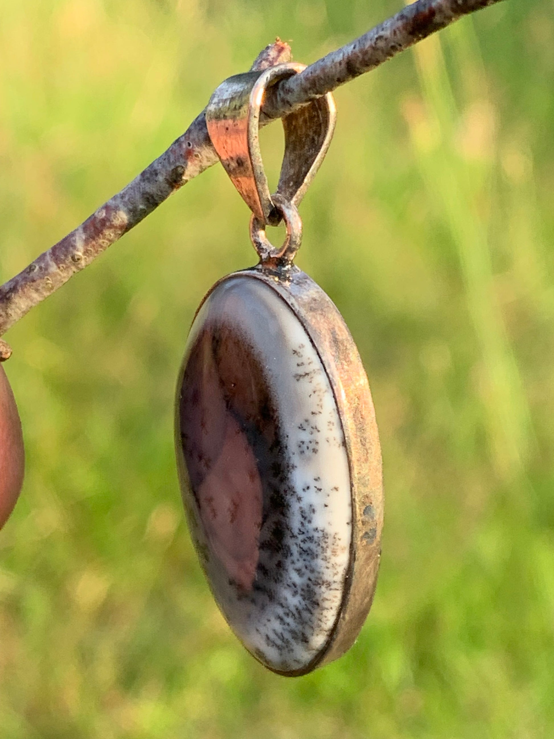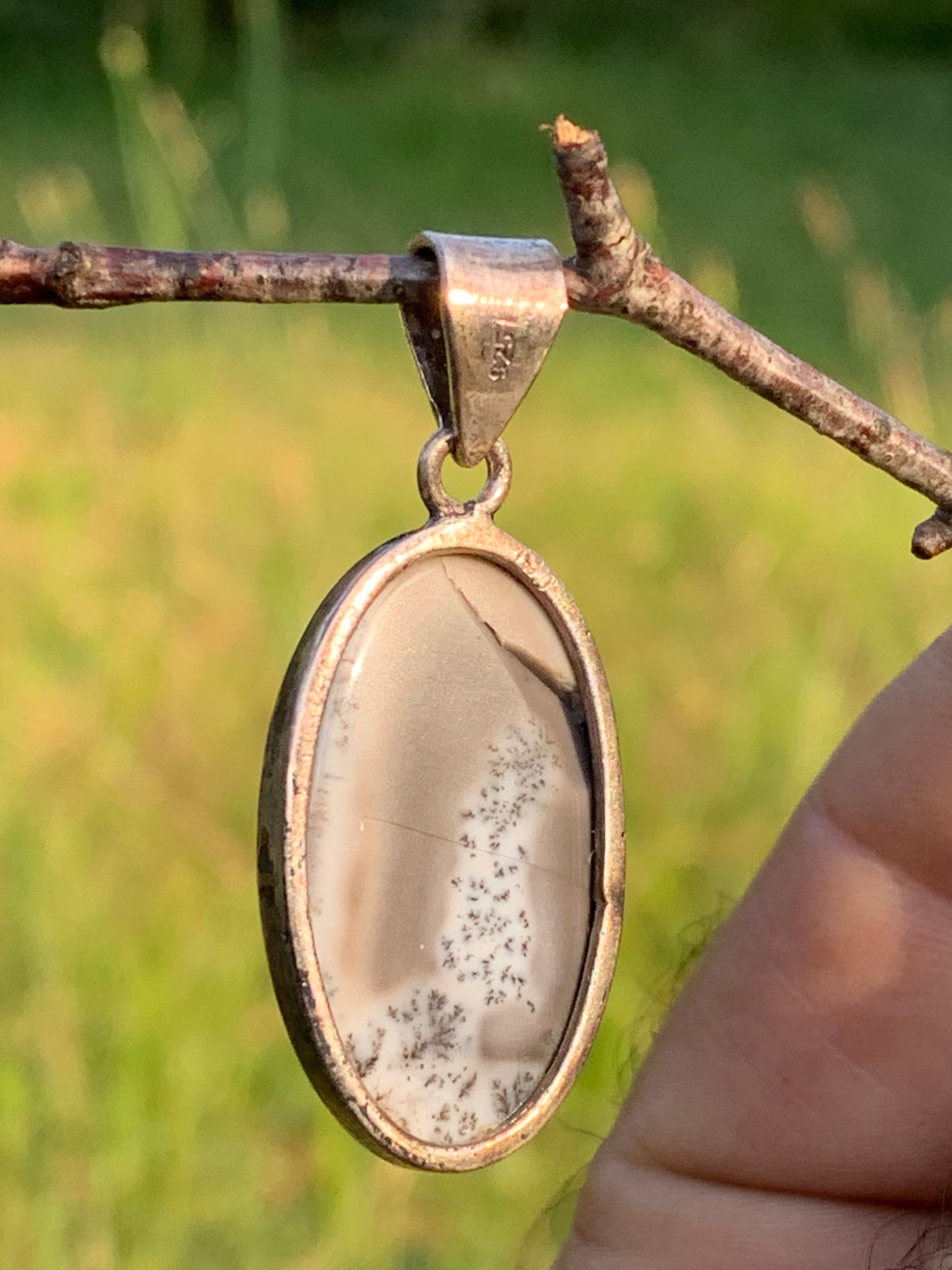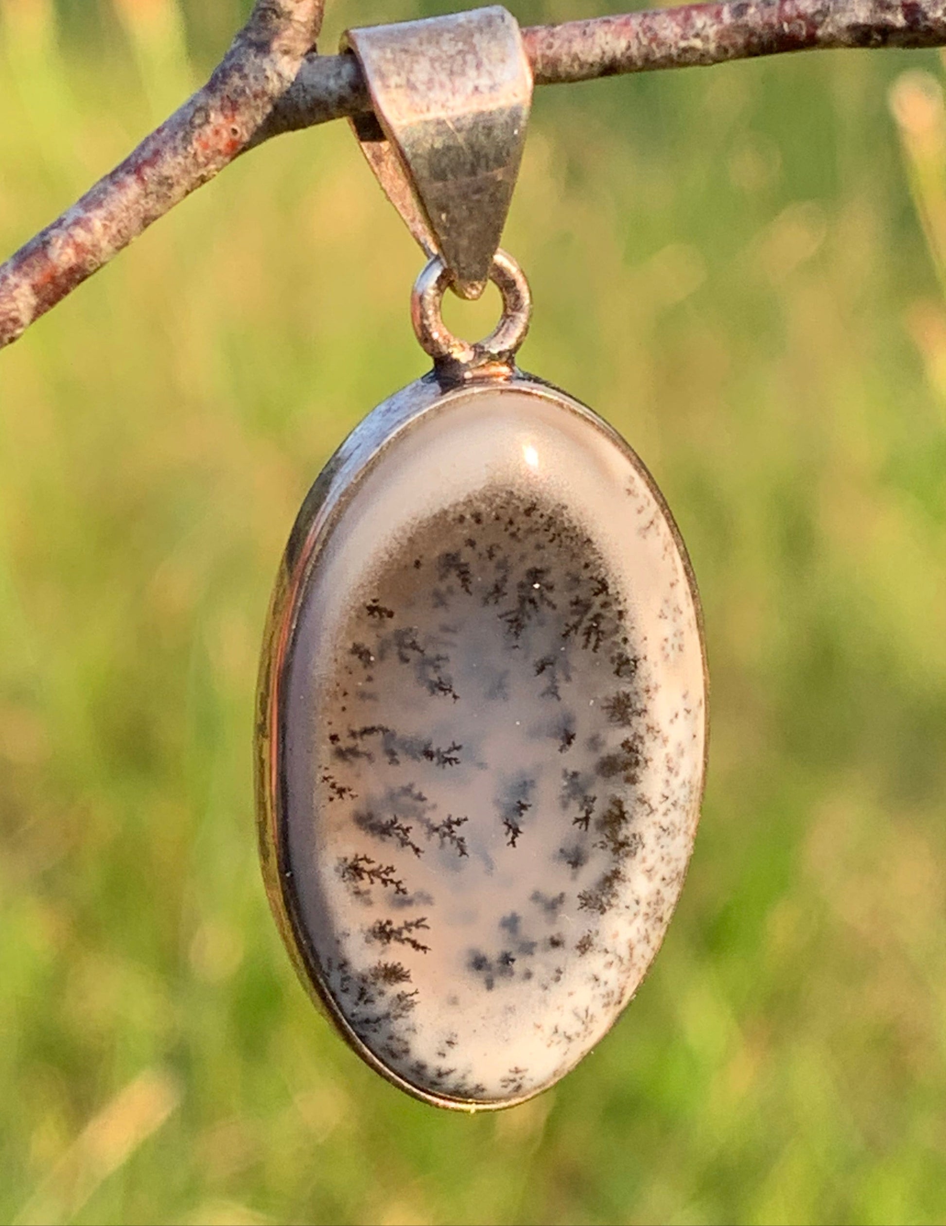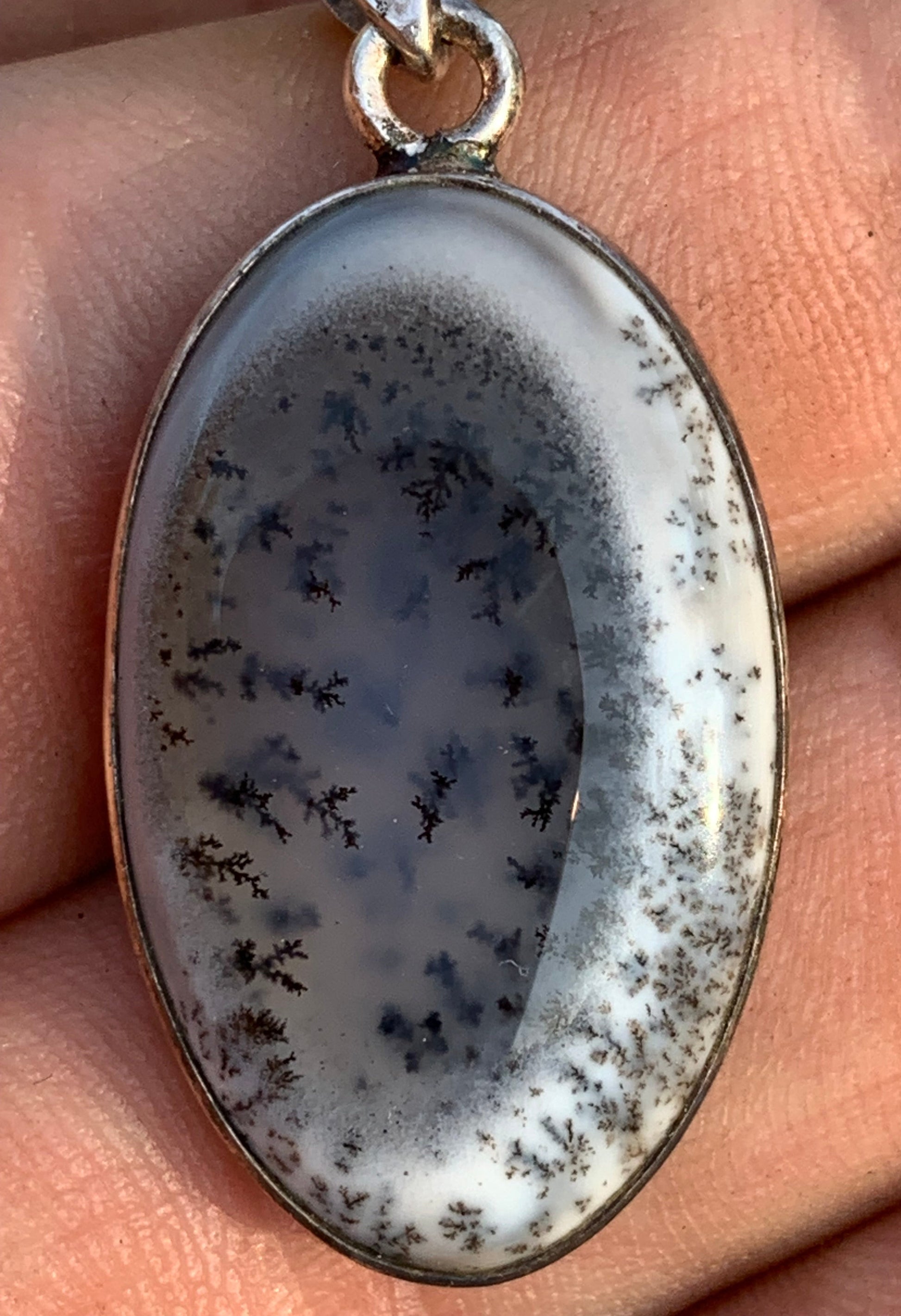 Opale dentritique ou dentrique, pendentif serti Argent de 40mm x 18 x 6. Vendu avec cordon noir réglable, prêt à porter !