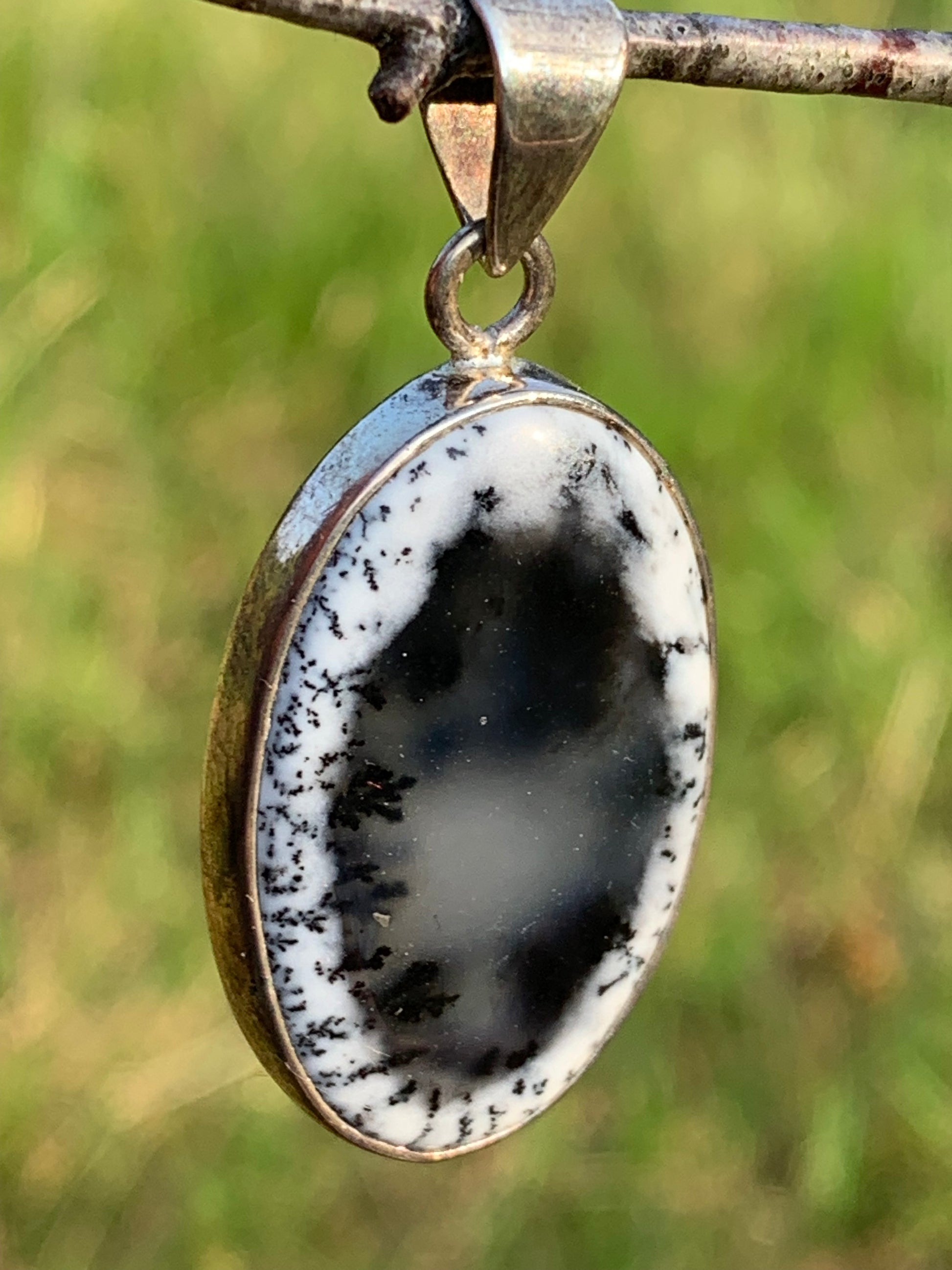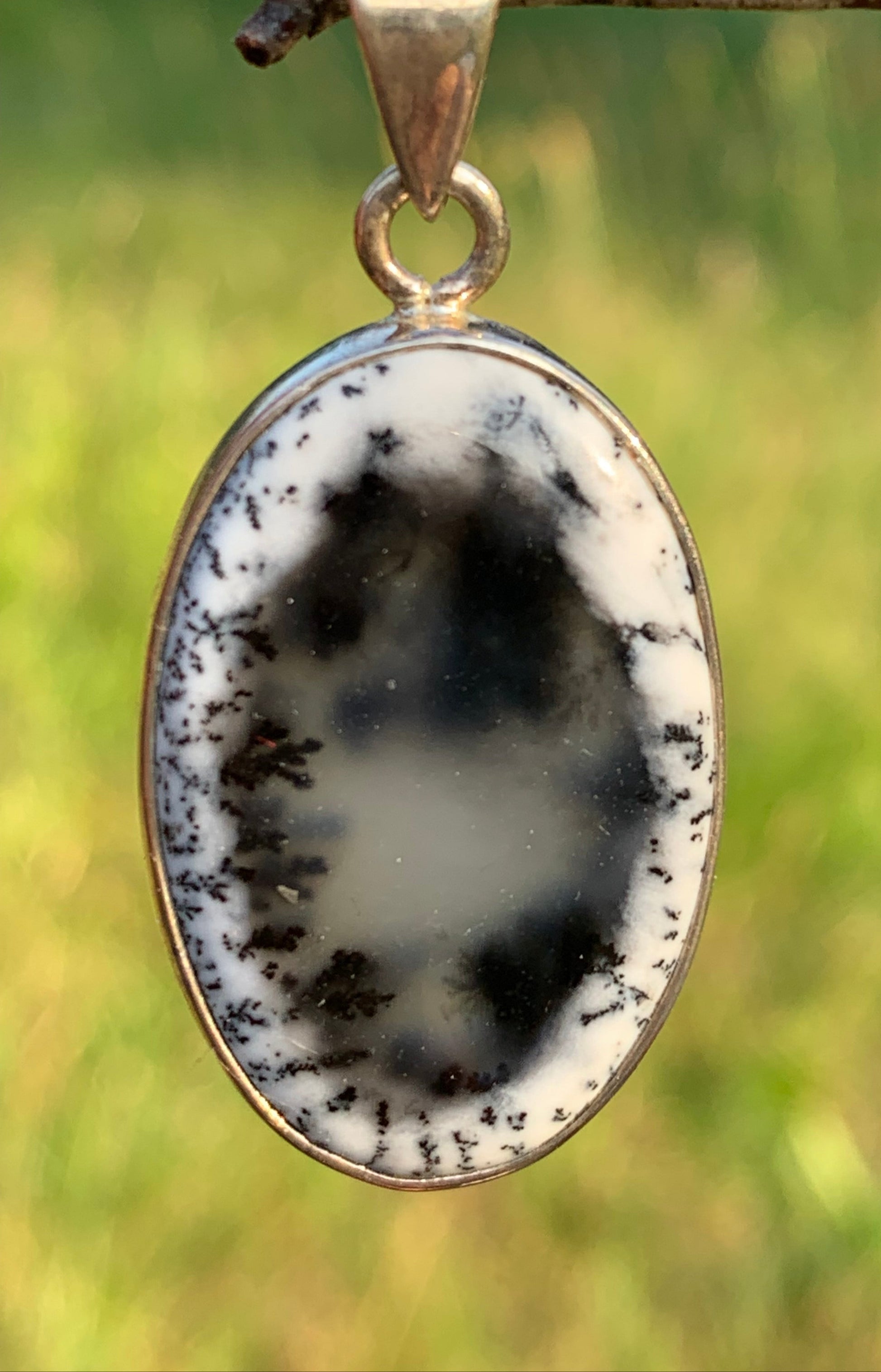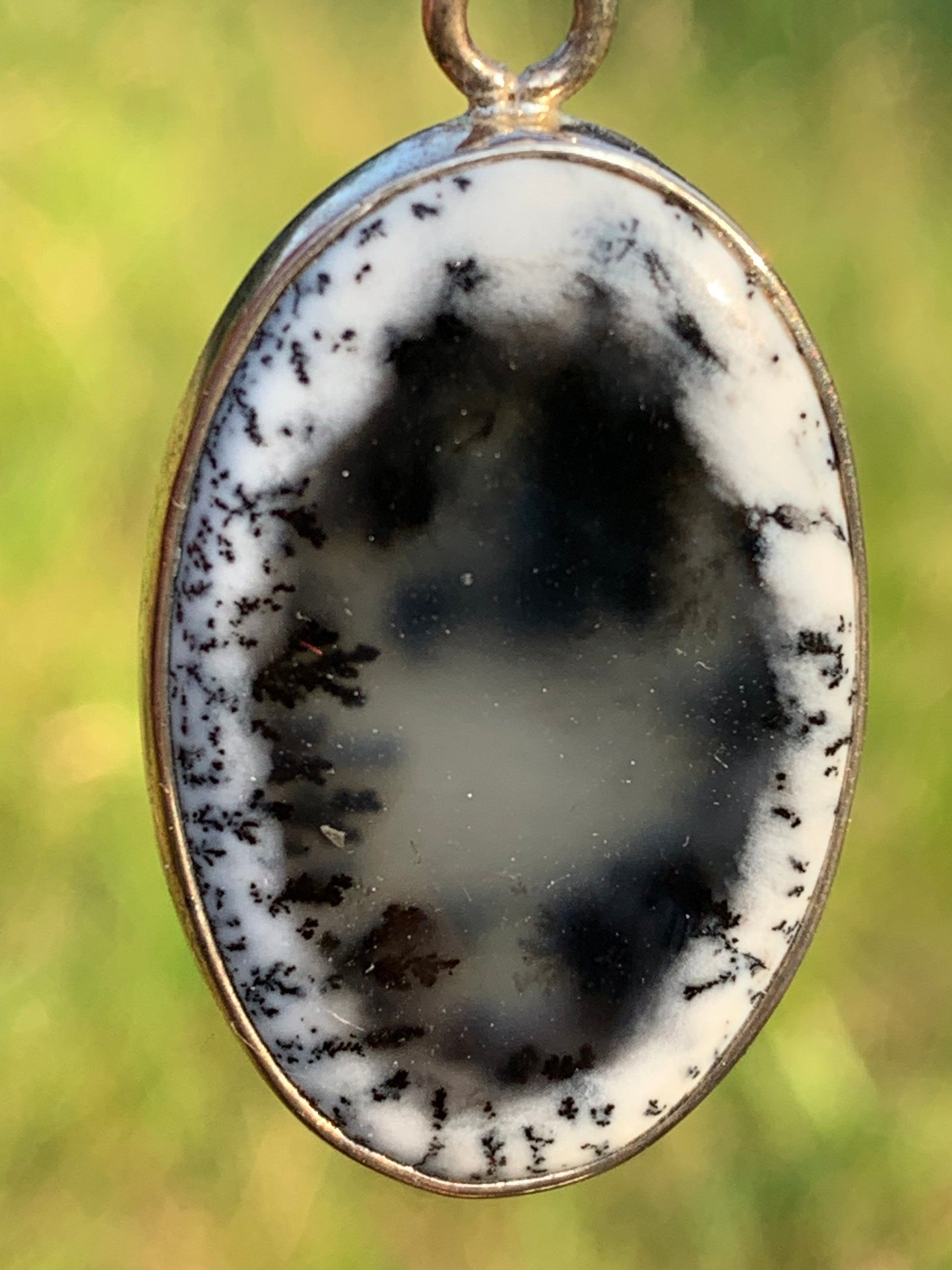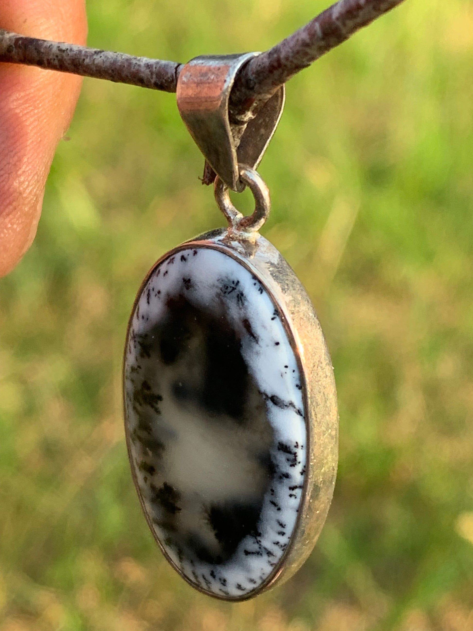 Opale dentritique ou dentrique, pendentif serti Argent de 42mm x 20 x 5. Vendu avec cordon noir réglable, prêt à porter !