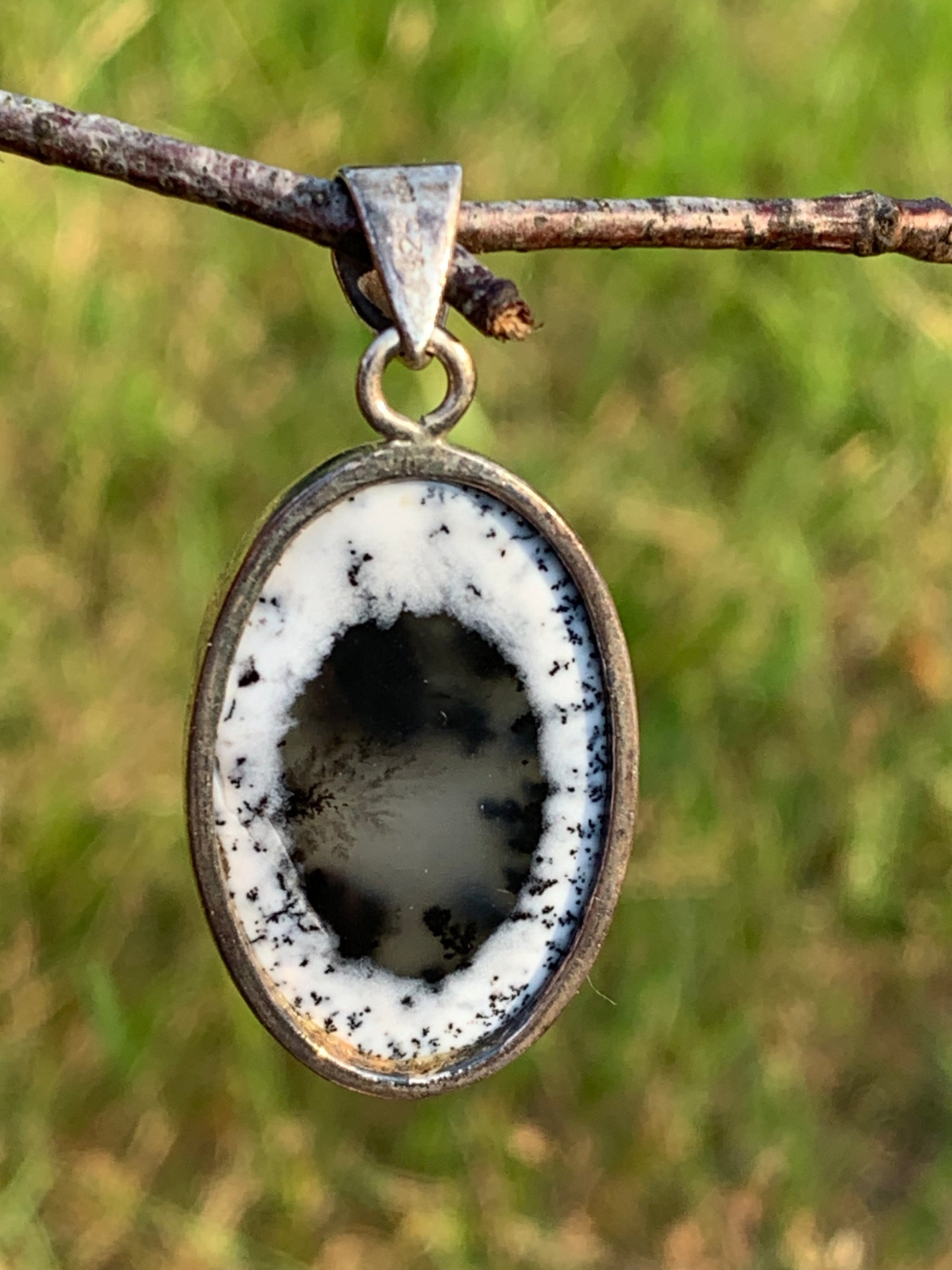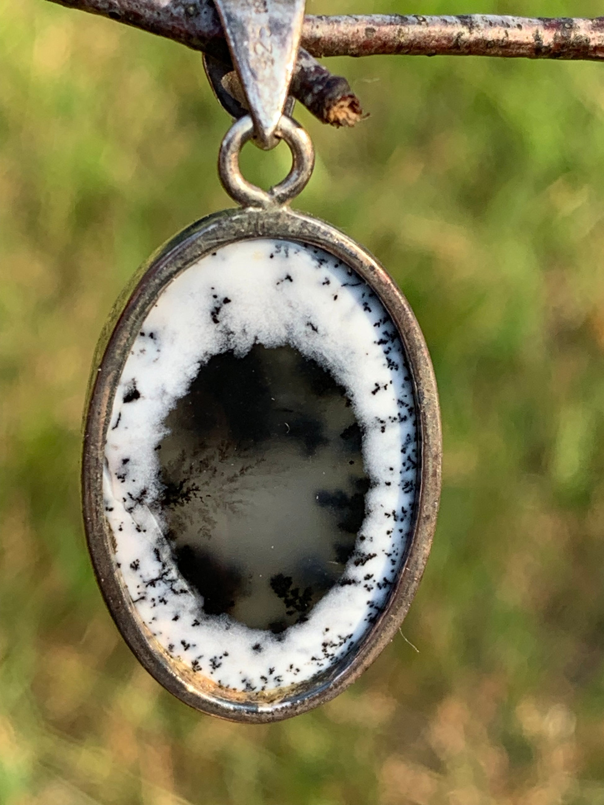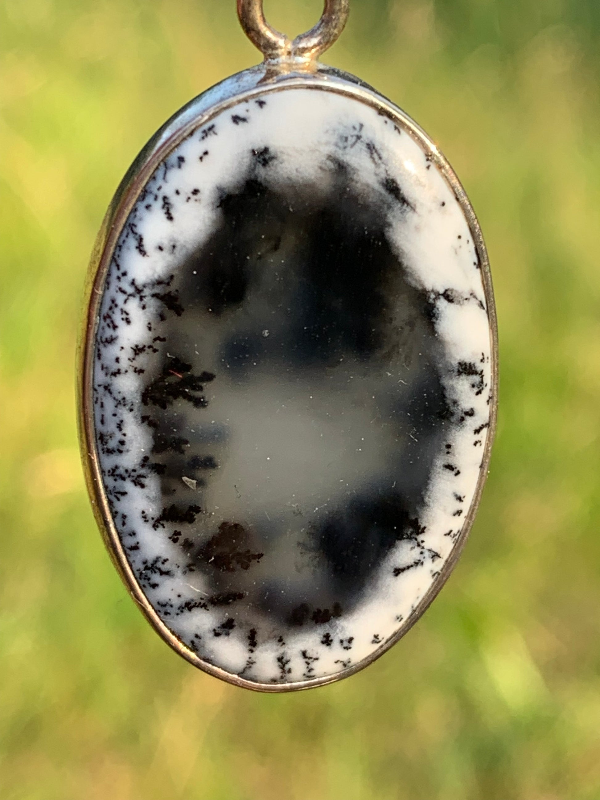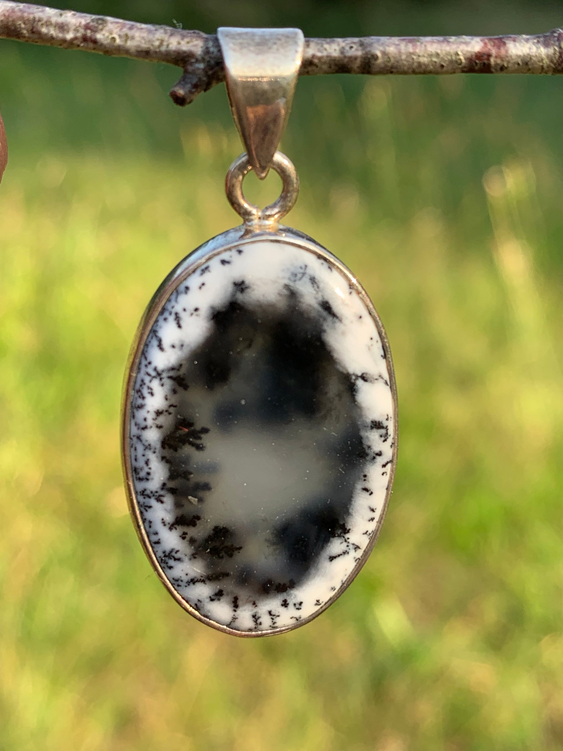 Opale dentritique ou dentrique, pendentif serti Argent de 42mm x 20 x 5. Vendu avec cordon noir réglable, prêt à porter !