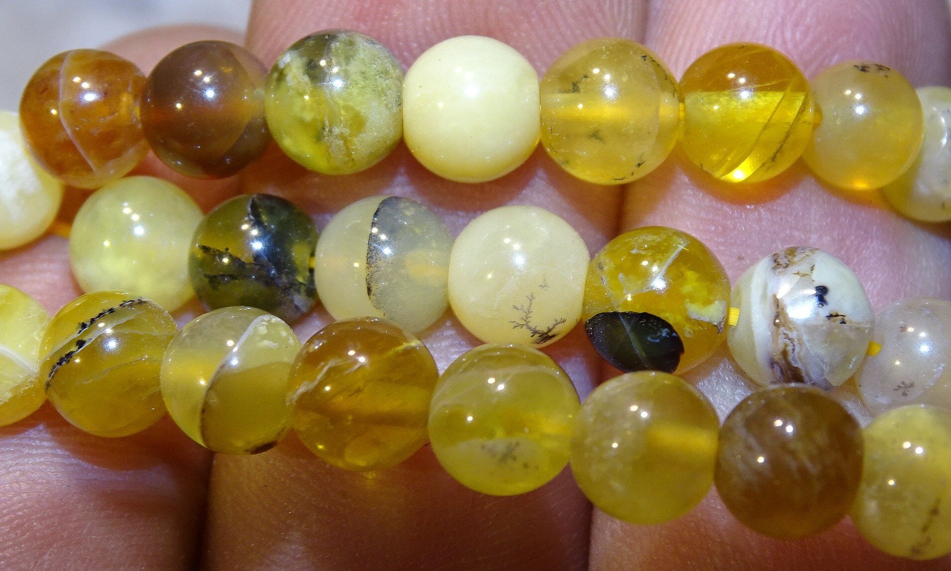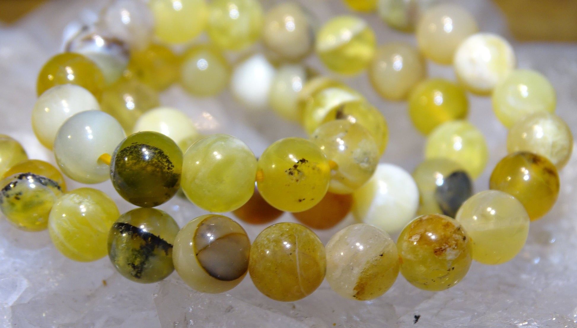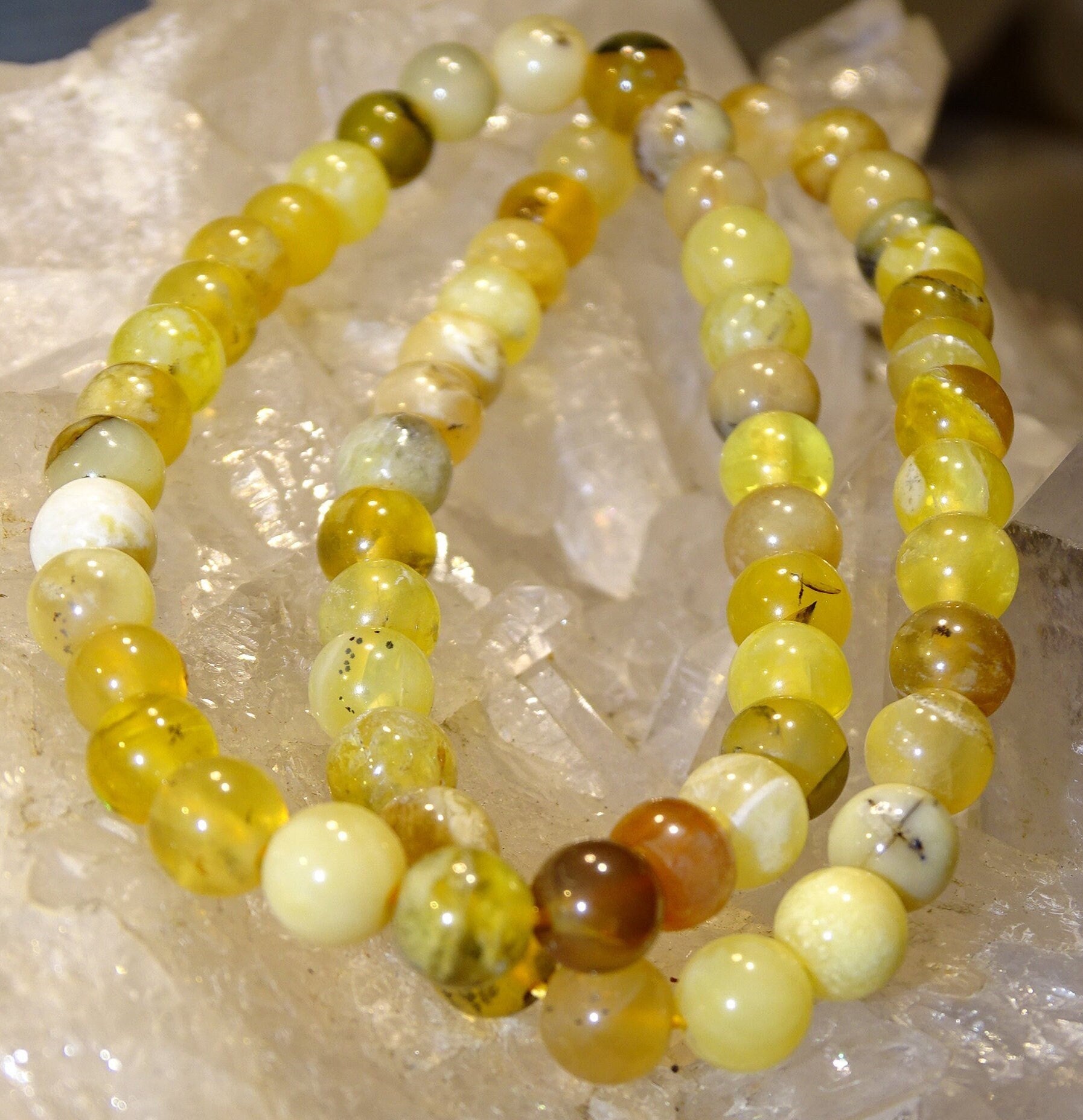 Opale jaune d'Australie, perles rondes de 4, 6 ou 8 mm. Vendu en fil de perle 38/39 cm, en bracelet de 17 à 21cm, en collier de 45 ou sautoir de 60cm. Qualité AA à AAA, superbes perles aux reflets dentriques !